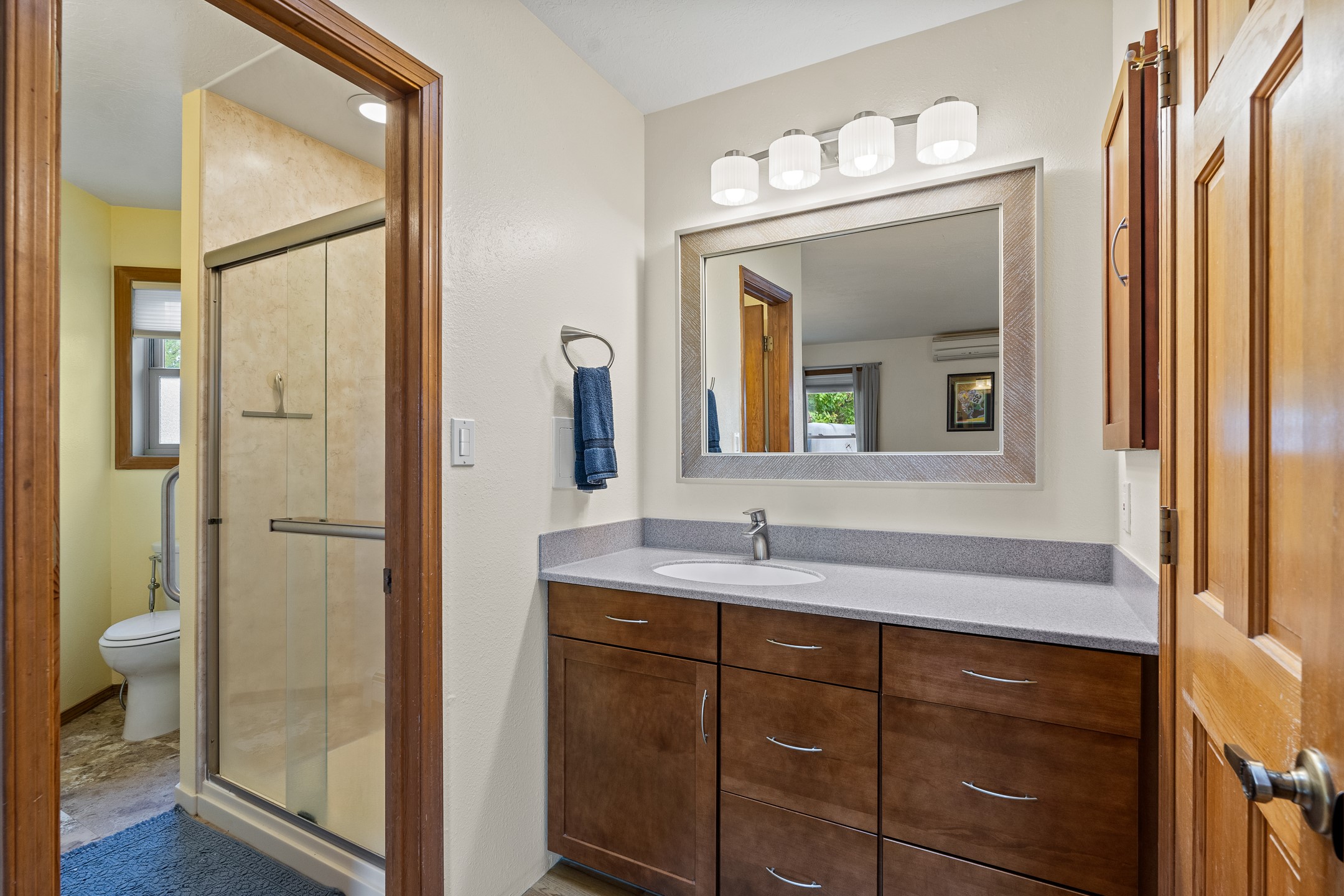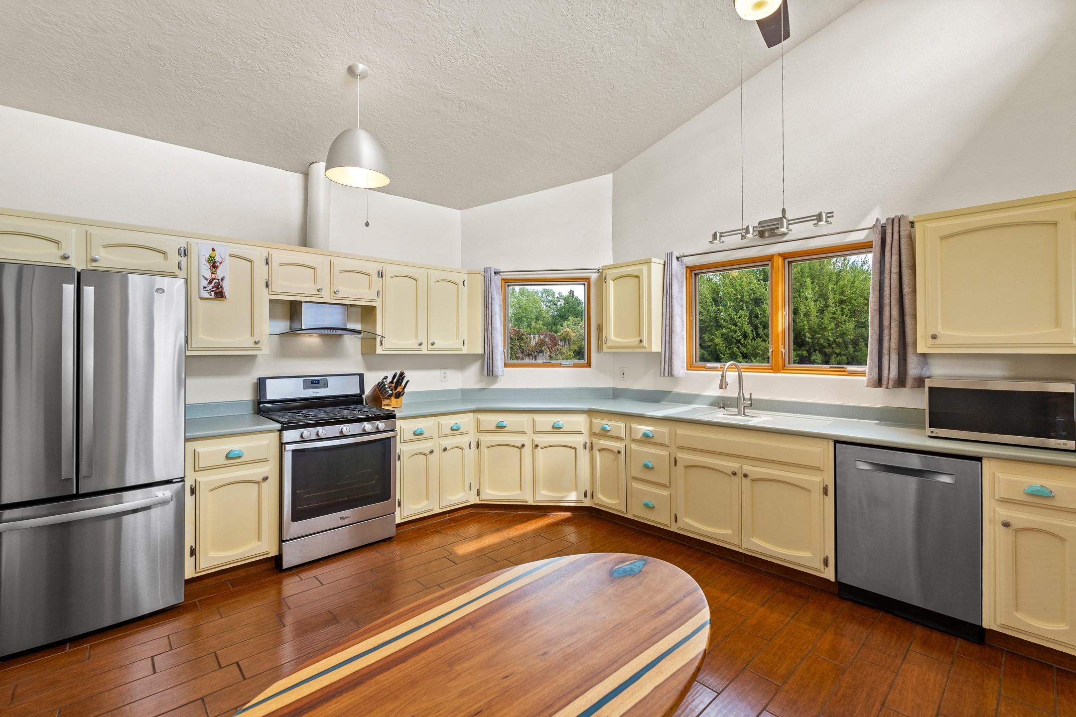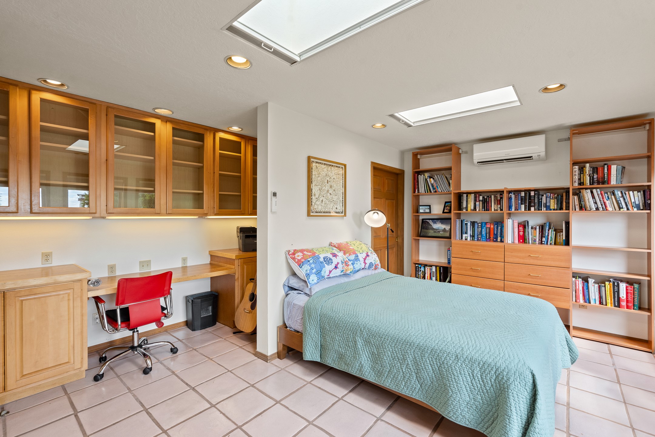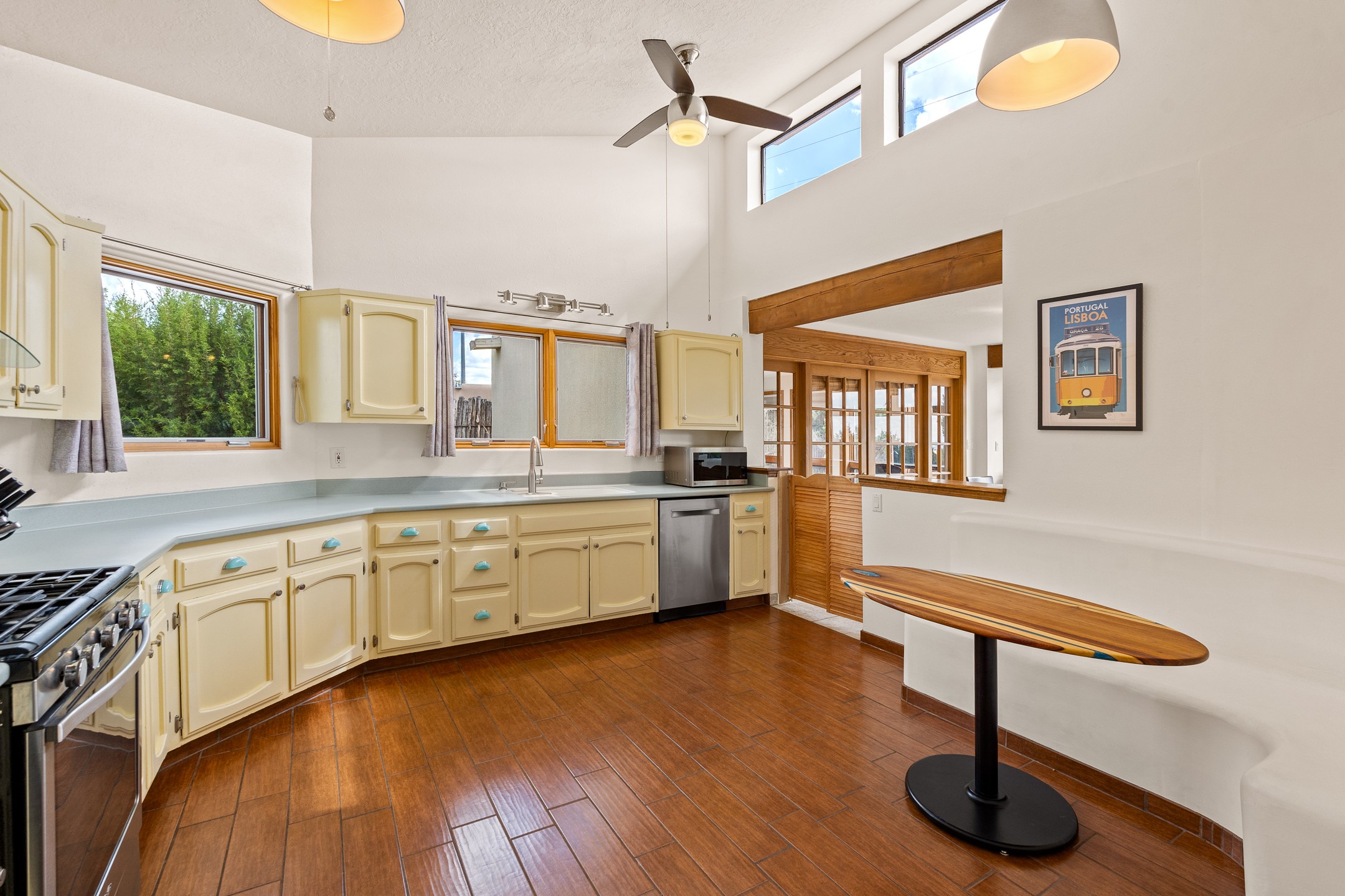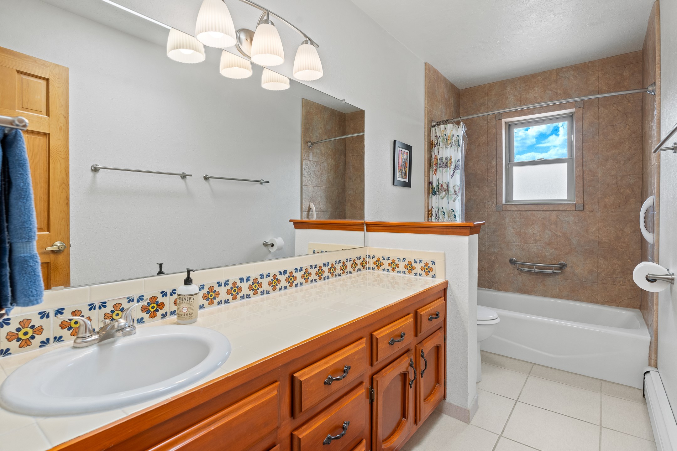 Welcome to this light-filled and beautifully maintained single-level home, ideally situated for easy access to all that Santa Fe has to offer. Located on an elevated .45-acre lot, this 1,900 sq. ft. property offers both comfort and accessibility. Inside, you'll find three spacious bedrooms, three bathrooms, and a flexible attached office/studio that can serve as a 4th bedroom or creative space. Architectural highlights include high beamed ceilings, T&G ceiling, with clerestory windows, skylights, and a classic kiva-style fireplace -- all creating a warm, Southwestern ambiance. Enjoy year-round comfort with hot water baseboard heating and mini-split systems for heating and cooling. Step inside to a private entry courtyard with flagstone and a fully enclosed backyard featuring a brick patio, perfect for outdoor entertaining. Relax under the pergola swing with your morning coffee or evening glass of wine while taking in breathtaking views of the Sandia and Ortiz Mountains. The yard is beautifully landscaped with multiple fruit trees, drip irrigation, and includes a large storage shed. Don't miss this rare opportunity to own a peaceful and versatile home with majestic sunrises and sunsets, just a short drive to downtown Santa Fe.