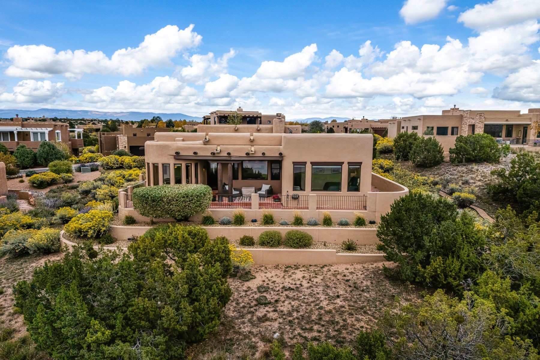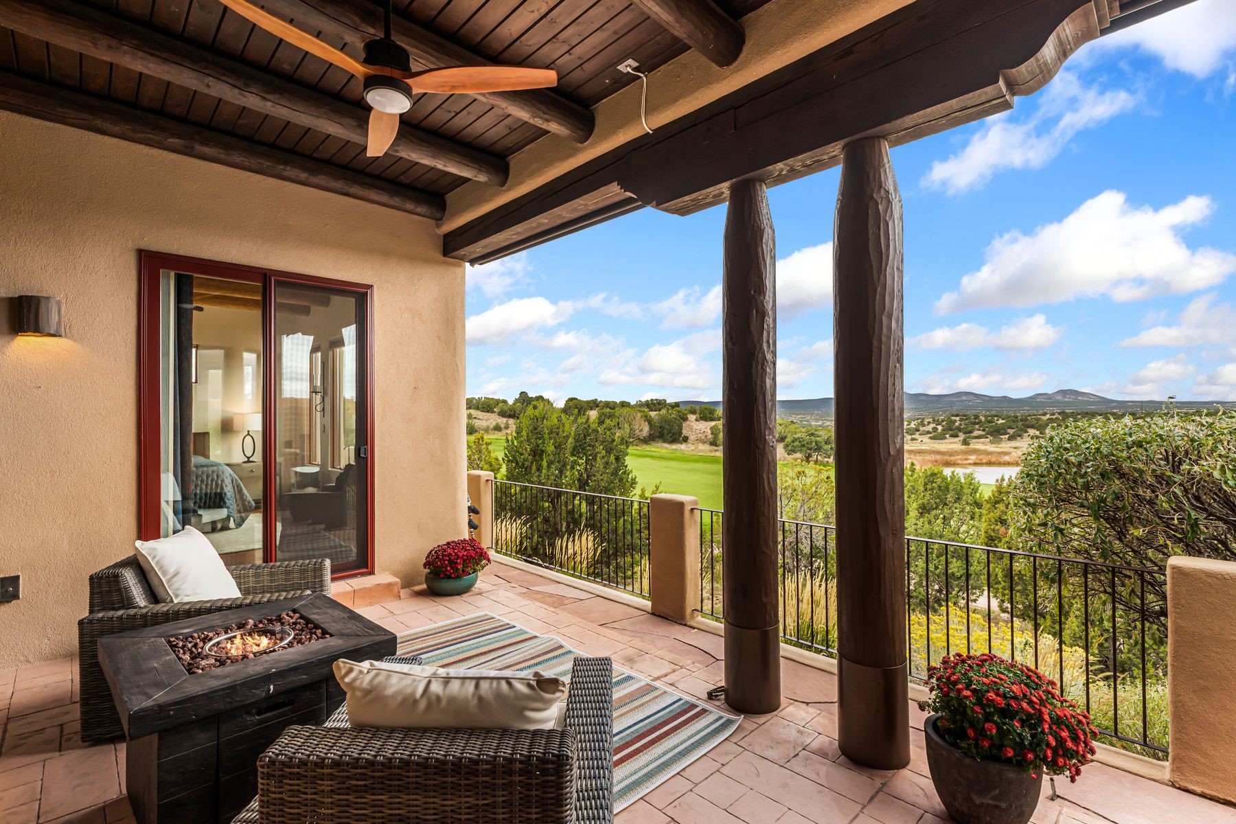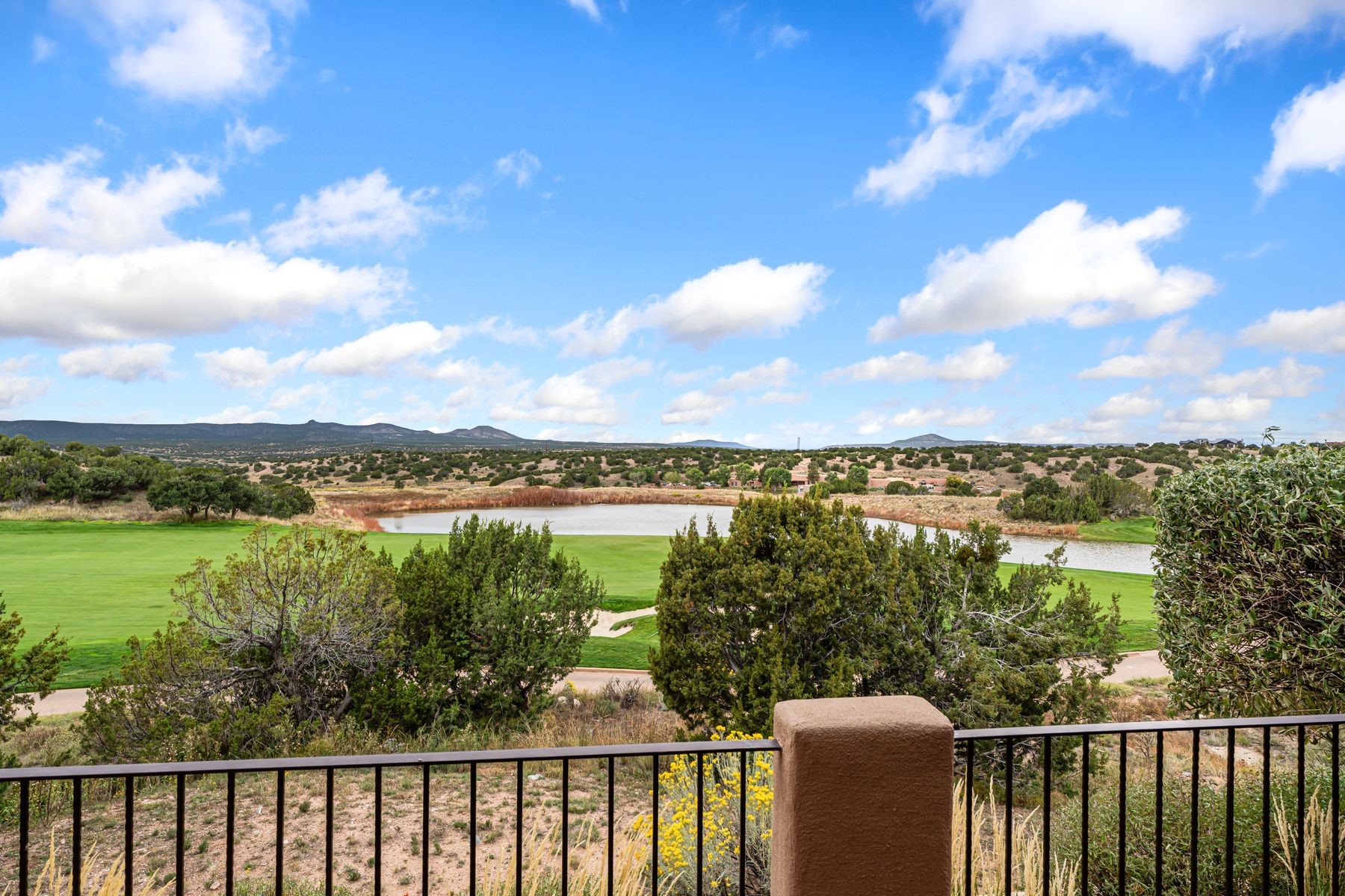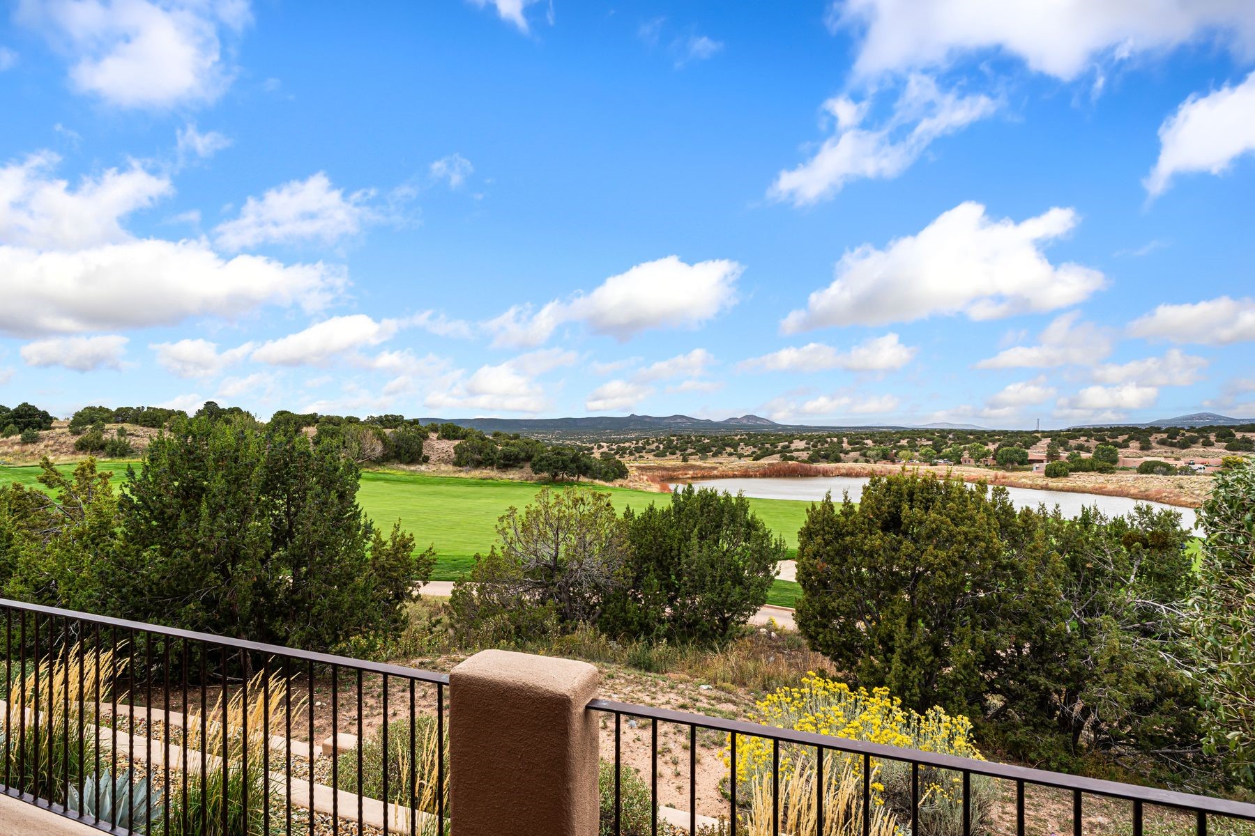 AMAZING VIEWS! Panoramic golf course, lake, Jemez Mountain and sunset views from this beautiful 3 bedroom & 2 bath Las Campanas home. Situated on an elevated lot overlooking the 14th fairway of the Jack Nicklaus designed Sunset Golf Course, this thoughtfully designed home is ideal as a permanent residence or turn-key second home. Wonderful open concept living is anchored by the cozy kiva fireplace on one end...and on the other a beautiful chef's kitchen where you'll find the spacious island with hammered copper farmhouse sink, top of the line appliances, generous pantry and beautiful dining area. Expansive windows capture the views, with French doors leading out to your covered portal for ideal outdoor entertaining. Your spacious Primary Suite enjoys those same incredible views and access to the portal, a spa-inspired bath featuring a jetted tub, walk in shower, double vanity and generous walk in closet. The Guest accommodations are nicely separated for privacy. Beautiful design features throughout... niches and built in shelving to showcase your art, classic vigas, cozy built in seating, roll down sun shades, custom doors & custom cabinetry. Additional highlights include new roof installed 2024 (transferable warranty), new refrigerator, new hot water heater, new patio railings and courtyard gates. Make this your ideal Santa Fe retreat!