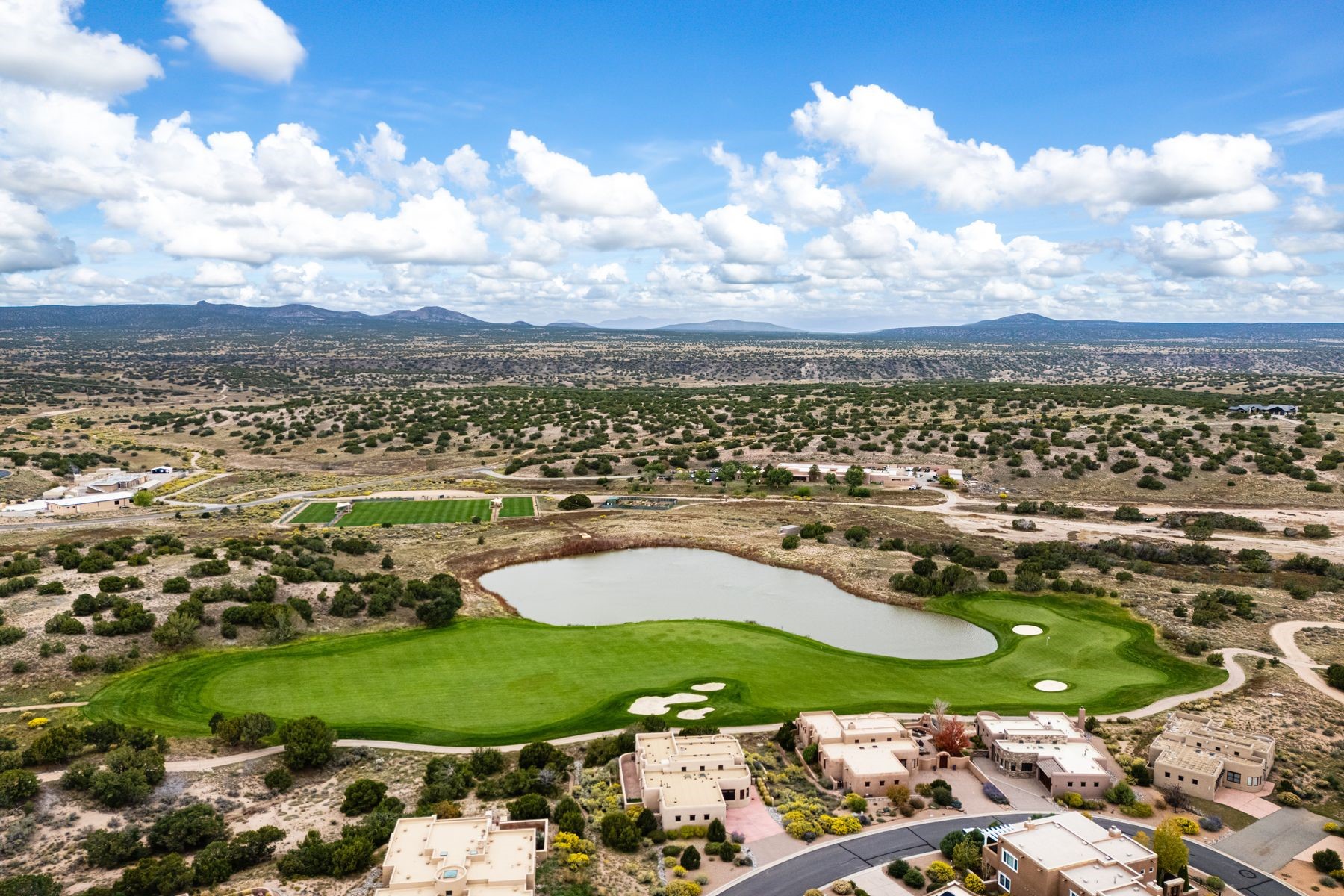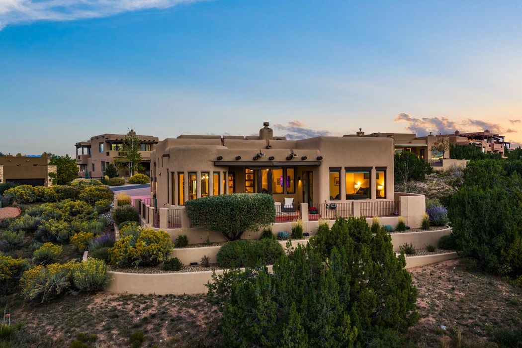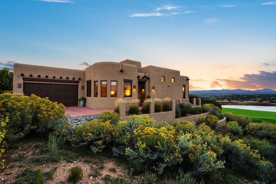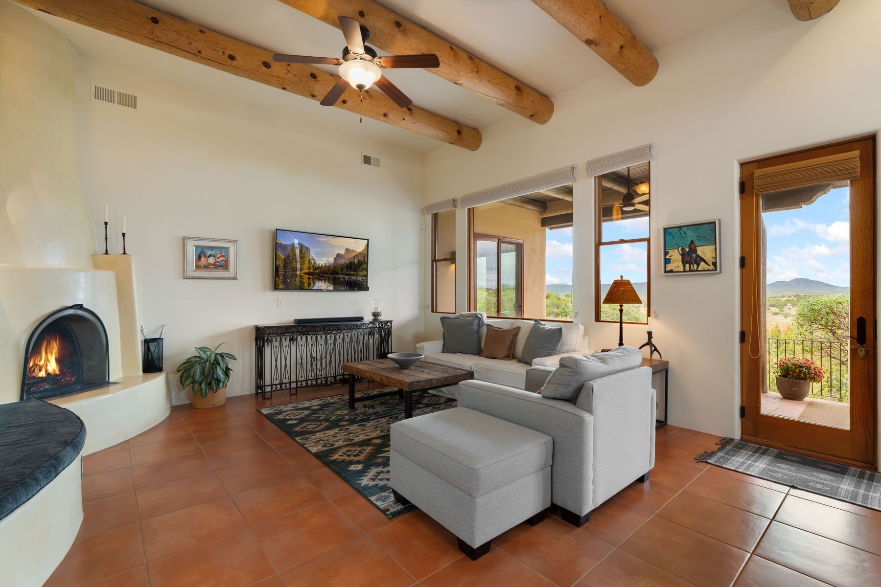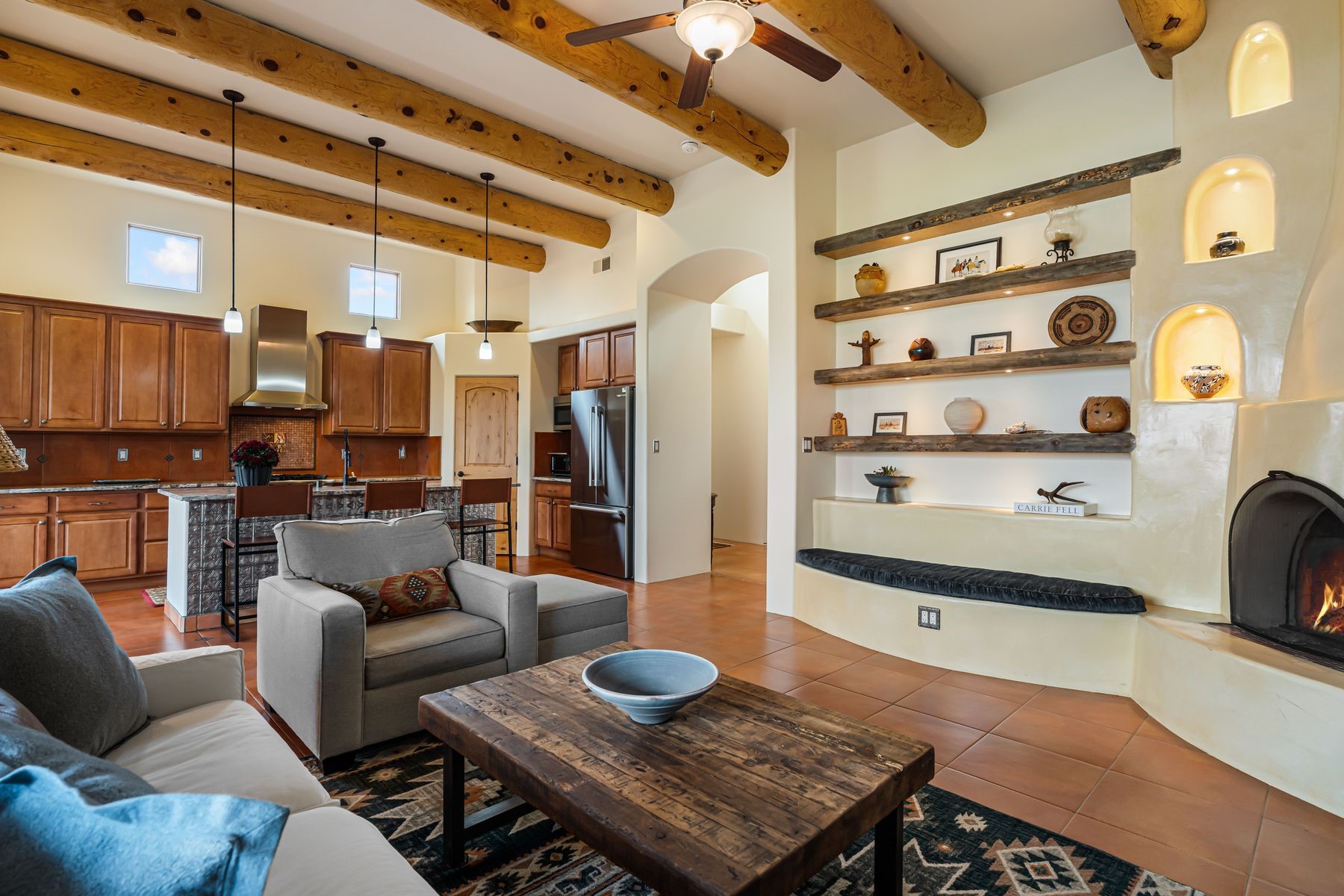 AMAZING VIEWS! Panoramic golf course, lake, Jemez Mountain and sunset views from this beautiful 3 bedroom & 2 bath Las Campanas home. Situated on an elevated lot overlooking the 14th fairway of the Jack Nicklaus designed Sunset Golf Course, this thoughtfully designed home is ideal as a permanent residence or turn-key second home. Wonderful open concept living is anchored by the cozy kiva fireplace on one end...and on the other a beautiful chef's kitchen where you'll find the spacious island with hammered copper farmhouse sink, top of the line appliances, generous pantry and beautiful dining area. Expansive windows capture the views, with French doors leading out to your covered portal for ideal outdoor entertaining. Your spacious Primary Suite enjoys those same incredible views and access to the portal, a spa-inspired bath featuring a jetted tub, walk in shower, double vanity and generous walk in closet. The Guest accommodations are nicely separated for privacy. Beautiful design features throughout... niches and built in shelving to showcase your art, classic vigas, cozy built in seating, roll down sun shades, custom doors & custom cabinetry. Additional highlights include new roof installed 2024 (transferable warranty), new refrigerator, new hot water heater, new patio railings and courtyard gates. Make this your ideal Santa Fe retreat!