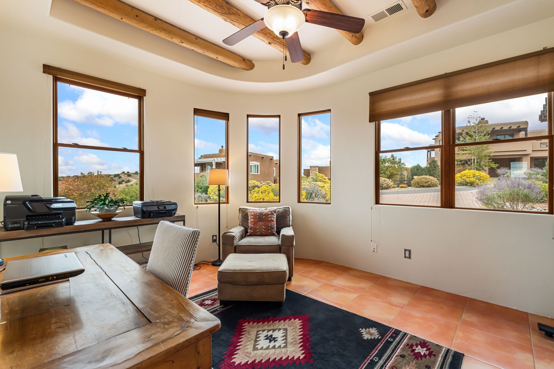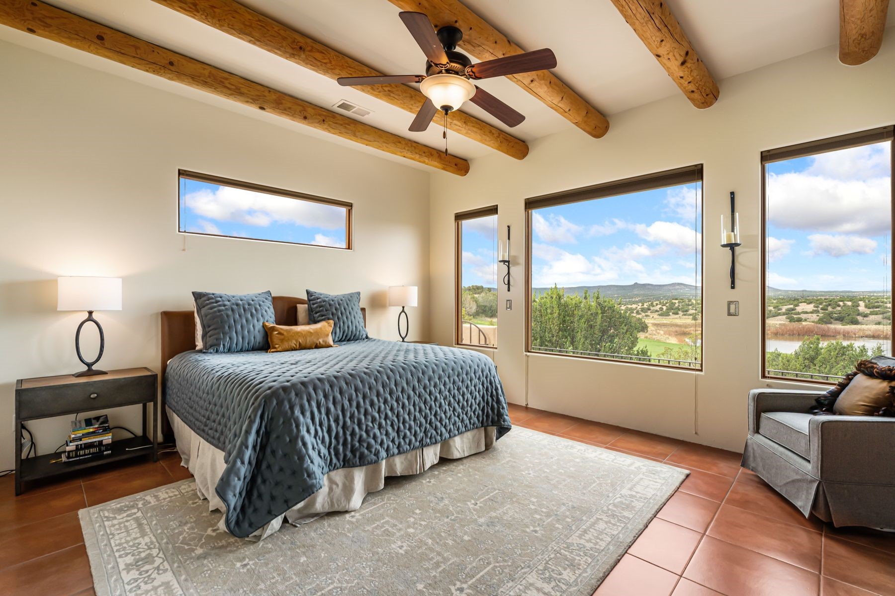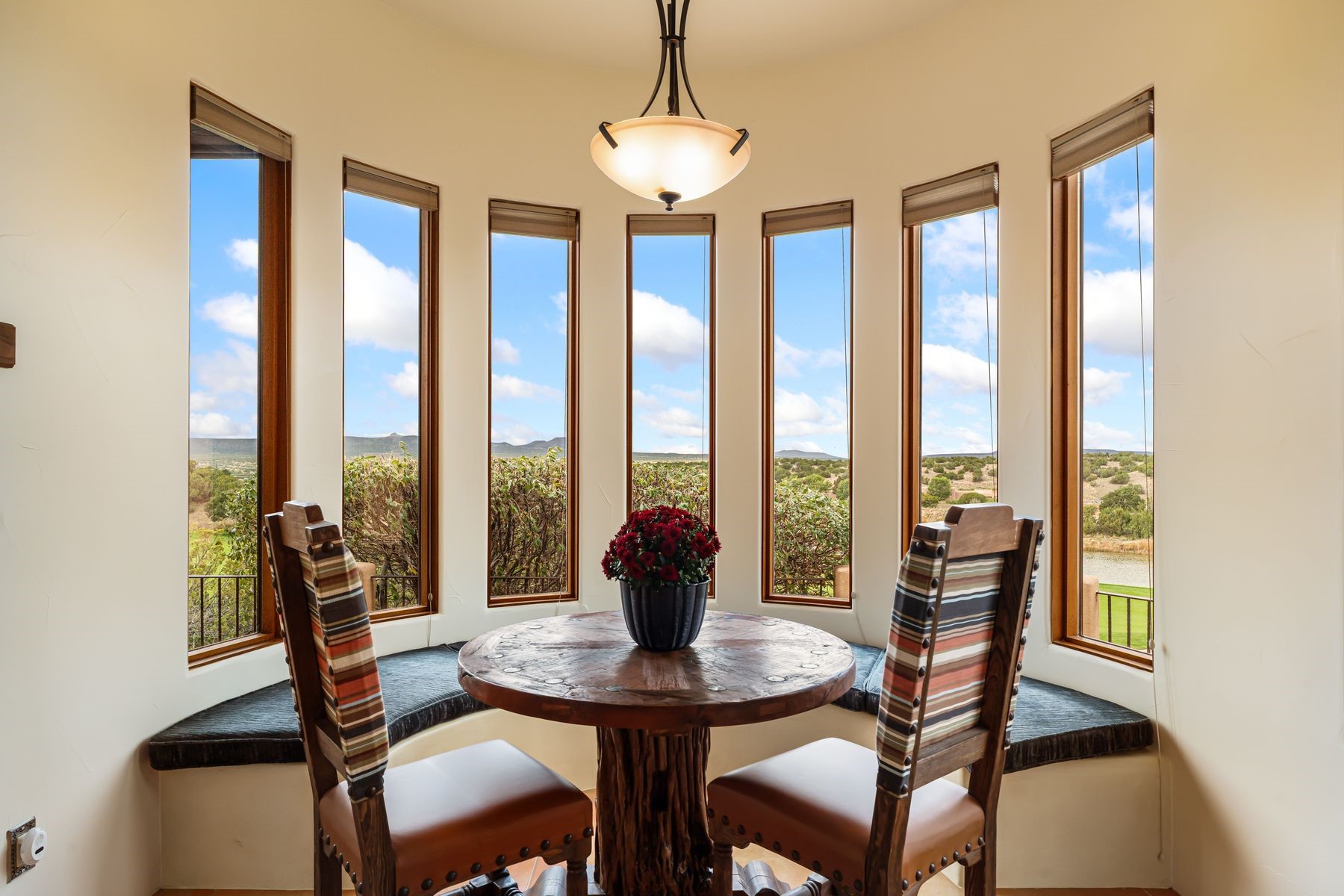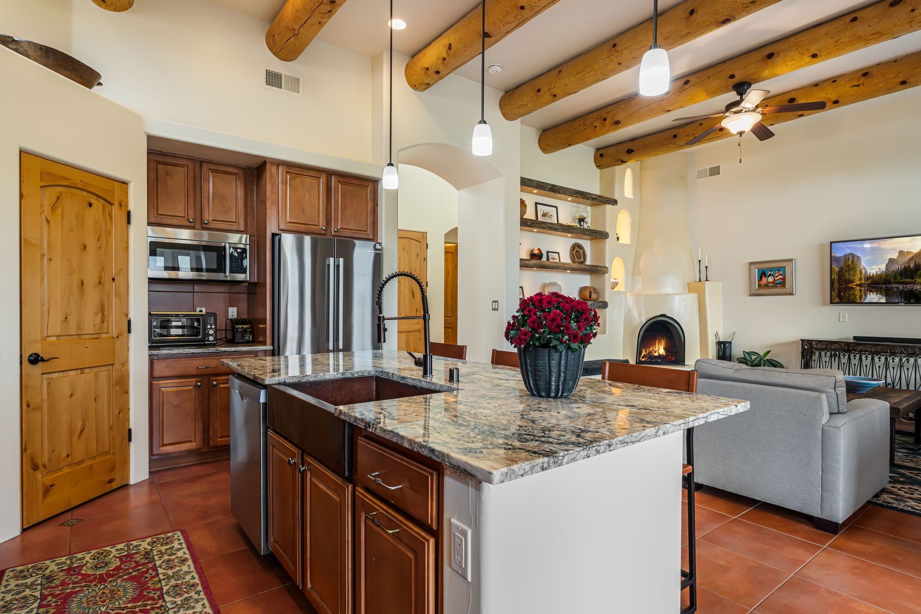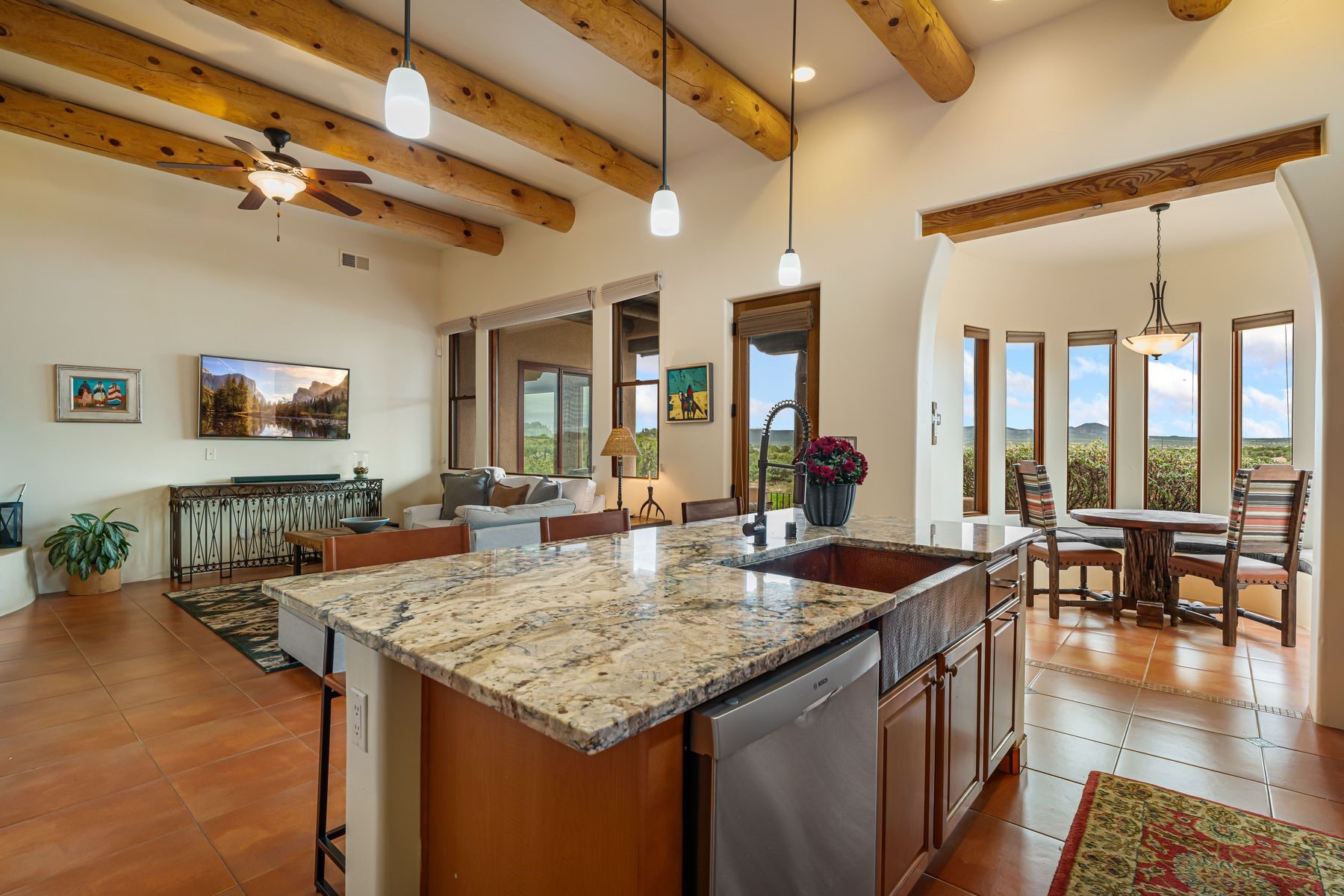 AMAZING VIEWS! Panoramic golf course, lake, Jemez Mountain and sunset views from this beautiful 3 bedroom & 2 bath Las Campanas home. Situated on an elevated lot overlooking the 14th fairway of the Jack Nicklaus designed Sunset Golf Course, this thoughtfully designed home is ideal as a permanent residence or turn-key second home. Wonderful open concept living is anchored by the cozy kiva fireplace on one end...and on the other a beautiful chef's kitchen where you'll find the spacious island with hammered copper farmhouse sink, top of the line appliances, generous pantry and beautiful dining area. Expansive windows capture the views, with French doors leading out to your covered portal for ideal outdoor entertaining. Your spacious Primary Suite enjoys those same incredible views and access to the portal, a spa-inspired bath featuring a jetted tub, walk in shower, double vanity and generous walk in closet. The Guest accommodations are nicely separated for privacy. Beautiful design features throughout... niches and built in shelving to showcase your art, classic vigas, cozy built in seating, roll down sun shades, custom doors & custom cabinetry. Additional highlights include new roof installed 2024 (transferable warranty), new refrigerator, new hot water heater, new patio railings and courtyard gates. Make this your ideal Santa Fe retreat!