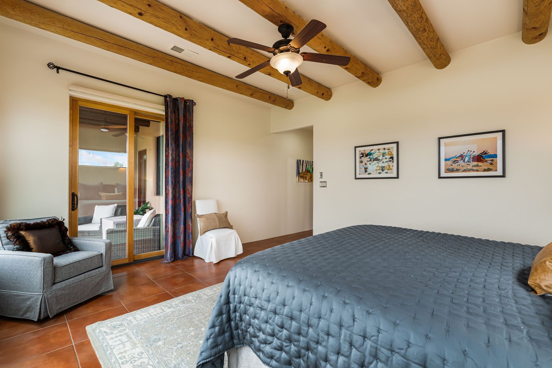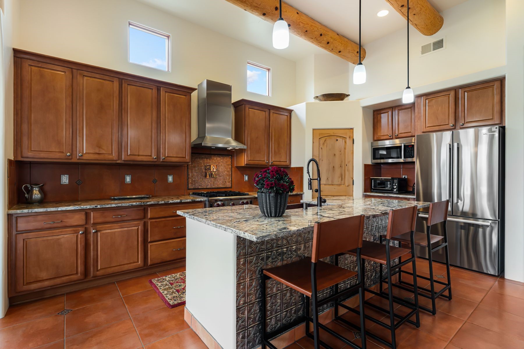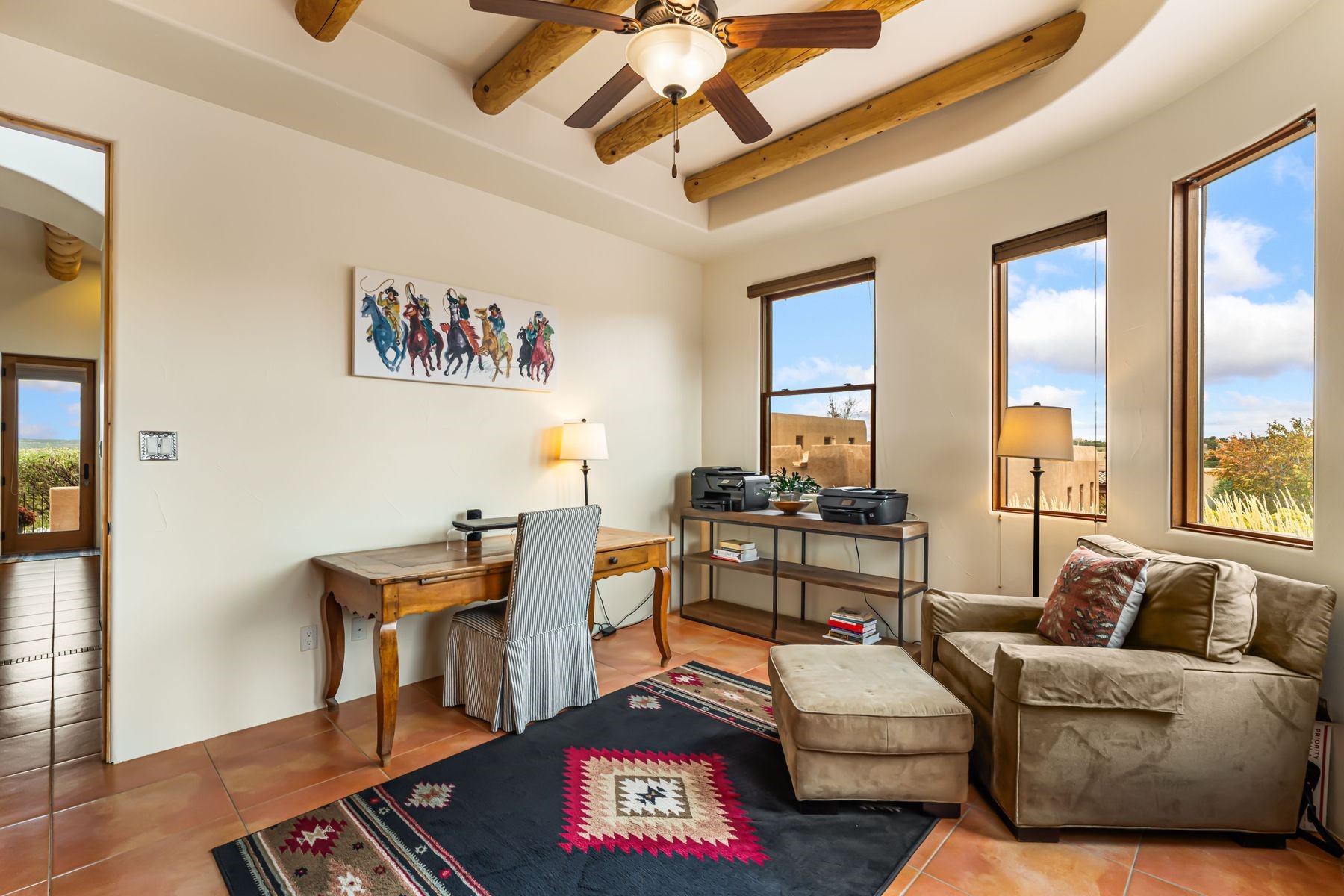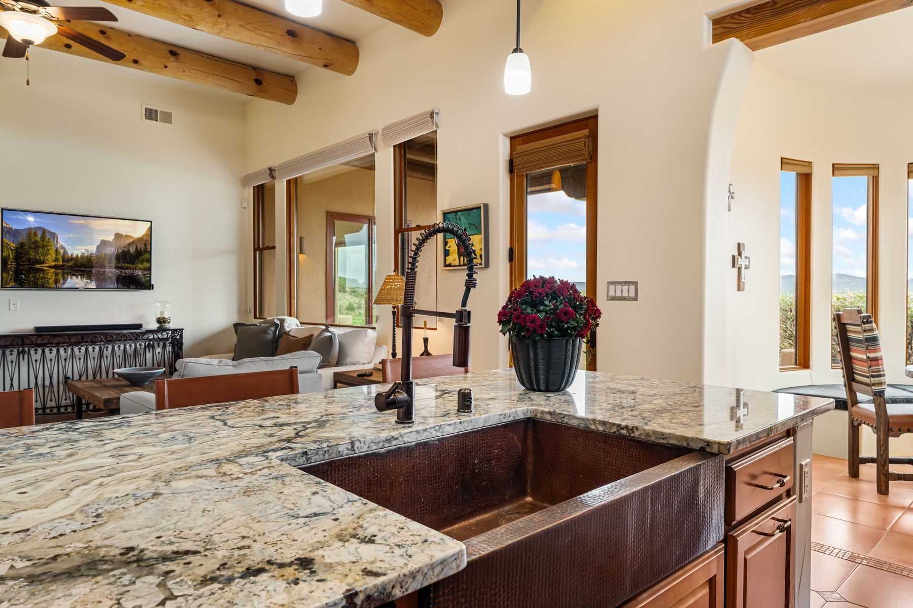 AMAZING VIEWS! Panoramic golf course, lake, Jemez Mountain and sunset views from this beautiful 3 bedroom & 2 bath Las Campanas home. Situated on an elevated lot overlooking the 14th fairway of the Jack Nicklaus designed Sunset Golf Course, this thoughtfully designed home is ideal as a permanent residence or turn-key second home. Wonderful open concept living is anchored by the cozy kiva fireplace on one end...and on the other a beautiful chef's kitchen where you'll find the spacious island with hammered copper farmhouse sink, top of the line appliances, generous pantry and beautiful dining area. Expansive windows capture the views, with French doors leading out to your covered portal for ideal outdoor entertaining. Your spacious Primary Suite enjoys those same incredible views and access to the portal, a spa-inspired bath featuring a jetted tub, walk in shower, double vanity and generous walk in closet. The Guest accommodations are nicely separated for privacy. Beautiful design features throughout... niches and built in shelving to showcase your art, classic vigas, cozy built in seating, roll down sun shades, custom doors & custom cabinetry. Additional highlights include new roof installed 2024 (transferable warranty), new refrigerator, new hot water heater, new patio railings and courtyard gates. Make this your ideal Santa Fe retreat!
