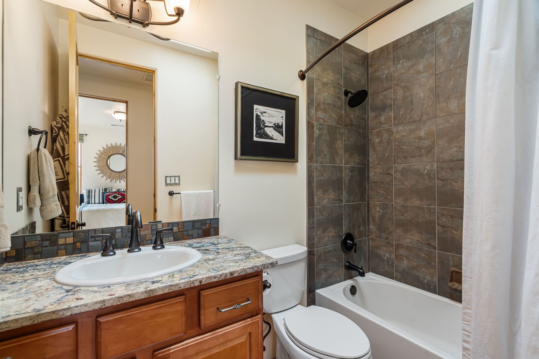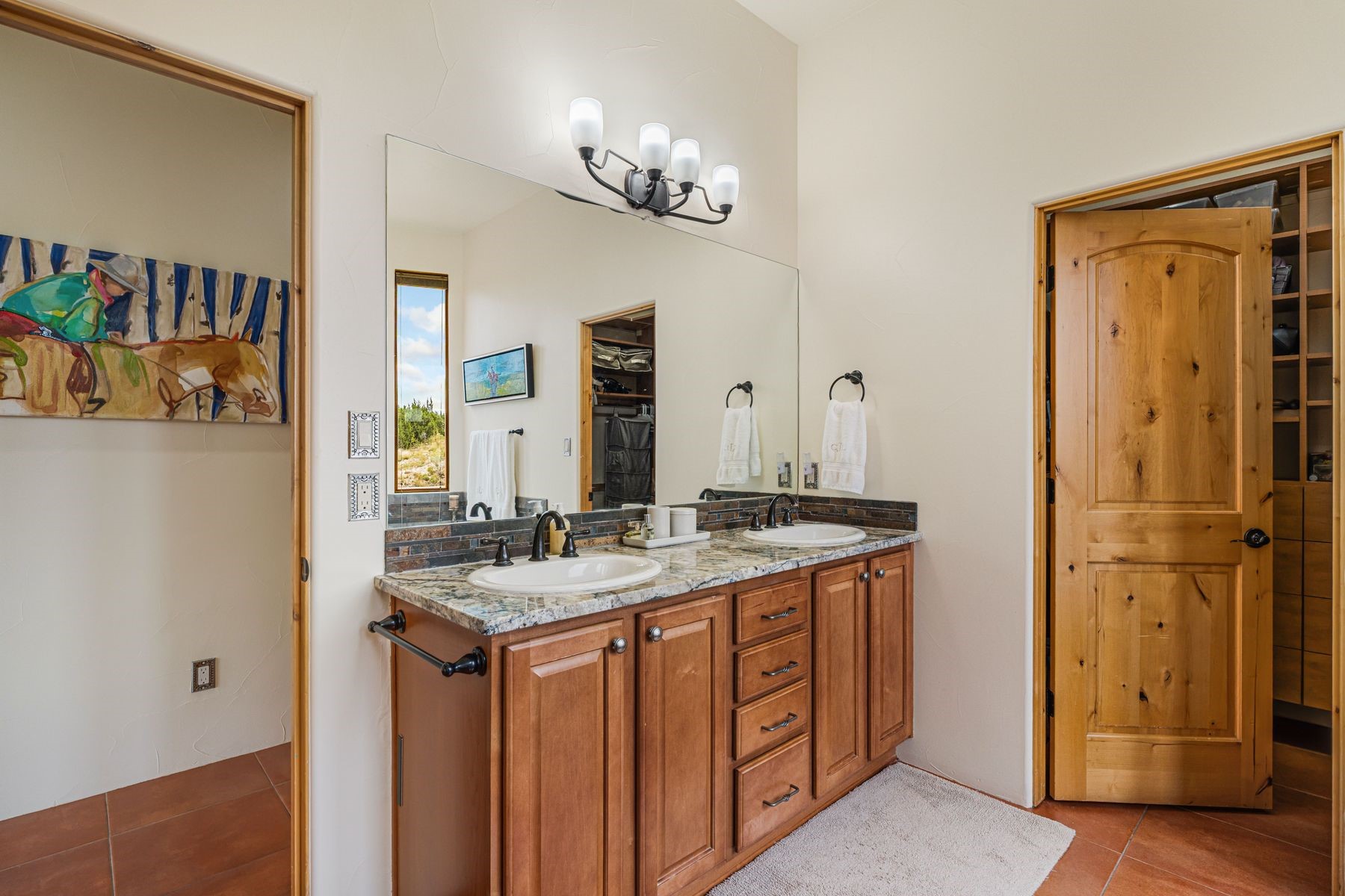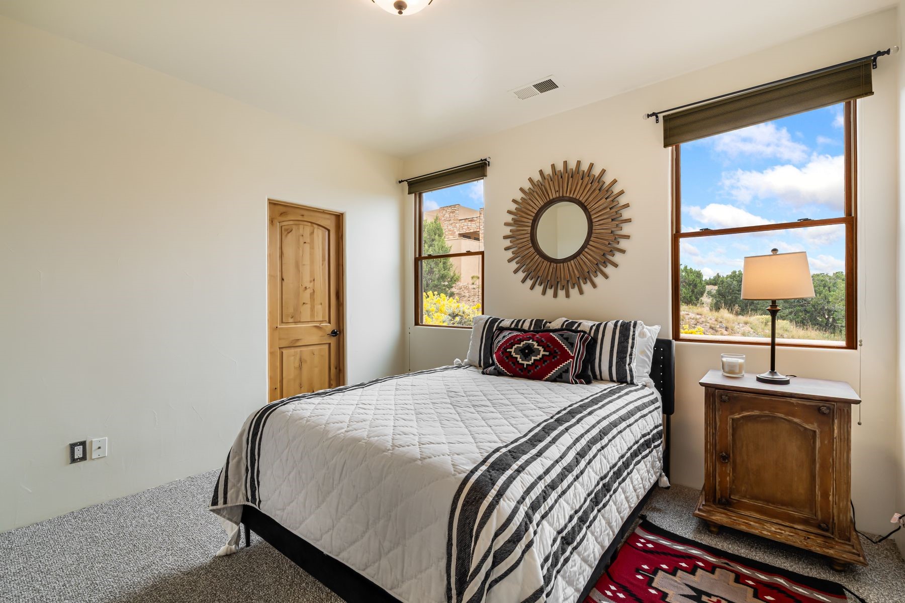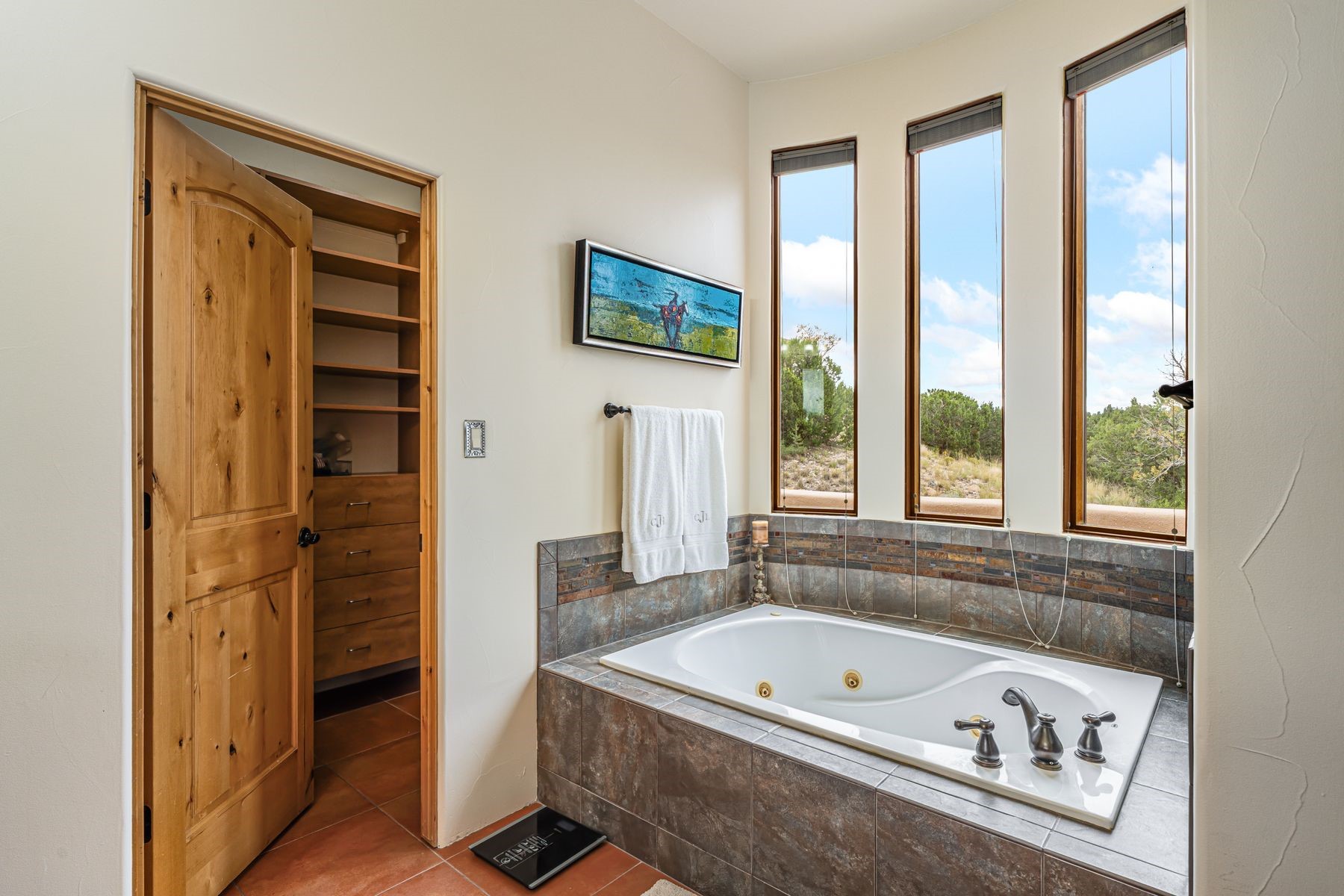 AMAZING VIEWS! Panoramic golf course, lake, Jemez Mountain and sunset views from this beautiful 3 bedroom & 2 bath Las Campanas home. Situated on an elevated lot overlooking the 14th fairway of the Jack Nicklaus designed Sunset Golf Course, this thoughtfully designed home is ideal as a permanent residence or turn-key second home. Wonderful open concept living is anchored by the cozy kiva fireplace on one end...and on the other a beautiful chef's kitchen where you'll find the spacious island with hammered copper farmhouse sink, top of the line appliances, generous pantry and beautiful dining area. Expansive windows capture the views, with French doors leading out to your covered portal for ideal outdoor entertaining. Your spacious Primary Suite enjoys those same incredible views and access to the portal, a spa-inspired bath featuring a jetted tub, walk in shower, double vanity and generous walk in closet. The Guest accommodations are nicely separated for privacy. Beautiful design features throughout... niches and built in shelving to showcase your art, classic vigas, cozy built in seating, roll down sun shades, custom doors & custom cabinetry. Additional highlights include new roof installed 2024 (transferable warranty), new refrigerator, new hot water heater, new patio railings and courtyard gates. Make this your ideal Santa Fe retreat!