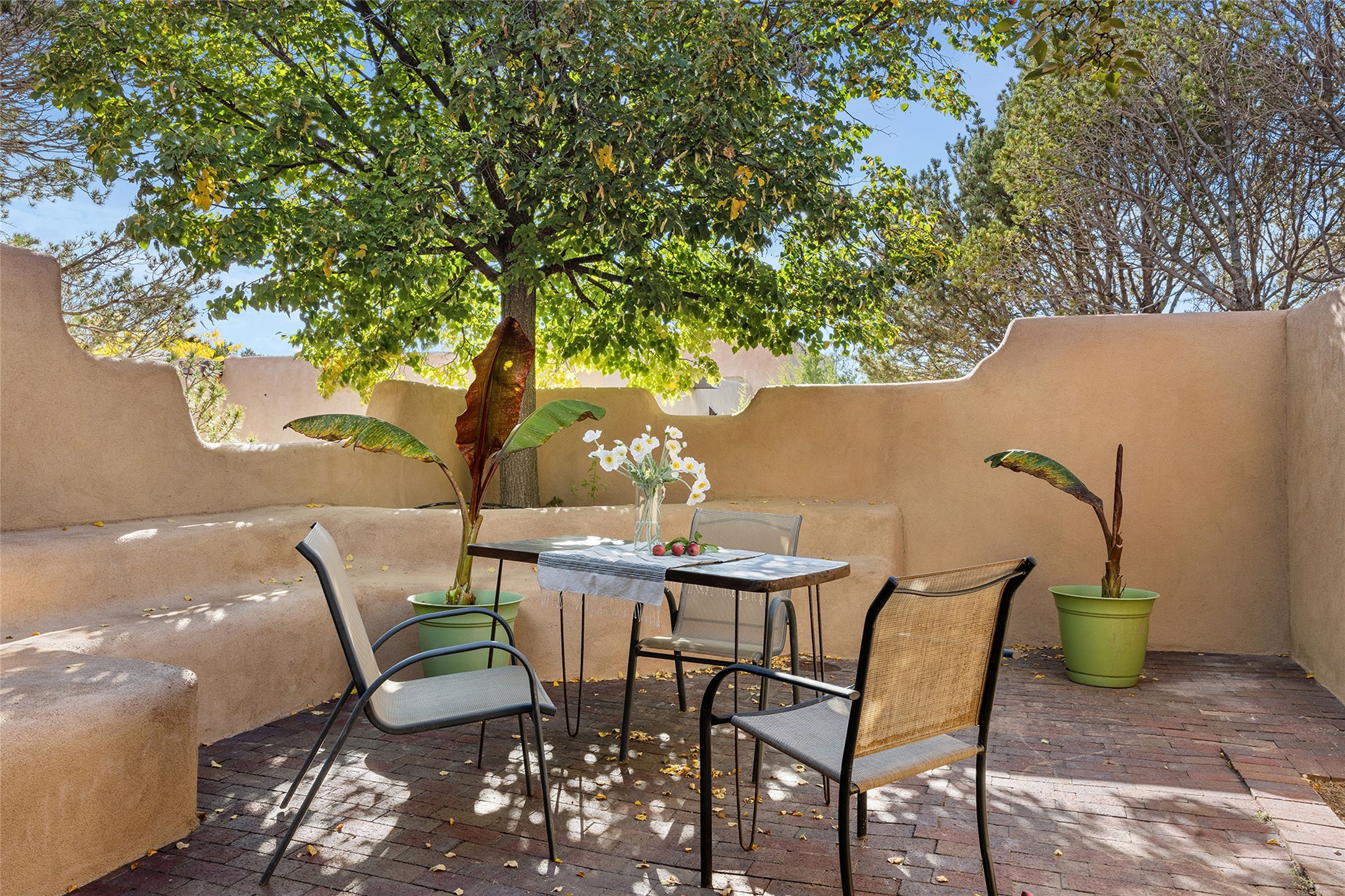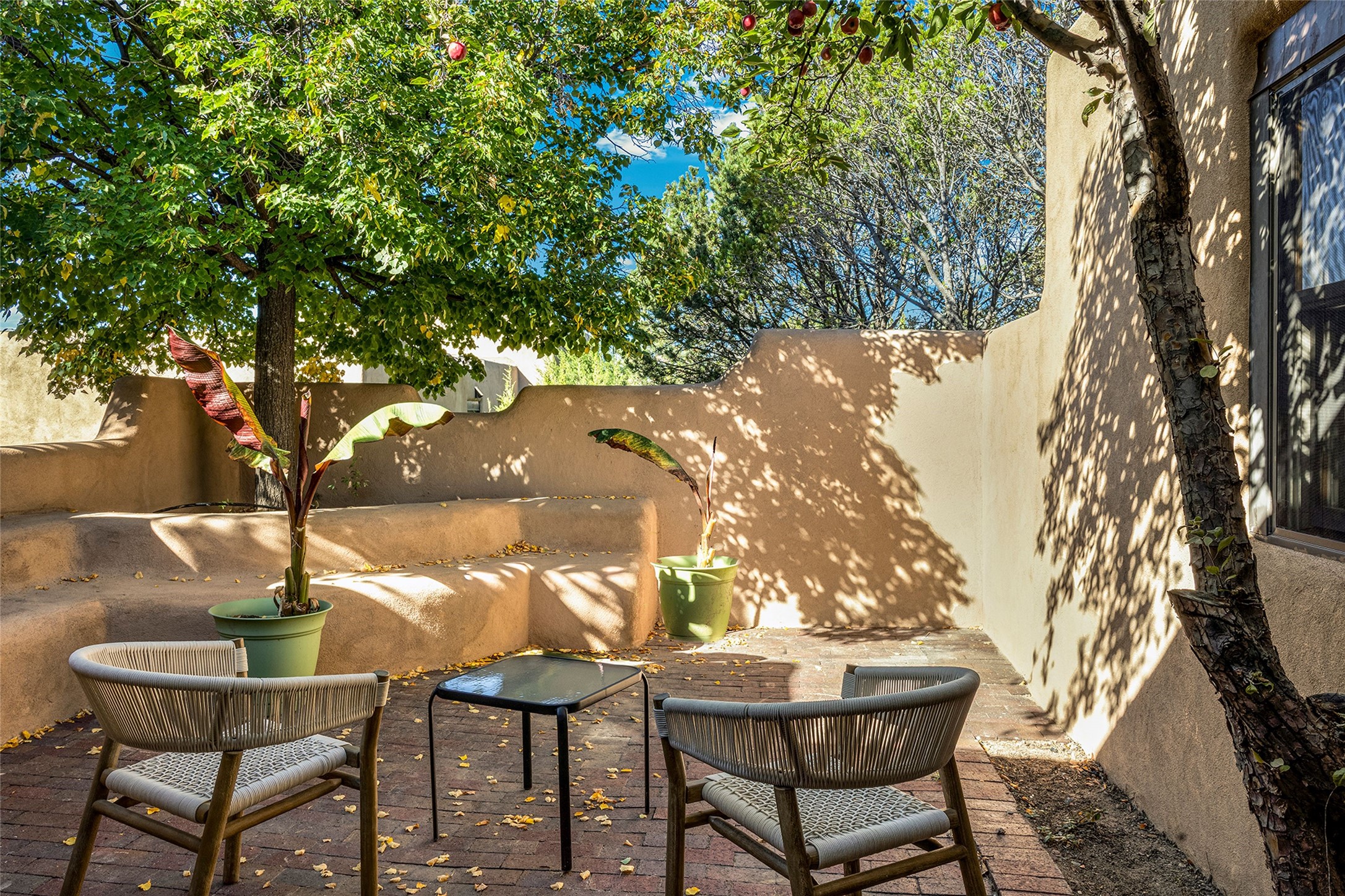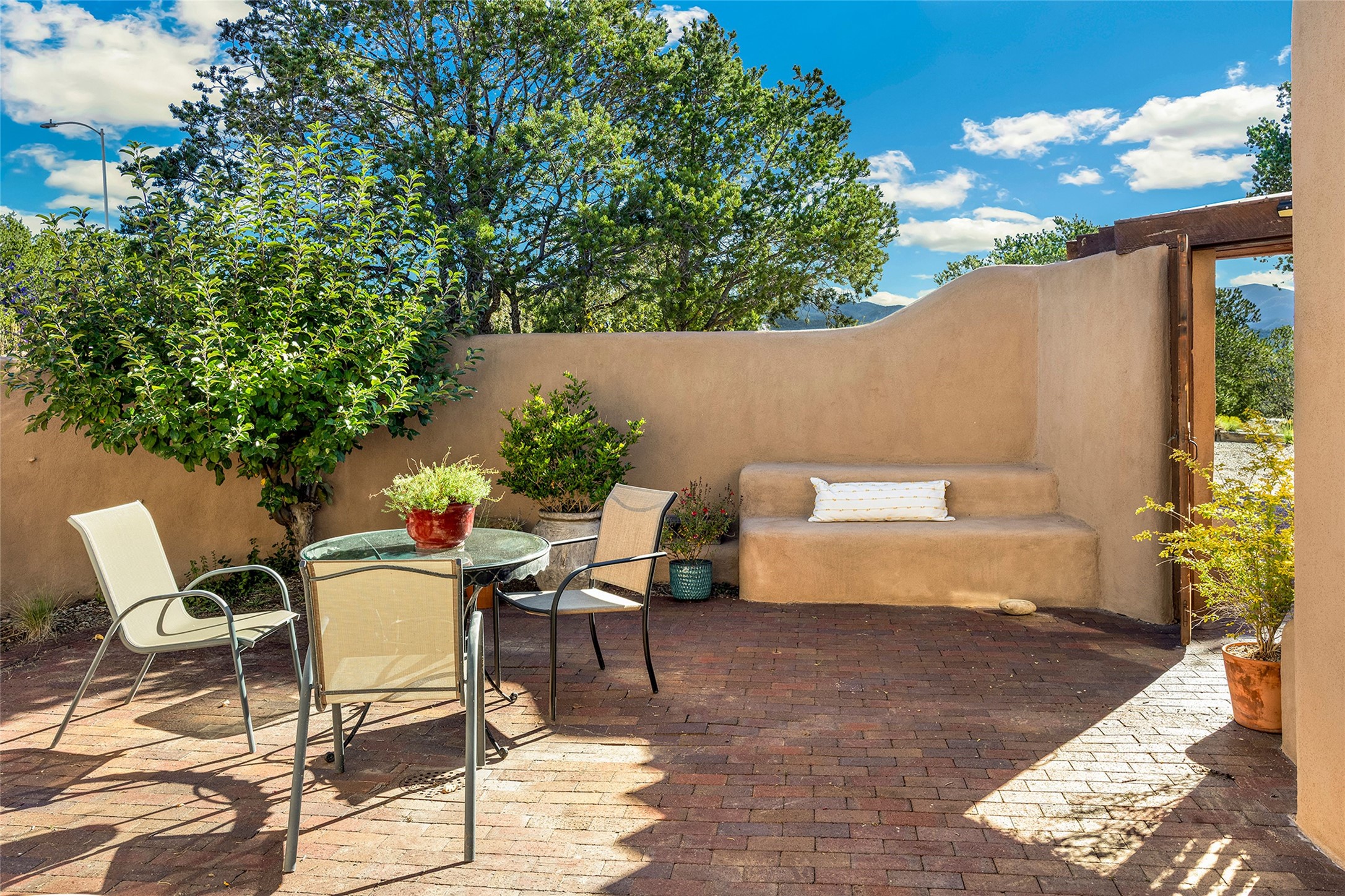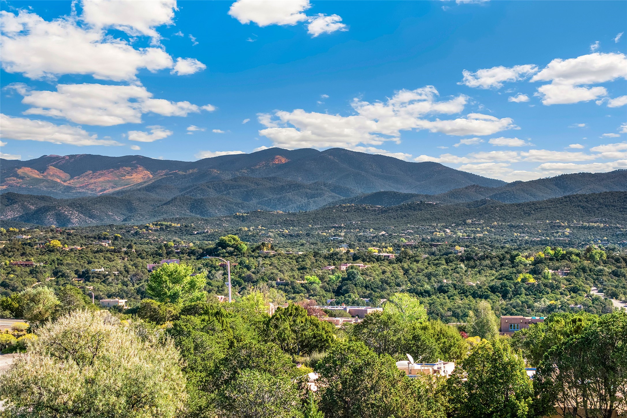 Perched at the top of the hill, this exceptional single-level end-unit condominium was the former model home and enjoys both privacy and breathtaking Sangre de Cristo mountain views. A rare three-bedroom, three-bath residence on the desirable north side, it offers easy access to downtown Santa Fe. being one mile away, the Ski Basin, mountain trails and Los Alamos.Thoughtfully updated throughout, all three en-suite baths were renovated to the studs last year and hardwood floors were added throughout the home by this owner. The primary suite has a large walk in closet and the front guest suite has a wall of built in bookcases that create a cozy study. The updated kitchen (2019) features granite countertops, stainless steel appliances, lighting, and sink. Additional upgrades include a GAF TPO roof (2018) with transferable warranty, a natural gas furnace and central refrigerated air (2018) and 99% UV-reduction skylights (2015) and the HOA recently completed stucco updates.The floor plan offers comfortable flow and separation of bedrooms, while the inviting front courtyard captures dramatic mountain views--an ideal setting for morning coffee or evening sunsets. The rear courtyard opens to a greenbelt, providing a tranquil backdrop for entertaining or relaxing. A one-car attached garage and two off-street parking spaces complete this move-in-ready gem.This special property combines classic Santa Fe charm, meticulous updates, and an unbeatable location.