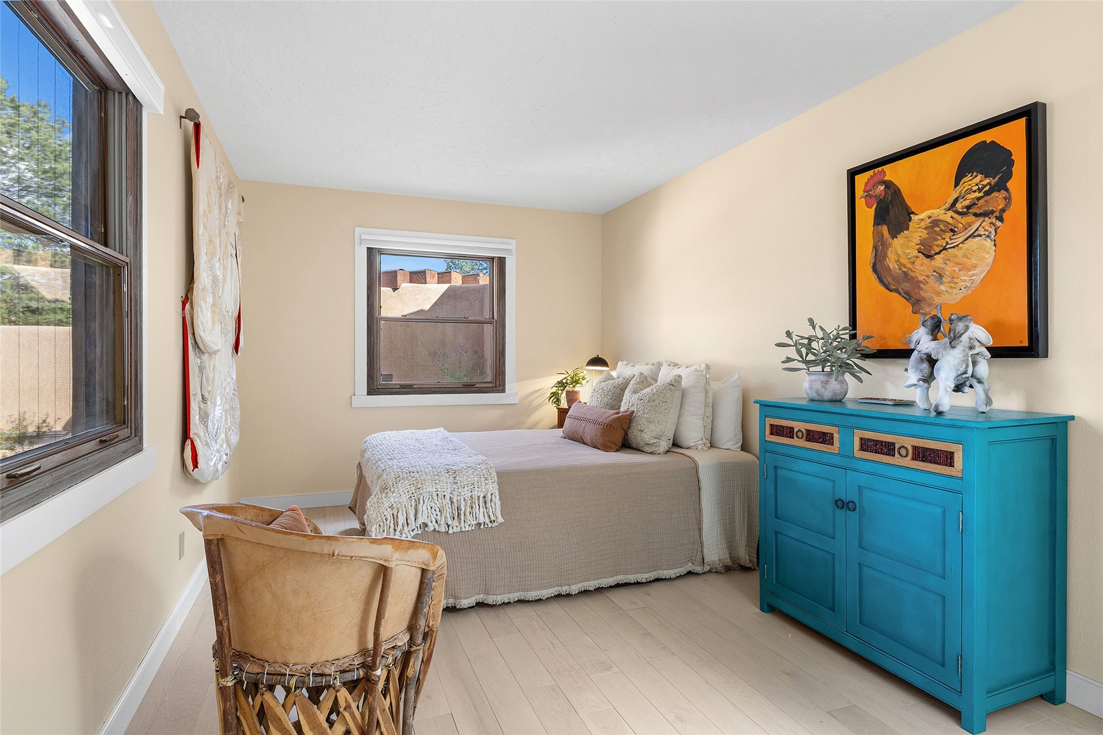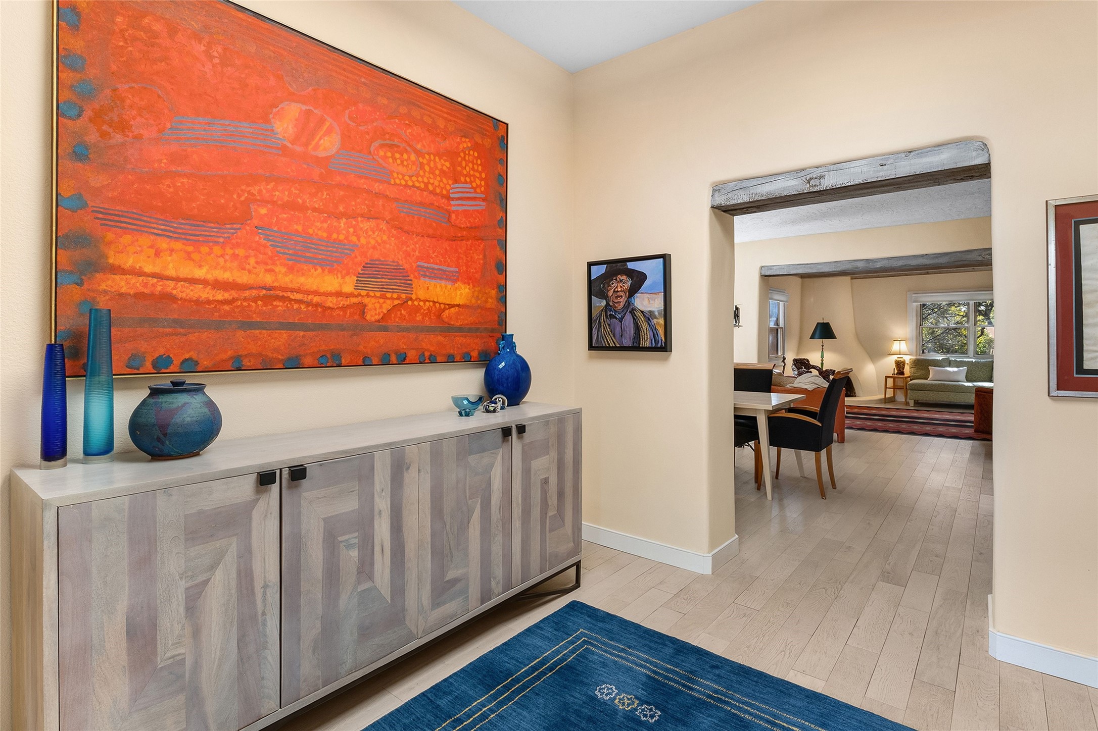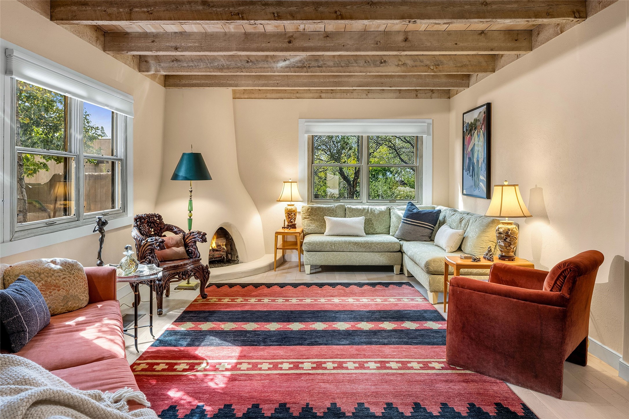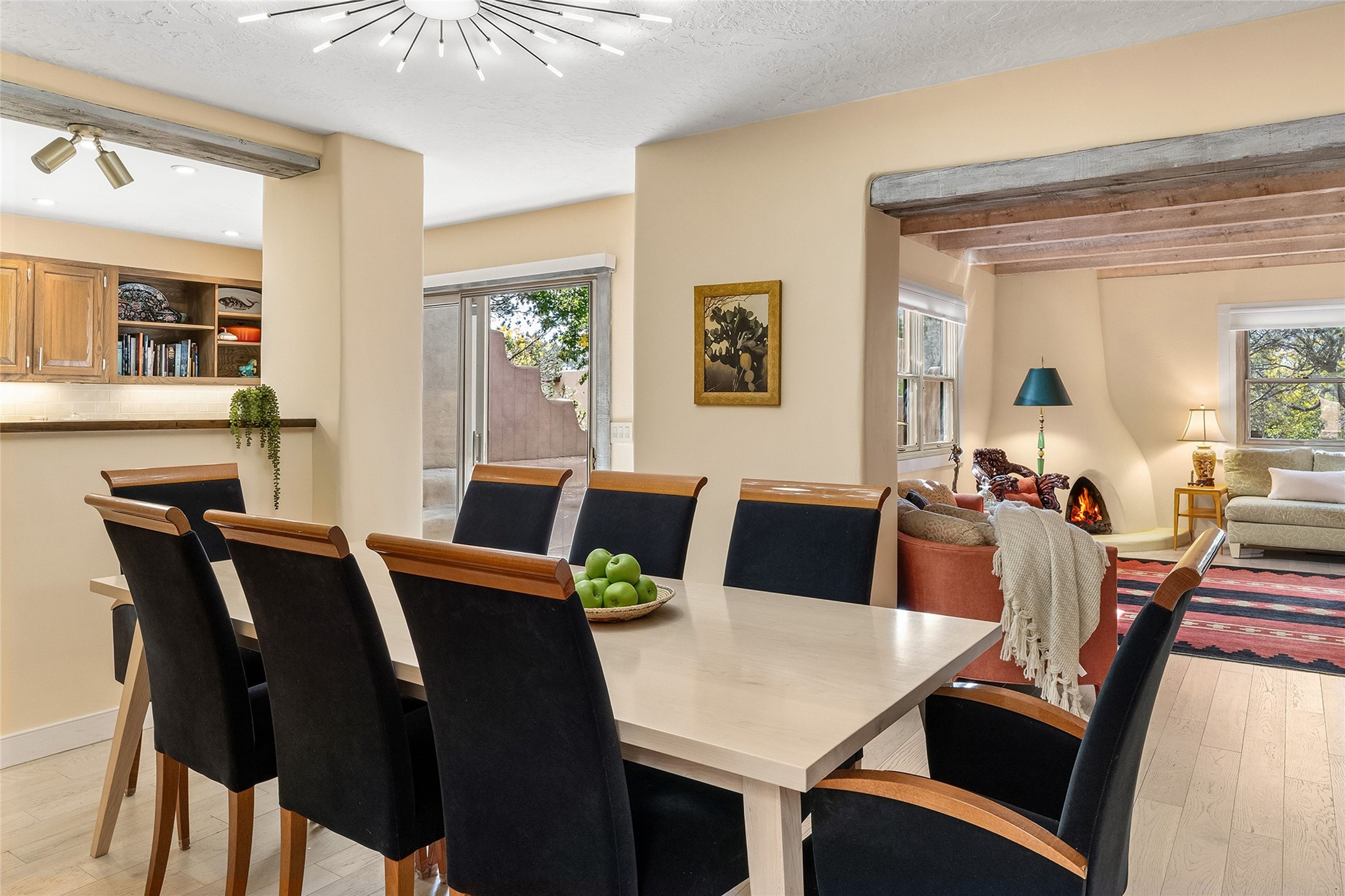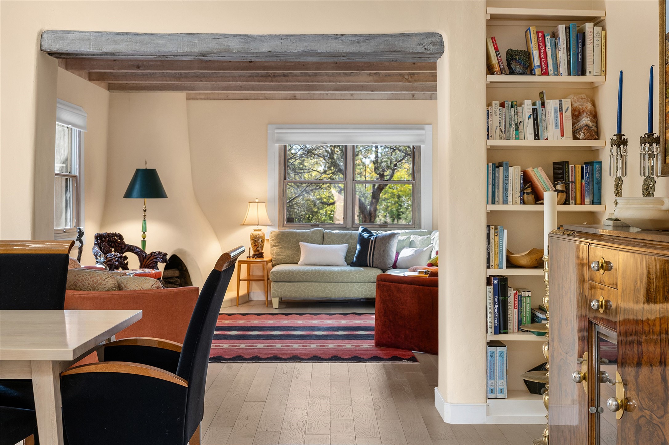 Perched at the top of the hill, this exceptional single-level end-unit condominium was the former model home and enjoys both privacy and breathtaking Sangre de Cristo mountain views. A rare three-bedroom, three-bath residence on the desirable north side, it offers easy access to downtown Santa Fe. being one mile away, the Ski Basin, mountain trails and Los Alamos.Thoughtfully updated throughout, all three en-suite baths were renovated to the studs last year and hardwood floors were added throughout the home by this owner. The primary suite has a large walk in closet and the front guest suite has a wall of built in bookcases that create a cozy study. The updated kitchen (2019) features granite countertops, stainless steel appliances, lighting, and sink. Additional upgrades include a GAF TPO roof (2018) with transferable warranty, a natural gas furnace and central refrigerated air (2018) and 99% UV-reduction skylights (2015) and the HOA recently completed stucco updates.The floor plan offers comfortable flow and separation of bedrooms, while the inviting front courtyard captures dramatic mountain views--an ideal setting for morning coffee or evening sunsets. The rear courtyard opens to a greenbelt, providing a tranquil backdrop for entertaining or relaxing. A one-car attached garage and two off-street parking spaces complete this move-in-ready gem.This special property combines classic Santa Fe charm, meticulous updates, and an unbeatable location.
