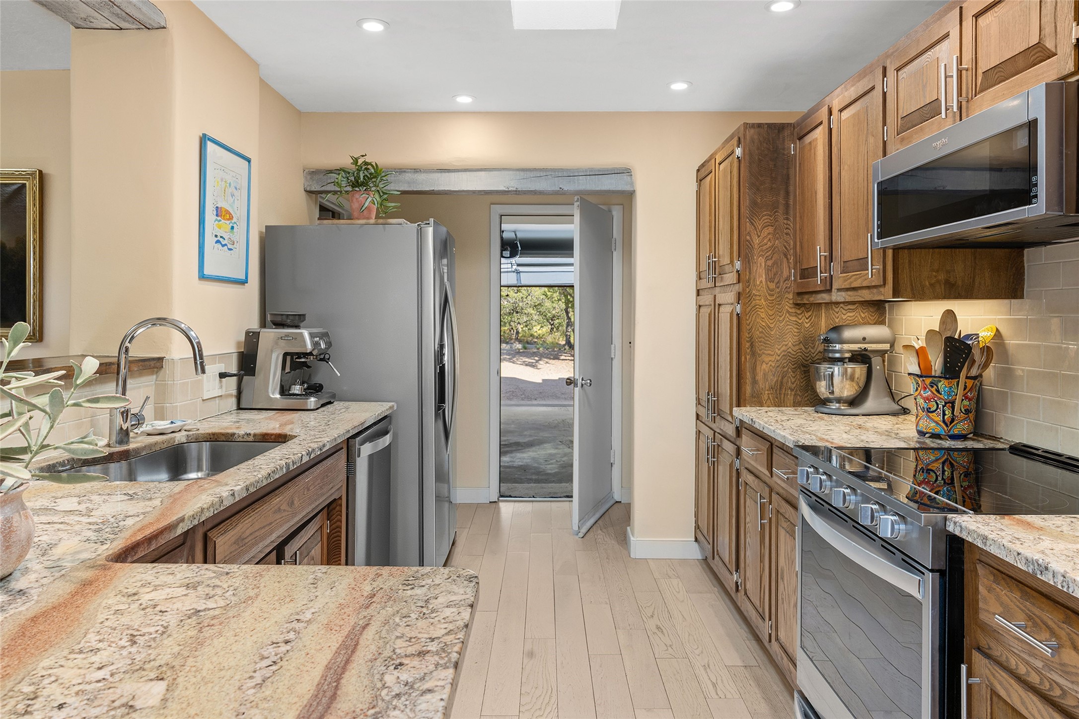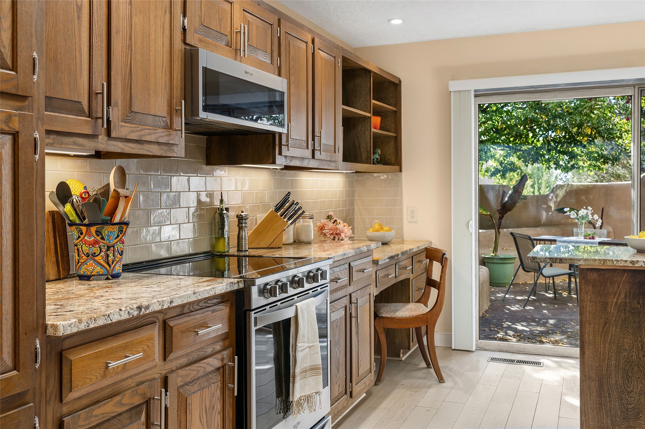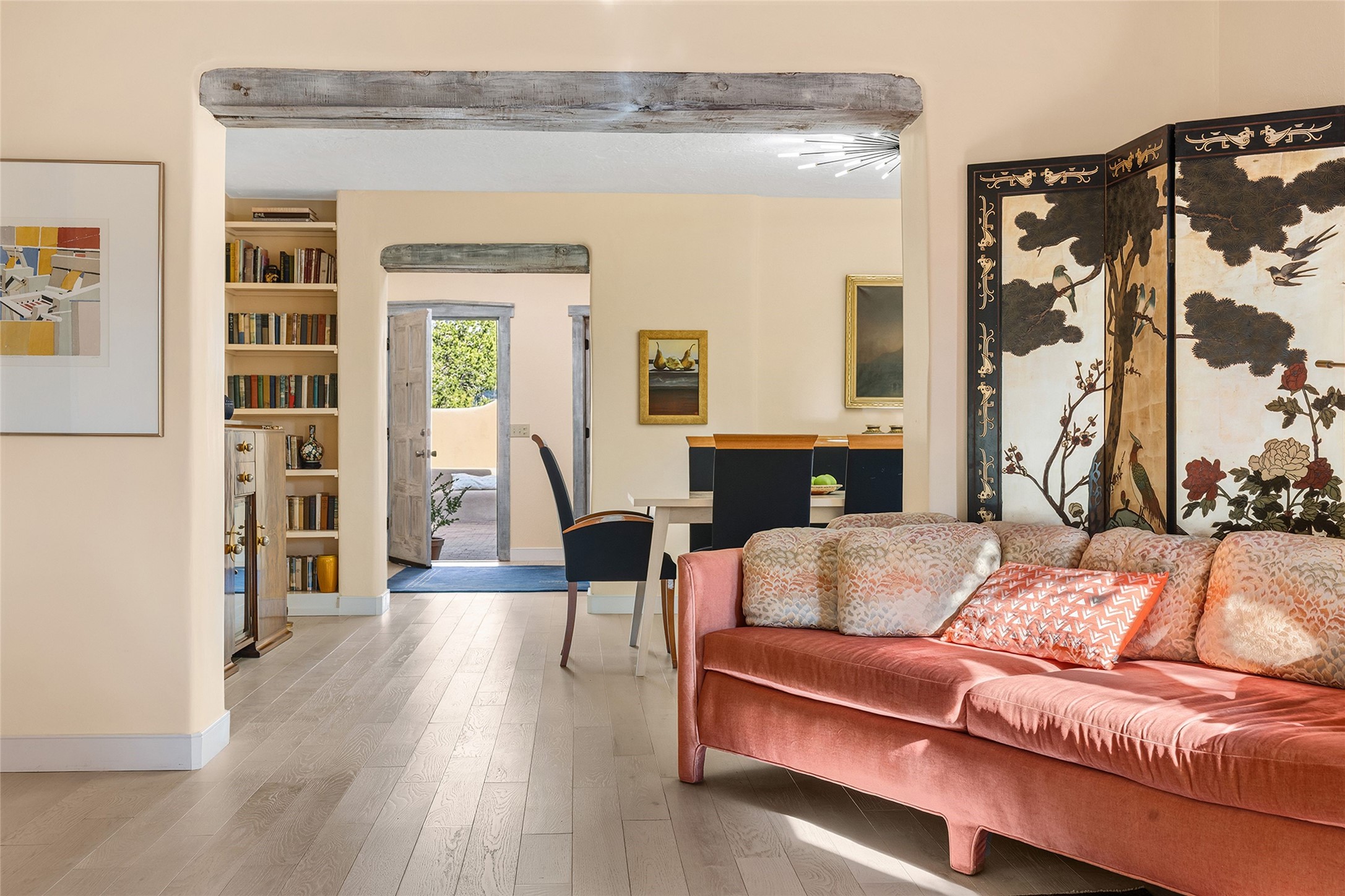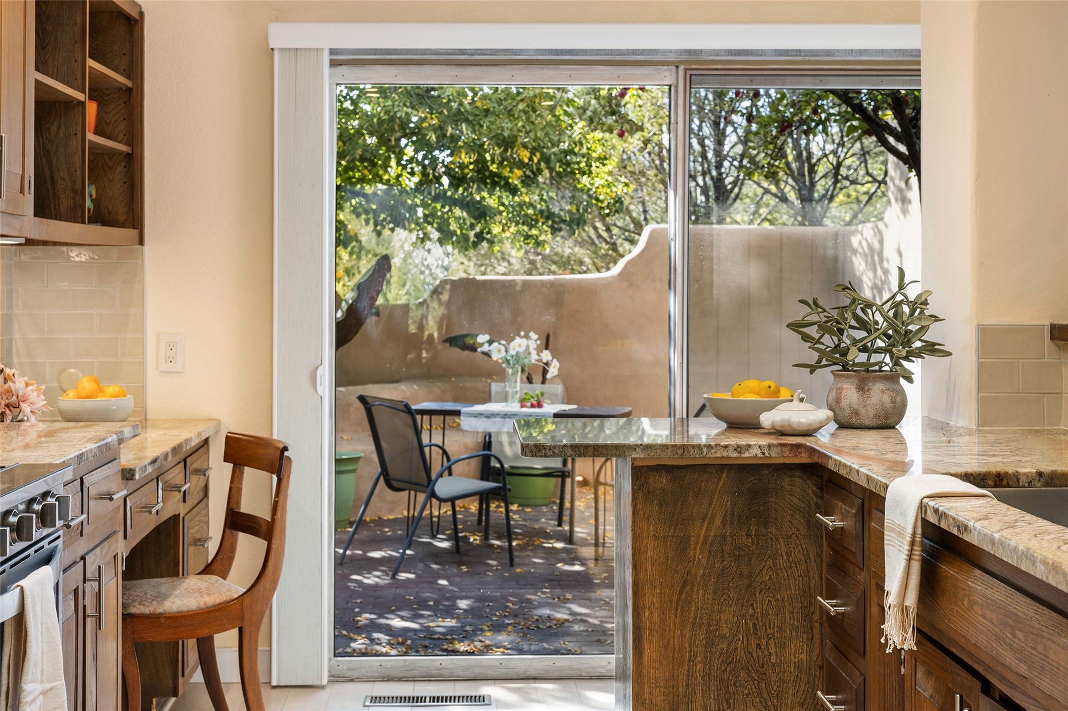 Perched at the top of the hill, this exceptional single-level end-unit condominium was the former model home and enjoys both privacy and breathtaking Sangre de Cristo mountain views. A rare three-bedroom, three-bath residence on the desirable north side, it offers easy access to downtown Santa Fe. being one mile away, the Ski Basin, mountain trails and Los Alamos.Thoughtfully updated throughout, all three en-suite baths were renovated to the studs last year and hardwood floors were added throughout the home by this owner. The primary suite has a large walk in closet and the front guest suite has a wall of built in bookcases that create a cozy study. The updated kitchen (2019) features granite countertops, stainless steel appliances, lighting, and sink. Additional upgrades include a GAF TPO roof (2018) with transferable warranty, a natural gas furnace and central refrigerated air (2018) and 99% UV-reduction skylights (2015) and the HOA recently completed stucco updates.The floor plan offers comfortable flow and separation of bedrooms, while the inviting front courtyard captures dramatic mountain views--an ideal setting for morning coffee or evening sunsets. The rear courtyard opens to a greenbelt, providing a tranquil backdrop for entertaining or relaxing. A one-car attached garage and two off-street parking spaces complete this move-in-ready gem.This special property combines classic Santa Fe charm, meticulous updates, and an unbeatable location.