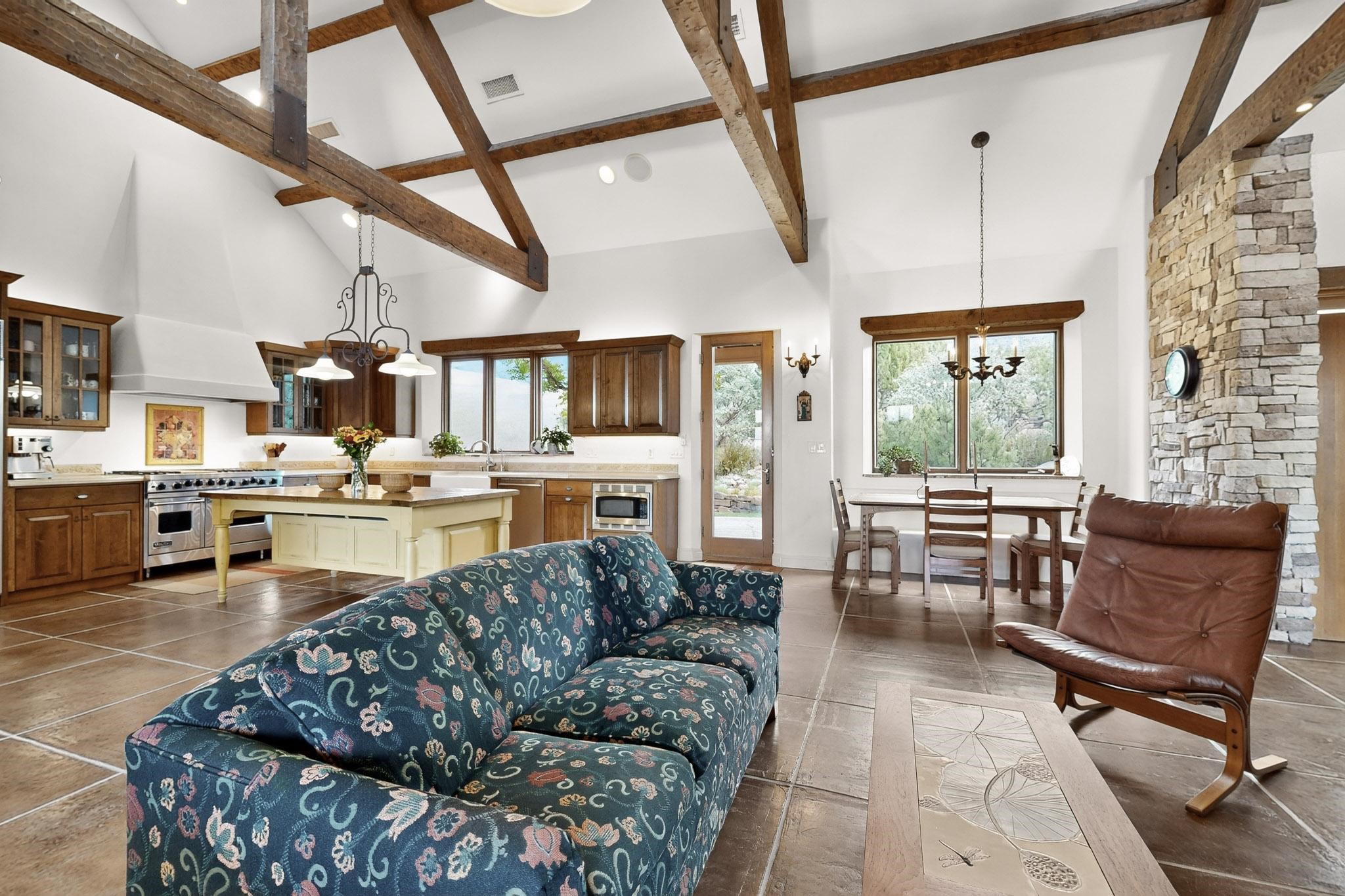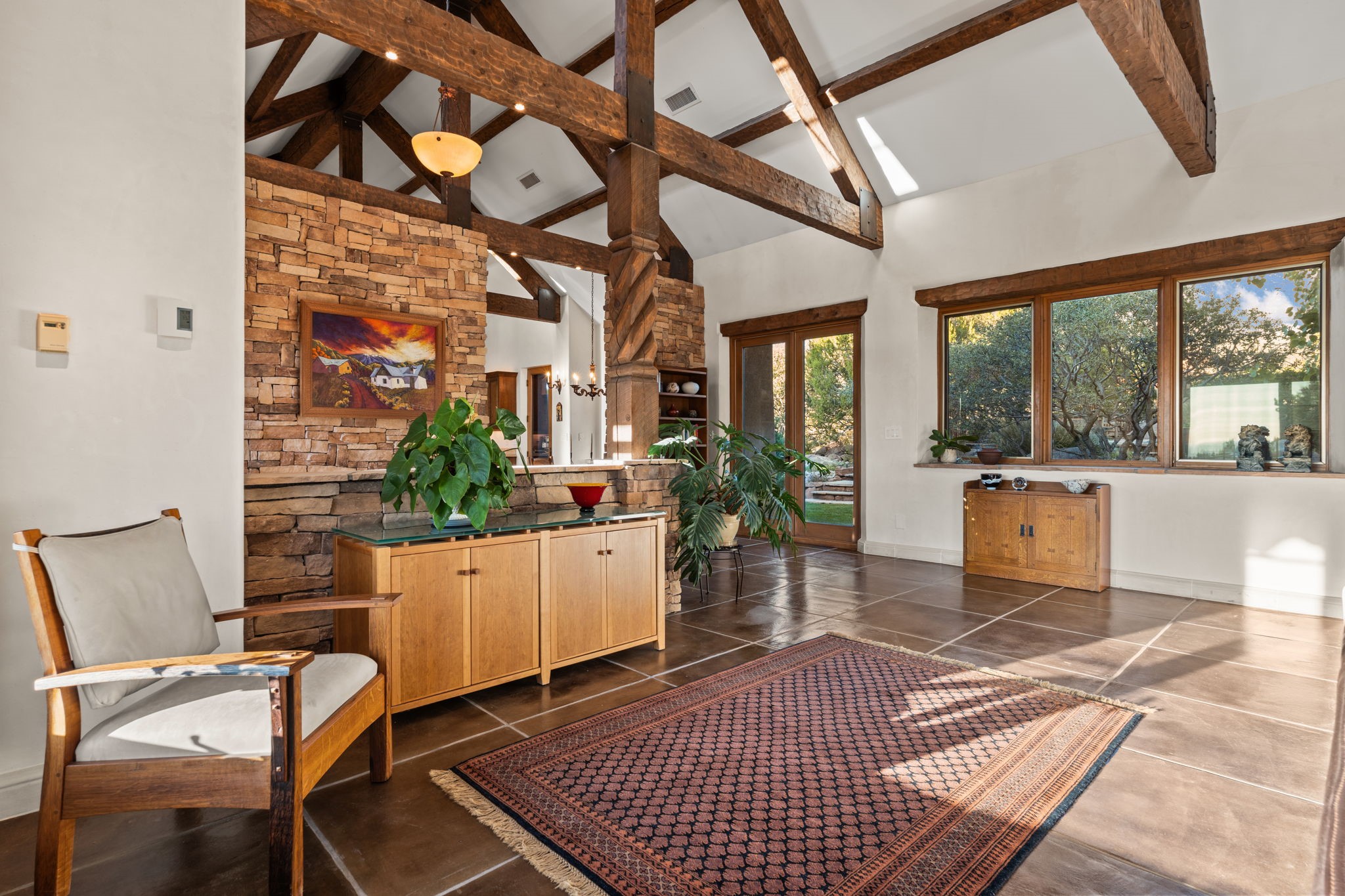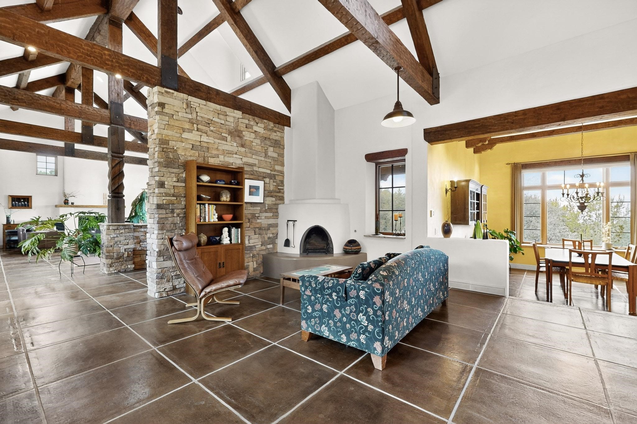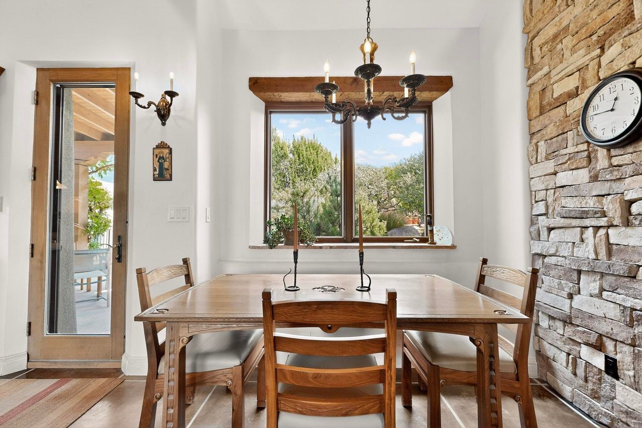 With vistas of the Sandia Mountains and city lights, this spacious 5,513 sq. ft. Sandia Heights estate is a rare blend of artistry, craftsmanship, and luxury. Upon entering the front door, the spacious living area introduces the understated beauty of this special home with hand-crafted details, deep sandstone sills, and a beautiful wood-burning fireplace. Features such as expansive chip-carved beams, custom doors, and diamond plaster walls provide warmth and refinement. Expansive windows frame breathtaking views and bath the house with natural light, magically merging the outdoor and indoor spaces. The kitchen is a chef's dream with a Sub-Zero refrigerator and freezer, Viking Professional 6-burner stove with griddle, and a butler's pantry complete with a Sub-Zero wine and beverage coolerTogether with the eating nook, kiva fireplace seating area, and formal dining room the kitchen area is perfect for evenings with family or elegant entertaining. The primary suite is a true sanctuary featuring a coved ceiling with exposed beams and corbels, a gas log fireplace, and a cozy seating area with latilla ceiling and built-in bookcases. The adjoining spa-inspired bath has it all - a steam shower, dual shower heads, travertine seating, a skylight over the garden jetted tub, and a private yoga and meditation room. Additional living spaces include a home office attached to a secondary living room and multiple generous ensuite bedrooms. The private backyard feels like a Zen oasis under New Mexico skies with a tiered garden, in-ground spa, outdoor fireplace, and covered patio. Modern comforts abound with in-floor hot water radiant heat, large 3-car garage, abundant storage, central vacuum, built-in speakers, new stucco and septic in 2025! This could be your ABQ Dream Home!
