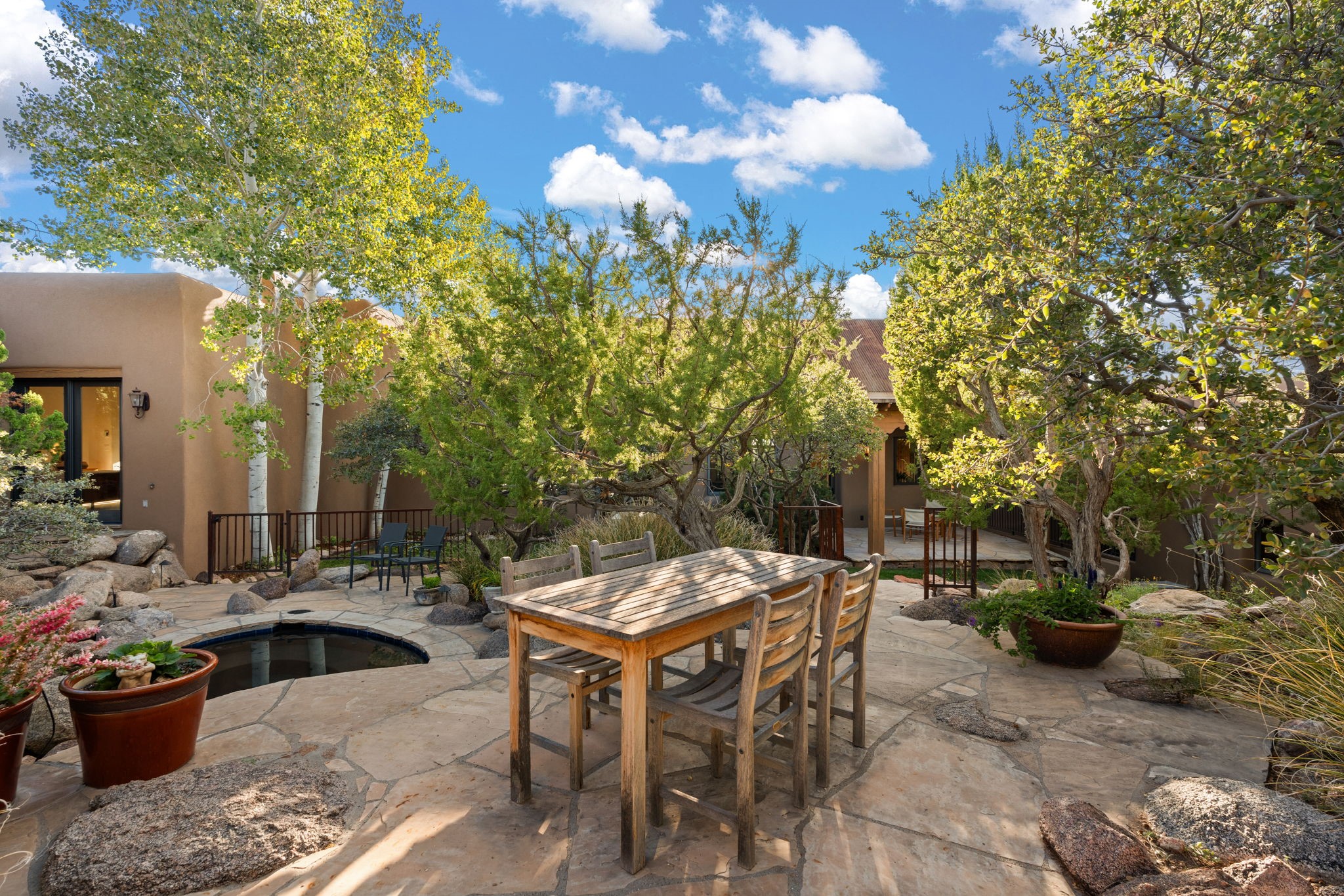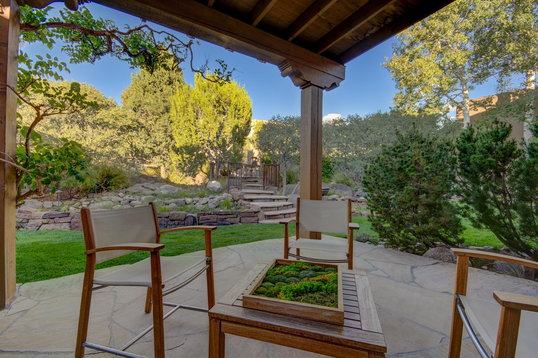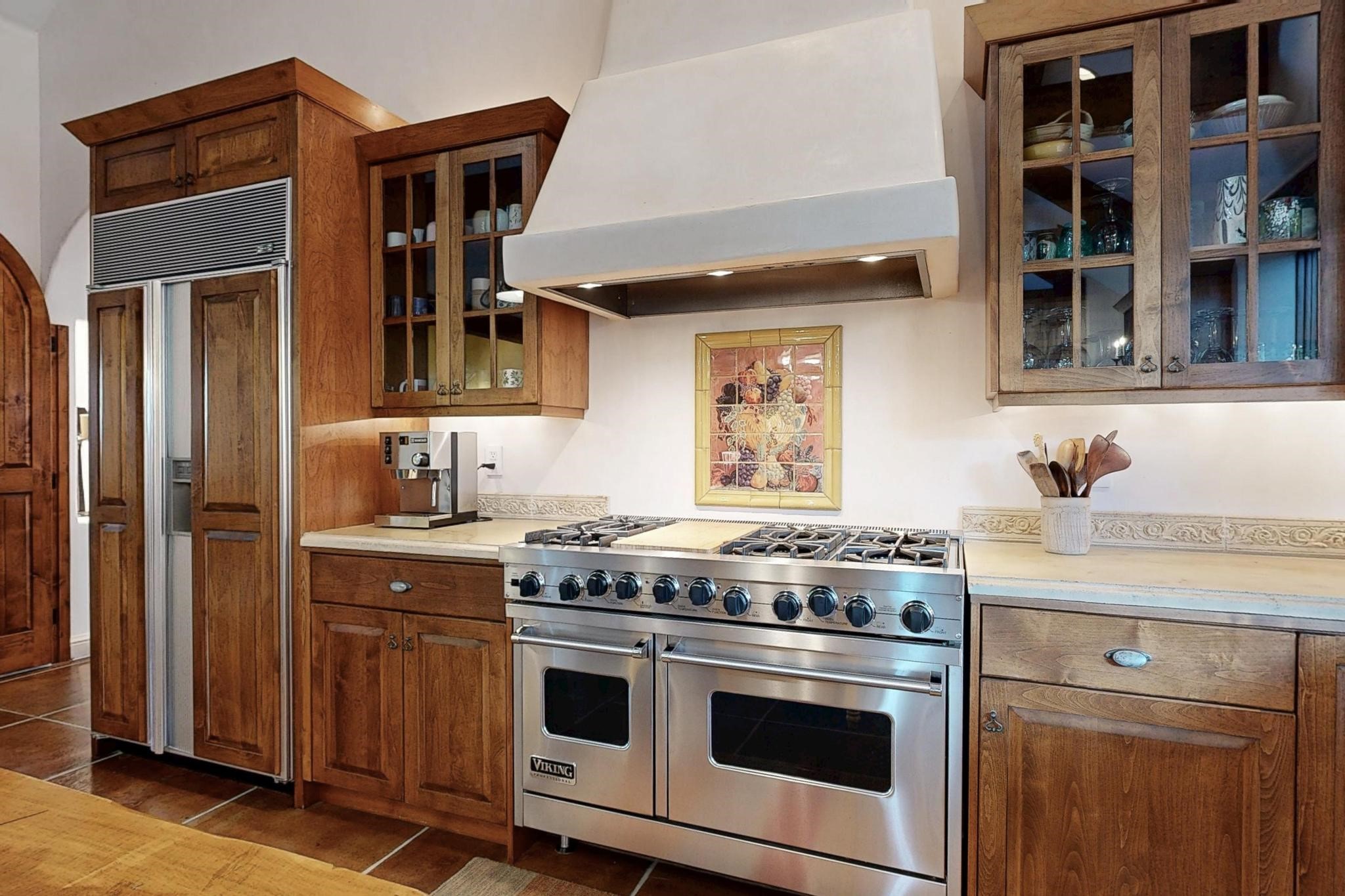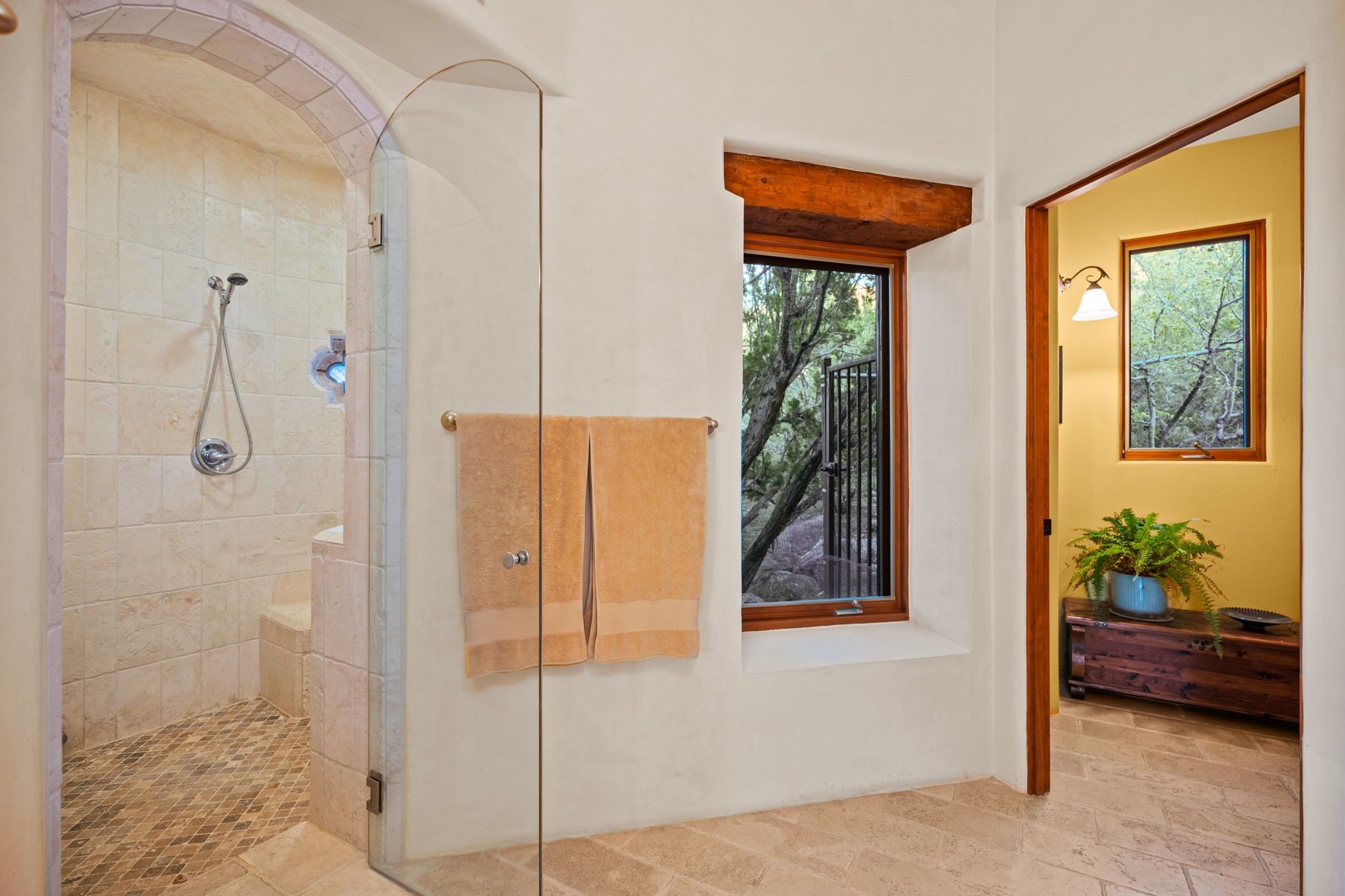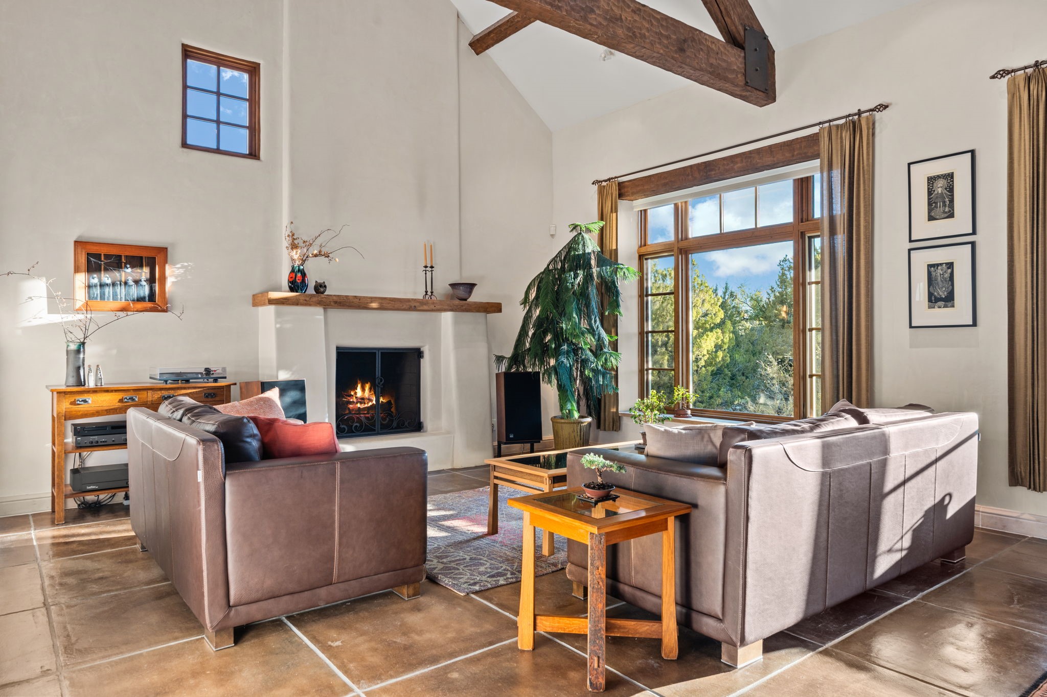 With vistas of the Sandia Mountains and city lights, this spacious 5,513 sq. ft. Sandia Heights estate is a rare blend of artistry, craftsmanship, and luxury. Upon entering the front door, the spacious living area introduces the understated beauty of this special home with hand-crafted details, deep sandstone sills, and a beautiful wood-burning fireplace. Features such as expansive chip-carved beams, custom doors, and diamond plaster walls provide warmth and refinement. Expansive windows frame breathtaking views and bath the house with natural light, magically merging the outdoor and indoor spaces. The kitchen is a chef's dream with a Sub-Zero refrigerator and freezer, Viking Professional 6-burner stove with griddle, and a butler's pantry complete with a Sub-Zero wine and beverage coolerTogether with the eating nook, kiva fireplace seating area, and formal dining room the kitchen area is perfect for evenings with family or elegant entertaining. The primary suite is a true sanctuary featuring a coved ceiling with exposed beams and corbels, a gas log fireplace, and a cozy seating area with latilla ceiling and built-in bookcases. The adjoining spa-inspired bath has it all - a steam shower, dual shower heads, travertine seating, a skylight over the garden jetted tub, and a private yoga and meditation room. Additional living spaces include a home office attached to a secondary living room and multiple generous ensuite bedrooms. The private backyard feels like a Zen oasis under New Mexico skies with a tiered garden, in-ground spa, outdoor fireplace, and covered patio. Modern comforts abound with in-floor hot water radiant heat, large 3-car garage, abundant storage, central vacuum, built-in speakers, new stucco and septic in 2025! This could be your ABQ Dream Home!