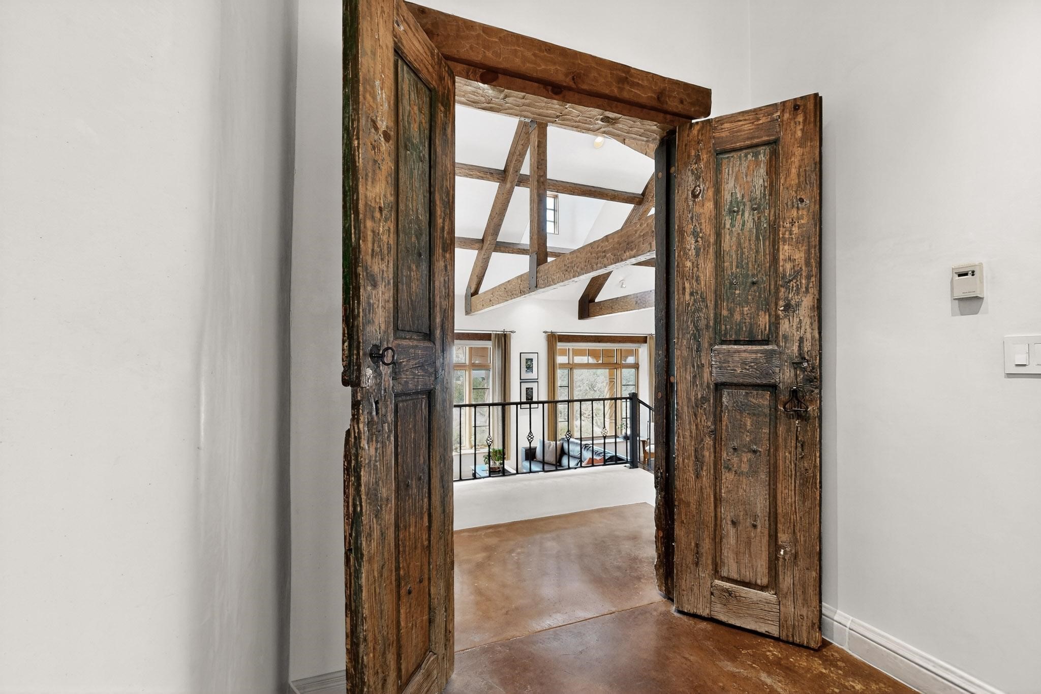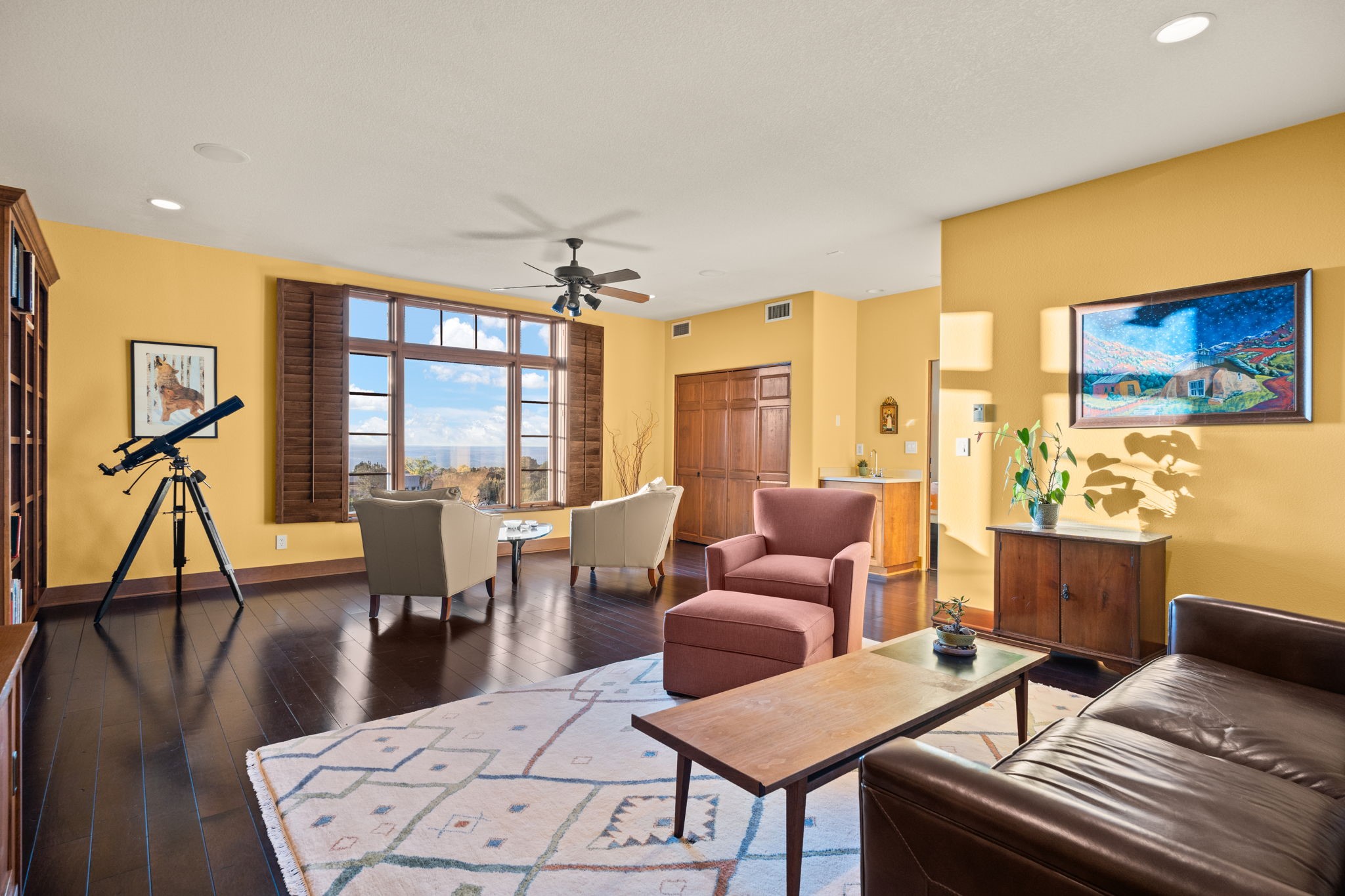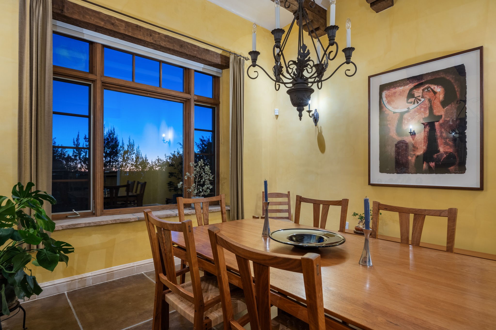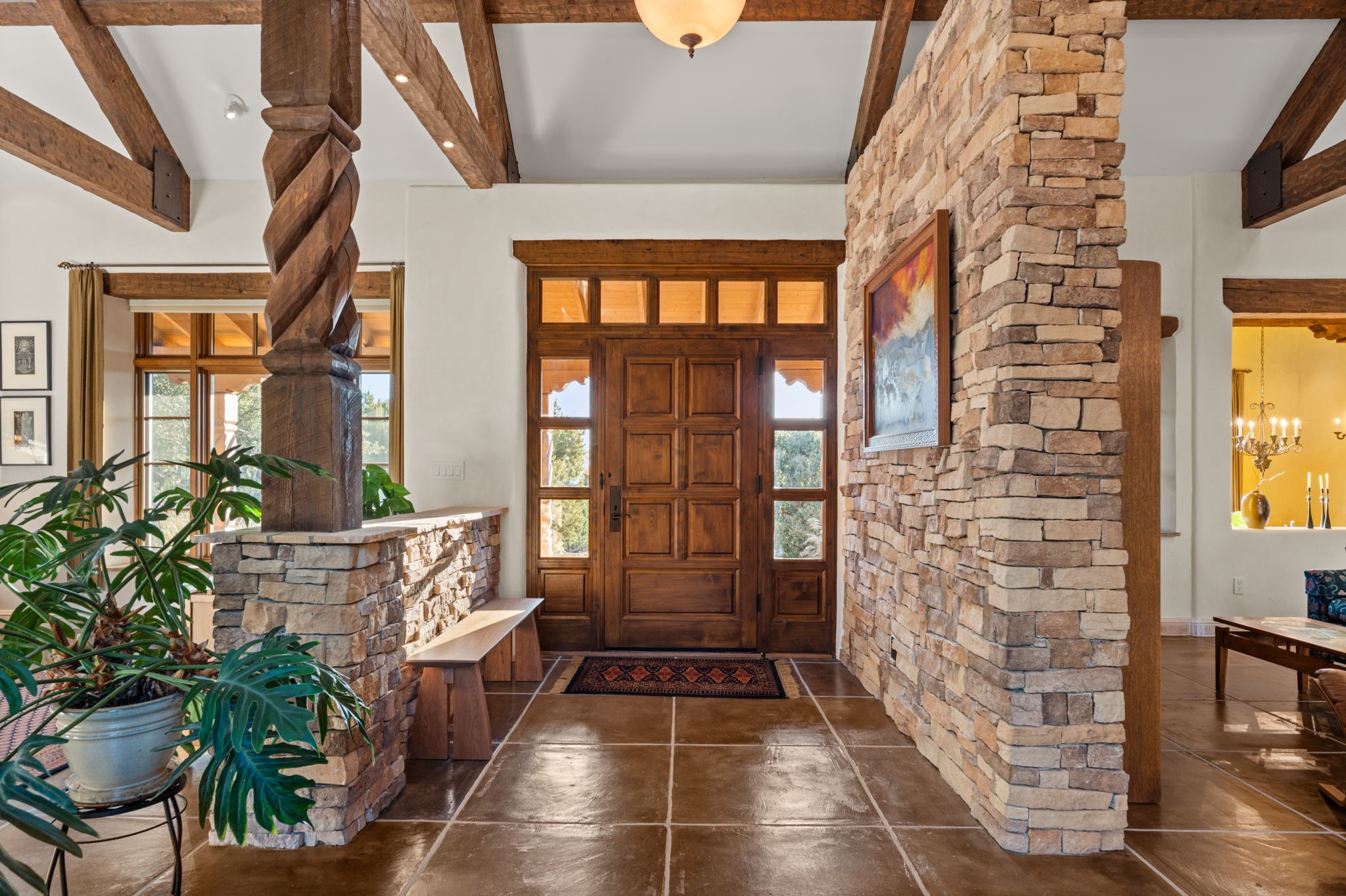 With vistas of the Sandia Mountains and city lights, this spacious 5,513 sq. ft. Sandia Heights estate is a rare blend of artistry, craftsmanship, and luxury. Upon entering the front door, the spacious living area introduces the understated beauty of this special home with hand-crafted details, deep sandstone sills, and a beautiful wood-burning fireplace. Features such as expansive chip-carved beams, custom doors, and diamond plaster walls provide warmth and refinement. Expansive windows frame breathtaking views and bath the house with natural light, magically merging the outdoor and indoor spaces. The kitchen is a chef's dream with a Sub-Zero refrigerator and freezer, Viking Professional 6-burner stove with griddle, and a butler's pantry complete with a Sub-Zero wine and beverage coolerTogether with the eating nook, kiva fireplace seating area, and formal dining room the kitchen area is perfect for evenings with family or elegant entertaining. The primary suite is a true sanctuary featuring a coved ceiling with exposed beams and corbels, a gas log fireplace, and a cozy seating area with latilla ceiling and built-in bookcases. The adjoining spa-inspired bath has it all - a steam shower, dual shower heads, travertine seating, a skylight over the garden jetted tub, and a private yoga and meditation room. Additional living spaces include a home office attached to a secondary living room and multiple generous ensuite bedrooms. The private backyard feels like a Zen oasis under New Mexico skies with a tiered garden, in-ground spa, outdoor fireplace, and covered patio. Modern comforts abound with in-floor hot water radiant heat, large 3-car garage, abundant storage, central vacuum, built-in speakers, new stucco and septic in 2025! This could be your ABQ Dream Home!
