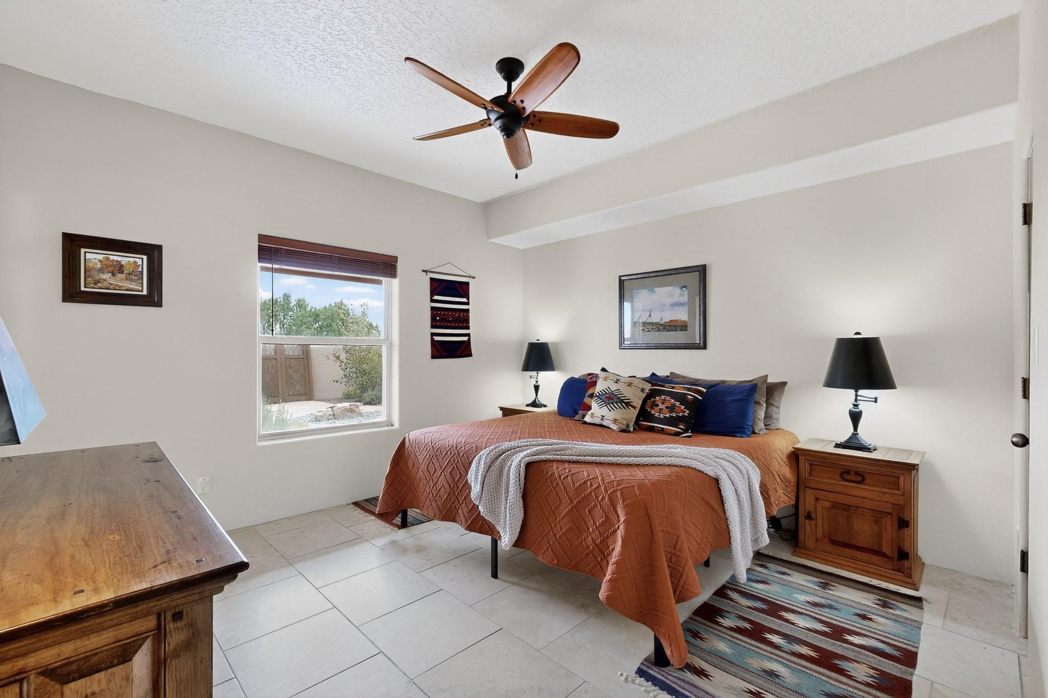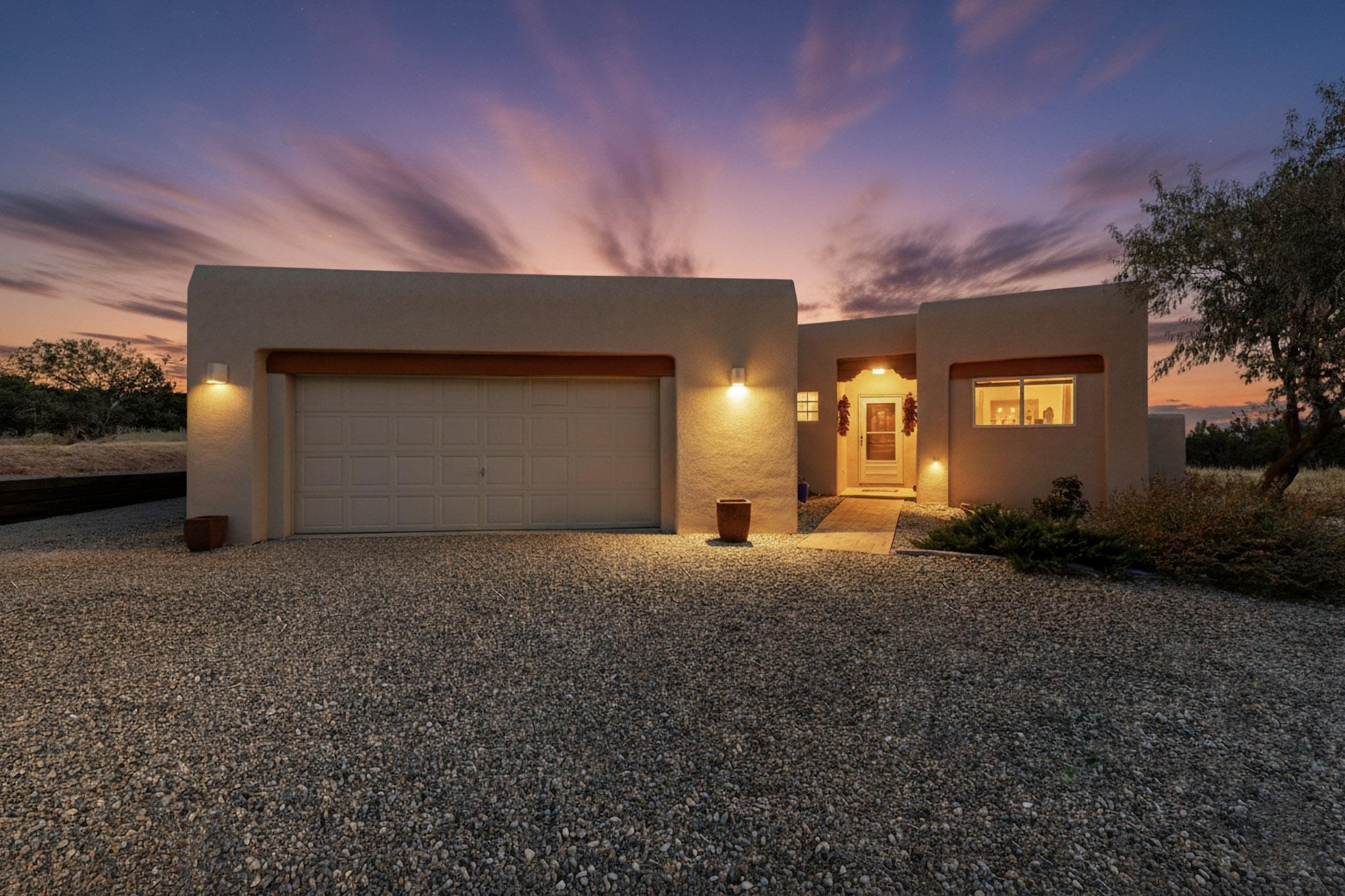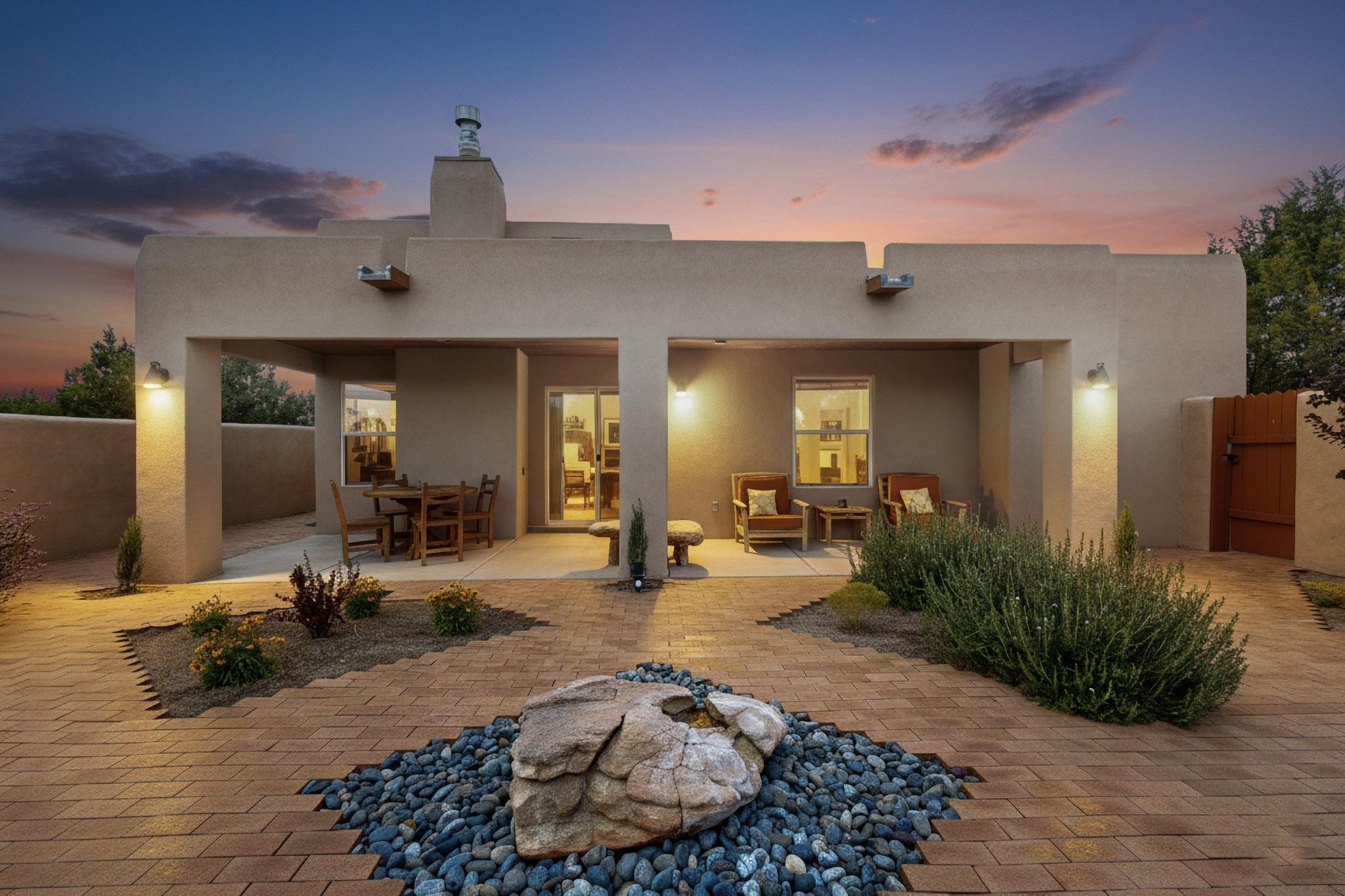 Immaculate and move-in ready, this Eldorado home combines timeless Santa Fe style with modern comfort. Featuring 3 bedrooms and 2 full baths, the home boasts travertine floors throughout, granite countertops, and stainless steel appliances. Classic details include vigas and a gas kiva gas fireplace with blower creating warmth and character. The spacious living areas open to a beautifully landscaped, fully enclosed courtyard with water feature perfect for entertaining or quiet relaxation. Enjoy year-round outdoor living under the large covered portal and take in the peace, privacy, and expansive views of open green space that borders the property. Additional highlights include a 2-car garage, energy-efficient features, and meticulous attention to detail. Ideally located near Eldorado amenities, trails, and the community center, this home offers effortless elegance in one of Eldorado's most desirable settings.