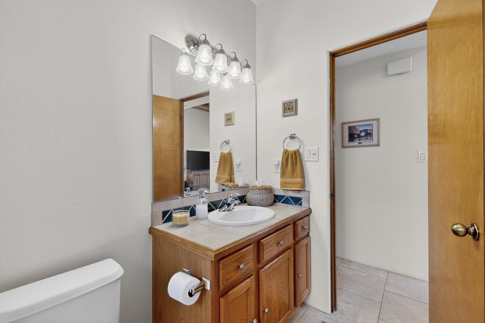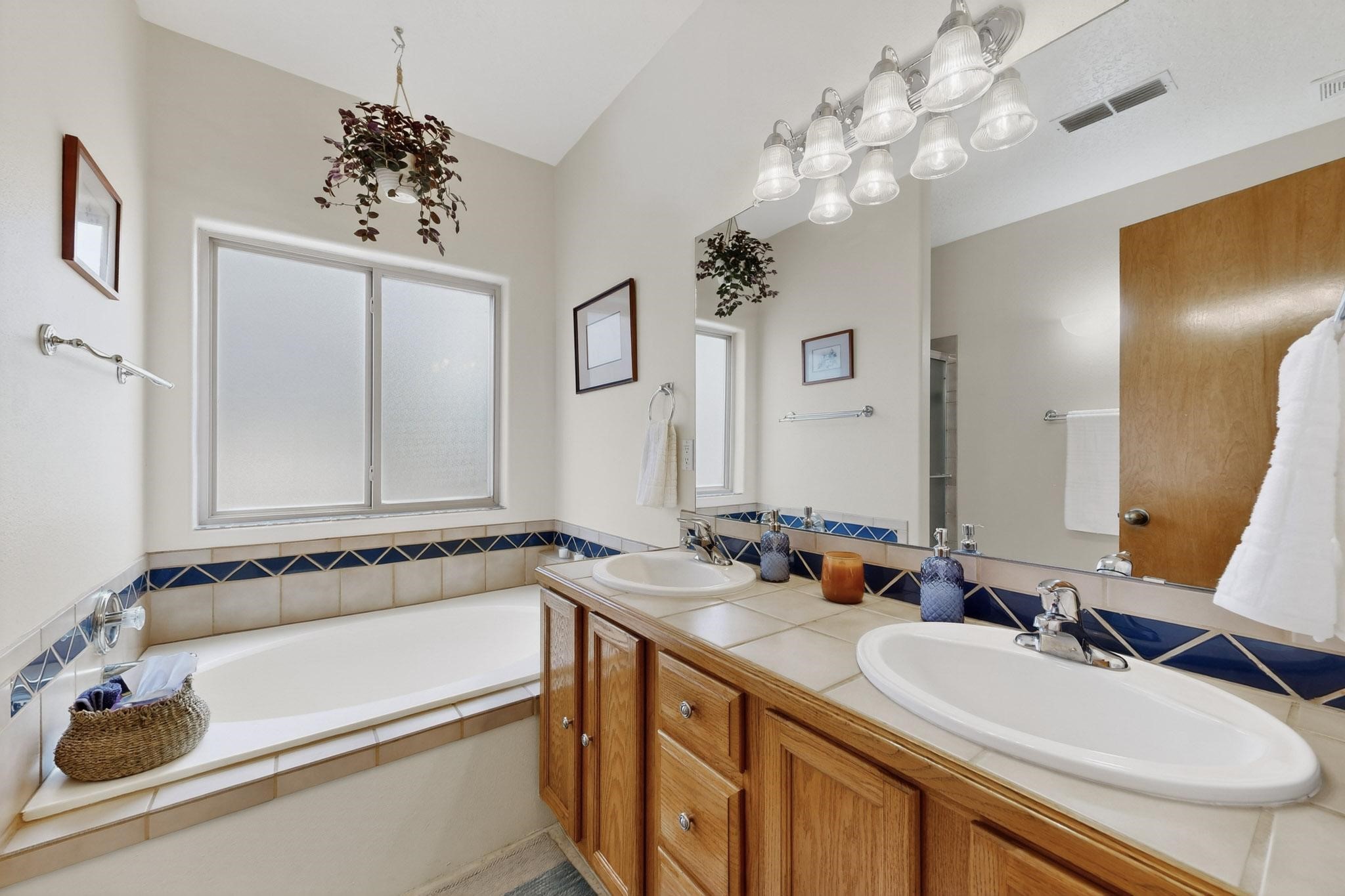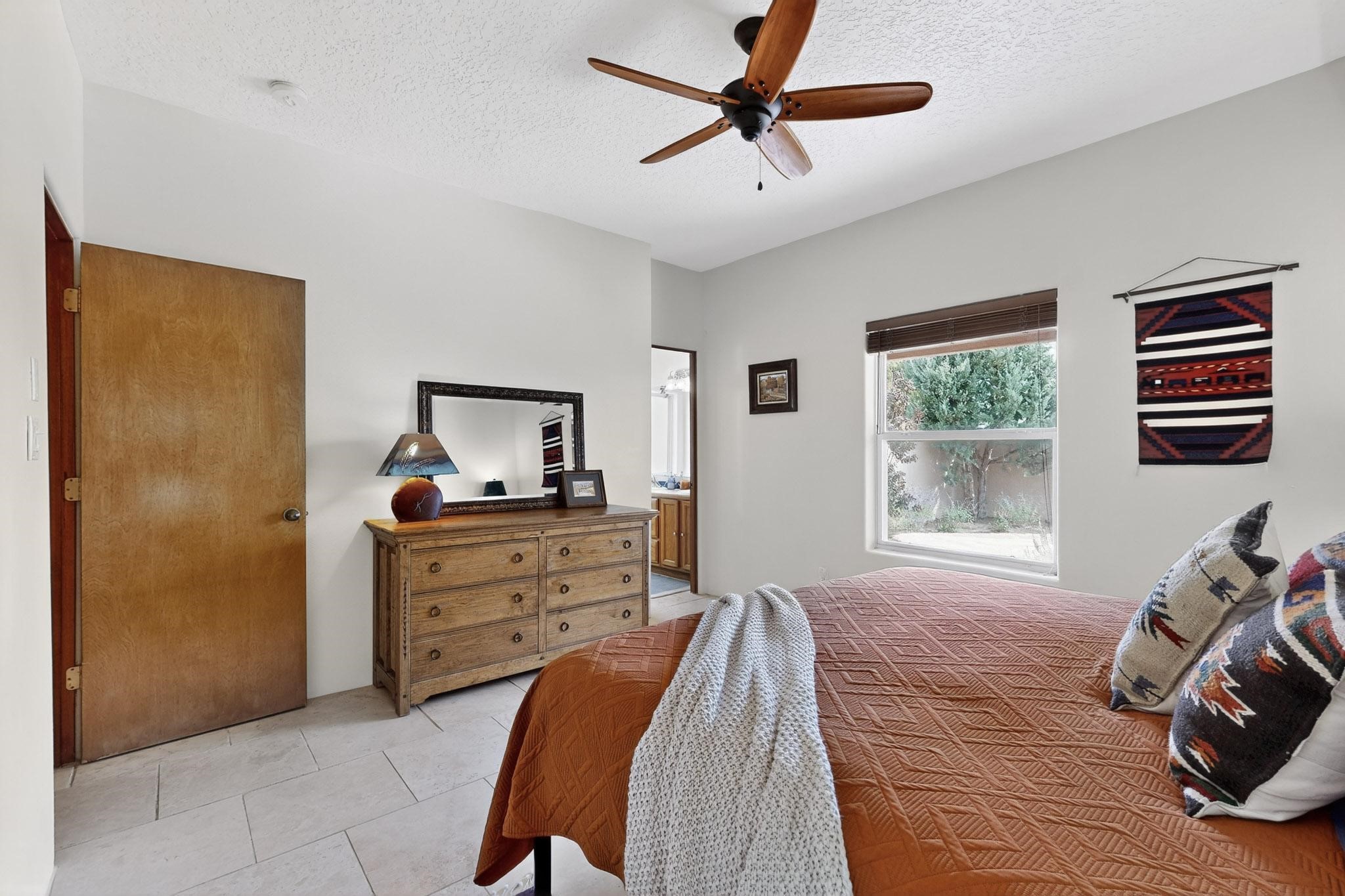 Immaculate and move-in ready, this Eldorado home combines timeless Santa Fe style with modern comfort. Featuring 3 bedrooms and 2 full baths, the home boasts travertine floors throughout, granite countertops, and stainless steel appliances. Classic details include vigas and a gas kiva gas fireplace with blower creating warmth and character. The spacious living areas open to a beautifully landscaped, fully enclosed courtyard with water feature perfect for entertaining or quiet relaxation. Enjoy year-round outdoor living under the large covered portal and take in the peace, privacy, and expansive views of open green space that borders the property. Additional highlights include a 2-car garage, energy-efficient features, and meticulous attention to detail. Ideally located near Eldorado amenities, trails, and the community center, this home offers effortless elegance in one of Eldorado's most desirable settings.