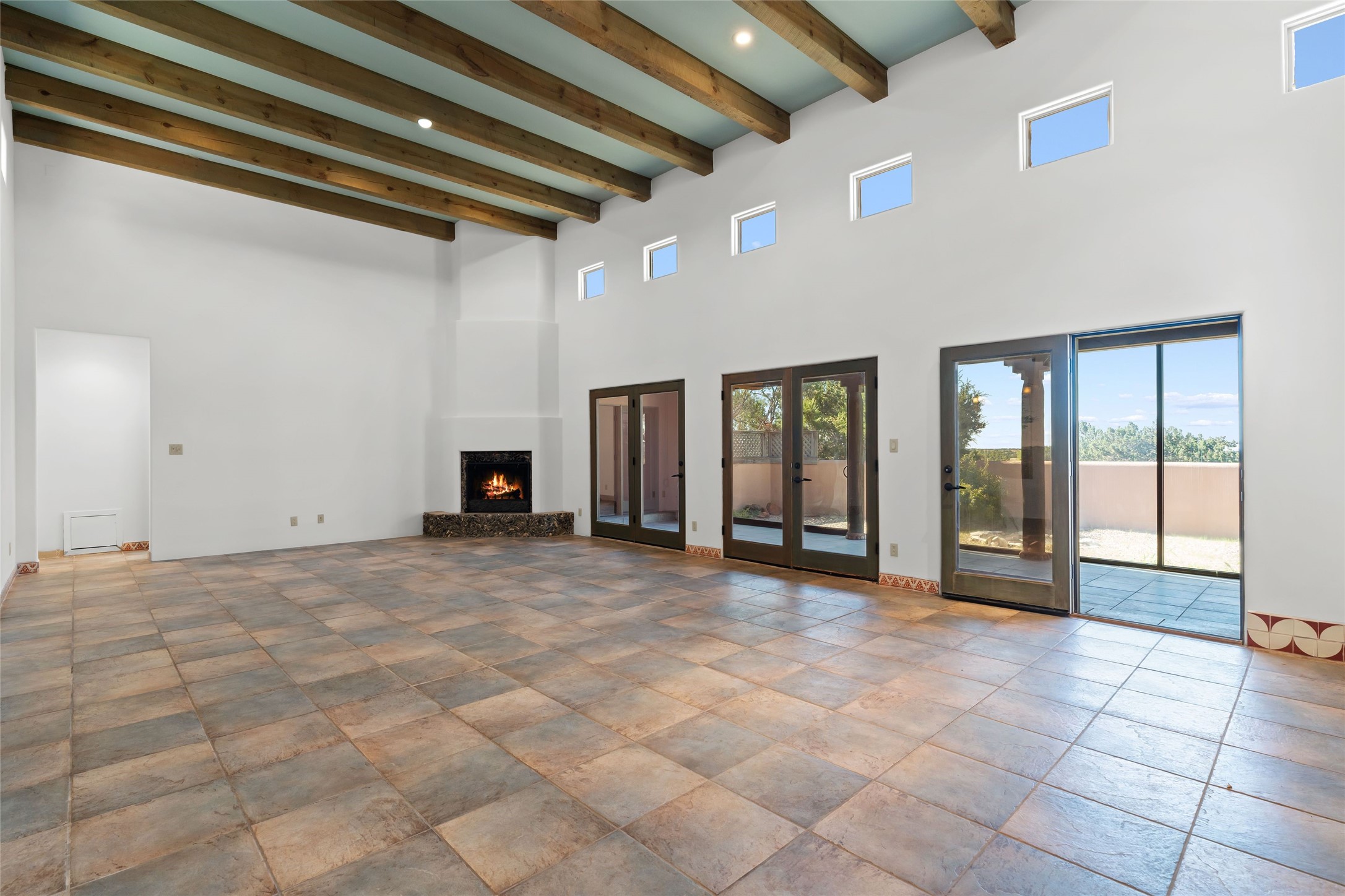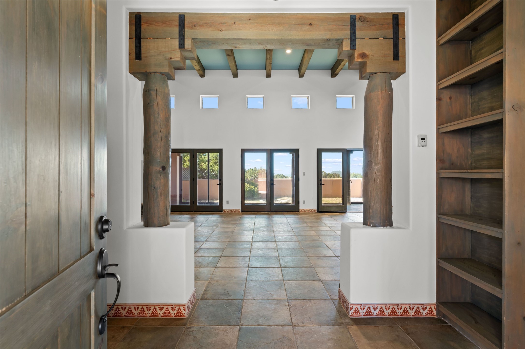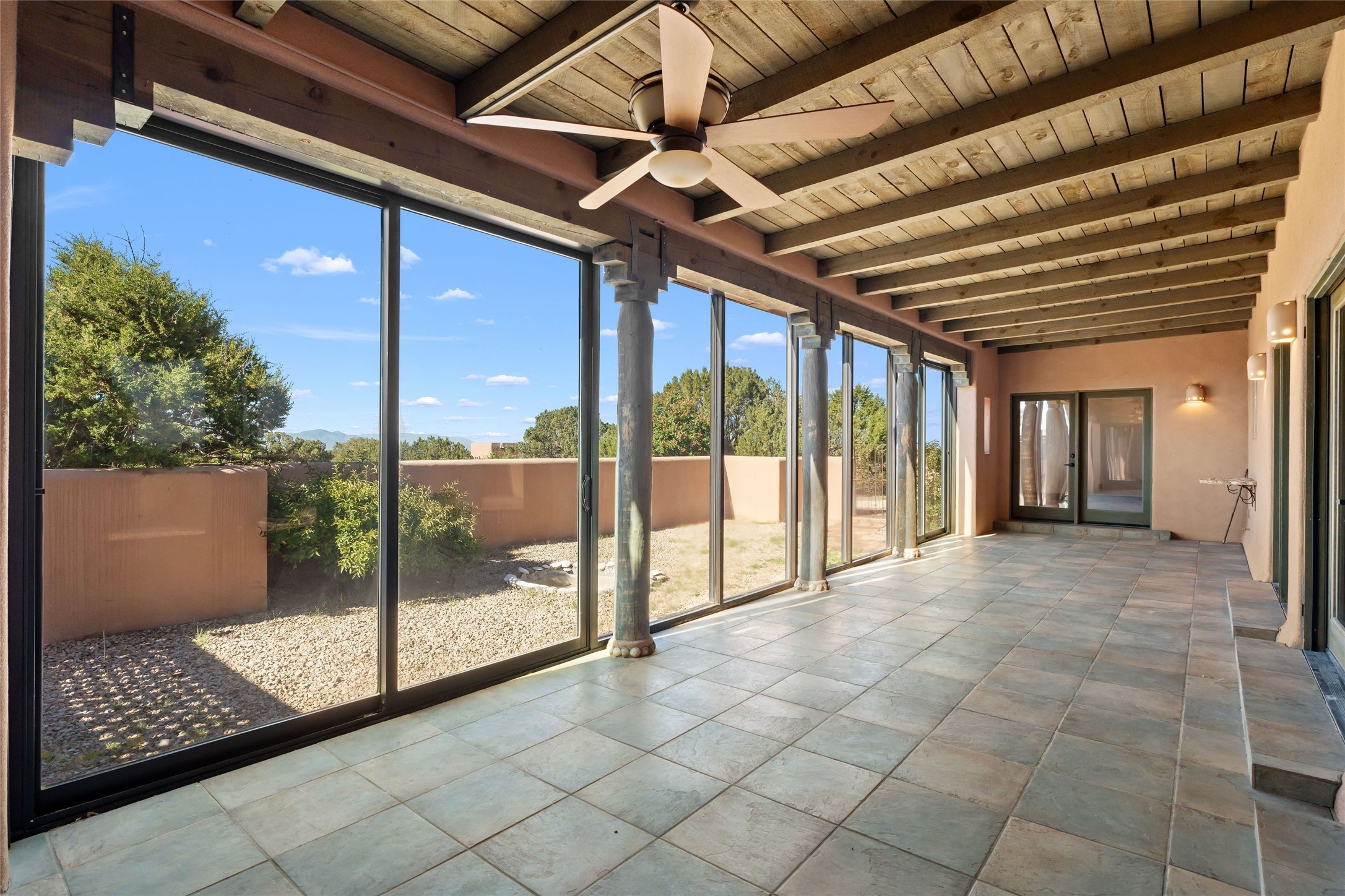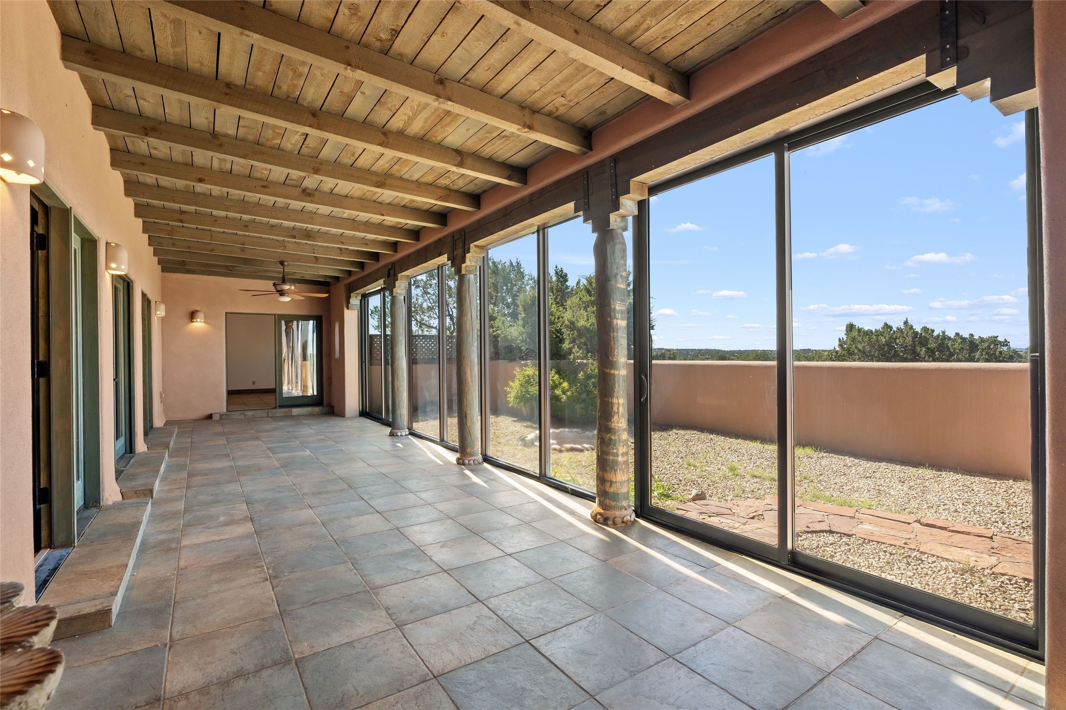 Nestled in the serene Eldorado/Lamy area, this home perfectly balances tranquility and convenience. Enjoy the peacefulness of the high desert while being just a short drive from Santa Fe's renowned dining, cultural attractions, and amenities. Embodying the timeless elegance of Southwestern architecture, this residence features classic vigas, rich wood accents, and authentic regional charm. Step through the foyer into an expansive living room, where soaring ceilings, clerestory windows, and a cozy fireplace create an inviting sense of space and light. The living and dining areas flow seamlessly into the adjacent kitchen, making it ideal for entertaining and everyday living. The well-designed layout includes a large walk-in pantry near the kitchen, as well as a laundry room with abundant storage and a utility sink. The split floor plan offers privacy, with the primary suite on the east side of the home and two generously sized secondary bedrooms with a nearby full bath on the west side. The spacious primary suite includes a dual-sink vanity, soaking tub, separate shower, large walk-in closet, and direct access to an expansive enclosed patio--perfect for enjoying quiet mornings or evening sunsets. A bonus room off the oversized two-car garage provides flexible space for an art studio, home gym, or private office/library. Recent upgrades include a new high-efficiency boiler and water heater and fresh interior paint. Outdoor spaces are equally impressive, featuring a gated courtyard with a covered portal and a walled backyard accessible from the patio or side gate. Set on approximately 4.66 acres, this property offers sweeping views of the Ortiz, Sandia, and Jemez Mountains. With its combination of comfort, character, and spectacular scenery, this home is a must-see Santa Fe retreat. PROPERTY IS BEING SOLD IN AS-IS CONDITION.