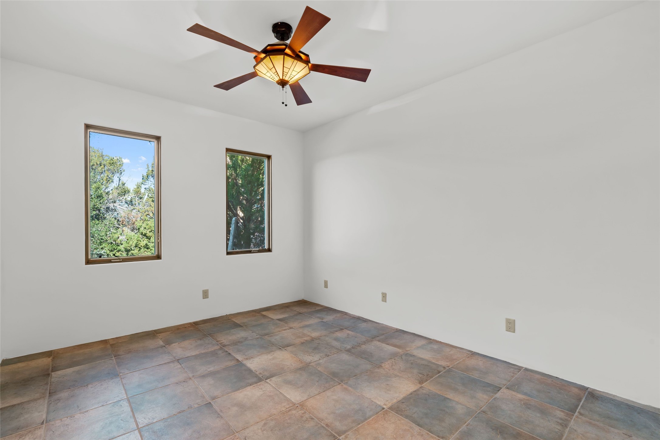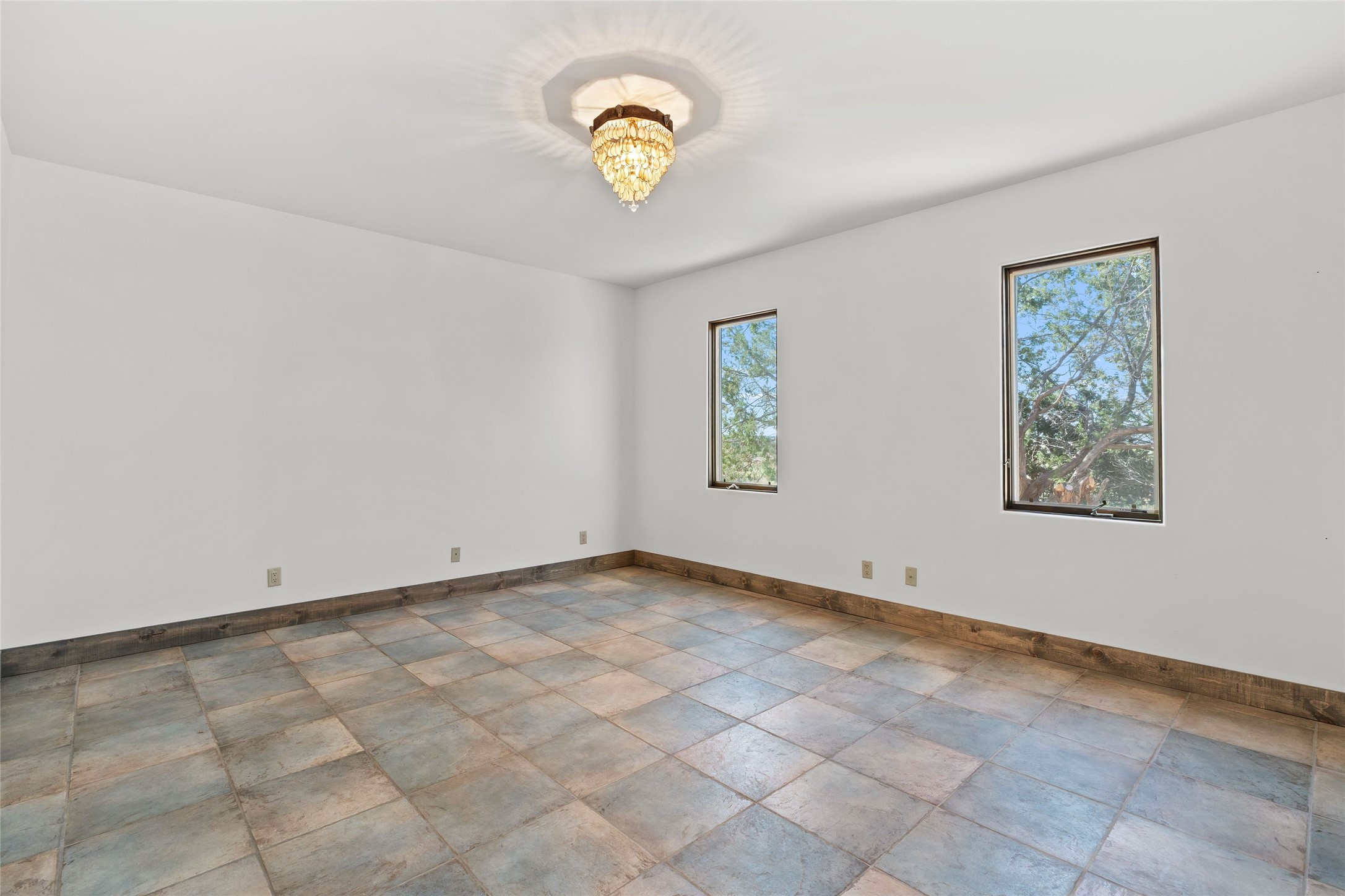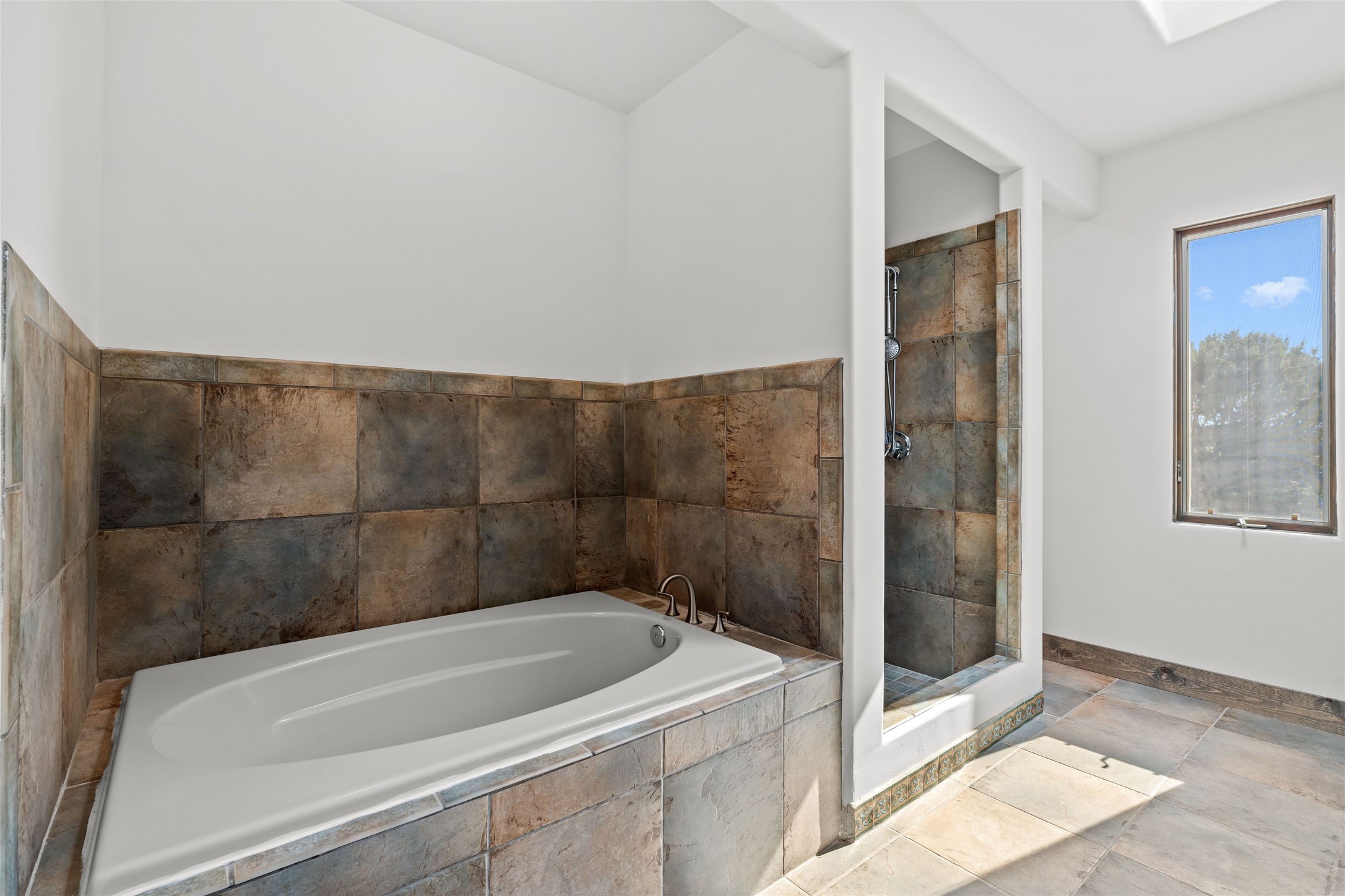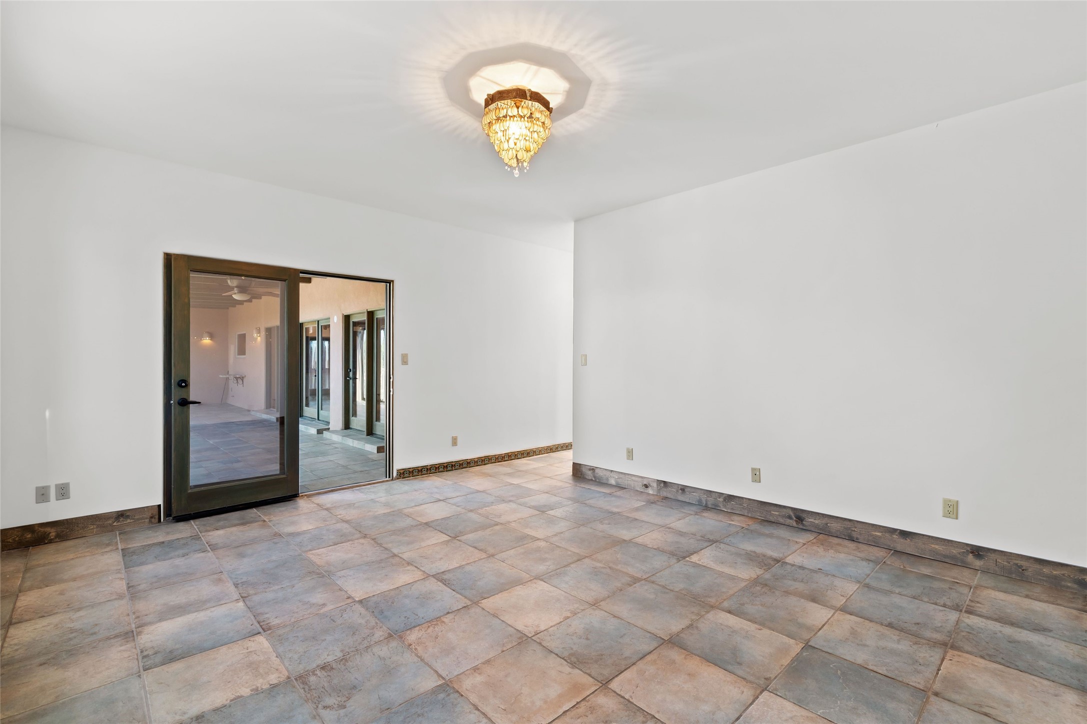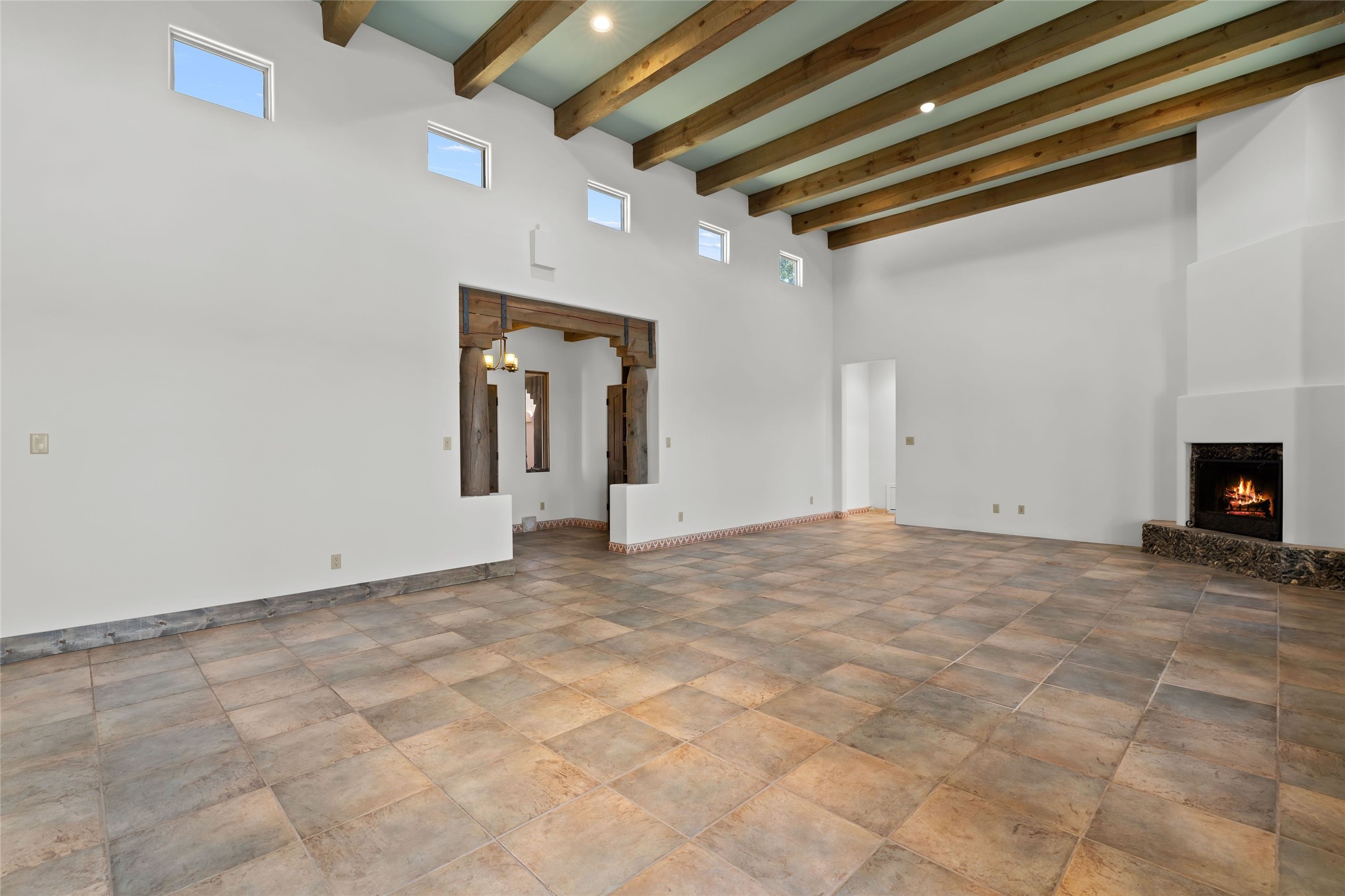 Nestled in the serene Eldorado/Lamy area, this home perfectly balances tranquility and convenience. Enjoy the peacefulness of the high desert while being just a short drive from Santa Fe's renowned dining, cultural attractions, and amenities. Embodying the timeless elegance of Southwestern architecture, this residence features classic vigas, rich wood accents, and authentic regional charm. Step through the foyer into an expansive living room, where soaring ceilings, clerestory windows, and a cozy fireplace create an inviting sense of space and light. The living and dining areas flow seamlessly into the adjacent kitchen, making it ideal for entertaining and everyday living. The well-designed layout includes a large walk-in pantry near the kitchen, as well as a laundry room with abundant storage and a utility sink. The split floor plan offers privacy, with the primary suite on the east side of the home and two generously sized secondary bedrooms with a nearby full bath on the west side. The spacious primary suite includes a dual-sink vanity, soaking tub, separate shower, large walk-in closet, and direct access to an expansive enclosed patio--perfect for enjoying quiet mornings or evening sunsets. A bonus room off the oversized two-car garage provides flexible space for an art studio, home gym, or private office/library. Recent upgrades include a new high-efficiency boiler and water heater and fresh interior paint. Outdoor spaces are equally impressive, featuring a gated courtyard with a covered portal and a walled backyard accessible from the patio or side gate. Set on approximately 4.66 acres, this property offers sweeping views of the Ortiz, Sandia, and Jemez Mountains. With its combination of comfort, character, and spectacular scenery, this home is a must-see Santa Fe retreat. PROPERTY IS BEING SOLD IN AS-IS CONDITION.