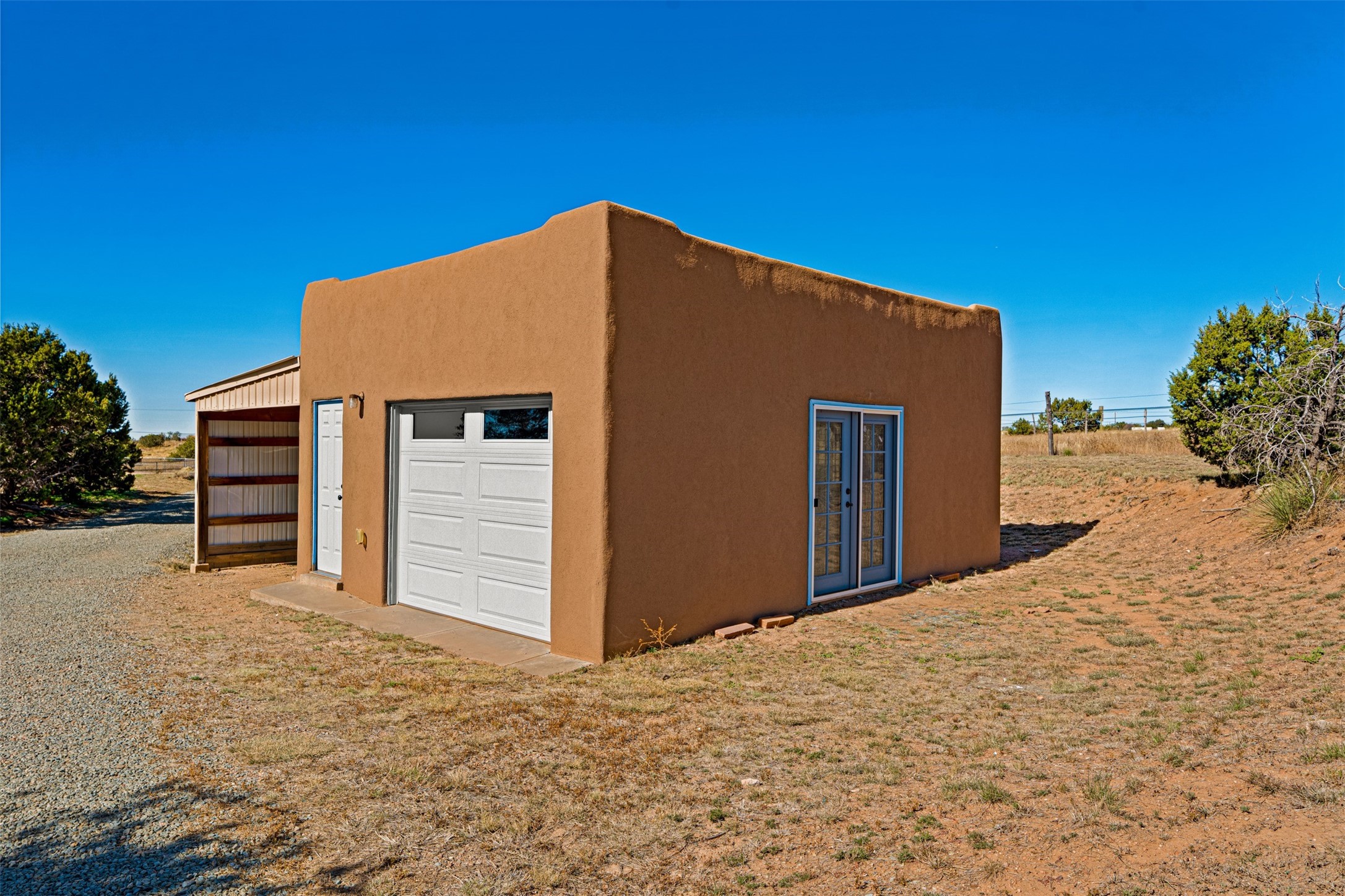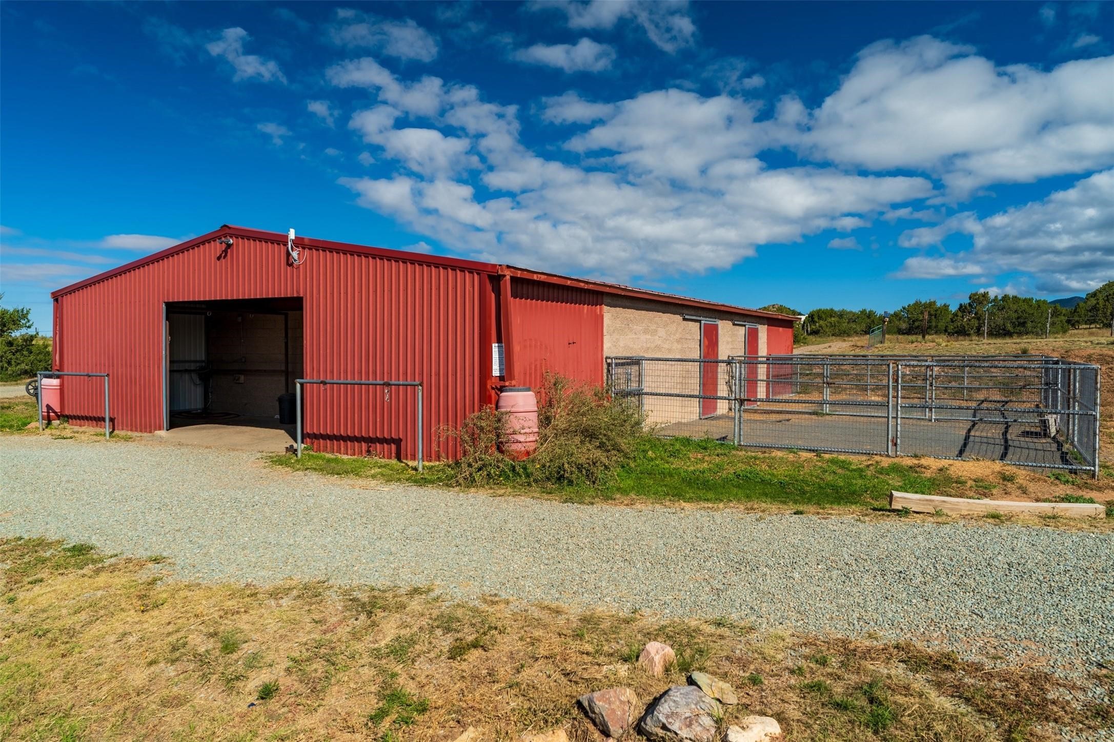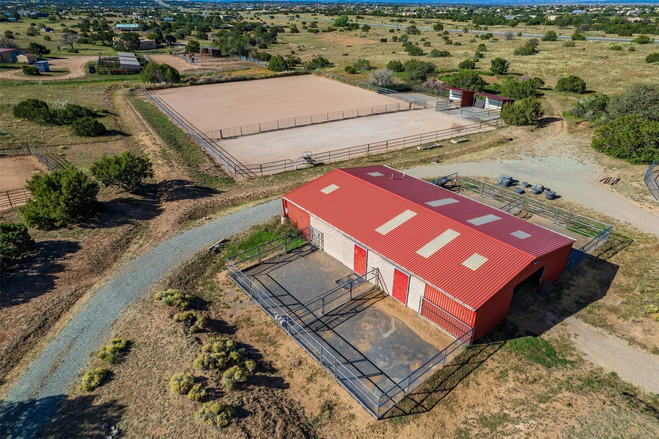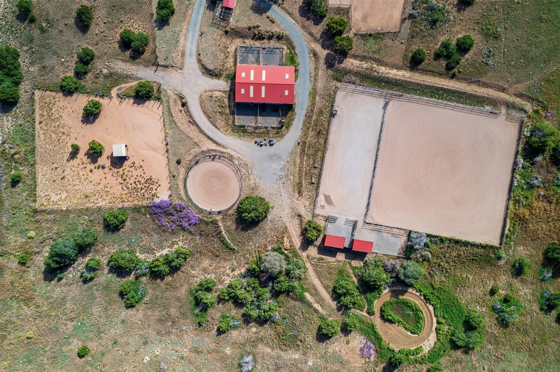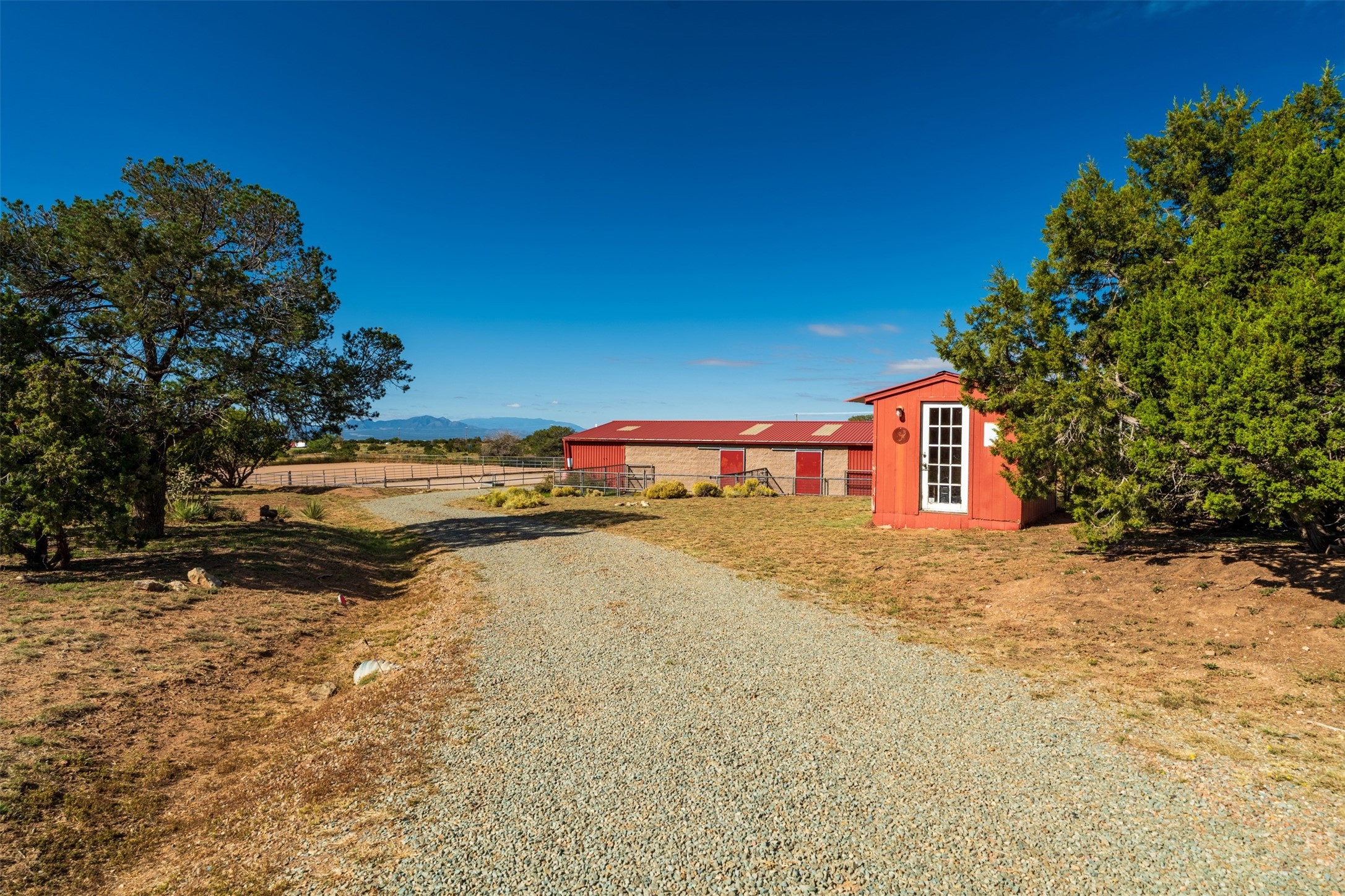 A rare horse property. This Santa Fe-style country home offers an exceptional location directly across from Eldorado, providing convenient access to local community amenities. The property benefits from Eldorado water and natural gas, and its proximity to the highway ensures easy access to town.The home features a split floor plan and an open-concept living, dining, and kitchen area, perfect for comfortable living and entertaining, all while offering beautiful southerly mountain views.The oversized garage is a real plus with plenty of storage and shelving. Walk thru laundry room. Enclosed, heated sunroom. For equestrian enthusiasts, this property is truly turn-key featuring a 2,400 sq ft, center-aisle, block and metal barn with four stalls, each equipped with attached piped paddocks, crusher fine footing, and automatic heated waterers. The barn also includes a dedicated tack room, a hot water wash rack, hay storage, and a feed room complete with a sink and toilet. Additional amenities include a piped rail sand arena and four turnouts with run-in sheds. Beyond the equestrian facilities, the property also has a detached, 432 sq ft, unheated workshop/studio with a carport and extra storage. No HOA. Four horses allowed.