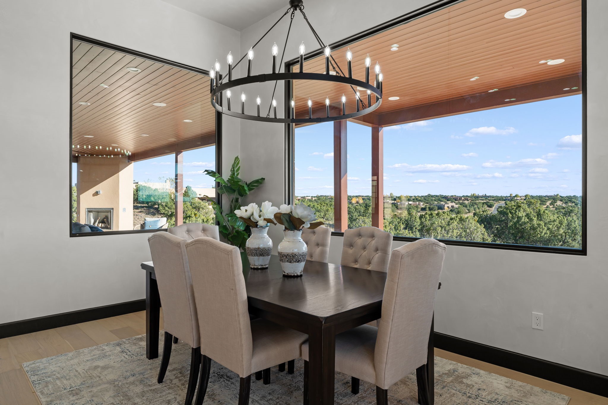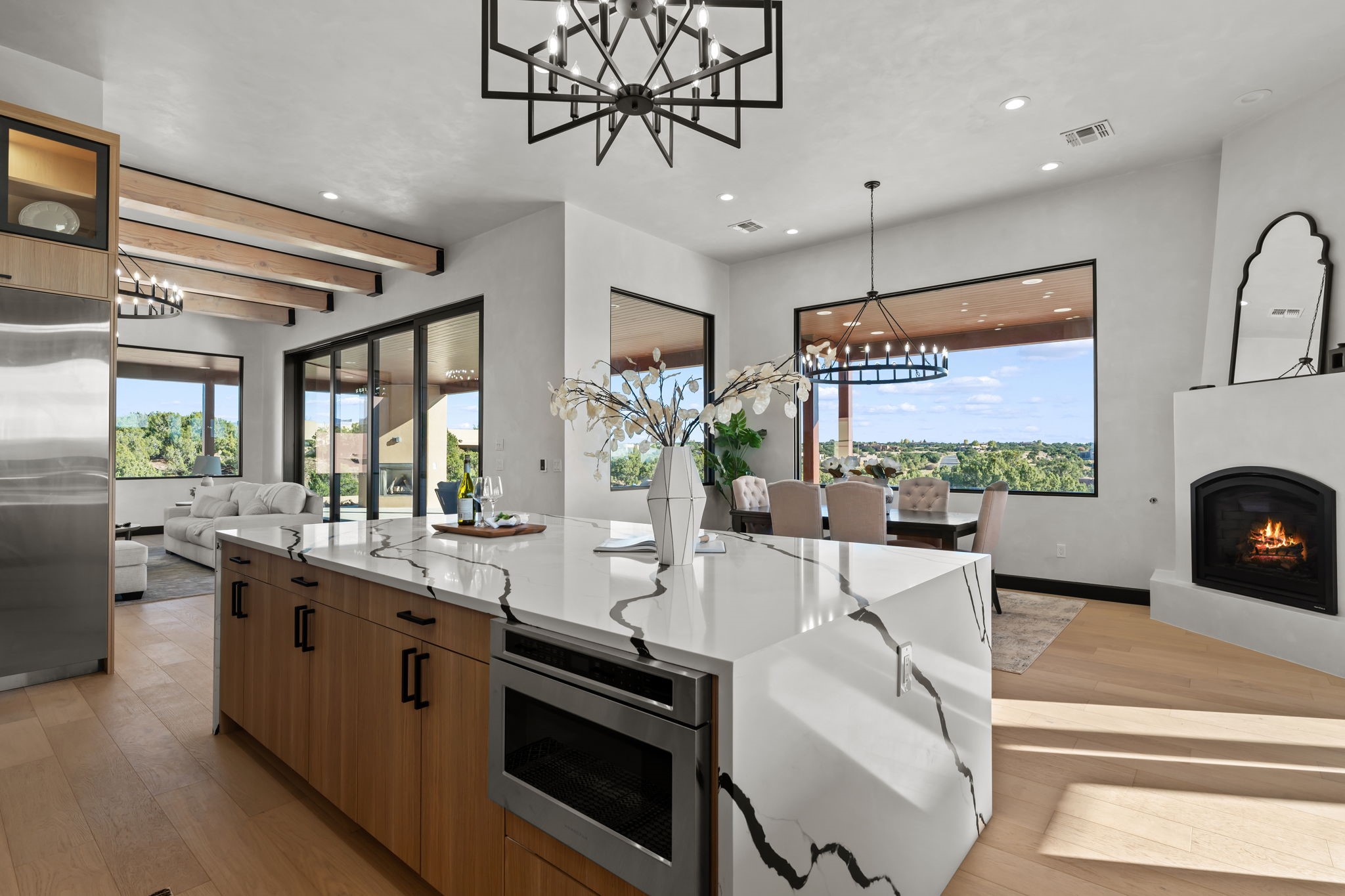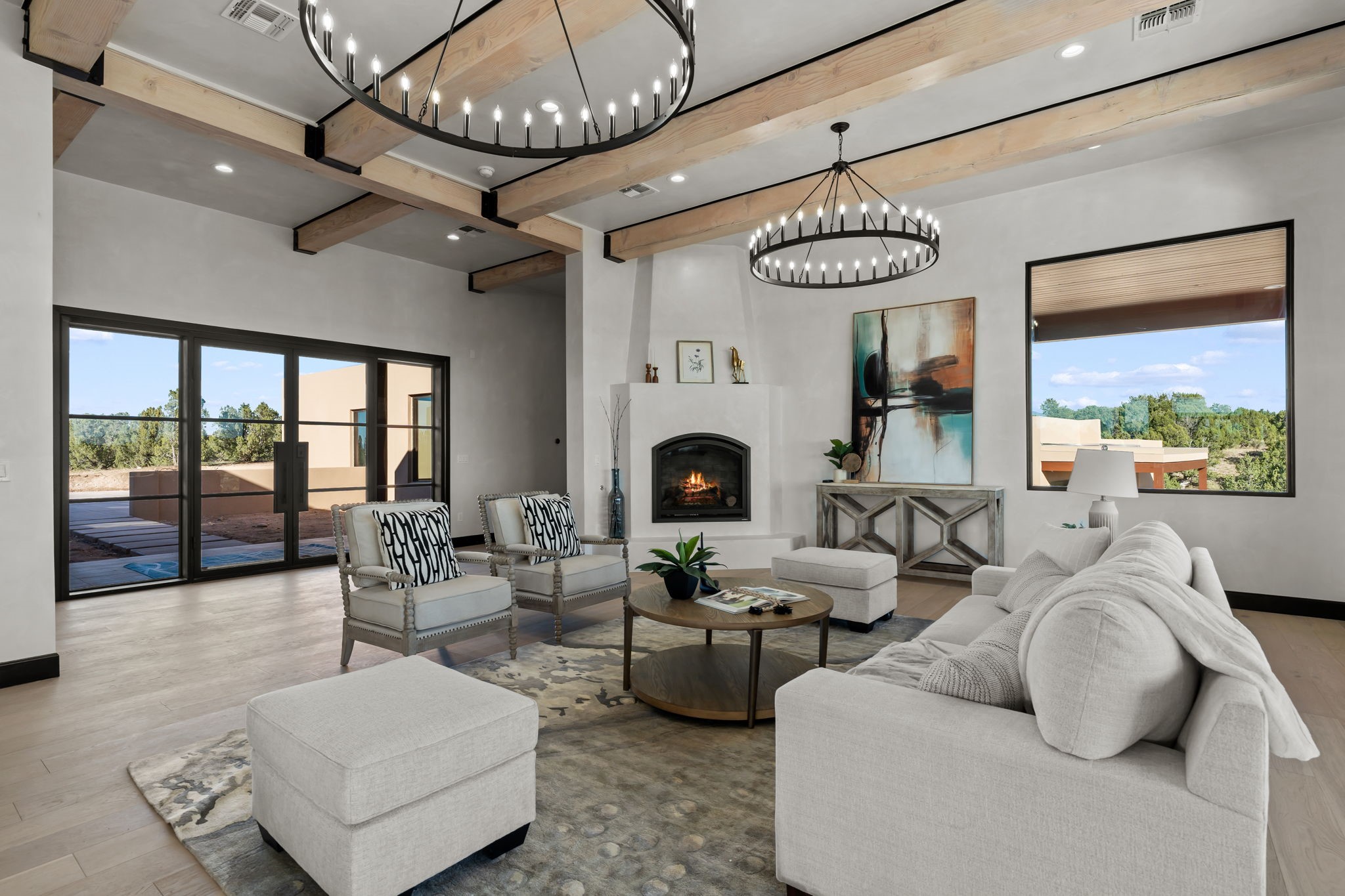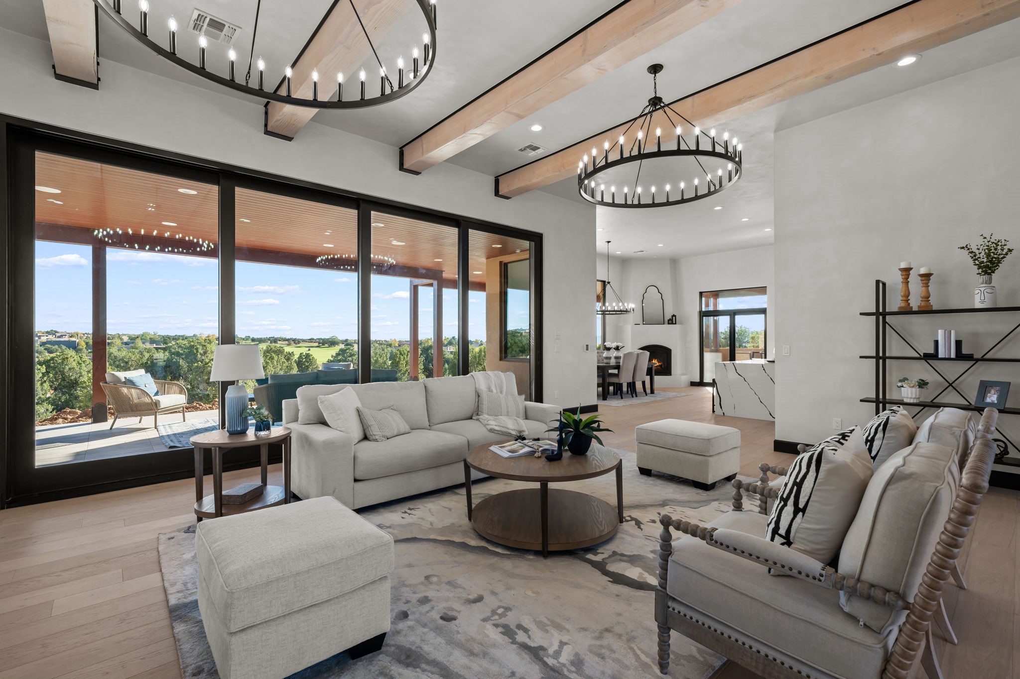 Nestled in the prestigious Las Campanas community of Santa Fe, this newly built custom estate blends modern architecture with timeless New Mexican charm. Situated on a 1.64-acre homesite overlooking two picturesque golf holes, the home captures breathtaking views of both the fairways and surrounding mountains.Built by Candelaria Homes, one of New Mexico's most respected luxury builders, this residence reflects exceptional craftsmanship and attention to detail in every corner--from its open floor plan to its refined finishes.Designed for comfort and sophistication, the single-story layout features heated floors throughout the main living and family areas, creating warmth and luxury in every season. A beautifully designed detached one-bedroom Casita offers the perfect retreat for guests, extended family, or a private studio.The gourmet kitchen impresses with bold dark finishes, high-end Sub-Zero appliances, a spacious center island, and a large butler's pantry, seamlessly combining style and function.A versatile bonus living area provides flexibility as a children's playroom, home library, or secondary living space. Expansive picture windows fill the home with natural light, framing Santa Fe's stunning landscape and creating a seamless indoor-outdoor connection.With its open-concept great room, spacious patios, and sweeping golf course and mountain views, this Las Campanas masterpiece defines elevated desert living.