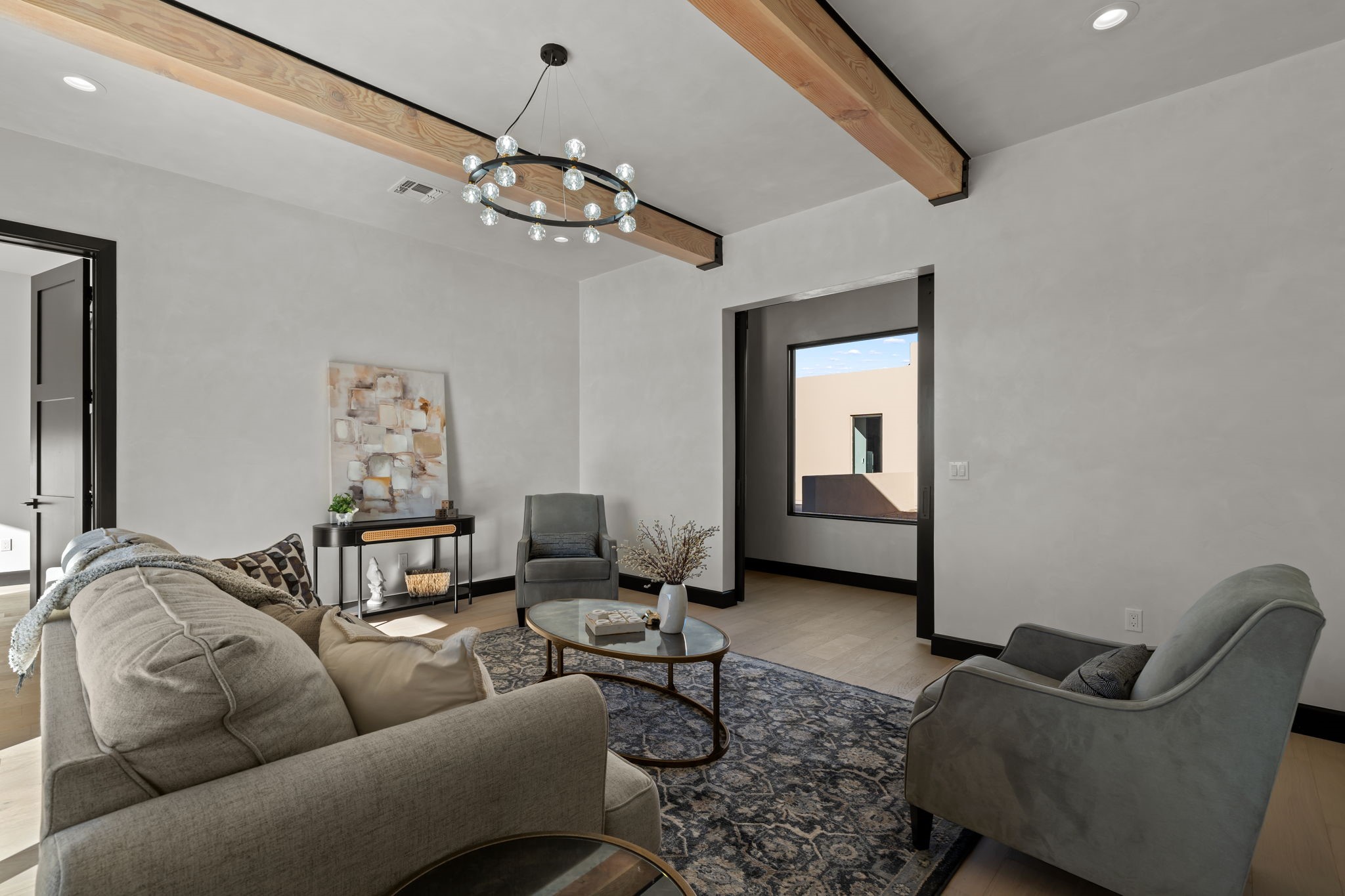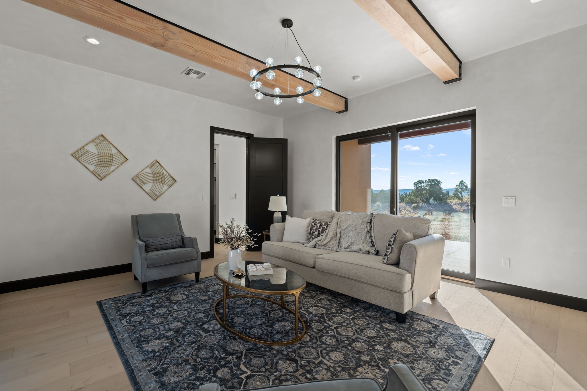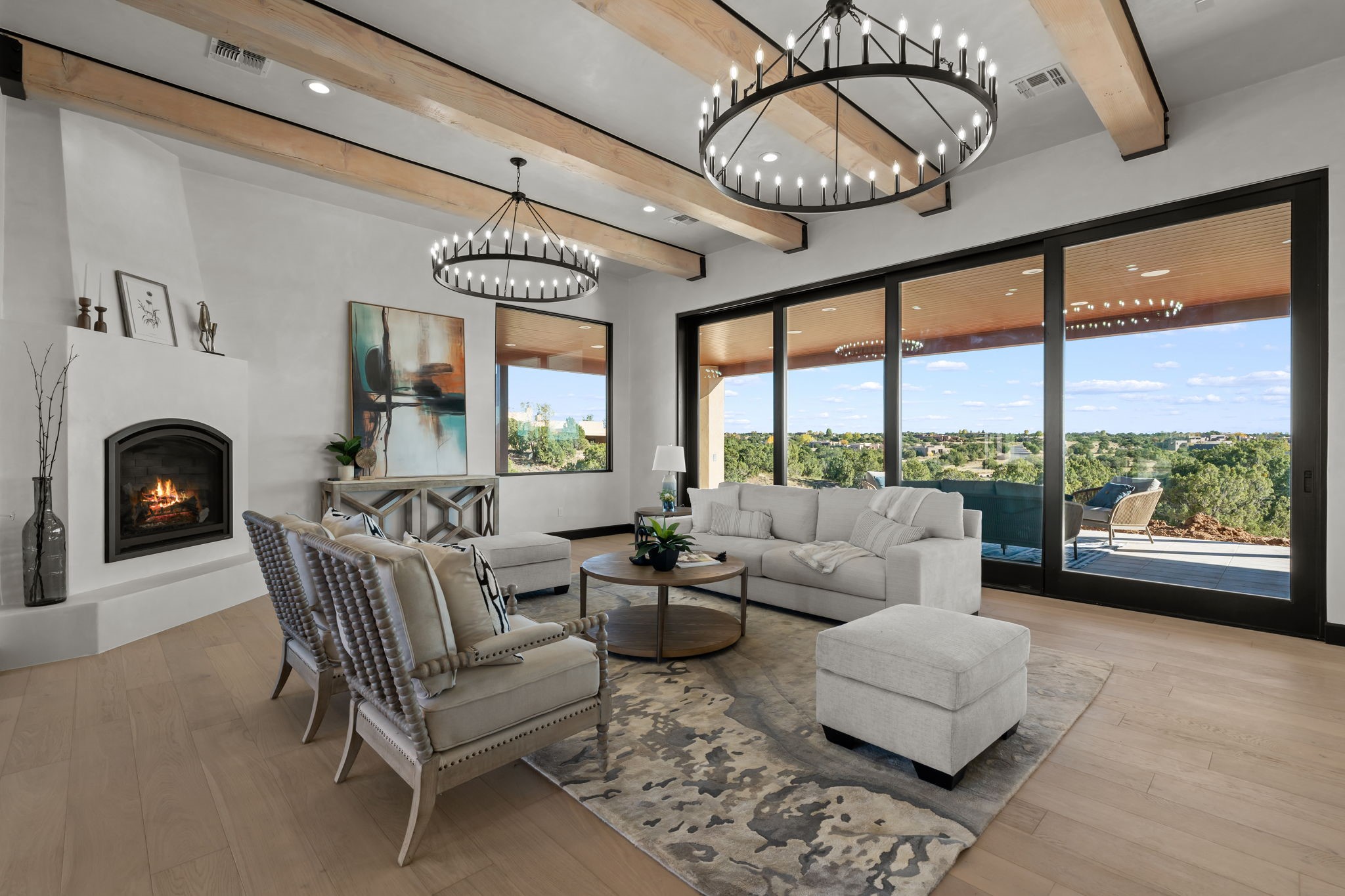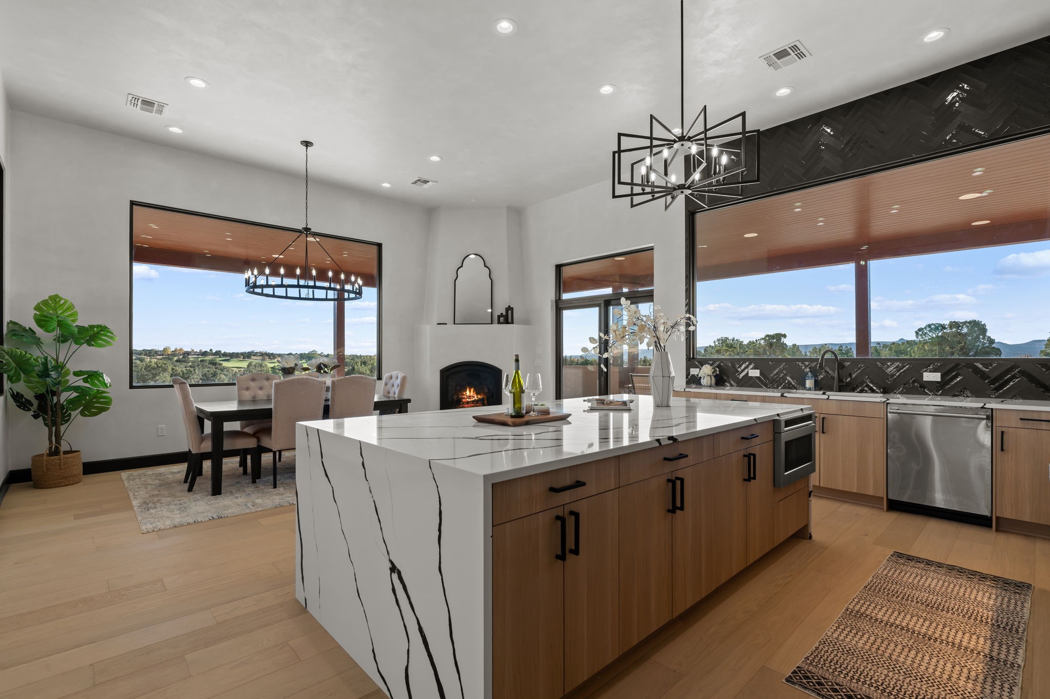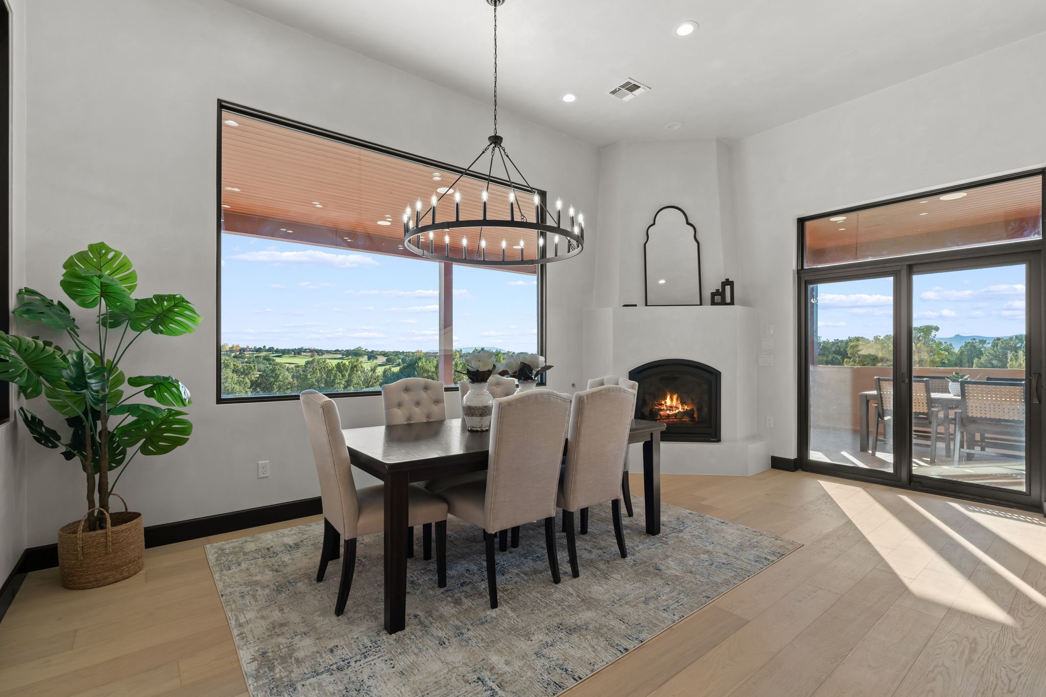 Nestled in the prestigious Las Campanas community of Santa Fe, this newly built custom estate blends modern architecture with timeless New Mexican charm. Situated on a 1.64-acre homesite overlooking two picturesque golf holes, the home captures breathtaking views of both the fairways and surrounding mountains.Built by Candelaria Homes, one of New Mexico's most respected luxury builders, this residence reflects exceptional craftsmanship and attention to detail in every corner--from its open floor plan to its refined finishes.Designed for comfort and sophistication, the single-story layout features heated floors throughout the main living and family areas, creating warmth and luxury in every season. A beautifully designed detached one-bedroom Casita offers the perfect retreat for guests, extended family, or a private studio.The gourmet kitchen impresses with bold dark finishes, high-end Sub-Zero appliances, a spacious center island, and a large butler's pantry, seamlessly combining style and function.A versatile bonus living area provides flexibility as a children's playroom, home library, or secondary living space. Expansive picture windows fill the home with natural light, framing Santa Fe's stunning landscape and creating a seamless indoor-outdoor connection.With its open-concept great room, spacious patios, and sweeping golf course and mountain views, this Las Campanas masterpiece defines elevated desert living.