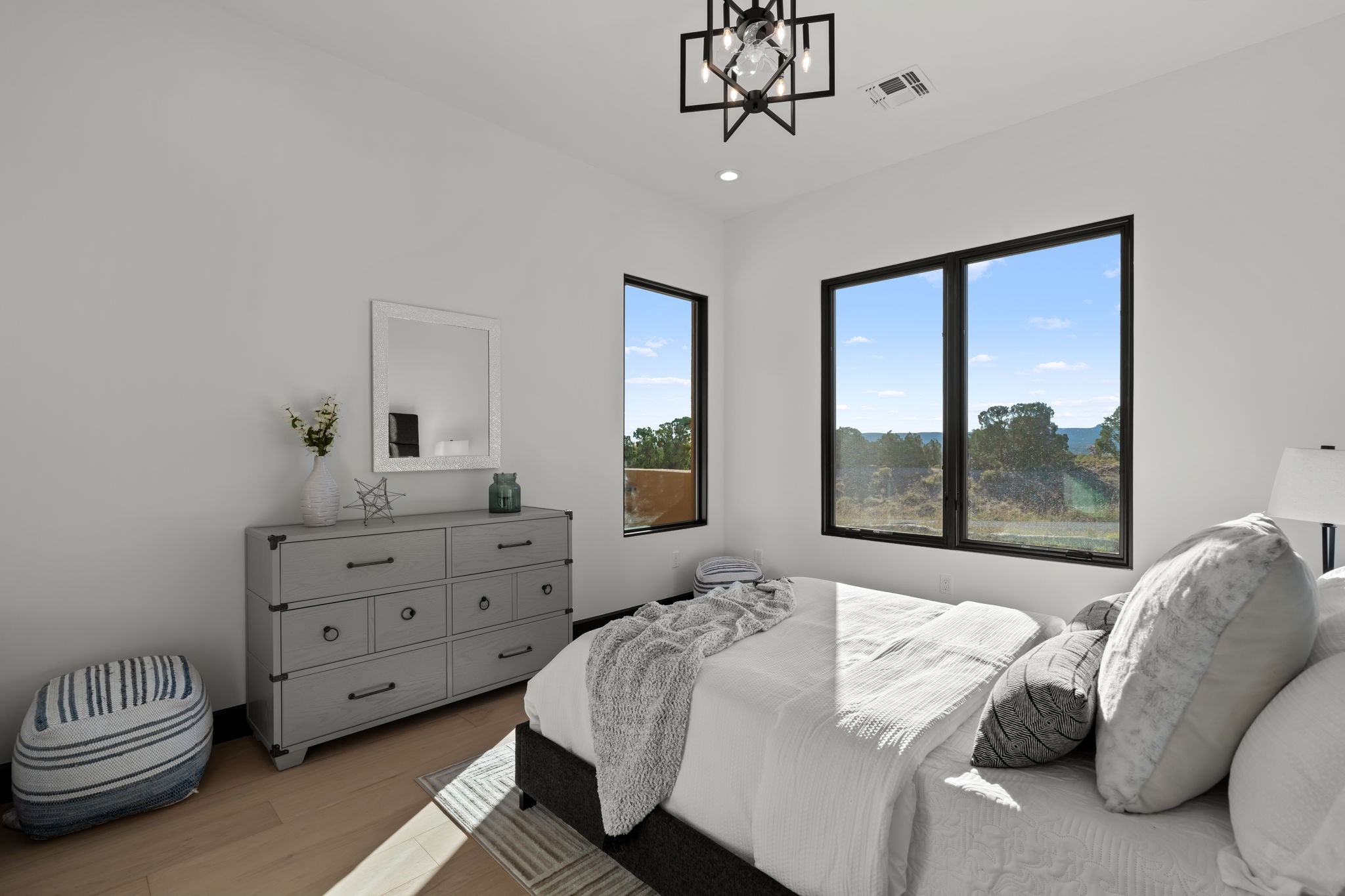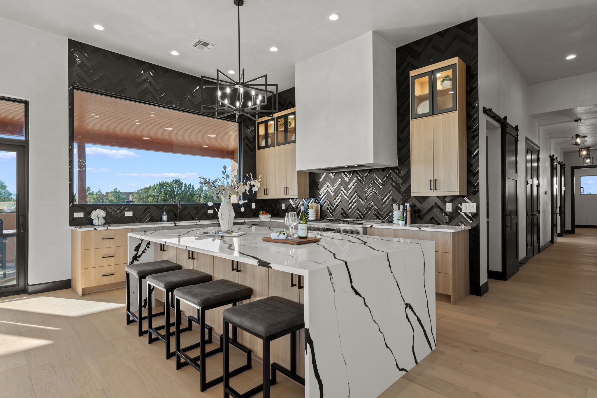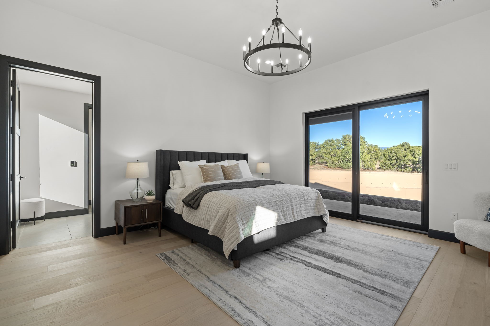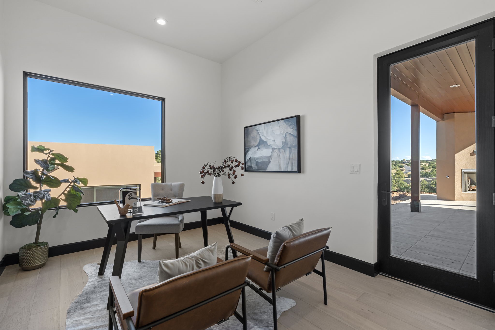 Nestled in the prestigious Las Campanas community of Santa Fe, this newly built custom estate blends modern architecture with timeless New Mexican charm. Situated on a 1.64-acre homesite overlooking two picturesque golf holes, the home captures breathtaking views of both the fairways and surrounding mountains.Built by Candelaria Homes, one of New Mexico's most respected luxury builders, this residence reflects exceptional craftsmanship and attention to detail in every corner--from its open floor plan to its refined finishes.Designed for comfort and sophistication, the single-story layout features heated floors throughout the main living and family areas, creating warmth and luxury in every season. A beautifully designed detached one-bedroom Casita offers the perfect retreat for guests, extended family, or a private studio.The gourmet kitchen impresses with bold dark finishes, high-end Sub-Zero appliances, a spacious center island, and a large butler's pantry, seamlessly combining style and function.A versatile bonus living area provides flexibility as a children's playroom, home library, or secondary living space. Expansive picture windows fill the home with natural light, framing Santa Fe's stunning landscape and creating a seamless indoor-outdoor connection.With its open-concept great room, spacious patios, and sweeping golf course and mountain views, this Las Campanas masterpiece defines elevated desert living.