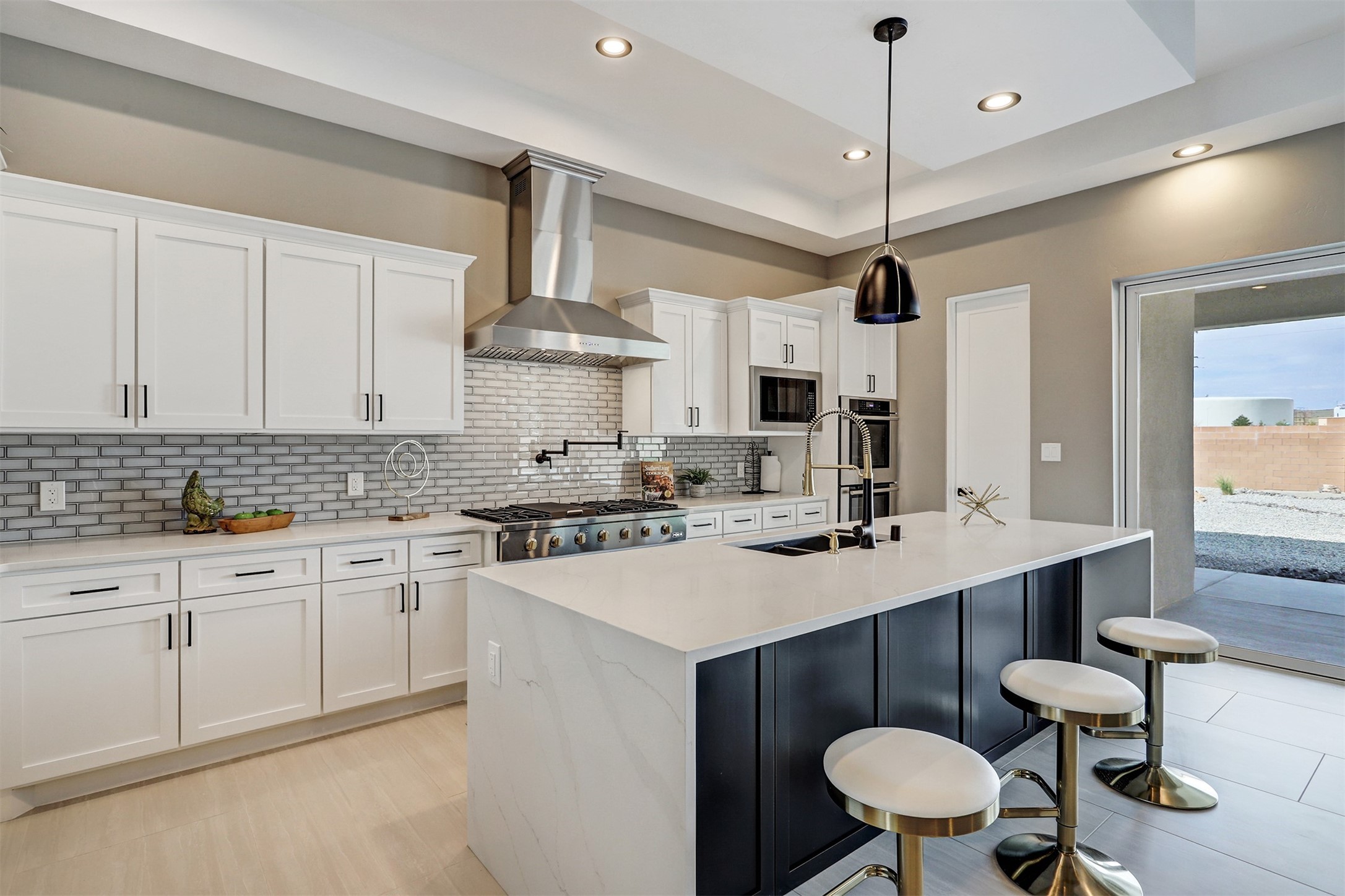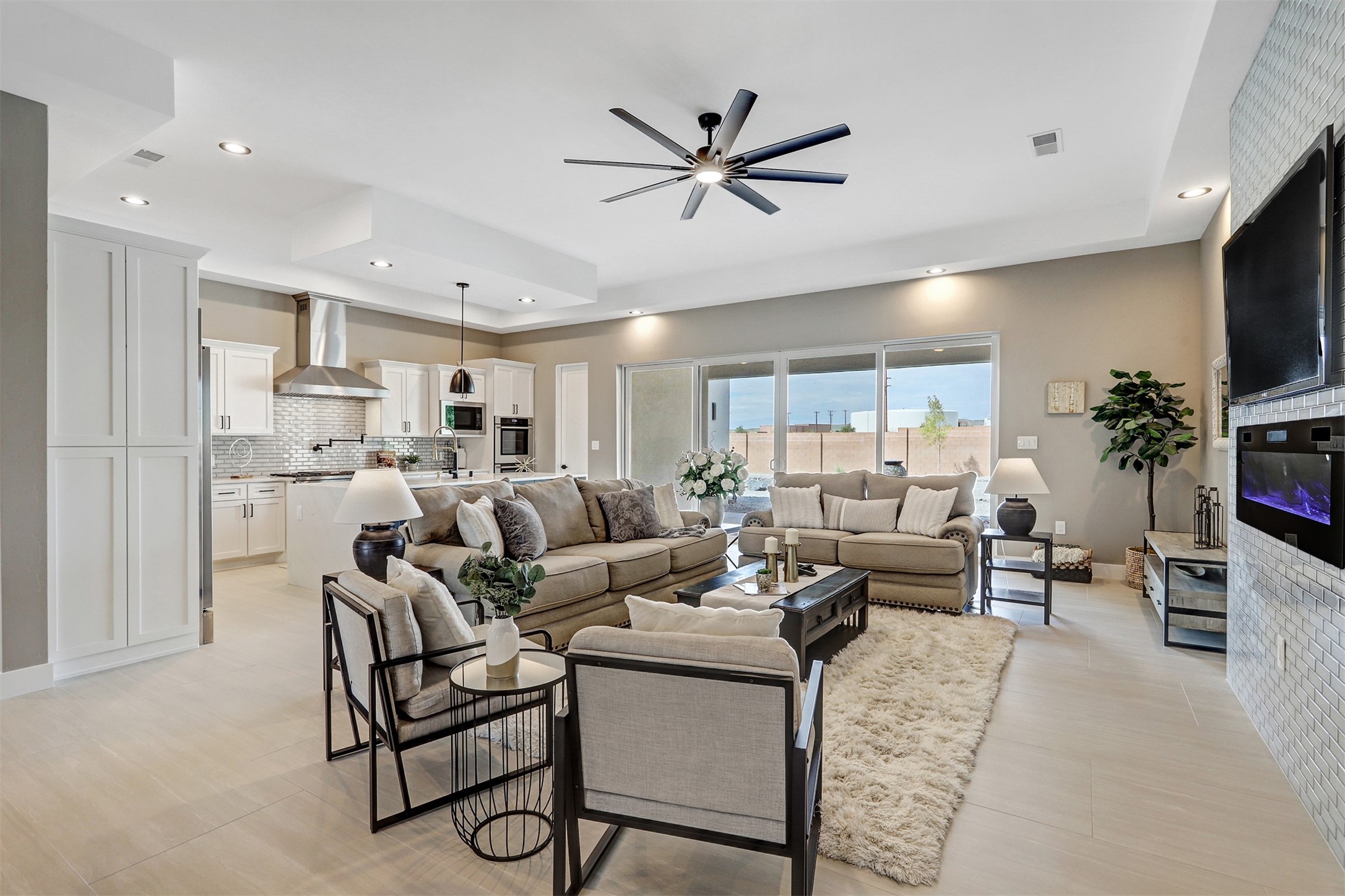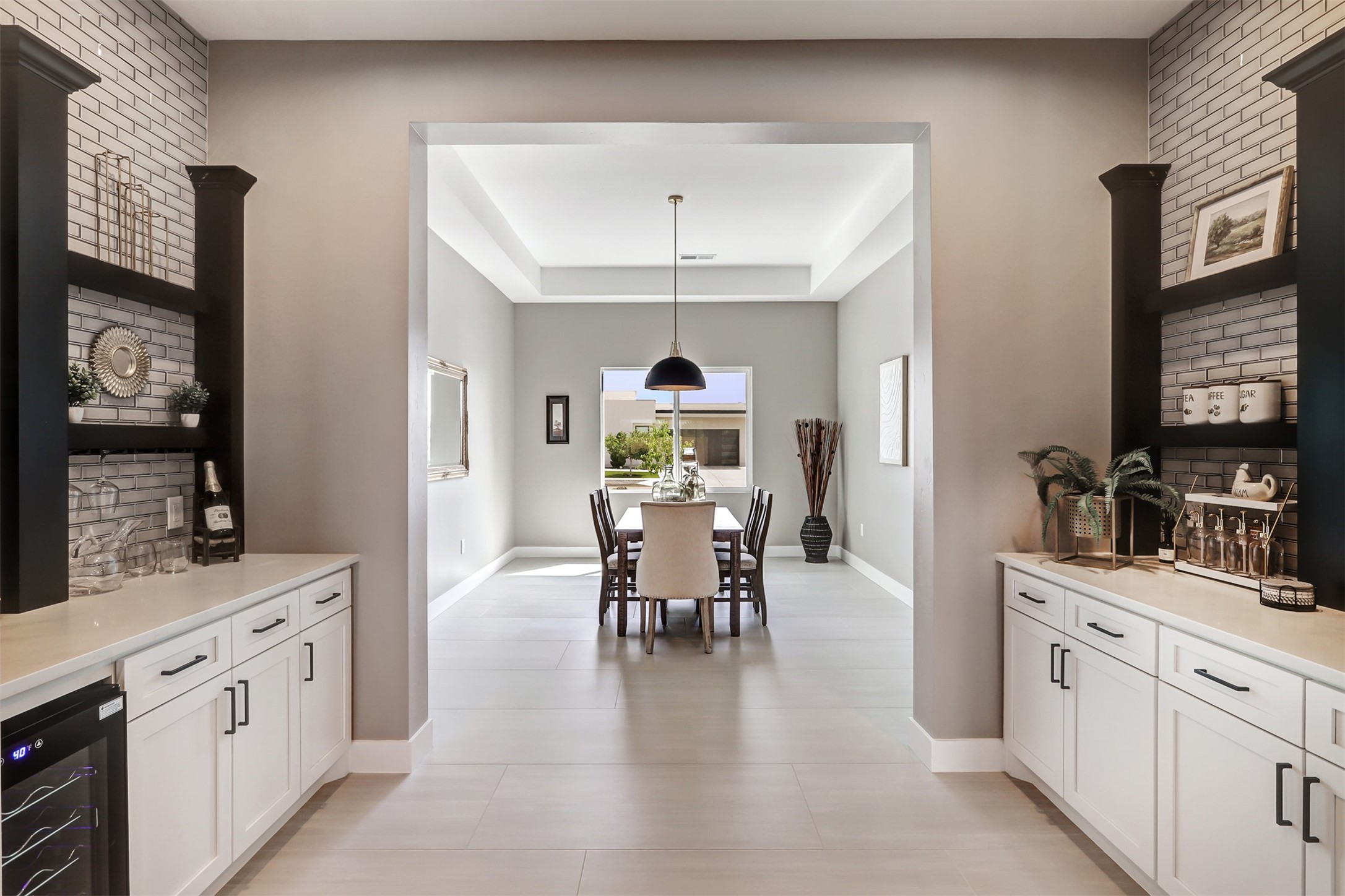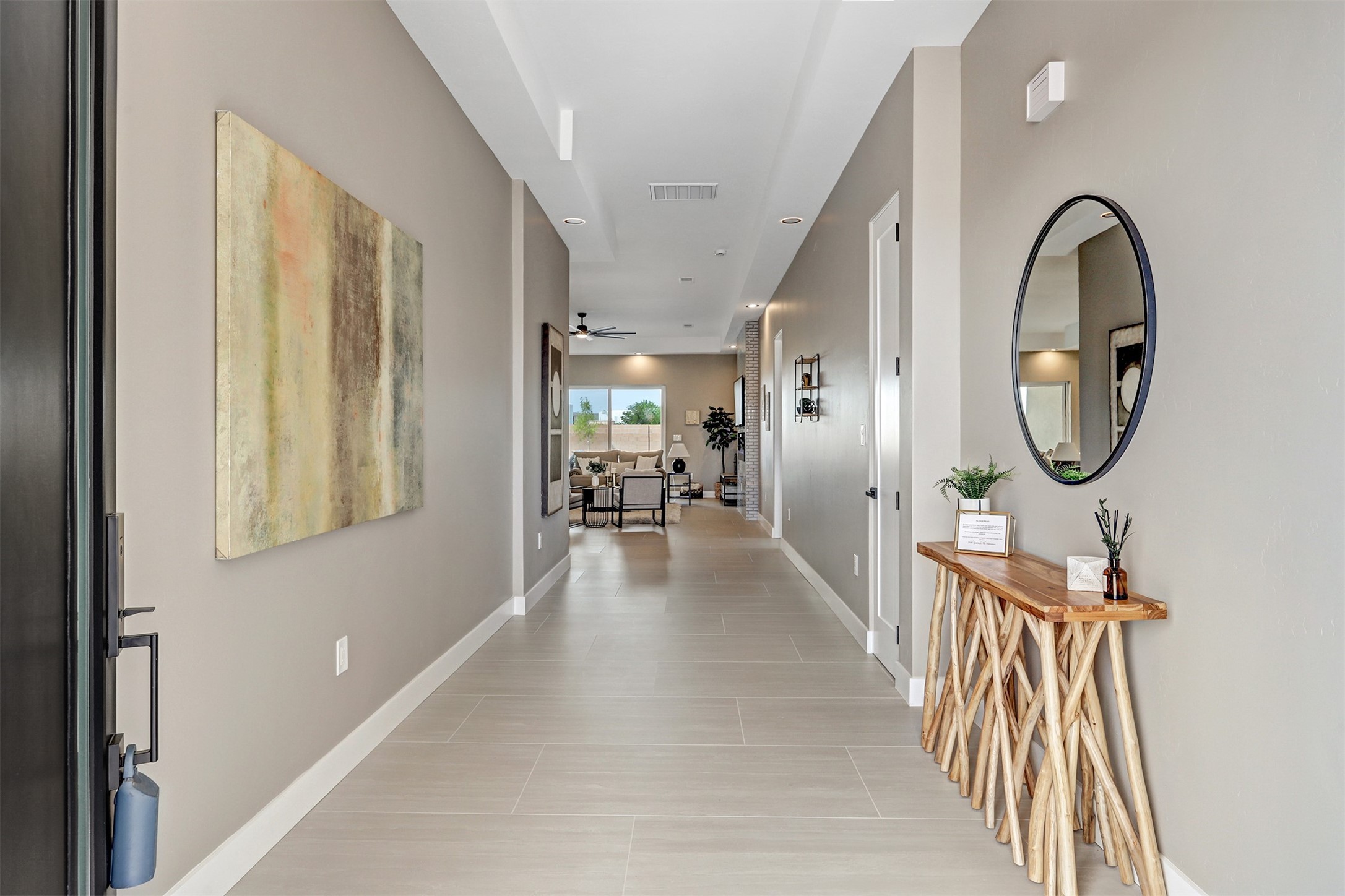 Step into luxury with this newly-built, single-story dream home that perfectly blends contemporary elegance with desert charm. Featuring soaring ceilings, 5 spacious bedrooms (2 primary suites), 3 beautifully designed bathrooms, and an oversized/ finished 2-car garage including tall doors--perfect for parking your dream truck--this home is thoughtfully crafted for comfort, functionality, and style. Walk through the sleek entry hall into an open-concept living space flooded with natural light. The gourmet kitchen boasts handmade custom cabinetry, a dual-door built-in refrigerator, premium stainless steel appliances, gas cooktop, range hood, garbage disposal, and a massive island with bar seating perfect for entertaining. Enjoy the convenience of a built-in coffee bar and a built-in wine bar with wine cooler, ideal for morning routines and evening gatherings. Retreat to the luxurious primary suite, complete with a huge closet, a spa-inspired bathroom with dual vanities, soaking tub, and a spacious walk-in shower. All bedrooms offer generous closet and storage space. Other special features include expensive oversized tile floors, refrigerated air, energy-efficient LED lighting, and a custom electric fireplace in the living area featuring multiple flame color options and built-in heat ventilation for year-round ambiance. Entertain in style opening the indoors outside through large sliding doors that lead to a spacious covered patio and huge low-maintenance yard with ample space to build your dream swimming pool. Backyard access available through custom wrought iron gates. The professionally designed xeriscape landscaping adds style with ease of upkeep. This home is packed with high-end upgrades, thoughtful design, and modern conveniencesall in a peaceful neighborhood with excellent access to quickly zip in and out of the city. Seller including a one year full warranty, 2 year warranty on major plumbing / mechanical / electric, and an 8 year structural warranty.