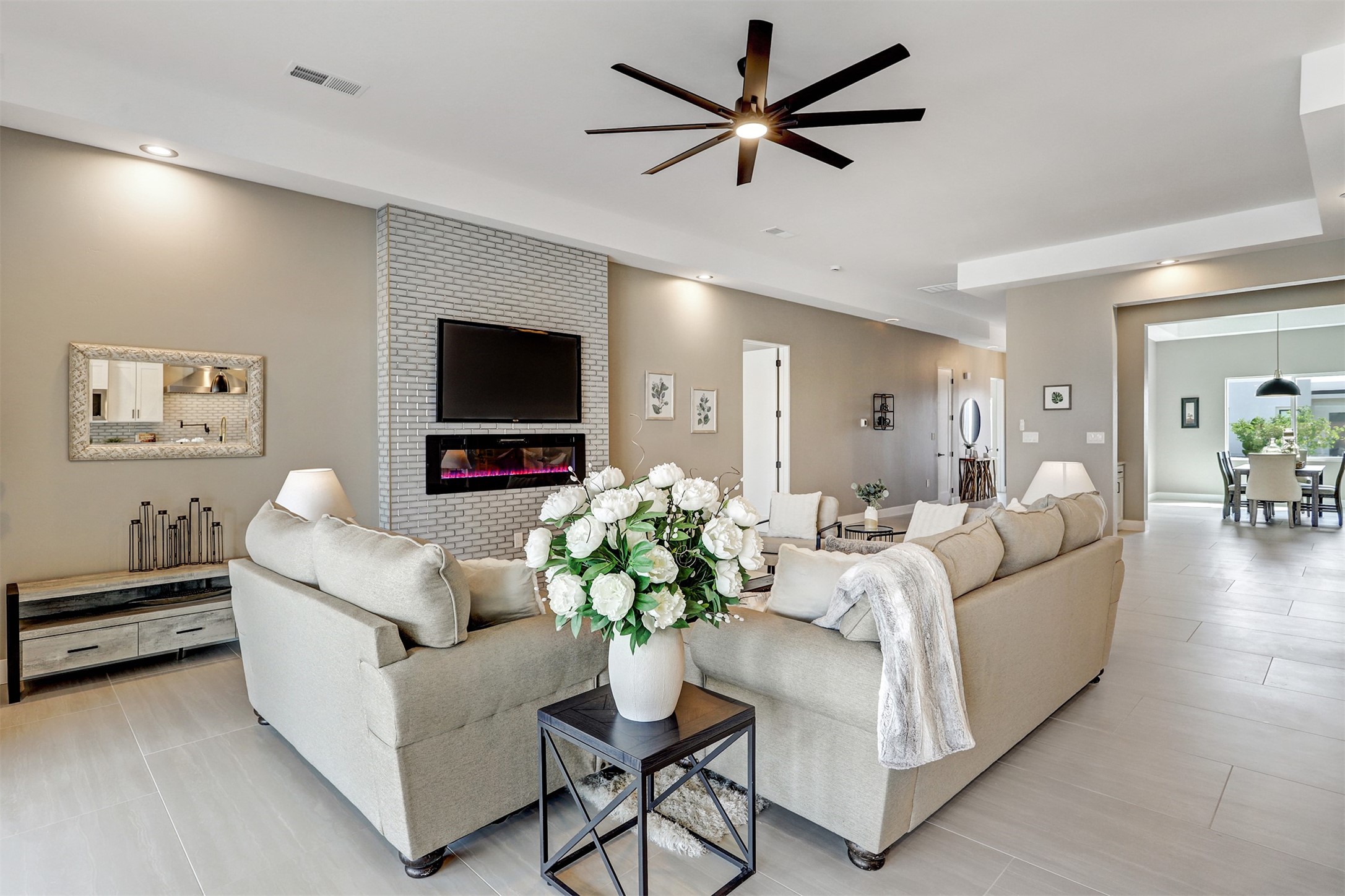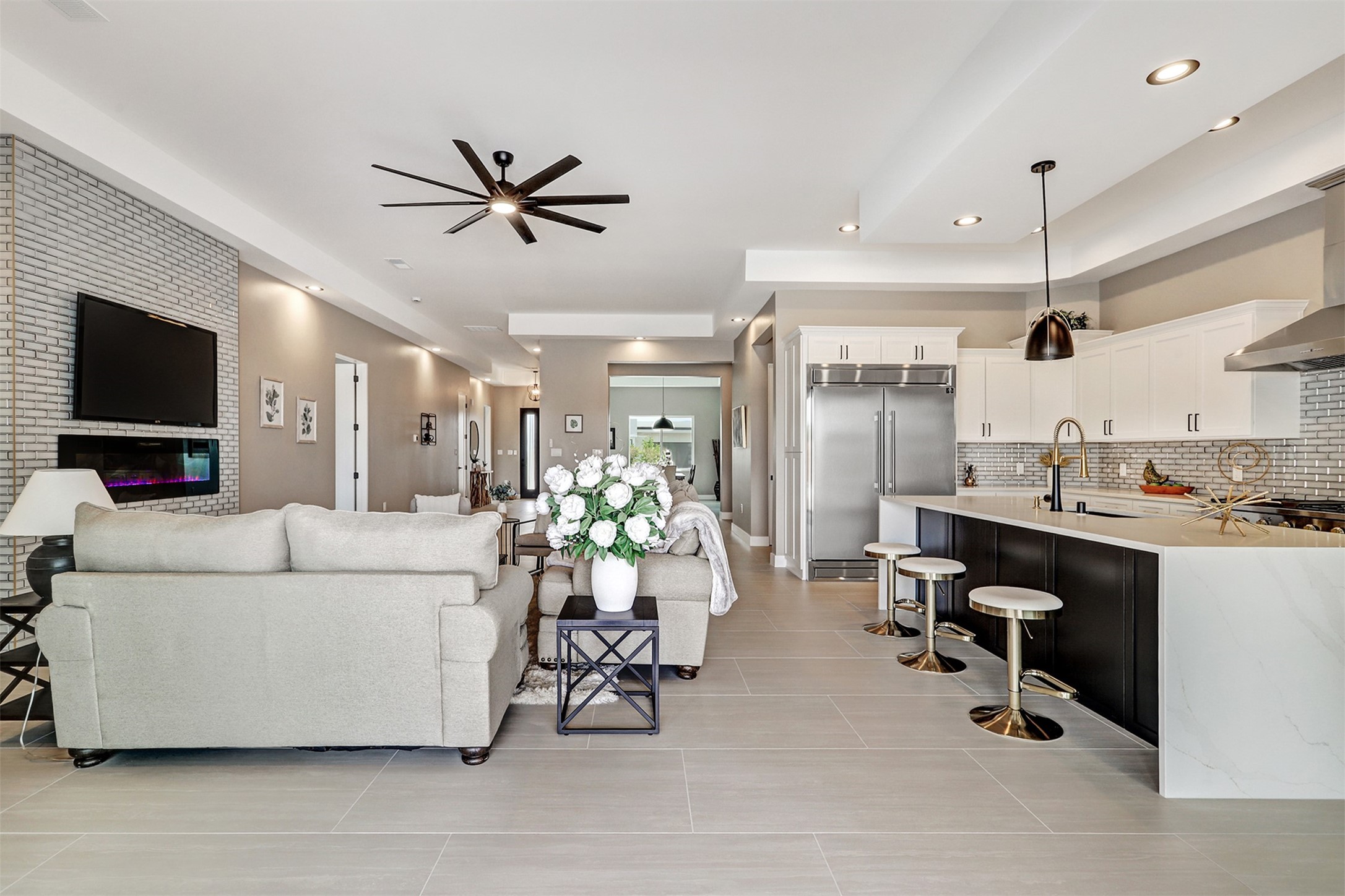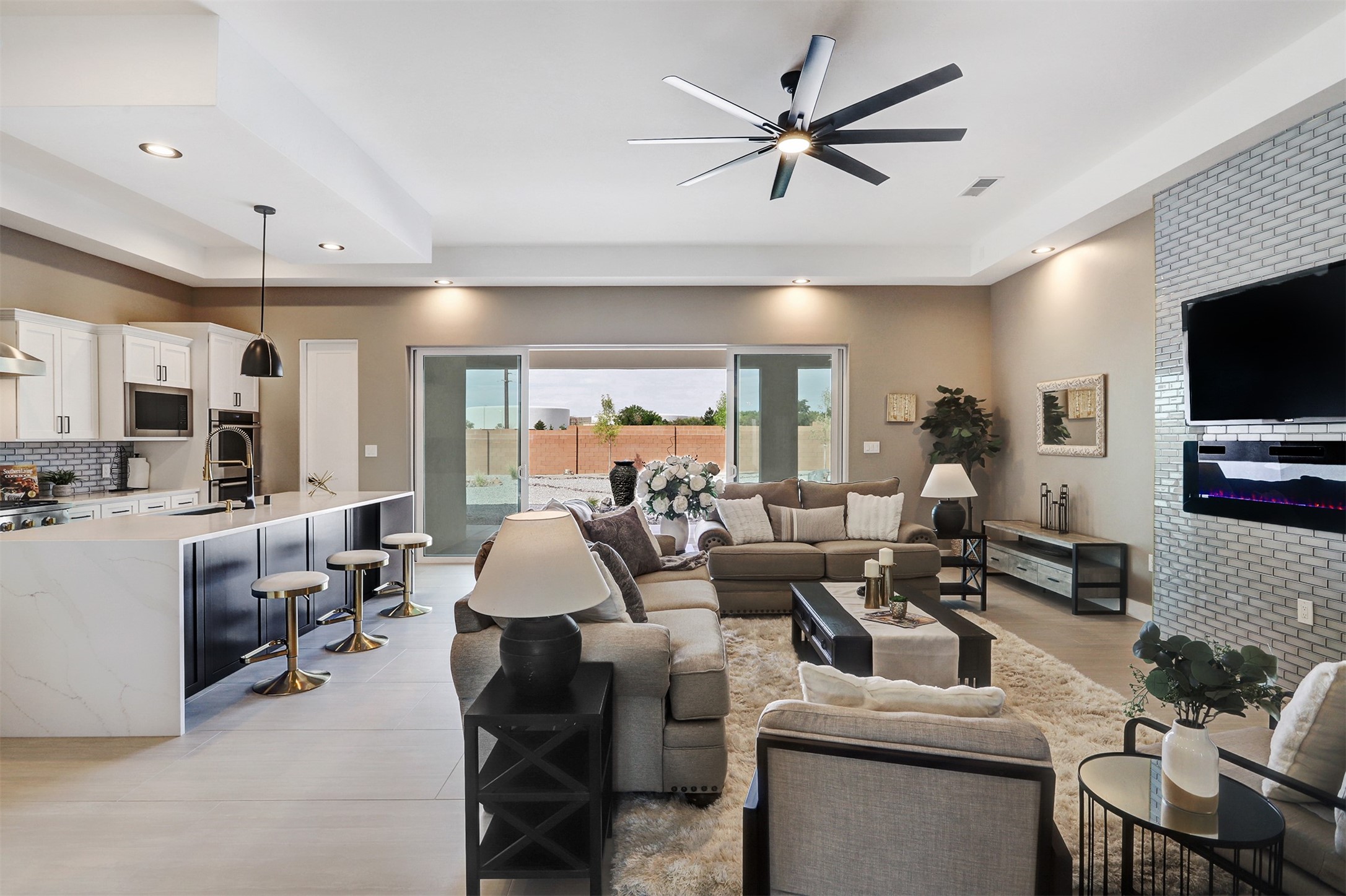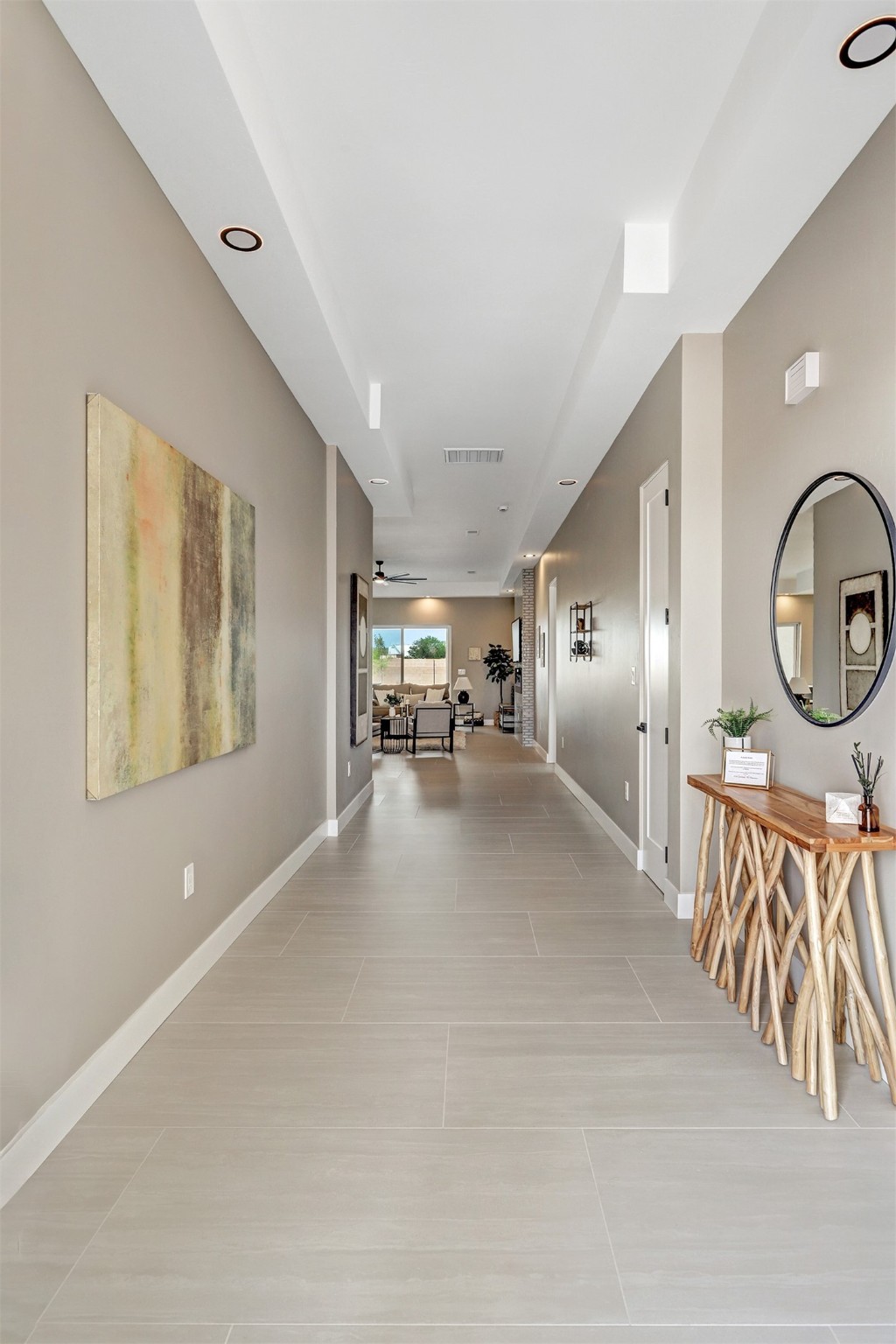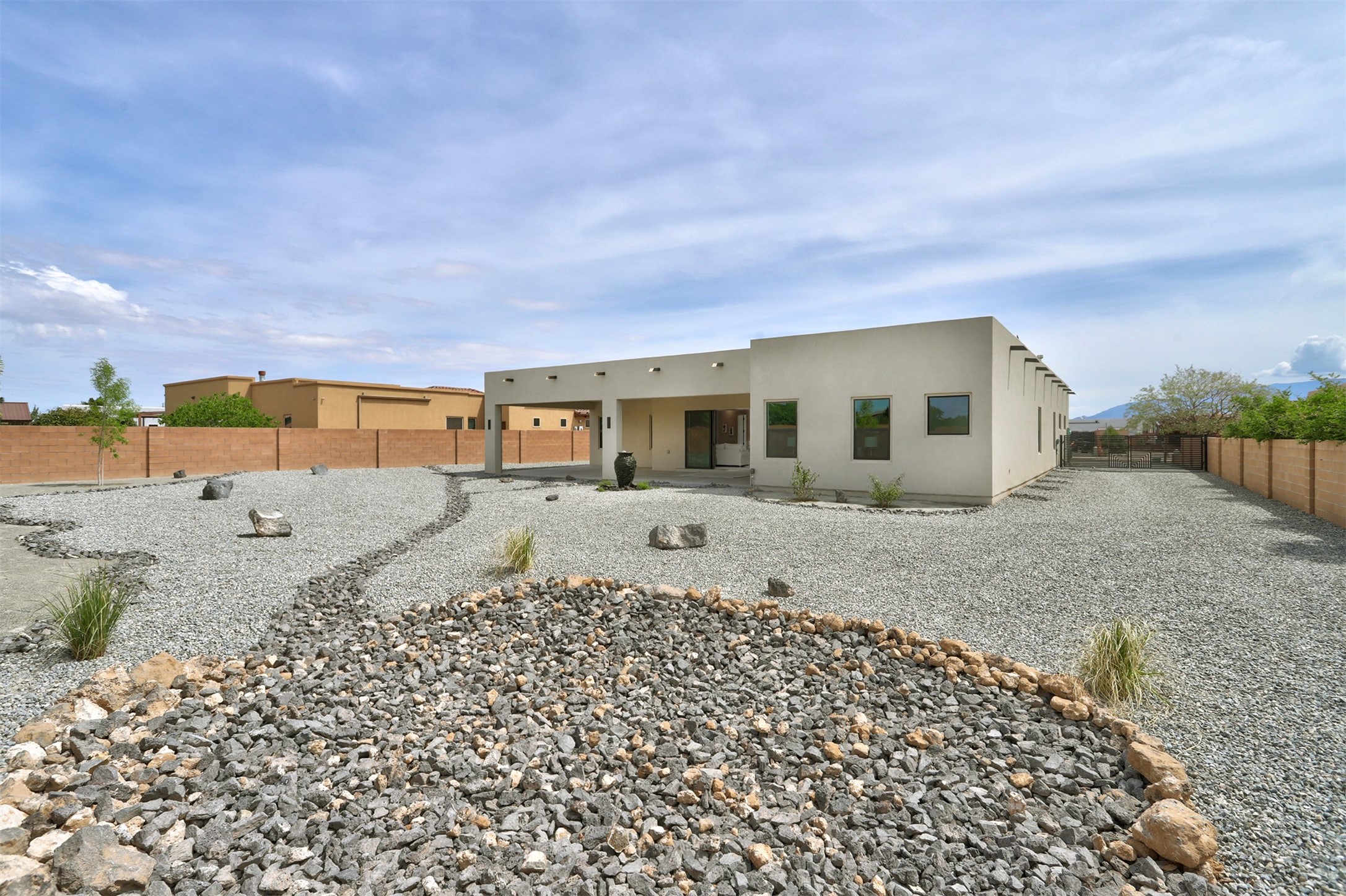 Step into luxury with this newly-built, single-story dream home that perfectly blends contemporary elegance with desert charm. Featuring soaring ceilings, 5 spacious bedrooms (2 primary suites), 3 beautifully designed bathrooms, and an oversized/ finished 2-car garage including tall doors--perfect for parking your dream truck--this home is thoughtfully crafted for comfort, functionality, and style. Walk through the sleek entry hall into an open-concept living space flooded with natural light. The gourmet kitchen boasts handmade custom cabinetry, a dual-door built-in refrigerator, premium stainless steel appliances, gas cooktop, range hood, garbage disposal, and a massive island with bar seating perfect for entertaining. Enjoy the convenience of a built-in coffee bar and a built-in wine bar with wine cooler, ideal for morning routines and evening gatherings. Retreat to the luxurious primary suite, complete with a huge closet, a spa-inspired bathroom with dual vanities, soaking tub, and a spacious walk-in shower. All bedrooms offer generous closet and storage space. Other special features include expensive oversized tile floors, refrigerated air, energy-efficient LED lighting, and a custom electric fireplace in the living area featuring multiple flame color options and built-in heat ventilation for year-round ambiance. Entertain in style opening the indoors outside through large sliding doors that lead to a spacious covered patio and huge low-maintenance yard with ample space to build your dream swimming pool. Backyard access available through custom wrought iron gates. The professionally designed xeriscape landscaping adds style with ease of upkeep. This home is packed with high-end upgrades, thoughtful design, and modern conveniencesall in a peaceful neighborhood with excellent access to quickly zip in and out of the city. Seller including a one year full warranty, 2 year warranty on major plumbing / mechanical / electric, and an 8 year structural warranty.