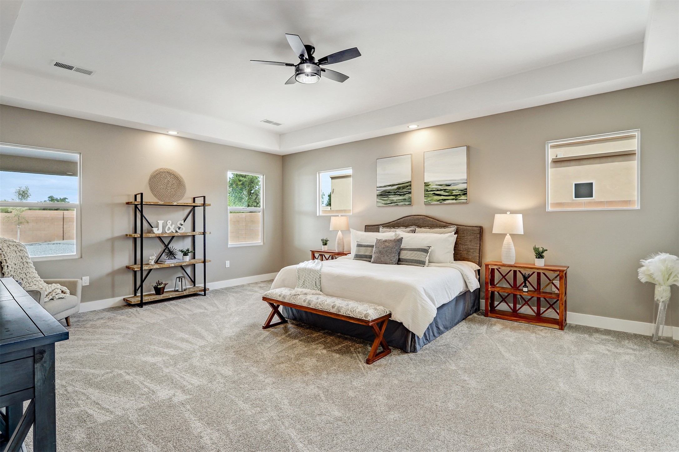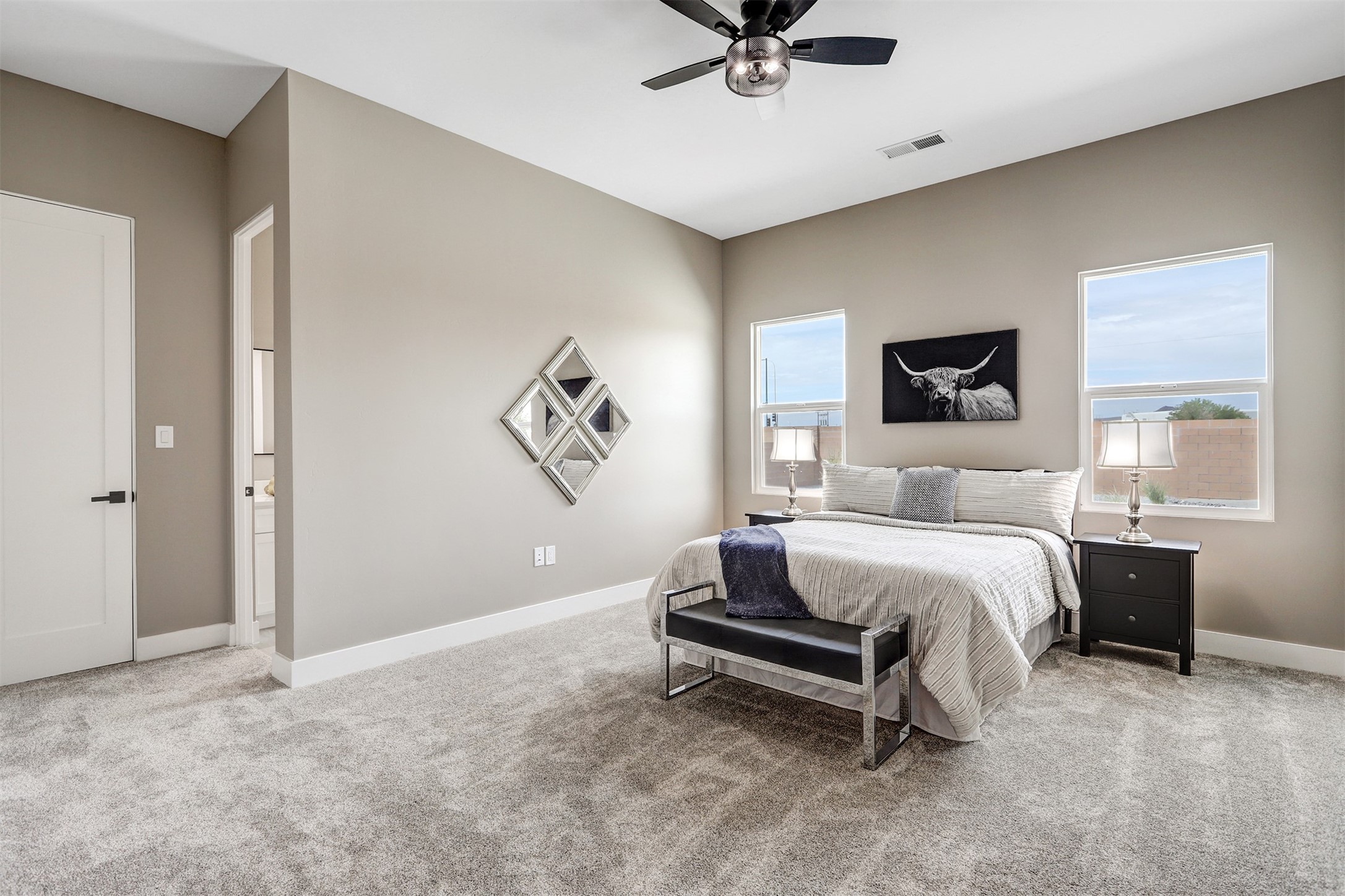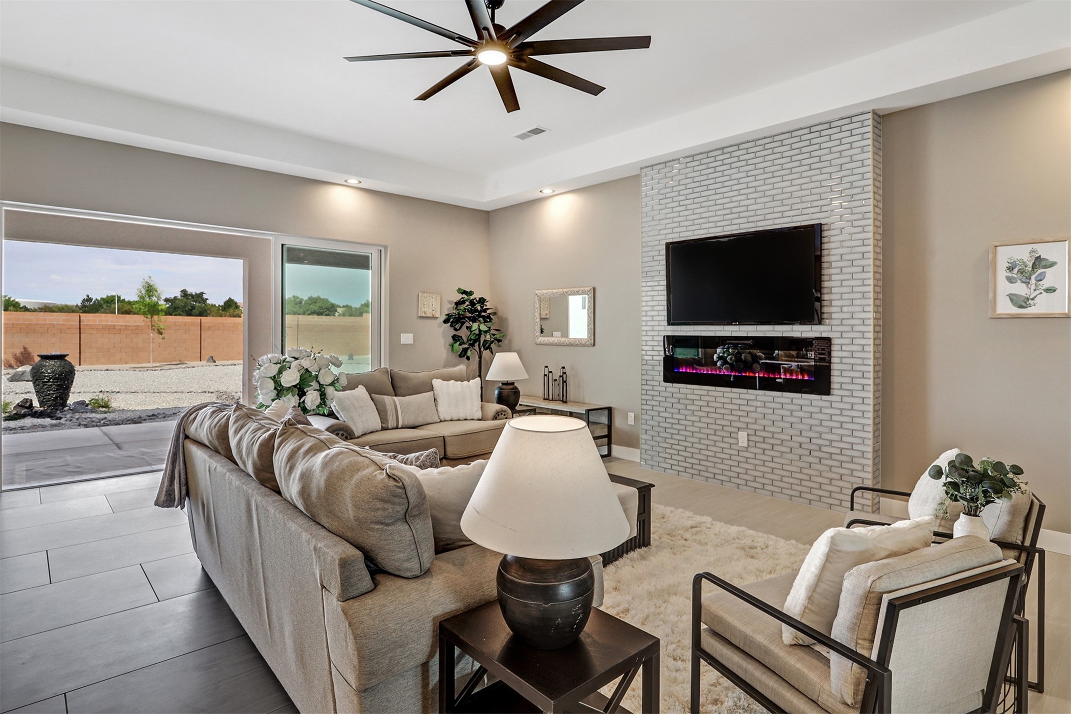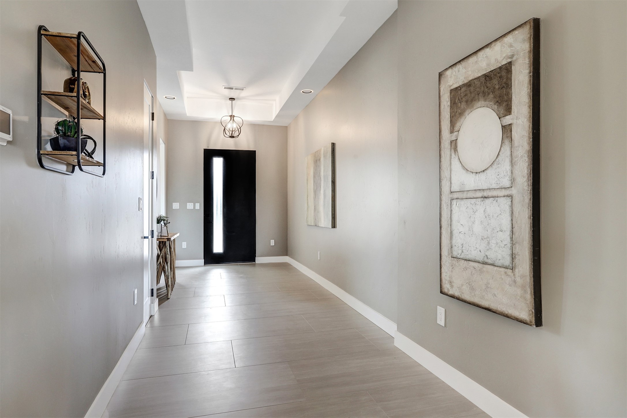 Step into luxury with this newly-built, single-story dream home that perfectly blends contemporary elegance with desert charm. Featuring soaring ceilings, 5 spacious bedrooms (2 primary suites), 3 beautifully designed bathrooms, and an oversized/ finished 2-car garage including tall doors--perfect for parking your dream truck--this home is thoughtfully crafted for comfort, functionality, and style. Walk through the sleek entry hall into an open-concept living space flooded with natural light. The gourmet kitchen boasts handmade custom cabinetry, a dual-door built-in refrigerator, premium stainless steel appliances, gas cooktop, range hood, garbage disposal, and a massive island with bar seating perfect for entertaining. Enjoy the convenience of a built-in coffee bar and a built-in wine bar with wine cooler, ideal for morning routines and evening gatherings. Retreat to the luxurious primary suite, complete with a huge closet, a spa-inspired bathroom with dual vanities, soaking tub, and a spacious walk-in shower. All bedrooms offer generous closet and storage space. Other special features include expensive oversized tile floors, refrigerated air, energy-efficient LED lighting, and a custom electric fireplace in the living area featuring multiple flame color options and built-in heat ventilation for year-round ambiance. Entertain in style opening the indoors outside through large sliding doors that lead to a spacious covered patio and huge low-maintenance yard with ample space to build your dream swimming pool. Backyard access available through custom wrought iron gates. The professionally designed xeriscape landscaping adds style with ease of upkeep. This home is packed with high-end upgrades, thoughtful design, and modern conveniencesall in a peaceful neighborhood with excellent access to quickly zip in and out of the city. Seller including a one year full warranty, 2 year warranty on major plumbing / mechanical / electric, and an 8 year structural warranty.