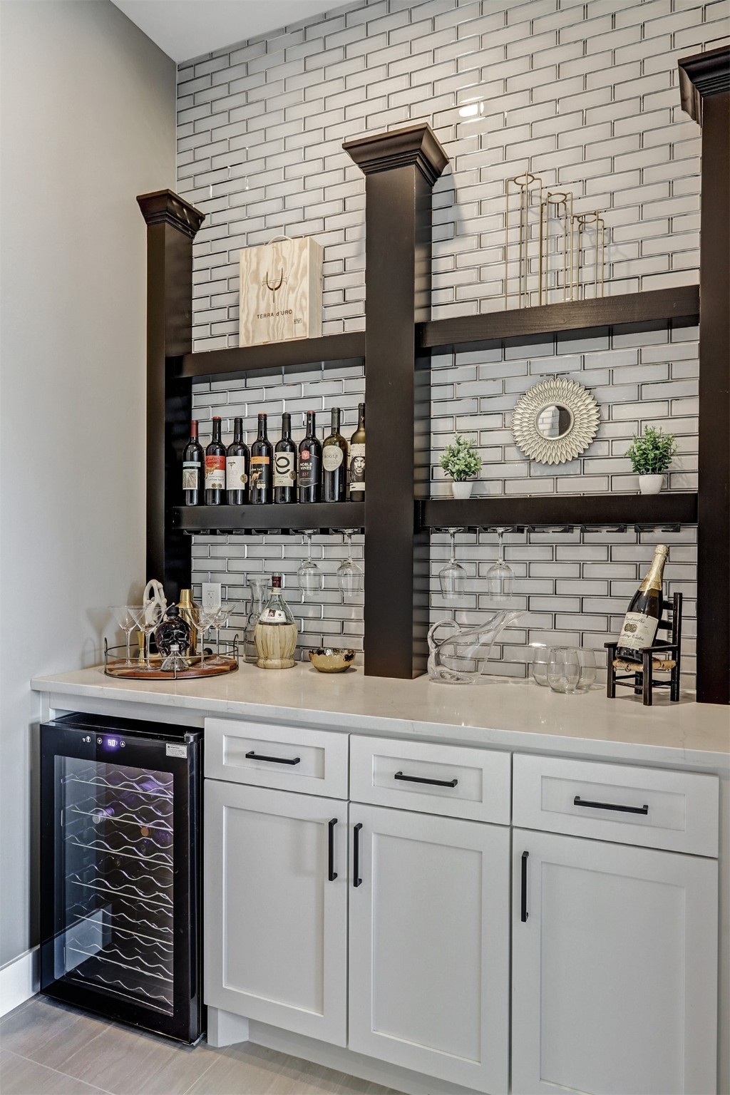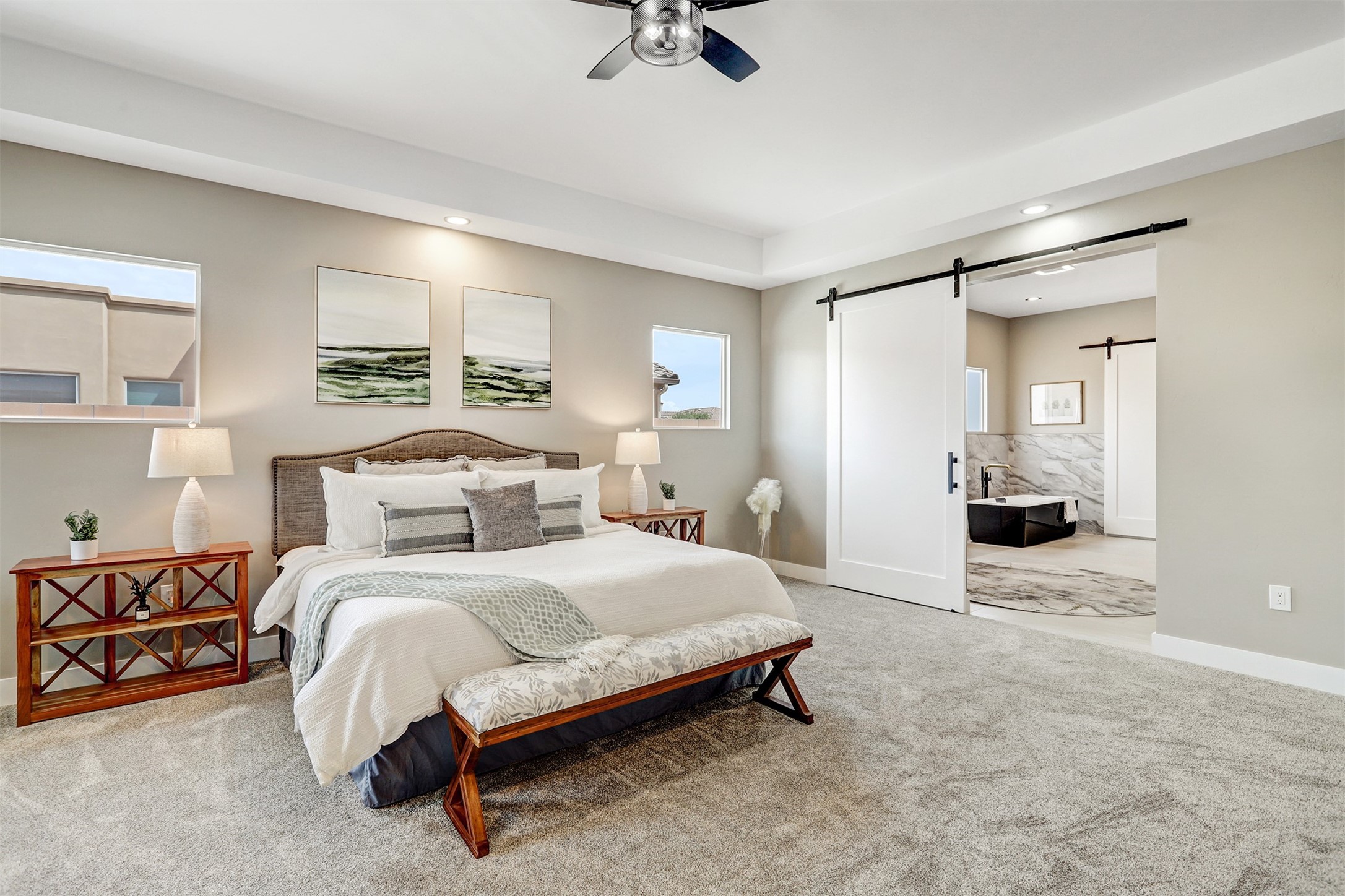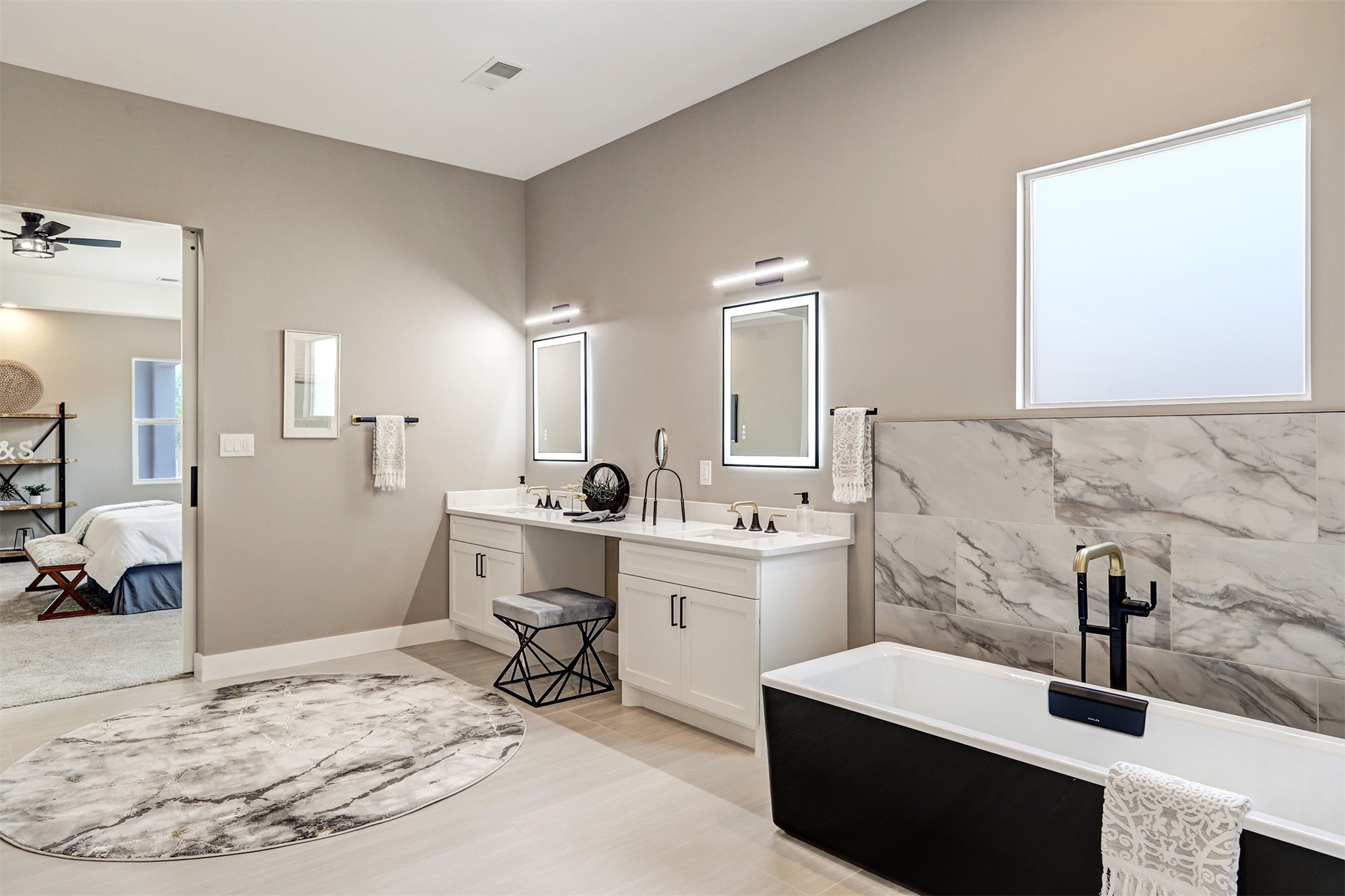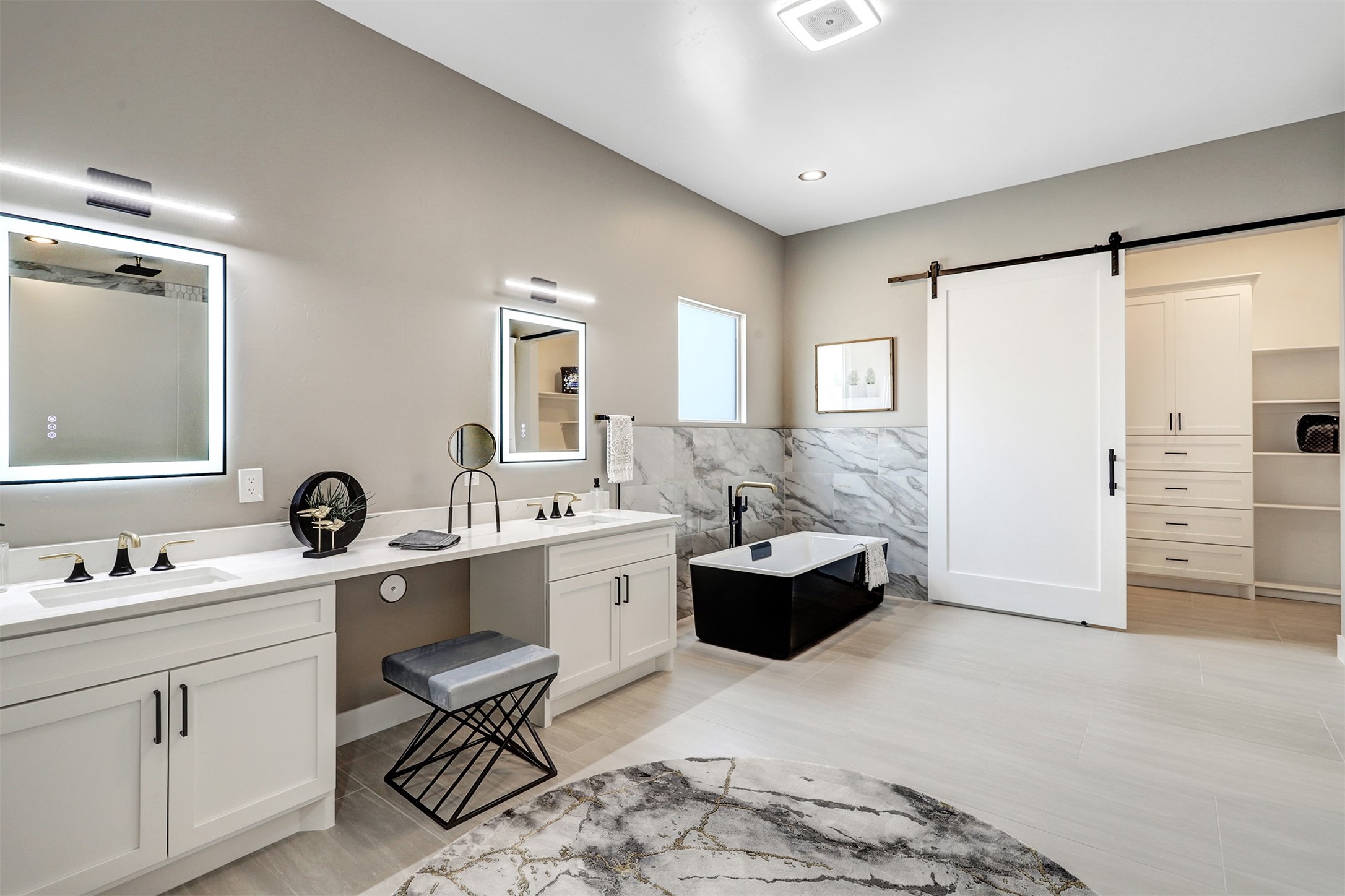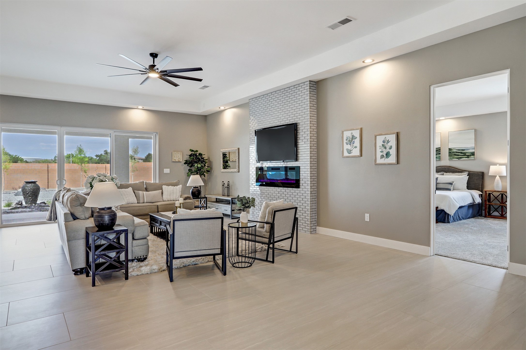 Step into luxury with this newly-built, single-story dream home that perfectly blends contemporary elegance with desert charm. Featuring soaring ceilings, 5 spacious bedrooms (2 primary suites), 3 beautifully designed bathrooms, and an oversized/ finished 2-car garage including tall doors--perfect for parking your dream truck--this home is thoughtfully crafted for comfort, functionality, and style. Walk through the sleek entry hall into an open-concept living space flooded with natural light. The gourmet kitchen boasts handmade custom cabinetry, a dual-door built-in refrigerator, premium stainless steel appliances, gas cooktop, range hood, garbage disposal, and a massive island with bar seating perfect for entertaining. Enjoy the convenience of a built-in coffee bar and a built-in wine bar with wine cooler, ideal for morning routines and evening gatherings. Retreat to the luxurious primary suite, complete with a huge closet, a spa-inspired bathroom with dual vanities, soaking tub, and a spacious walk-in shower. All bedrooms offer generous closet and storage space. Other special features include expensive oversized tile floors, refrigerated air, energy-efficient LED lighting, and a custom electric fireplace in the living area featuring multiple flame color options and built-in heat ventilation for year-round ambiance. Entertain in style opening the indoors outside through large sliding doors that lead to a spacious covered patio and huge low-maintenance yard with ample space to build your dream swimming pool. Backyard access available through custom wrought iron gates. The professionally designed xeriscape landscaping adds style with ease of upkeep. This home is packed with high-end upgrades, thoughtful design, and modern conveniencesall in a peaceful neighborhood with excellent access to quickly zip in and out of the city. Seller including a one year full warranty, 2 year warranty on major plumbing / mechanical / electric, and an 8 year structural warranty.