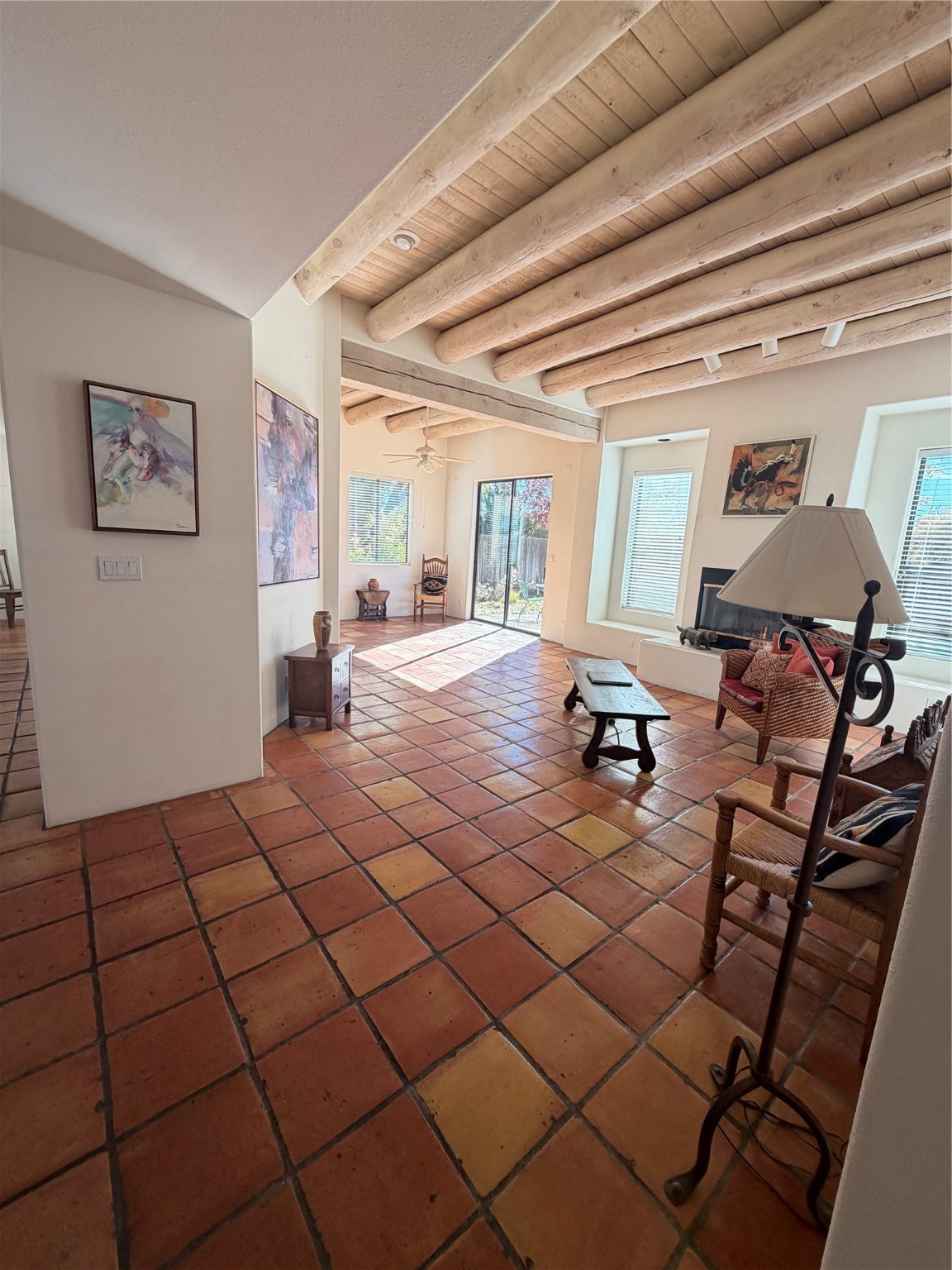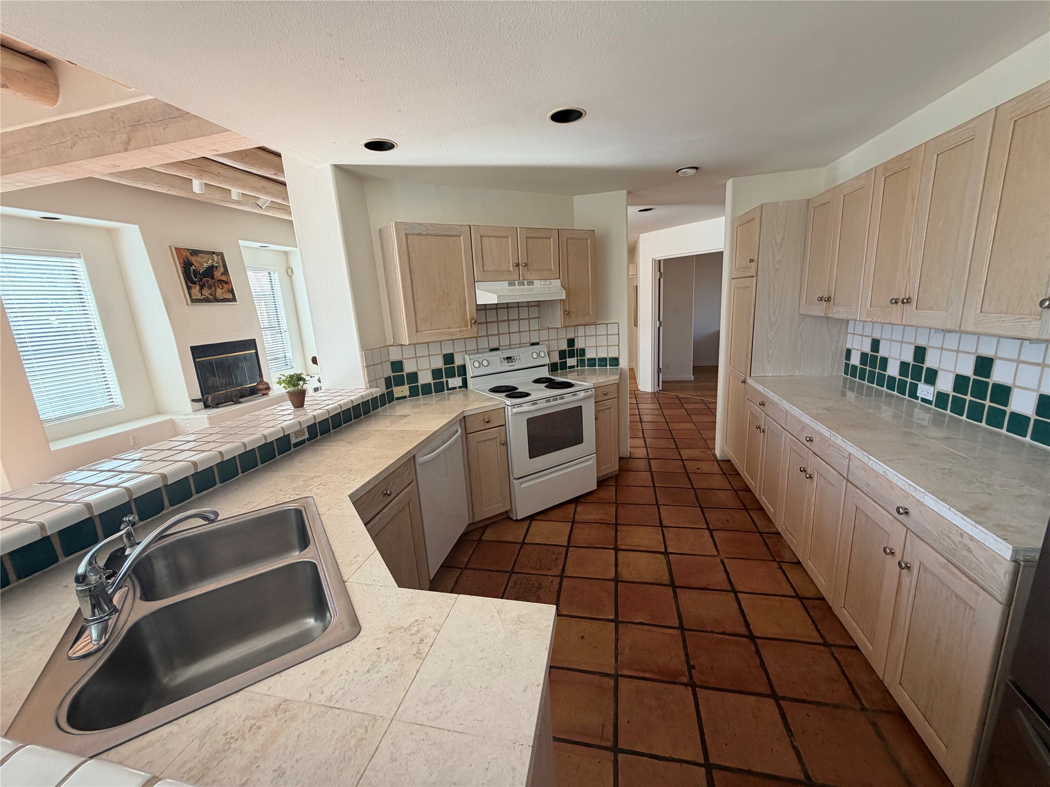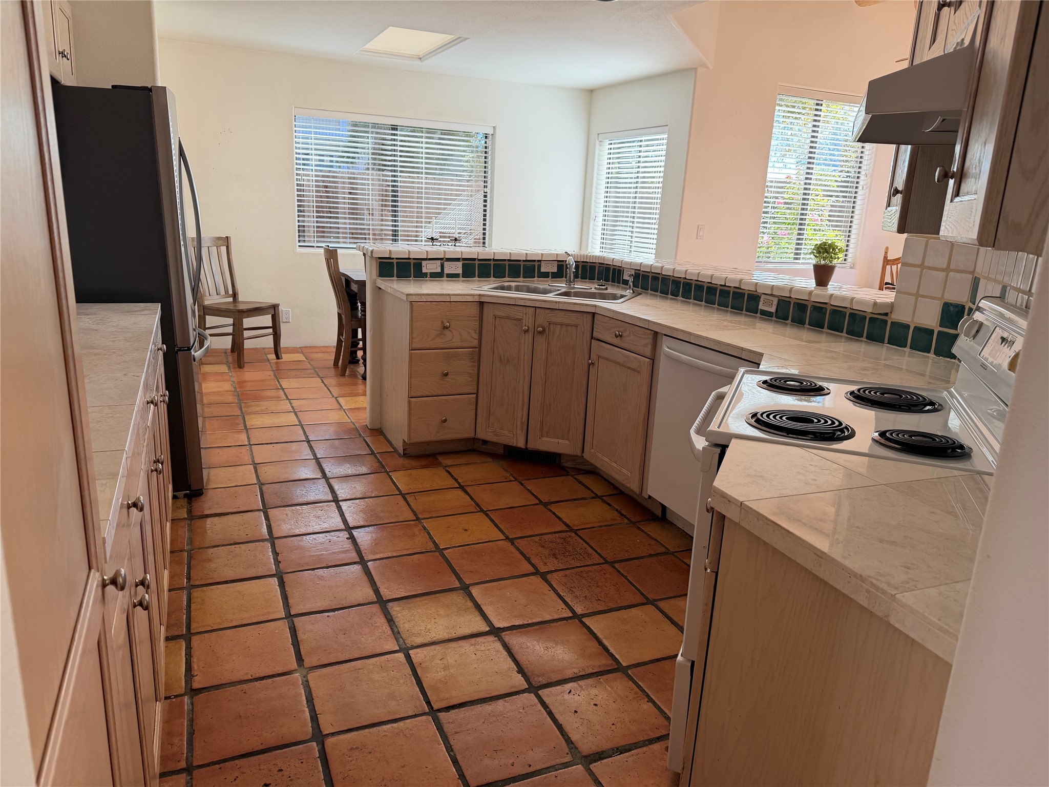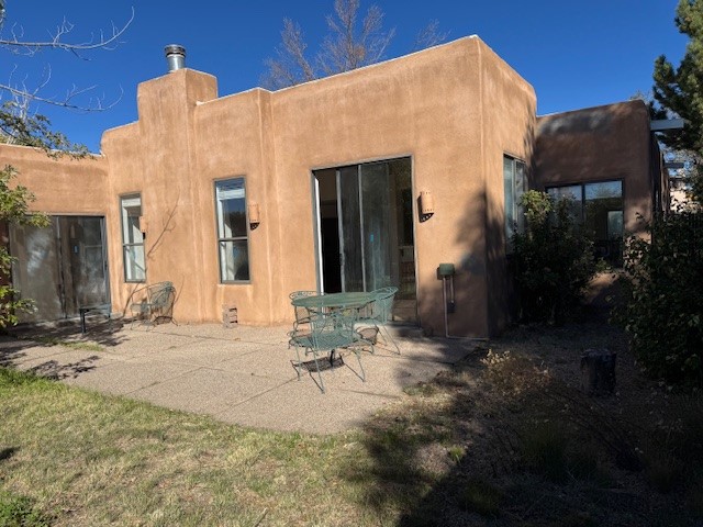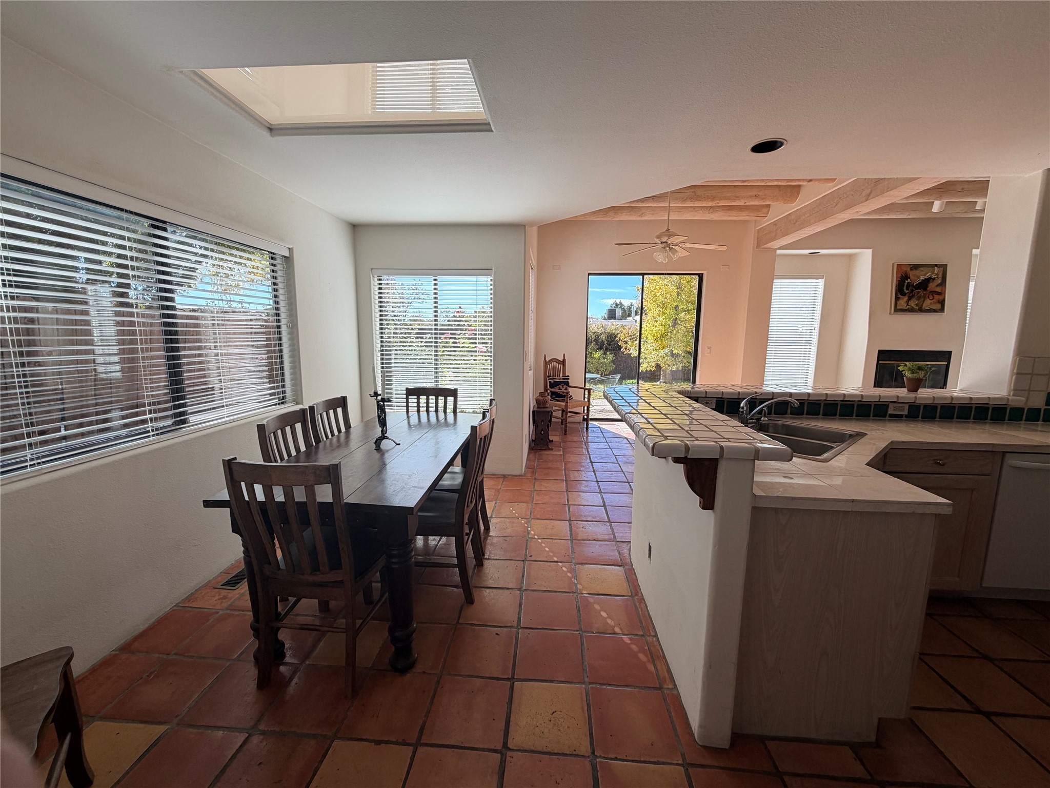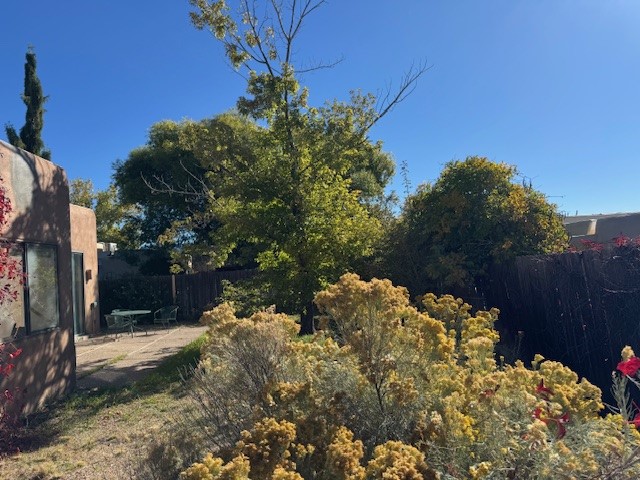 The place to be! Beautifully situated with Plaza de Castillo corner lot has good access to either entrance & even better access to Old Arroyo Chamisos walking trail. The exterior is completely private with walled courtyard and fenced and treed yards with patio to enjoy all the seasons. This sense of privacy can be seen from entry with high ceilings encompassed with vigas and T&G. Open concept through the huge working kitchen, generous eat at counter tops, formal dining, and living room enhanced with fireplace will be enjoyed by all also leads to exterior sliding door. Plenty of light filtering through skylights in this 1600+ square feet house a large master suite leading to the back yard with huge walk-in closet. Another spacious separate bedroom with a third flexible bedroom that can easily be used as an office or a studio. Oversize two car garage leads into separate laundry area and easy access to unload your groceries. Put it on your Short List.