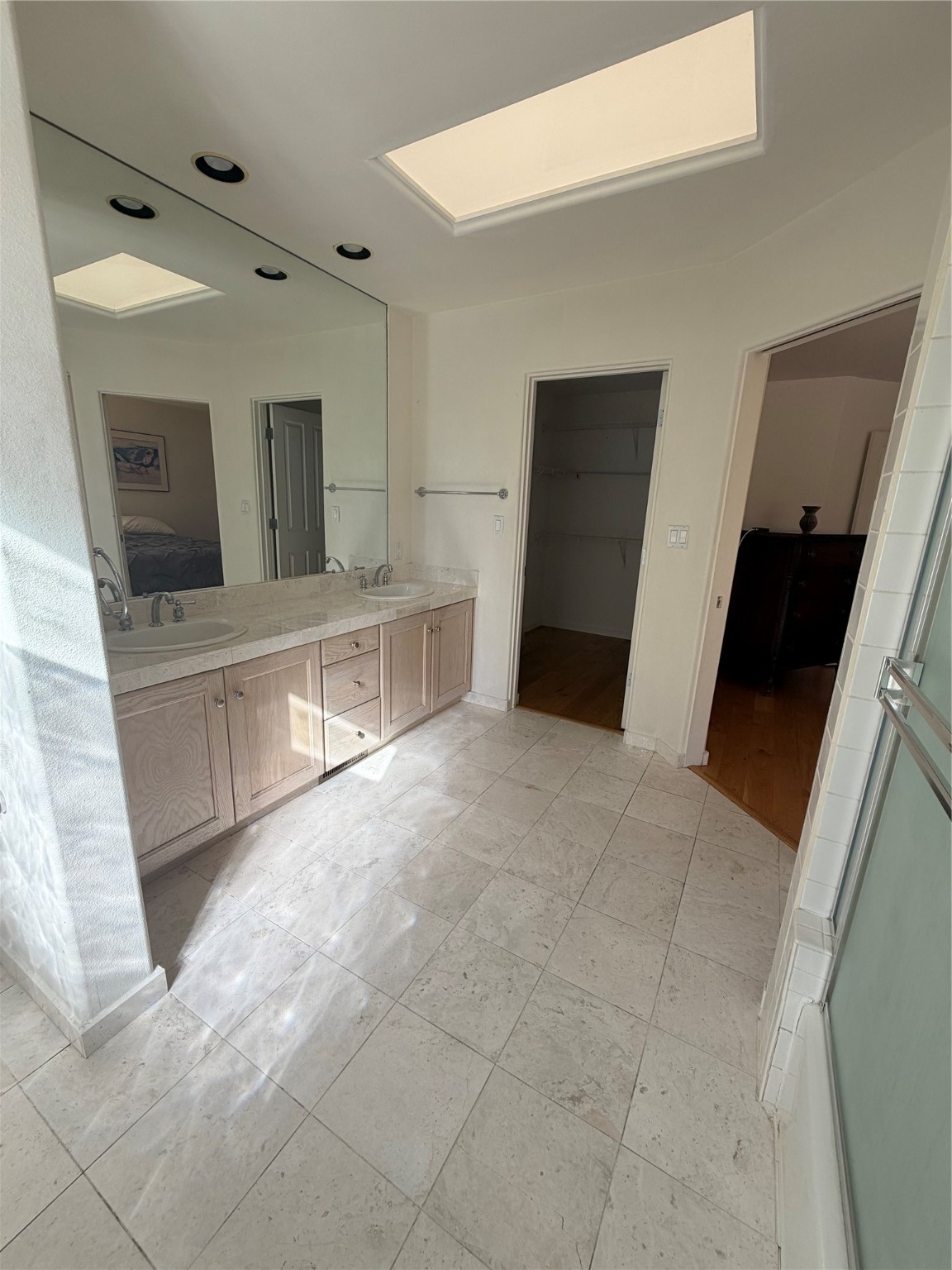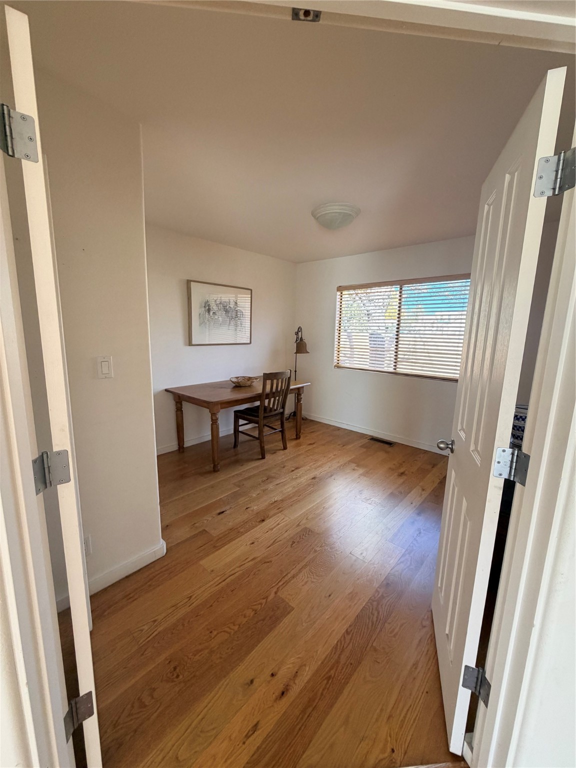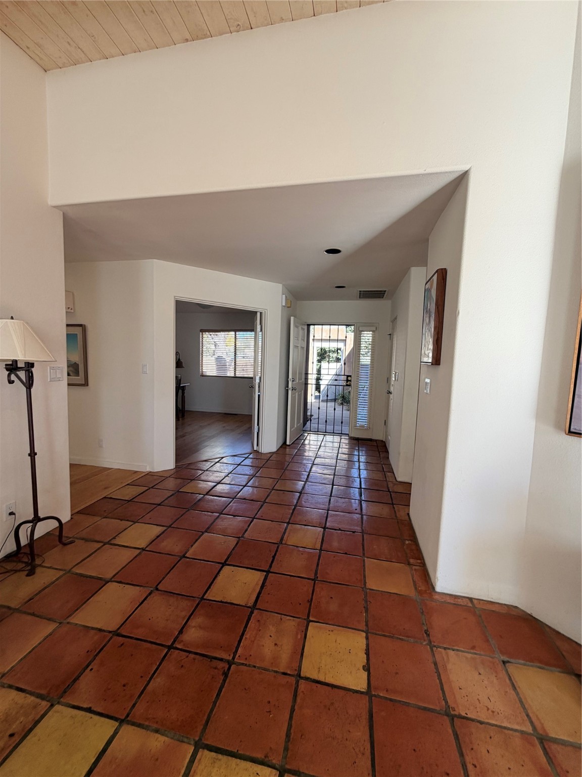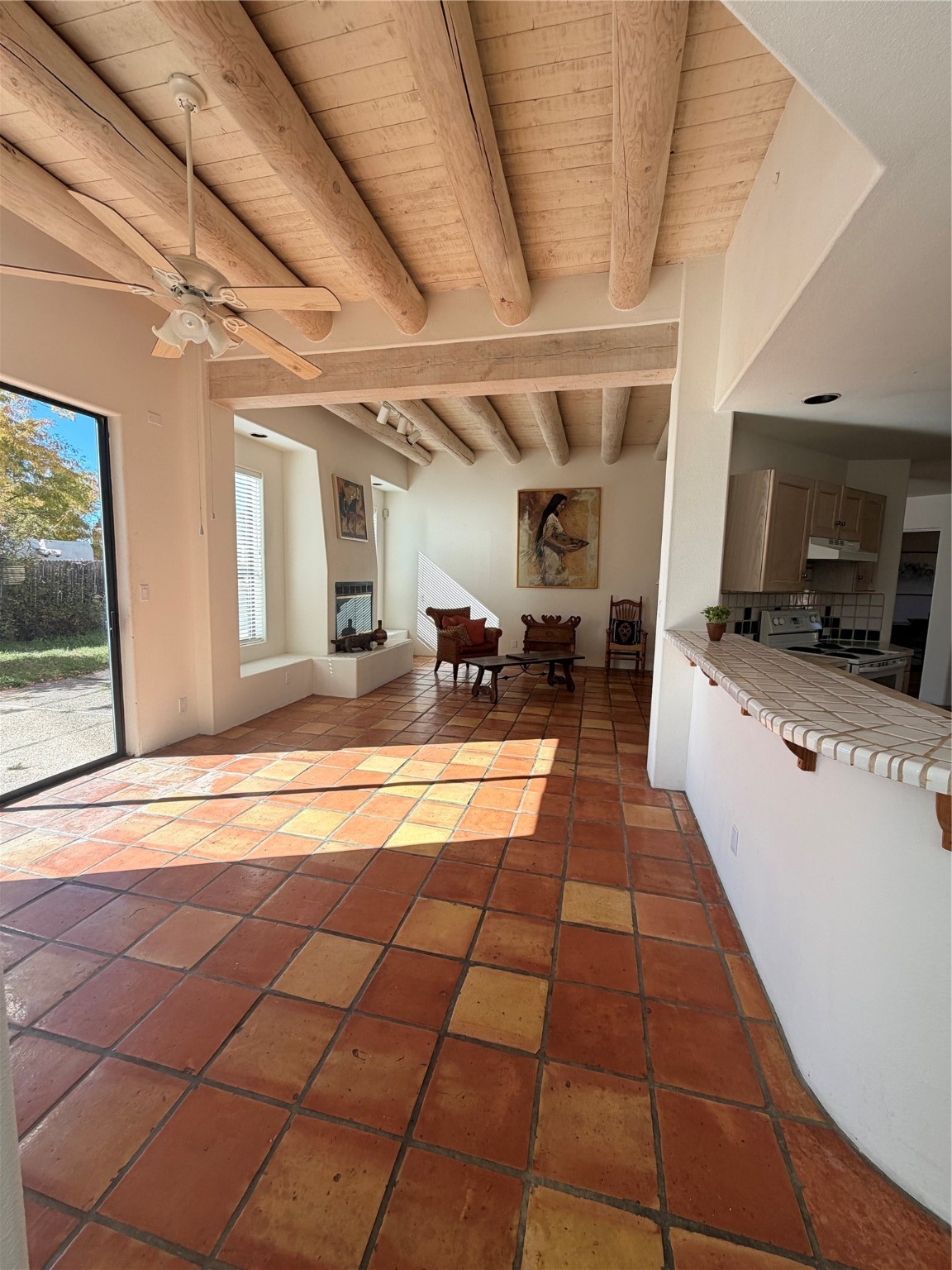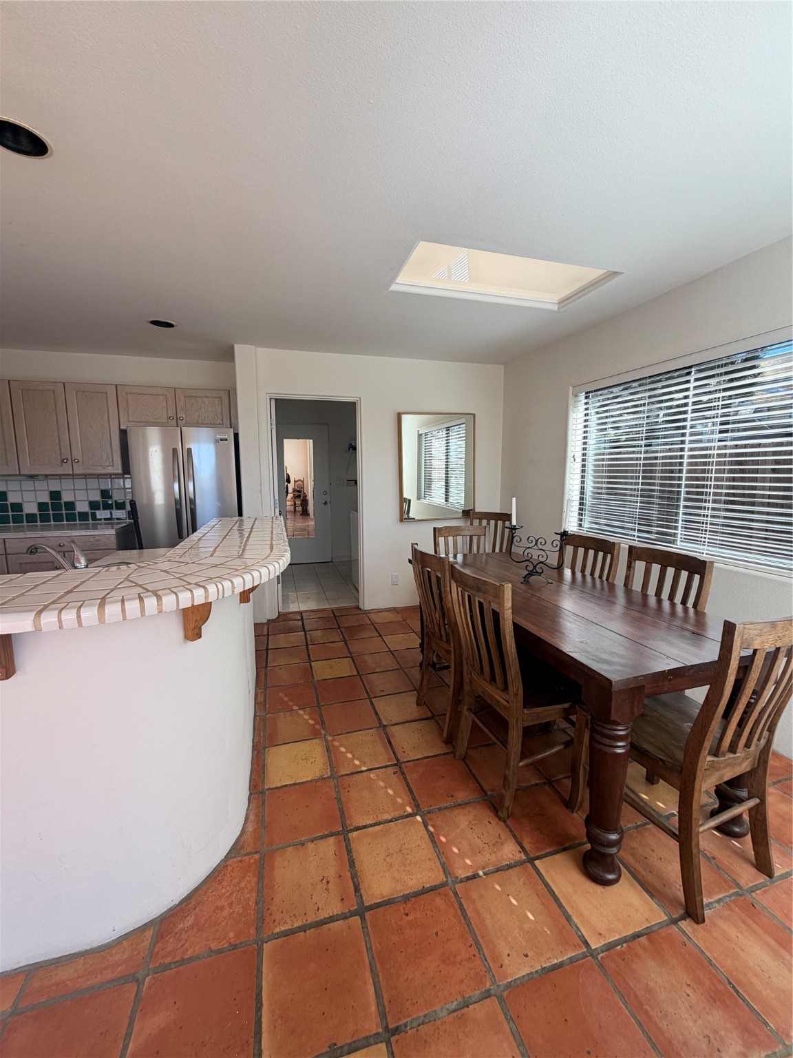 The place to be! Beautifully situated with Plaza de Castillo corner lot has good access to either entrance & even better access to Old Arroyo Chamisos walking trail. The exterior is completely private with walled courtyard and fenced and treed yards with patio to enjoy all the seasons. This sense of privacy can be seen from entry with high ceilings encompassed with vigas and T&G. Open concept through the huge working kitchen, generous eat at counter tops, formal dining, and living room enhanced with fireplace will be enjoyed by all also leads to exterior sliding door. Plenty of light filtering through skylights in this 1600+ square feet house a large master suite leading to the back yard with huge walk-in closet. Another spacious separate bedroom with a third flexible bedroom that can easily be used as an office or a studio. Oversize two car garage leads into separate laundry area and easy access to unload your groceries. Put it on your Short List.