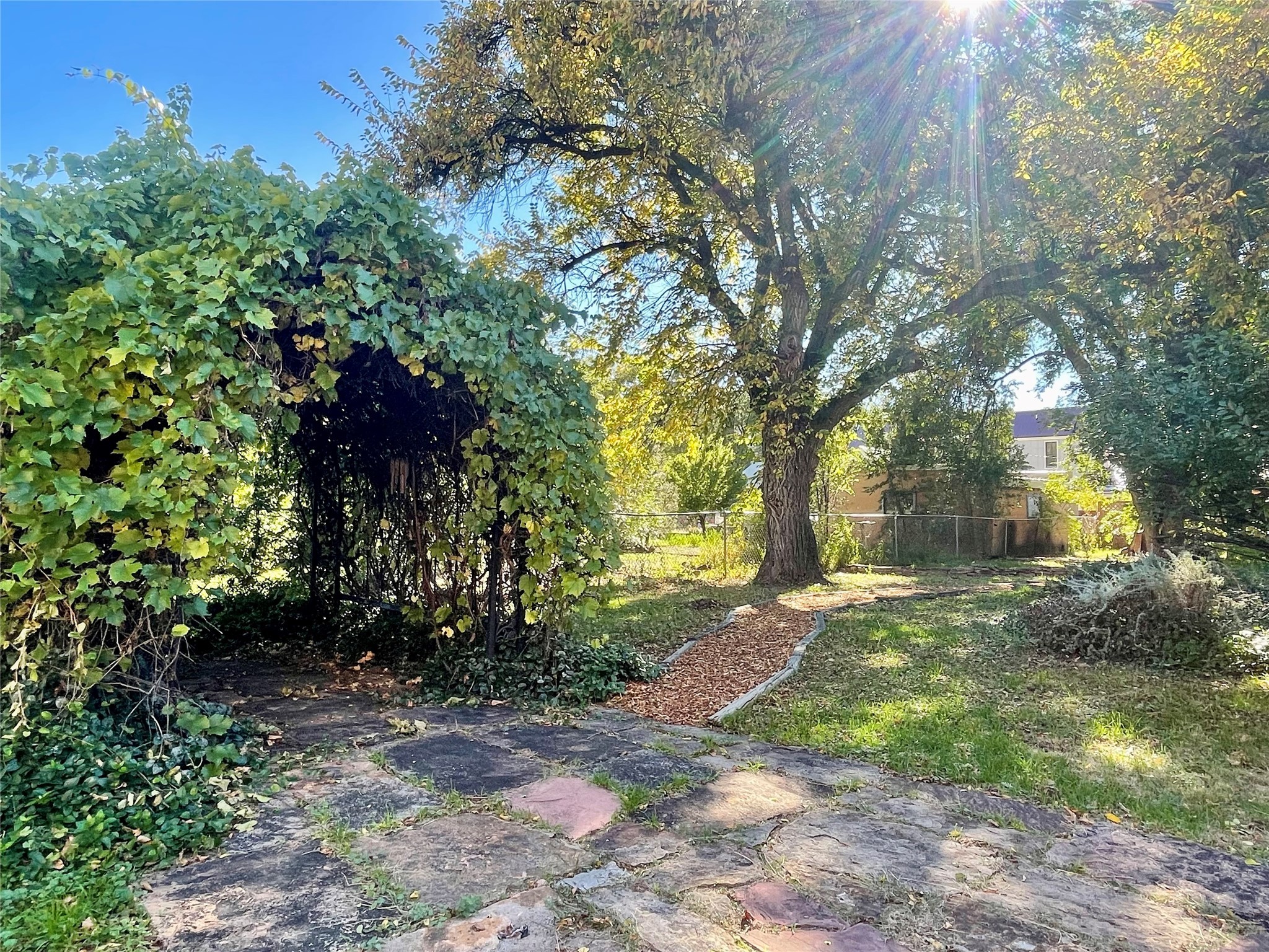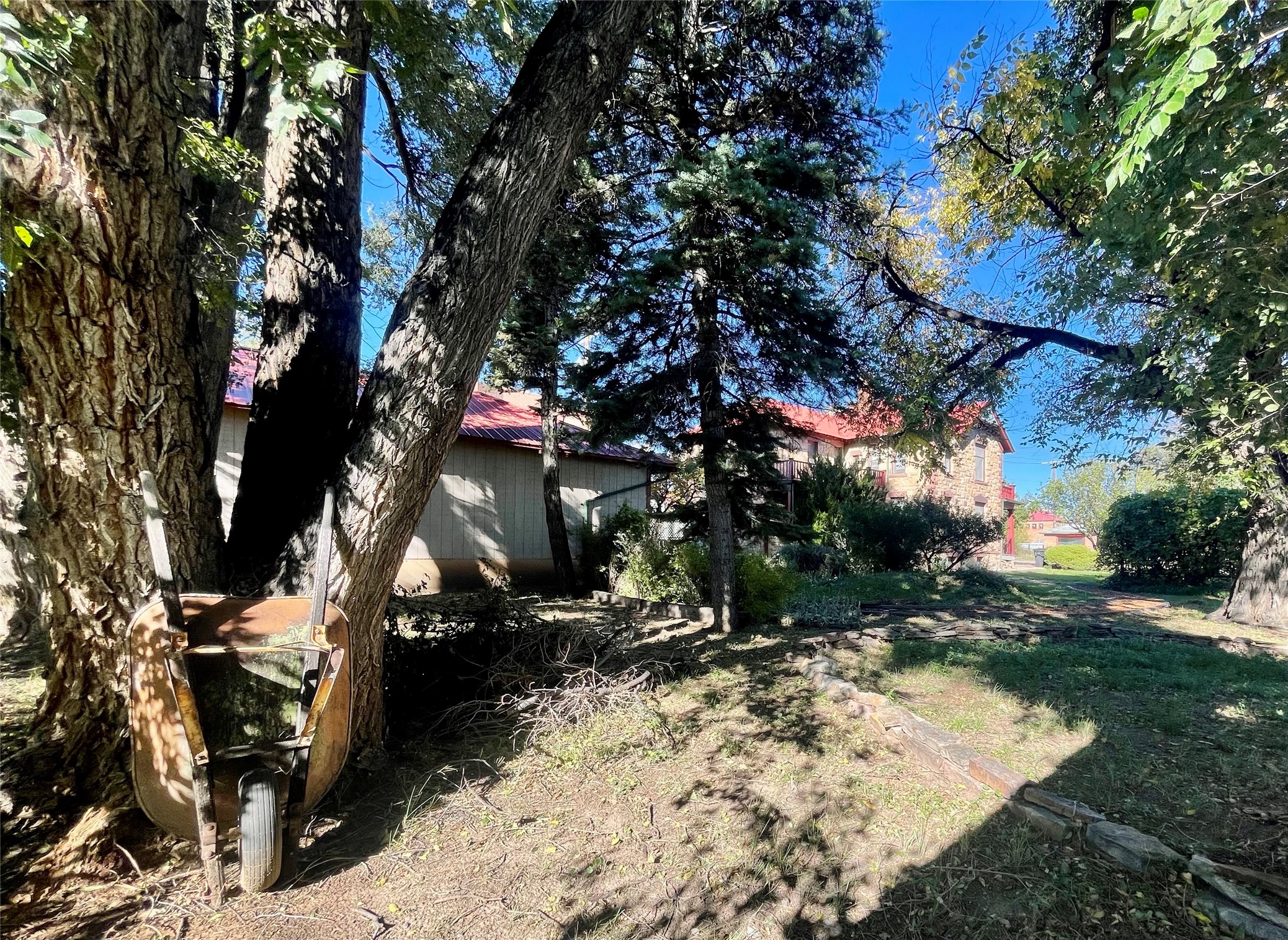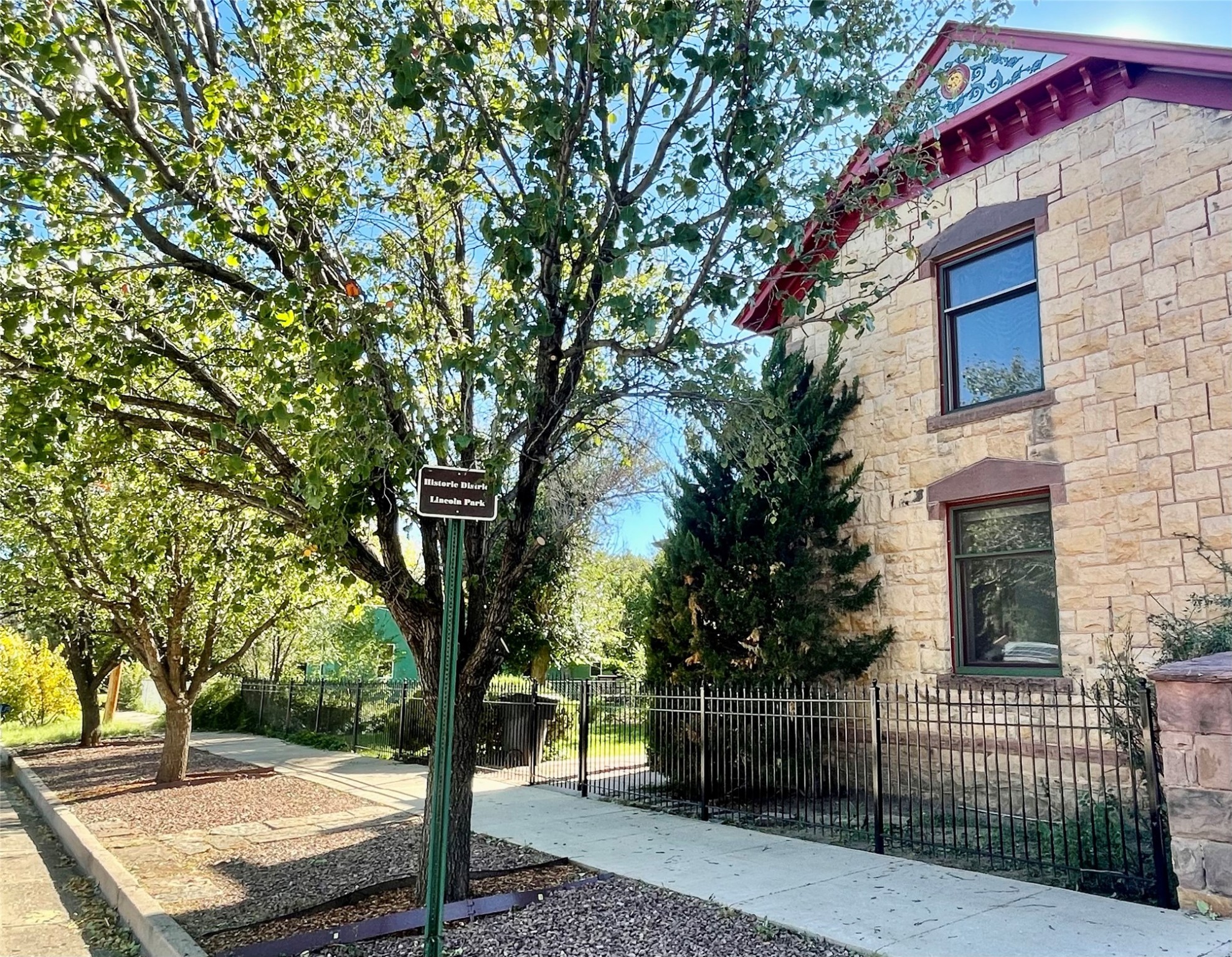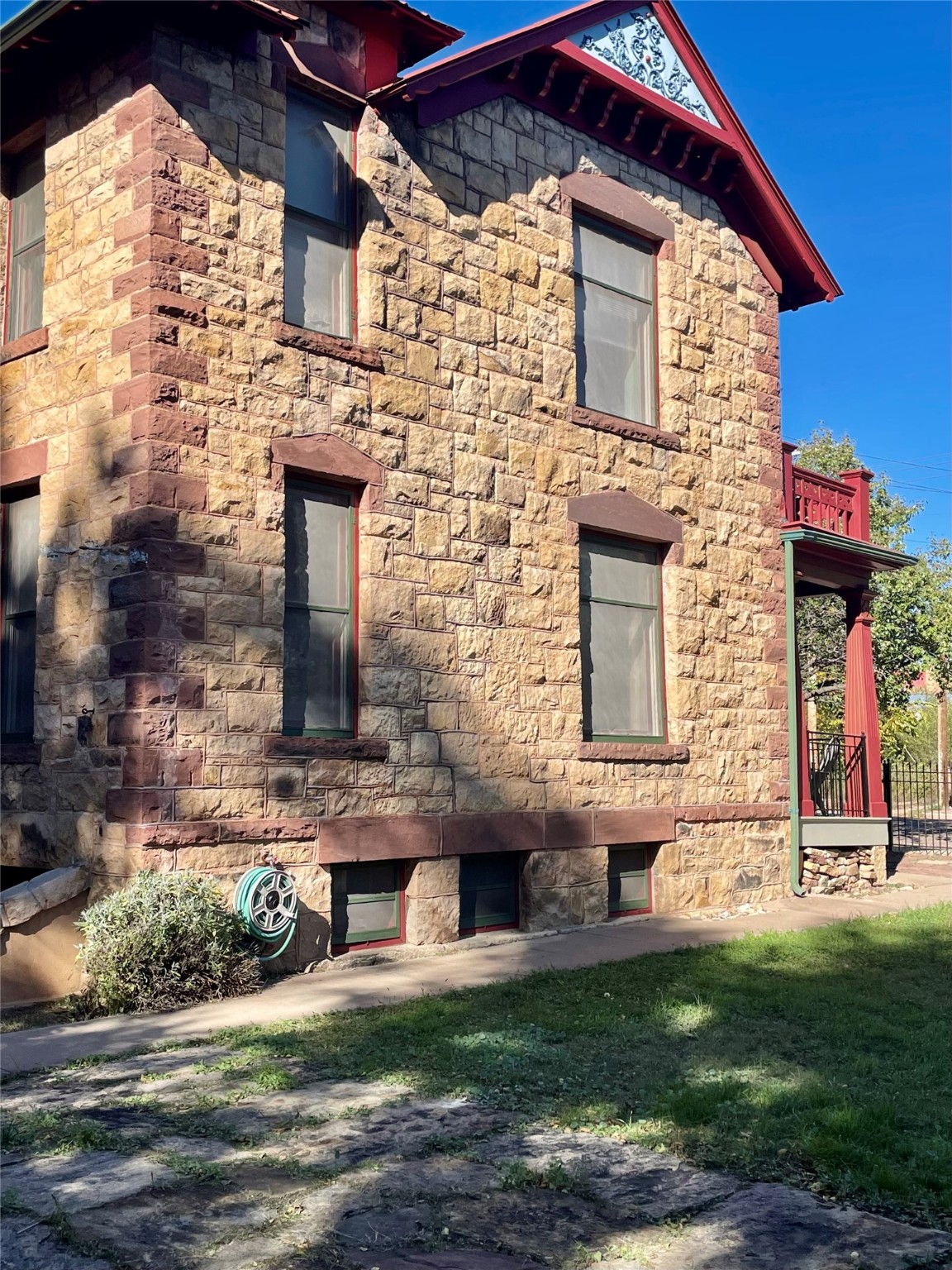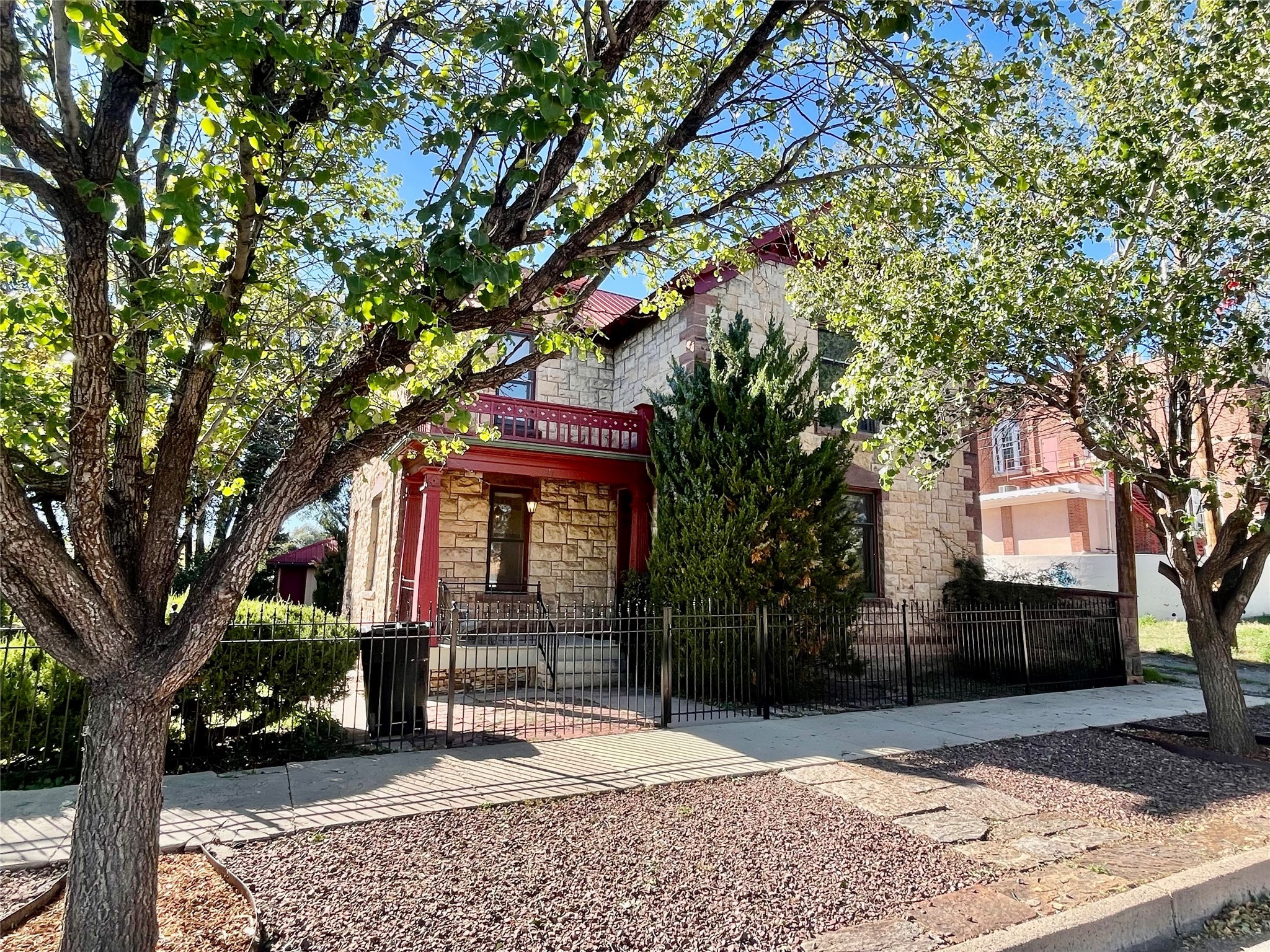 Stunning 1898 stone Queen Anne style home has a history of being the residence and office of the first female doctor in New Mexico, Dr. Alice Rice. The main part of the house has 3 bedrooms and one and a half bathrooms, with hard wood floors, built in display cabinets, transom windows, large pocket doors, a spacious living room and eat-in kitchen, as well as a little dining room/office. The downstairs bedroom has a laundry area in the closet. The attached home has a living room, large kitchen, office/den, two bedrooms, one and a half bathrooms, and was formerly the office space for Dr. Alice Rice, but was converted to an accessory dwelling unit in the 1990s when the home was completely updated, including double paned windows, new wiring, new plumbing, new insulation, and drywall. The ADU is currently rented on a month to month basis and comes complete with separate electric meter, separate water heater, and laundry in the half bathroom, Charm abounds with a truly park like yard with numerous covered porches and balconies, antique style metal fencing, covered grape trellis, many perennials, pathways, and stone patio. The basement is easily accessible and spacious. And with a Propanel roof, 3 car garage, and large alley access what more could you ask for?