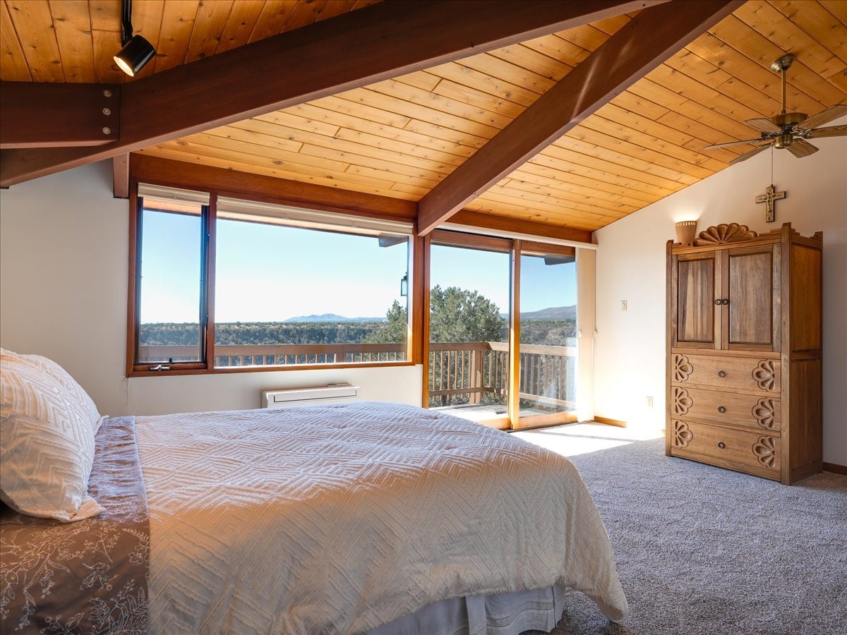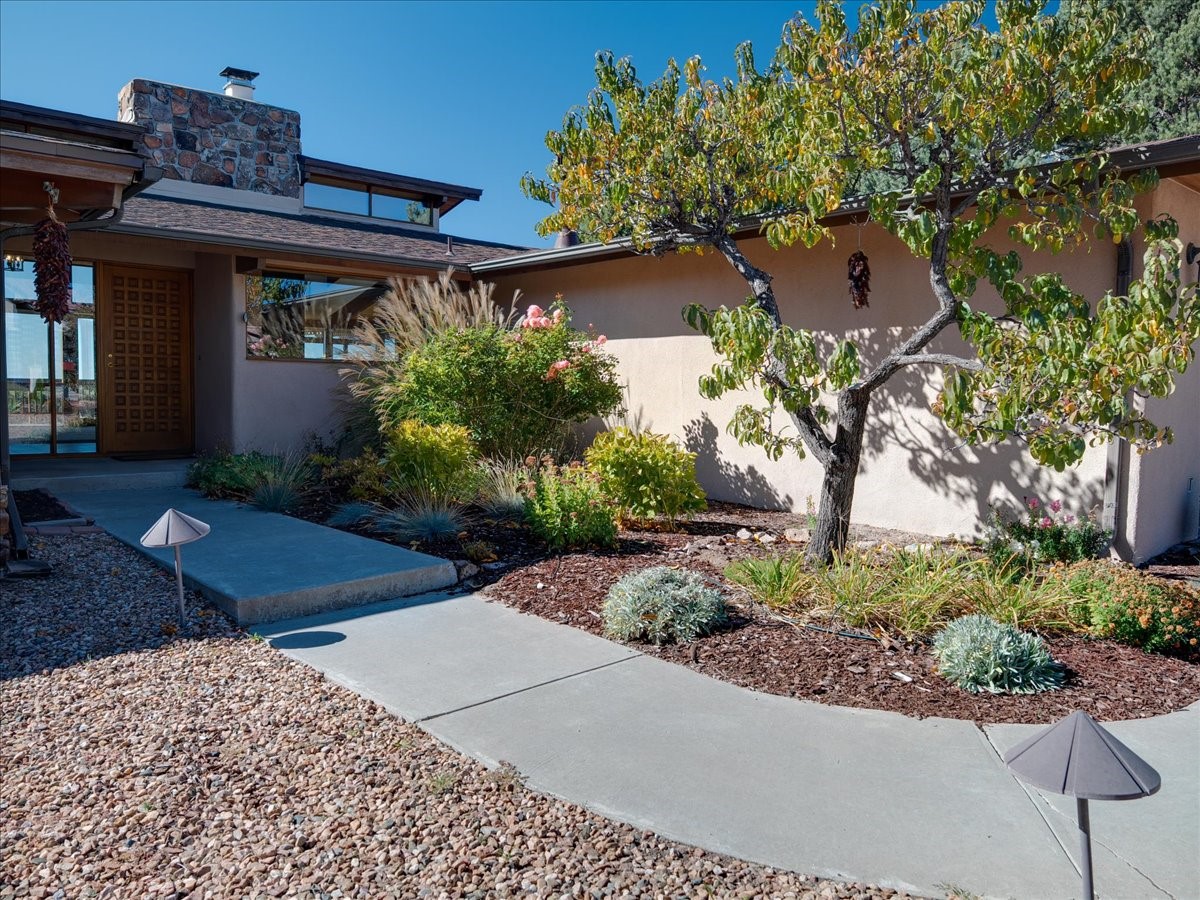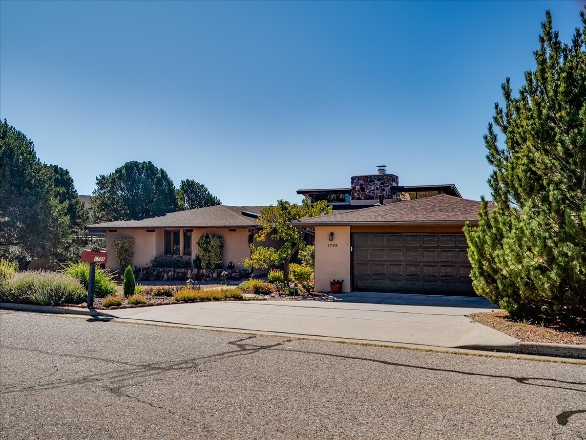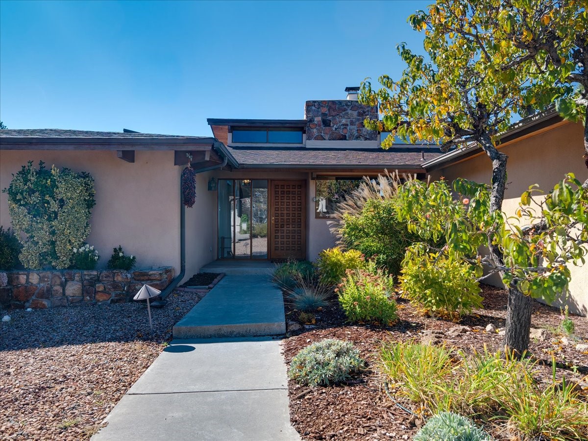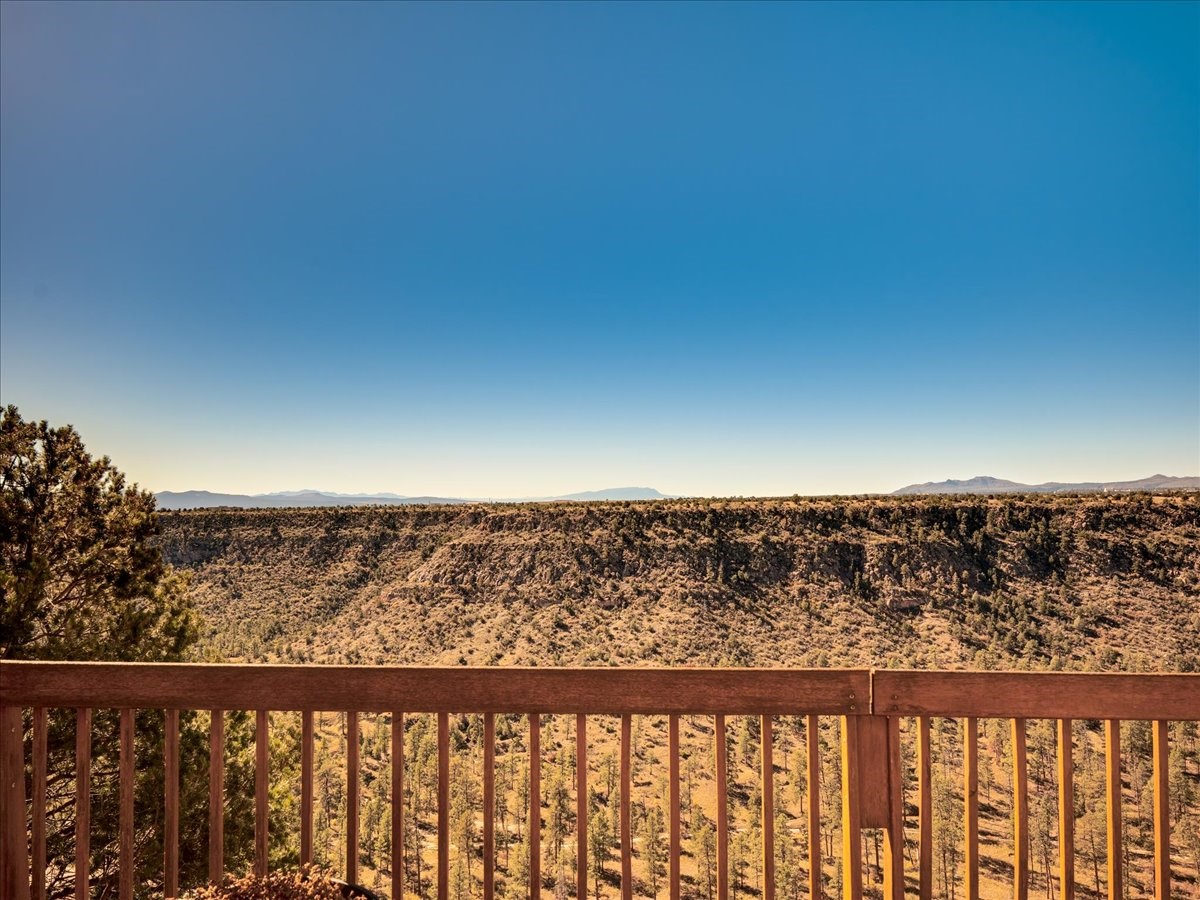 Located on prestigious Barranca Mesa, this stunning home welcomes you with immaculate landscaping and exceptional curb appeal. Inside, wood-beamed ceilings and a striking rock fireplace create a warm, natural ambiance inspired by biophilic design. Expansive picture windows frame views of Bayo Canyon. Step onto the balcony and enjoy unobstructed vistas of the Sangre de Cristo Mountains, an ideal spot for morning coffee or golden sunsets. A study or bonus room sits just off the main living area, offering flexibility for work or relaxation. The open kitchen features a large island, rich cabinetry, and abundant storage. A well-planned laundry room with additional storage and a tucked-away microwave adds to the home's thoughtful design. Wood ceilings continue through all three bedrooms, adding warmth and continuity. The sunny primary suite includes its own private balcony overlooking Bayo Canyon, a spacious walk-in closet, and a spa-like bathroom with Saltillo tile flooring. Two additional bedrooms, a full guest bath, and a powder room complete the floor plan. Enjoy year-round comfort with in-floor radiant heat and air conditioning. Picture cozy winter evenings by the fireplace as snow falls across the canyon, or quiet summer nights watching the sun dip behind the mountains. This is Mesa living at its best. Schedule a private showing today.