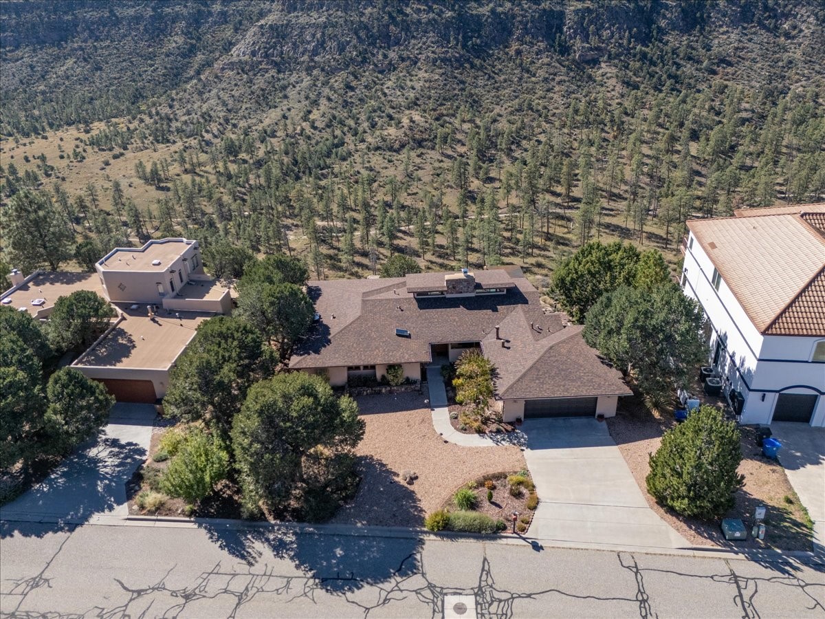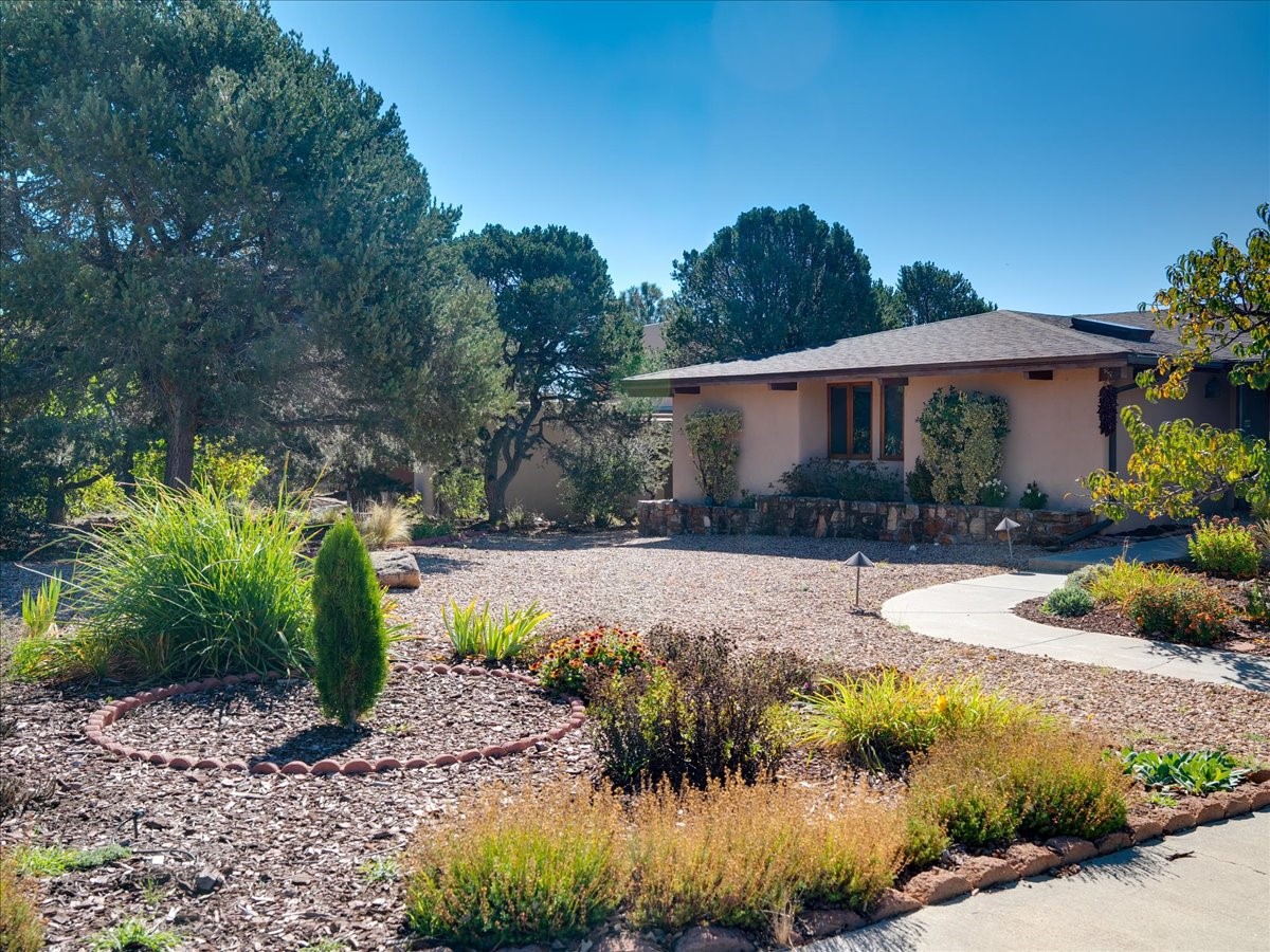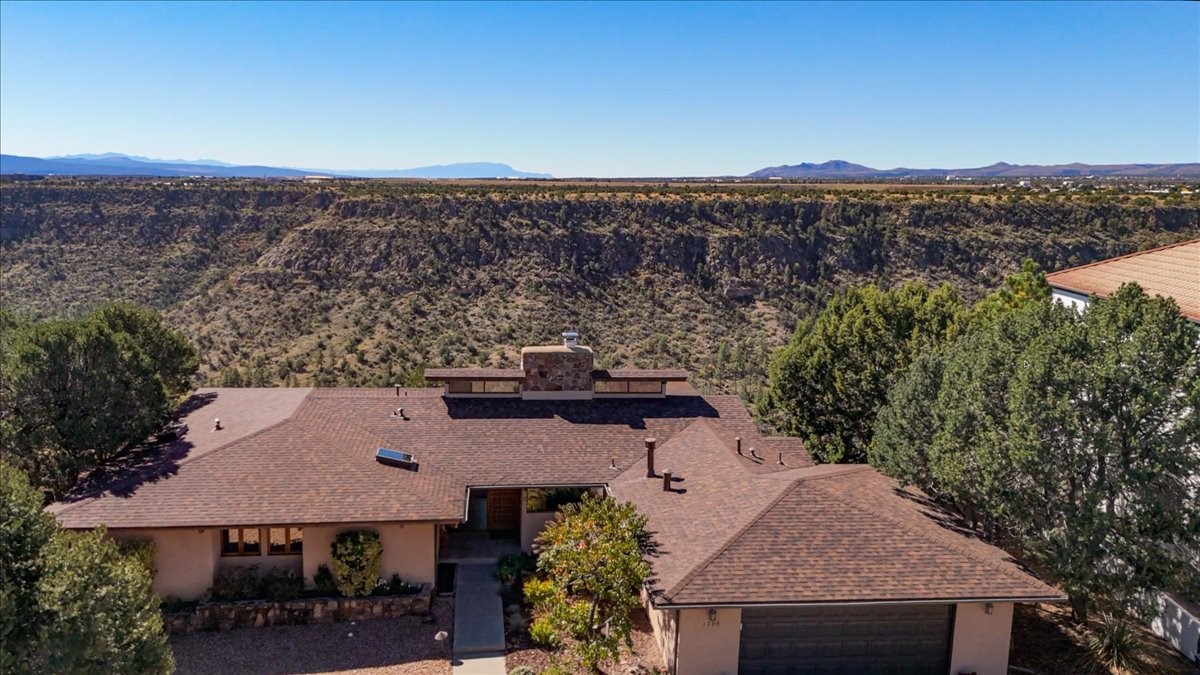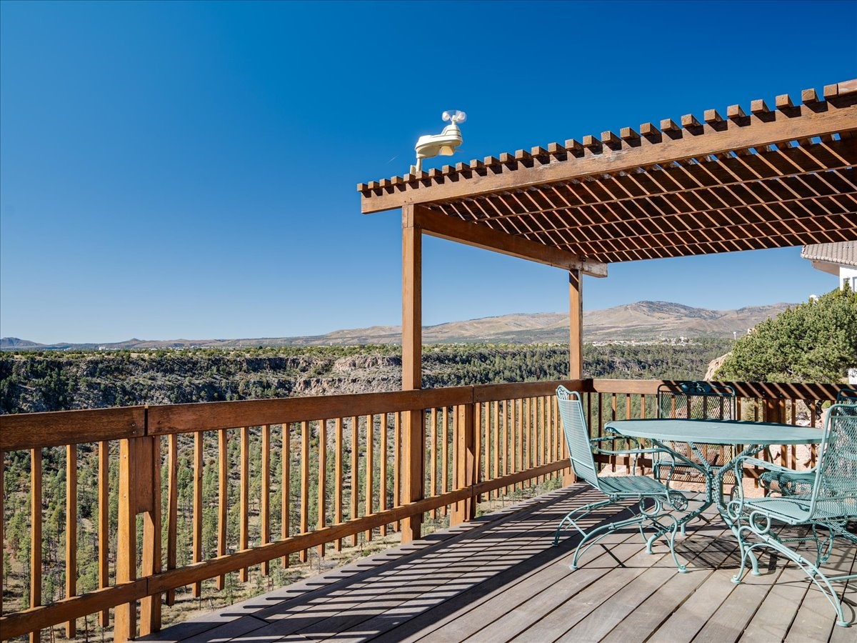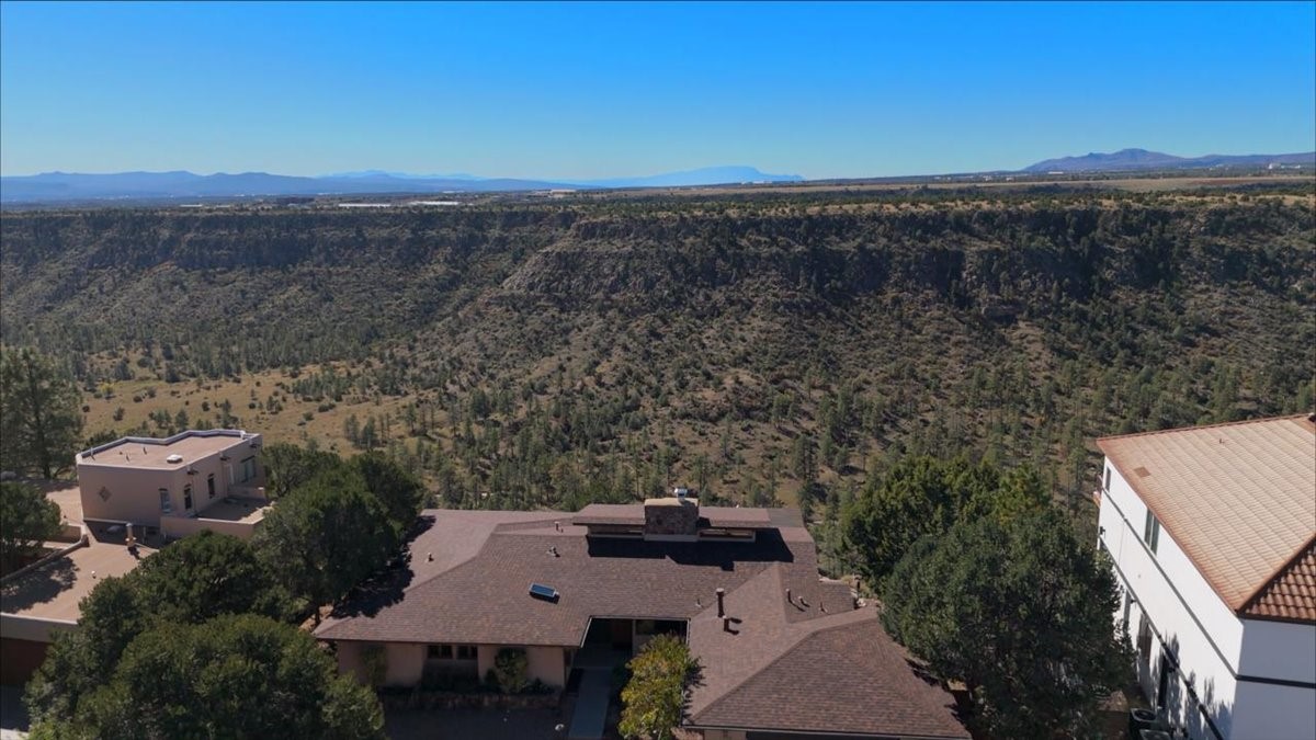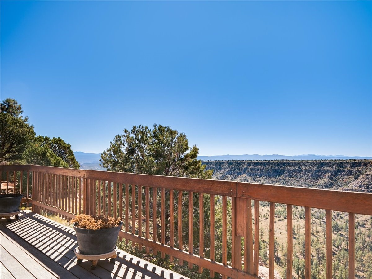 Located on prestigious Barranca Mesa, this stunning home welcomes you with immaculate landscaping and exceptional curb appeal. Inside, wood-beamed ceilings and a striking rock fireplace create a warm, natural ambiance inspired by biophilic design. Expansive picture windows frame views of Bayo Canyon. Step onto the balcony and enjoy unobstructed vistas of the Sangre de Cristo Mountains, an ideal spot for morning coffee or golden sunsets. A study or bonus room sits just off the main living area, offering flexibility for work or relaxation. The open kitchen features a large island, rich cabinetry, and abundant storage. A well-planned laundry room with additional storage and a tucked-away microwave adds to the home's thoughtful design. Wood ceilings continue through all three bedrooms, adding warmth and continuity. The sunny primary suite includes its own private balcony overlooking Bayo Canyon, a spacious walk-in closet, and a spa-like bathroom with Saltillo tile flooring. Two additional bedrooms, a full guest bath, and a powder room complete the floor plan. Enjoy year-round comfort with in-floor radiant heat and air conditioning. Picture cozy winter evenings by the fireplace as snow falls across the canyon, or quiet summer nights watching the sun dip behind the mountains. This is Mesa living at its best. Schedule a private showing today.