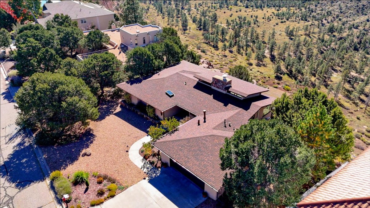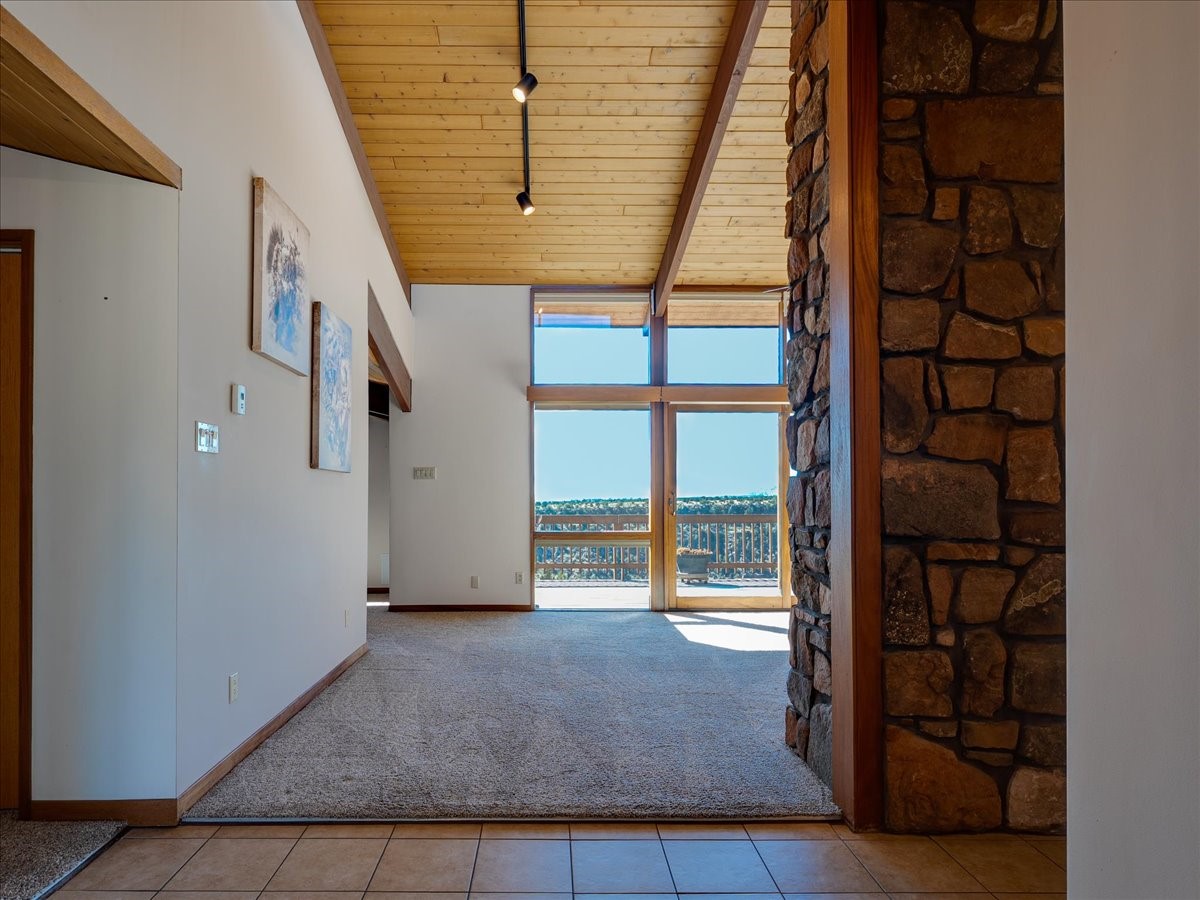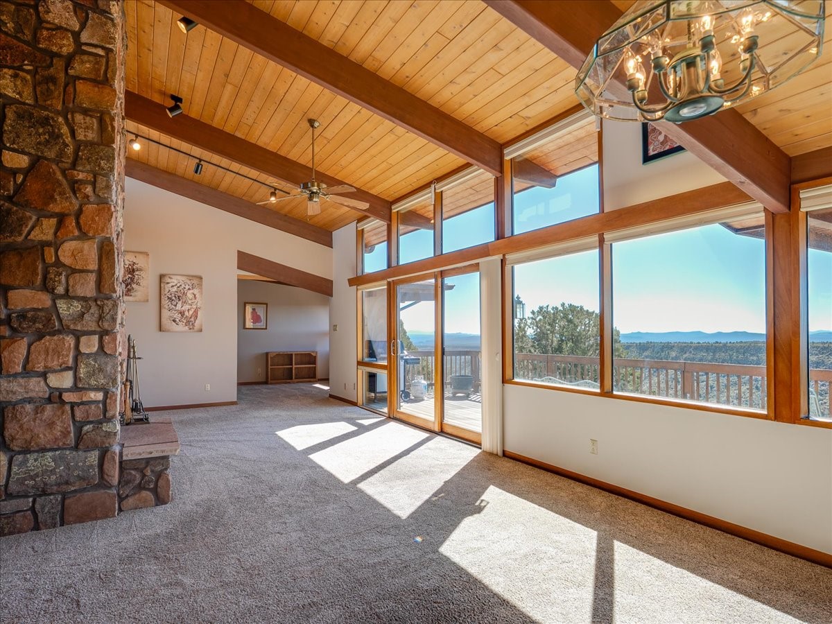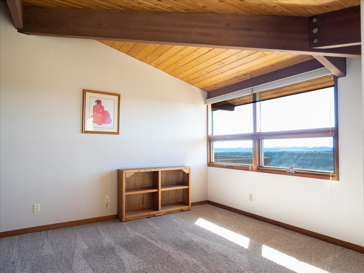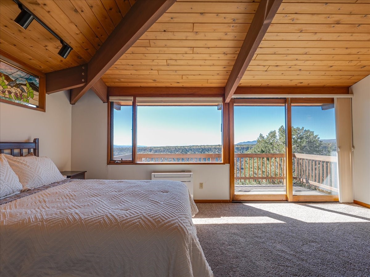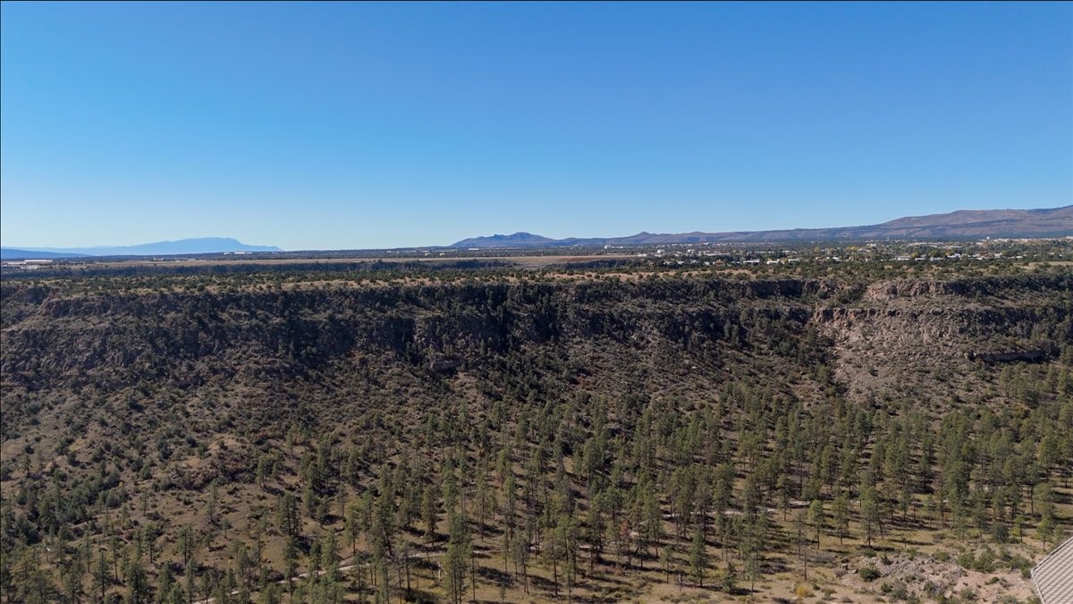 Located on prestigious Barranca Mesa, this stunning home welcomes you with immaculate landscaping and exceptional curb appeal. Inside, wood-beamed ceilings and a striking rock fireplace create a warm, natural ambiance inspired by biophilic design. Expansive picture windows frame views of Bayo Canyon. Step onto the balcony and enjoy unobstructed vistas of the Sangre de Cristo Mountains, an ideal spot for morning coffee or golden sunsets. A study or bonus room sits just off the main living area, offering flexibility for work or relaxation. The open kitchen features a large island, rich cabinetry, and abundant storage. A well-planned laundry room with additional storage and a tucked-away microwave adds to the home's thoughtful design. Wood ceilings continue through all three bedrooms, adding warmth and continuity. The sunny primary suite includes its own private balcony overlooking Bayo Canyon, a spacious walk-in closet, and a spa-like bathroom with Saltillo tile flooring. Two additional bedrooms, a full guest bath, and a powder room complete the floor plan. Enjoy year-round comfort with in-floor radiant heat and air conditioning. Picture cozy winter evenings by the fireplace as snow falls across the canyon, or quiet summer nights watching the sun dip behind the mountains. This is Mesa living at its best. Schedule a private showing today.