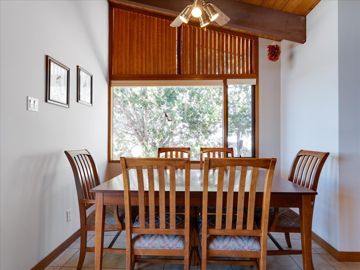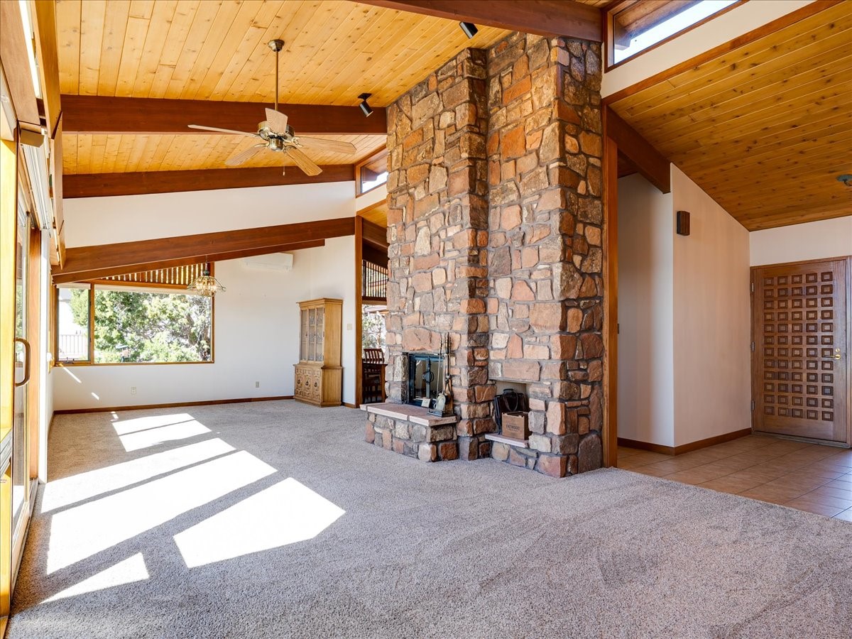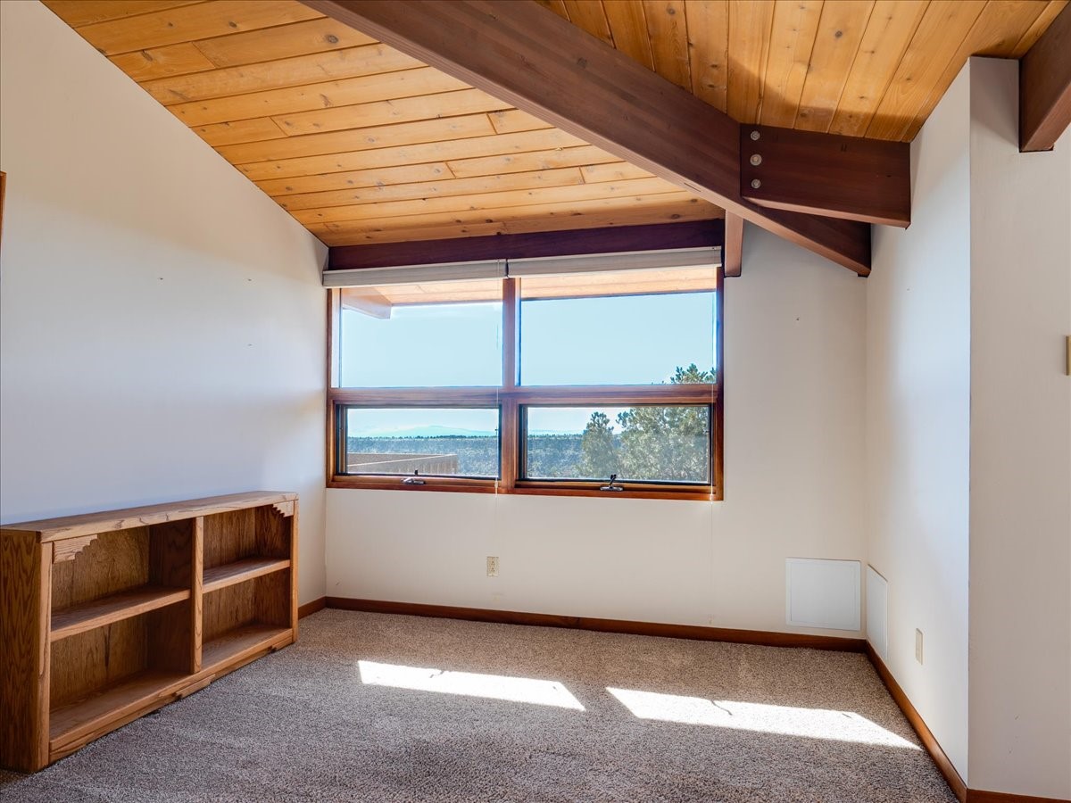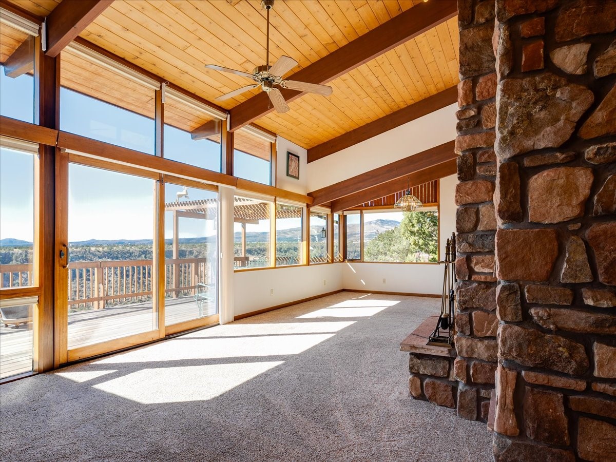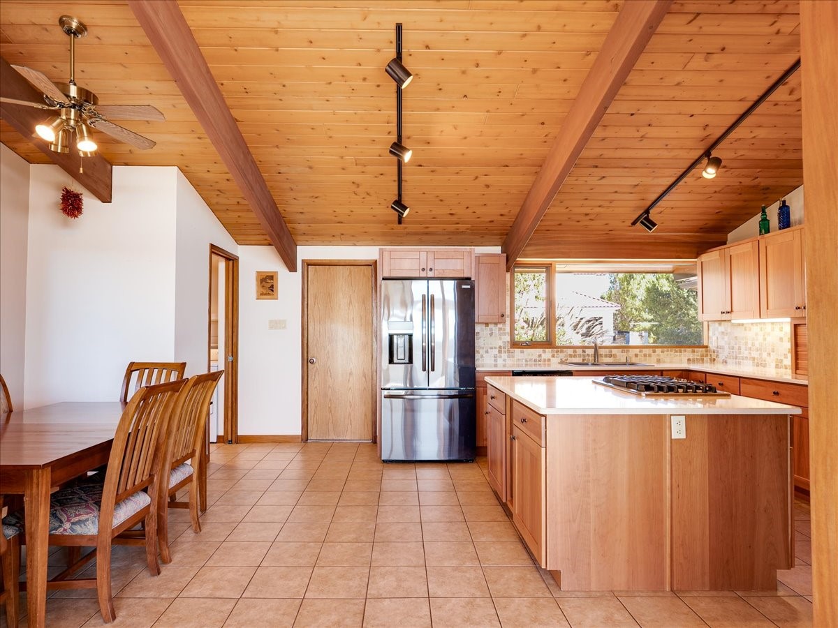 Located on prestigious Barranca Mesa, this stunning home welcomes you with immaculate landscaping and exceptional curb appeal. Inside, wood-beamed ceilings and a striking rock fireplace create a warm, natural ambiance inspired by biophilic design. Expansive picture windows frame views of Bayo Canyon. Step onto the balcony and enjoy unobstructed vistas of the Sangre de Cristo Mountains, an ideal spot for morning coffee or golden sunsets. A study or bonus room sits just off the main living area, offering flexibility for work or relaxation. The open kitchen features a large island, rich cabinetry, and abundant storage. A well-planned laundry room with additional storage and a tucked-away microwave adds to the home's thoughtful design. Wood ceilings continue through all three bedrooms, adding warmth and continuity. The sunny primary suite includes its own private balcony overlooking Bayo Canyon, a spacious walk-in closet, and a spa-like bathroom with Saltillo tile flooring. Two additional bedrooms, a full guest bath, and a powder room complete the floor plan. Enjoy year-round comfort with in-floor radiant heat and air conditioning. Picture cozy winter evenings by the fireplace as snow falls across the canyon, or quiet summer nights watching the sun dip behind the mountains. This is Mesa living at its best. Schedule a private showing today.