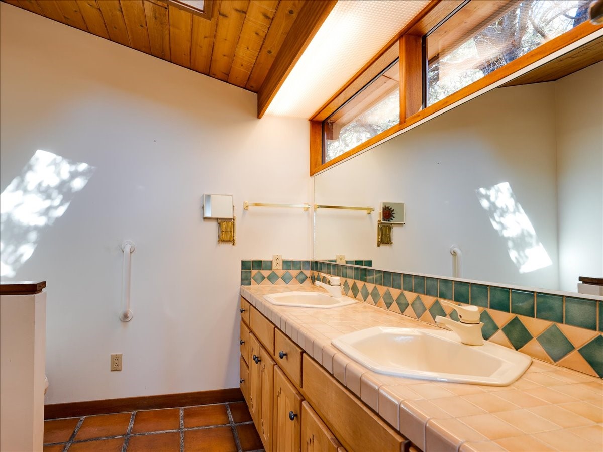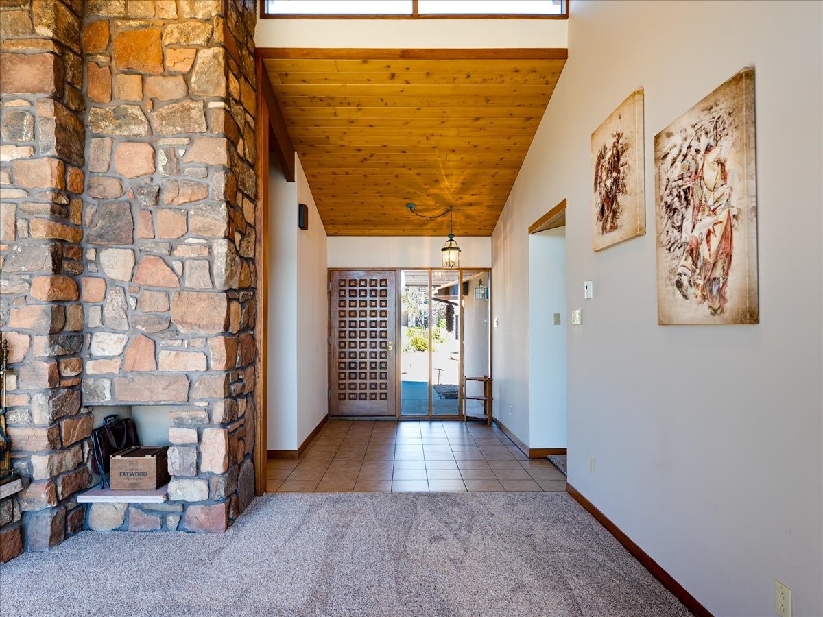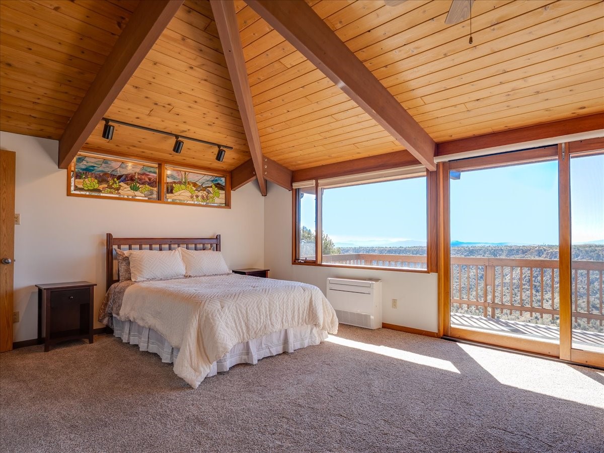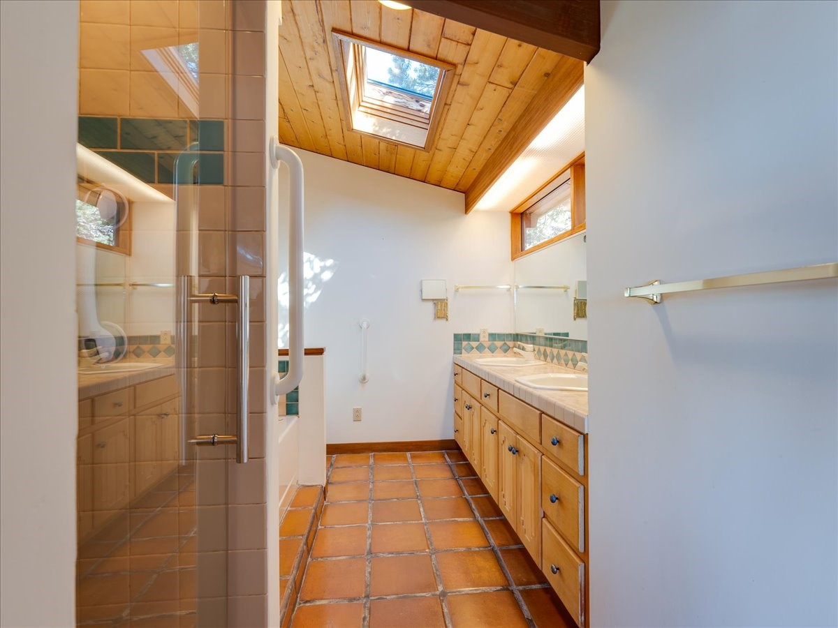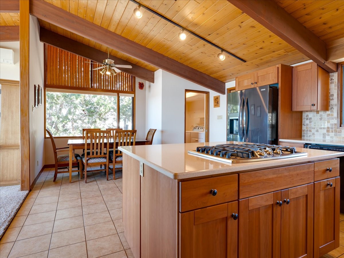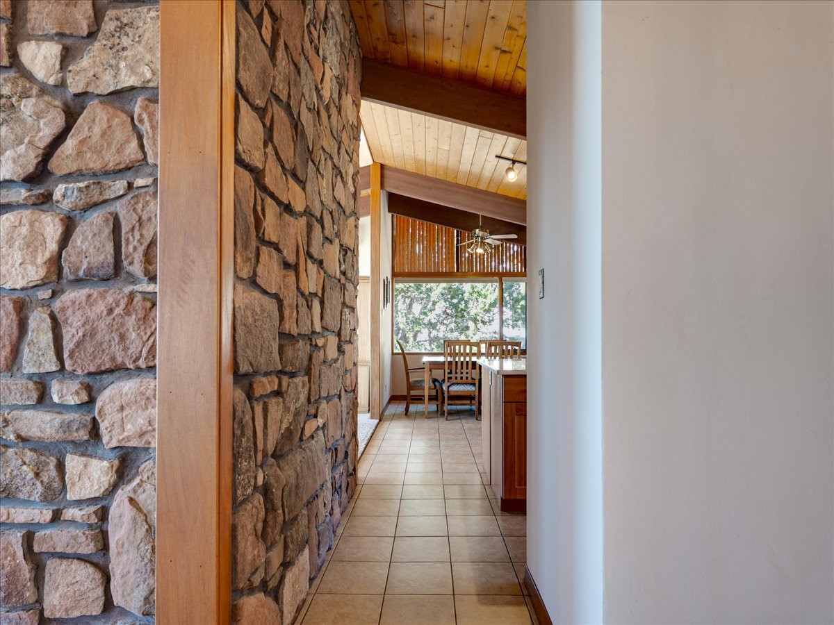 Located on prestigious Barranca Mesa, this stunning home welcomes you with immaculate landscaping and exceptional curb appeal. Inside, wood-beamed ceilings and a striking rock fireplace create a warm, natural ambiance inspired by biophilic design. Expansive picture windows frame views of Bayo Canyon. Step onto the balcony and enjoy unobstructed vistas of the Sangre de Cristo Mountains, an ideal spot for morning coffee or golden sunsets. A study or bonus room sits just off the main living area, offering flexibility for work or relaxation. The open kitchen features a large island, rich cabinetry, and abundant storage. A well-planned laundry room with additional storage and a tucked-away microwave adds to the home's thoughtful design. Wood ceilings continue through all three bedrooms, adding warmth and continuity. The sunny primary suite includes its own private balcony overlooking Bayo Canyon, a spacious walk-in closet, and a spa-like bathroom with Saltillo tile flooring. Two additional bedrooms, a full guest bath, and a powder room complete the floor plan. Enjoy year-round comfort with in-floor radiant heat and air conditioning. Picture cozy winter evenings by the fireplace as snow falls across the canyon, or quiet summer nights watching the sun dip behind the mountains. This is Mesa living at its best. Schedule a private showing today.