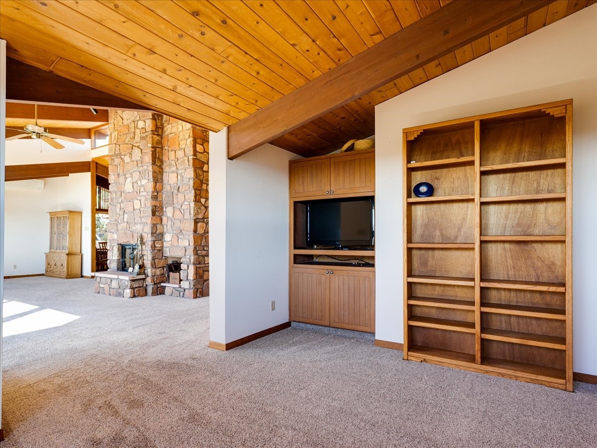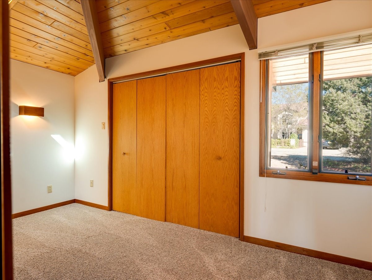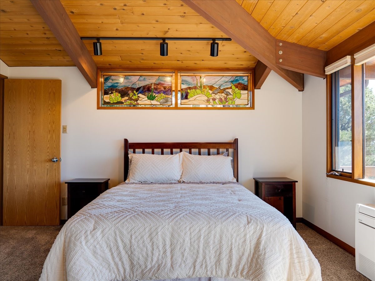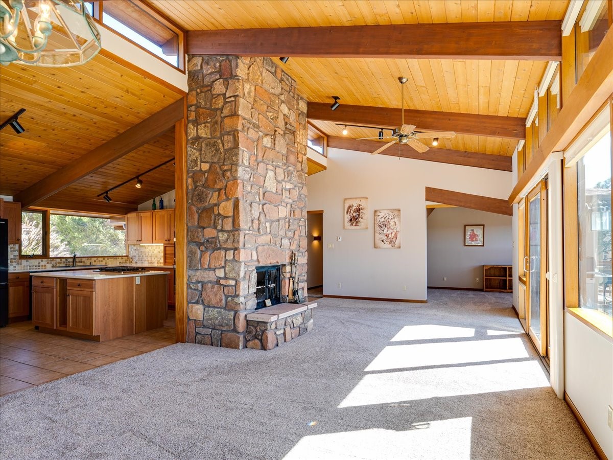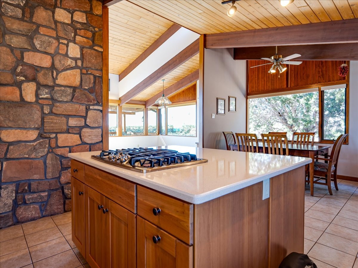 Located on prestigious Barranca Mesa, this stunning home welcomes you with immaculate landscaping and exceptional curb appeal. Inside, wood-beamed ceilings and a striking rock fireplace create a warm, natural ambiance inspired by biophilic design. Expansive picture windows frame views of Bayo Canyon. Step onto the balcony and enjoy unobstructed vistas of the Sangre de Cristo Mountains, an ideal spot for morning coffee or golden sunsets. A study or bonus room sits just off the main living area, offering flexibility for work or relaxation. The open kitchen features a large island, rich cabinetry, and abundant storage. A well-planned laundry room with additional storage and a tucked-away microwave adds to the home's thoughtful design. Wood ceilings continue through all three bedrooms, adding warmth and continuity. The sunny primary suite includes its own private balcony overlooking Bayo Canyon, a spacious walk-in closet, and a spa-like bathroom with Saltillo tile flooring. Two additional bedrooms, a full guest bath, and a powder room complete the floor plan. Enjoy year-round comfort with in-floor radiant heat and air conditioning. Picture cozy winter evenings by the fireplace as snow falls across the canyon, or quiet summer nights watching the sun dip behind the mountains. This is Mesa living at its best. Schedule a private showing today.