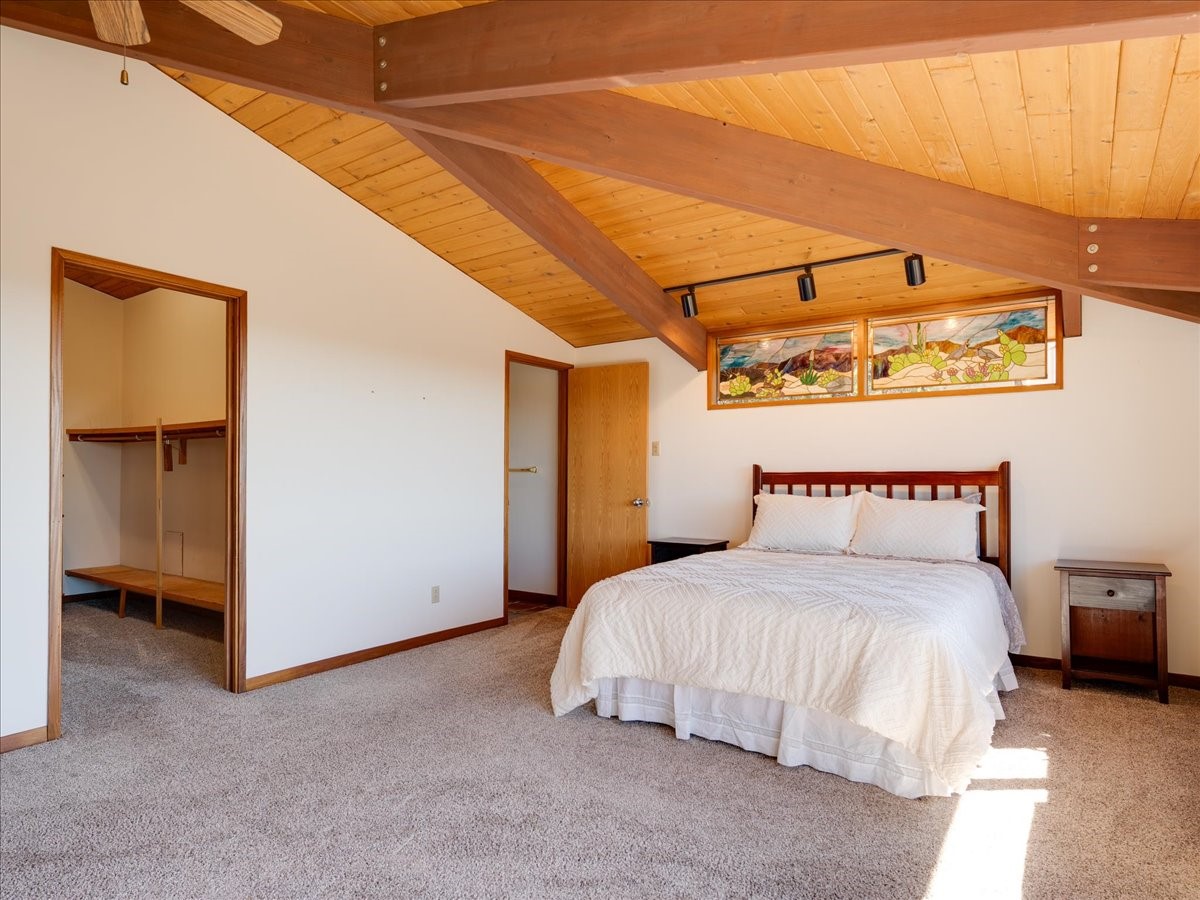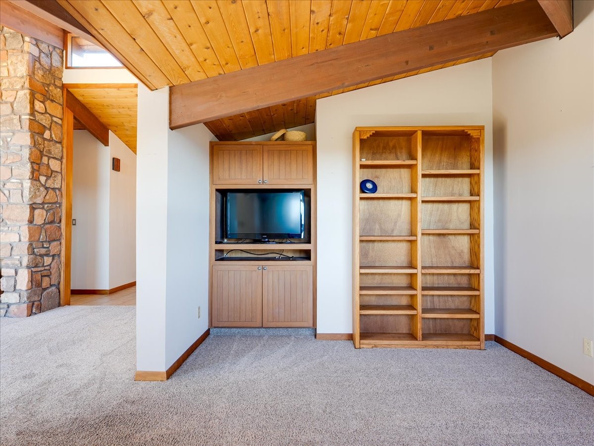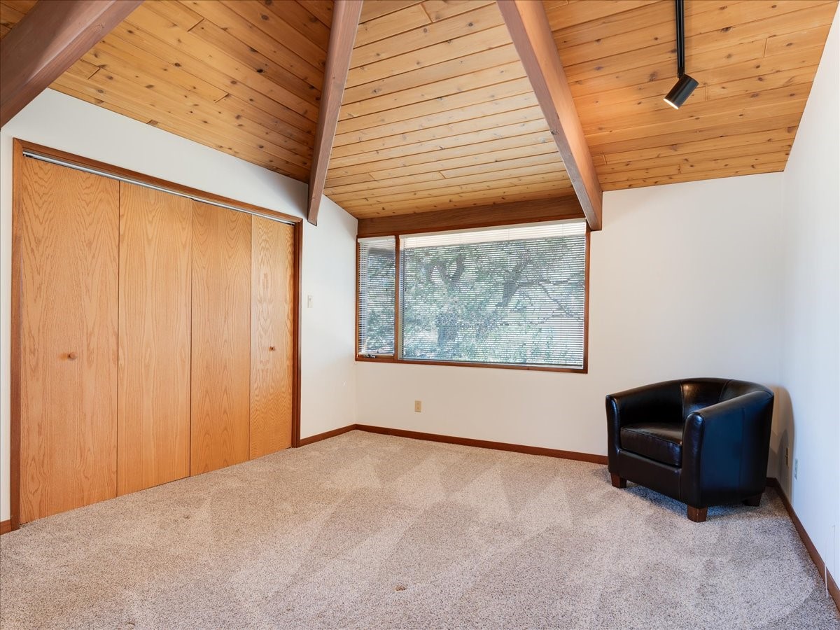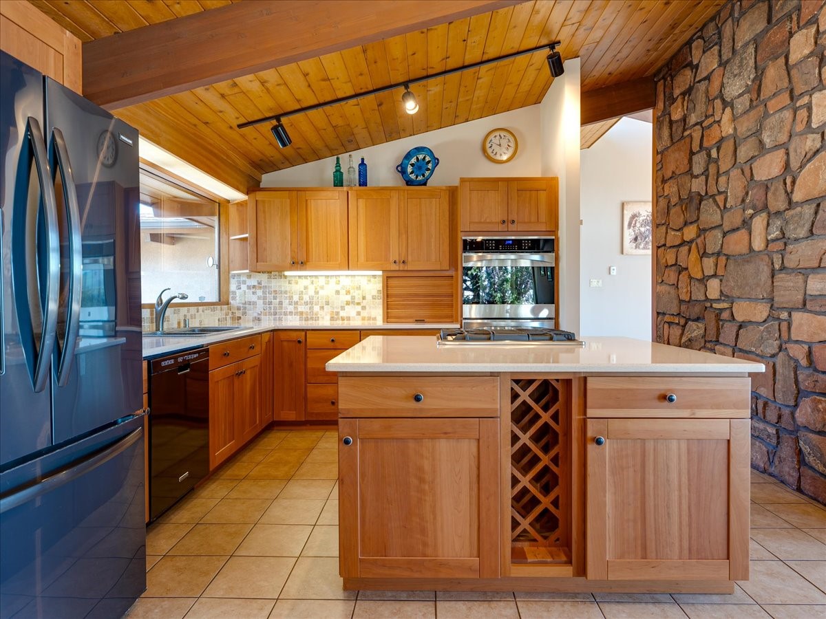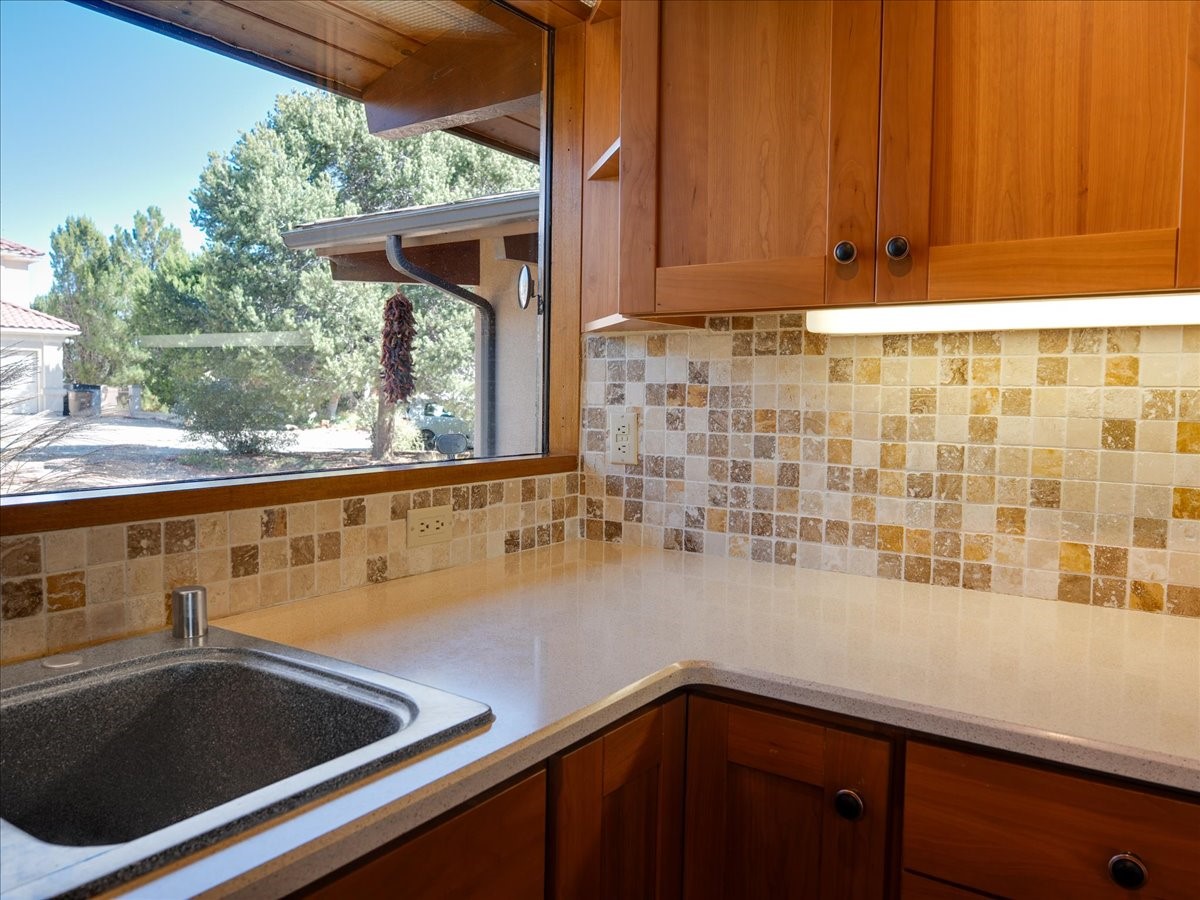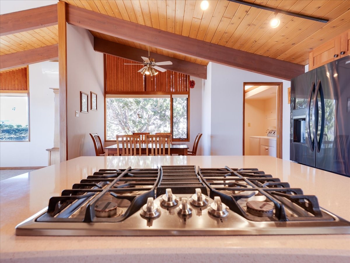 Located on prestigious Barranca Mesa, this stunning home welcomes you with immaculate landscaping and exceptional curb appeal. Inside, wood-beamed ceilings and a striking rock fireplace create a warm, natural ambiance inspired by biophilic design. Expansive picture windows frame views of Bayo Canyon. Step onto the balcony and enjoy unobstructed vistas of the Sangre de Cristo Mountains, an ideal spot for morning coffee or golden sunsets. A study or bonus room sits just off the main living area, offering flexibility for work or relaxation. The open kitchen features a large island, rich cabinetry, and abundant storage. A well-planned laundry room with additional storage and a tucked-away microwave adds to the home's thoughtful design. Wood ceilings continue through all three bedrooms, adding warmth and continuity. The sunny primary suite includes its own private balcony overlooking Bayo Canyon, a spacious walk-in closet, and a spa-like bathroom with Saltillo tile flooring. Two additional bedrooms, a full guest bath, and a powder room complete the floor plan. Enjoy year-round comfort with in-floor radiant heat and air conditioning. Picture cozy winter evenings by the fireplace as snow falls across the canyon, or quiet summer nights watching the sun dip behind the mountains. This is Mesa living at its best. Schedule a private showing today.