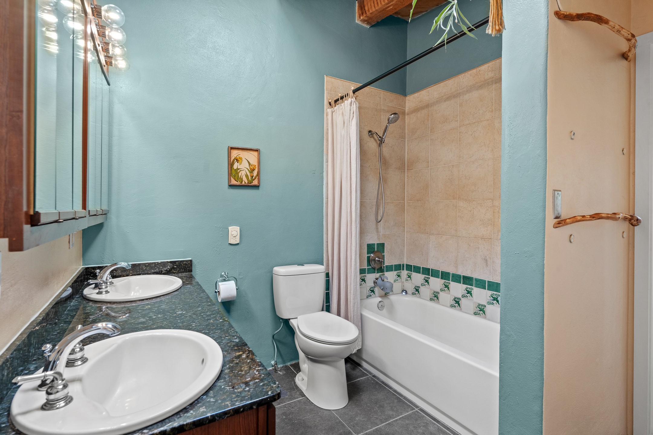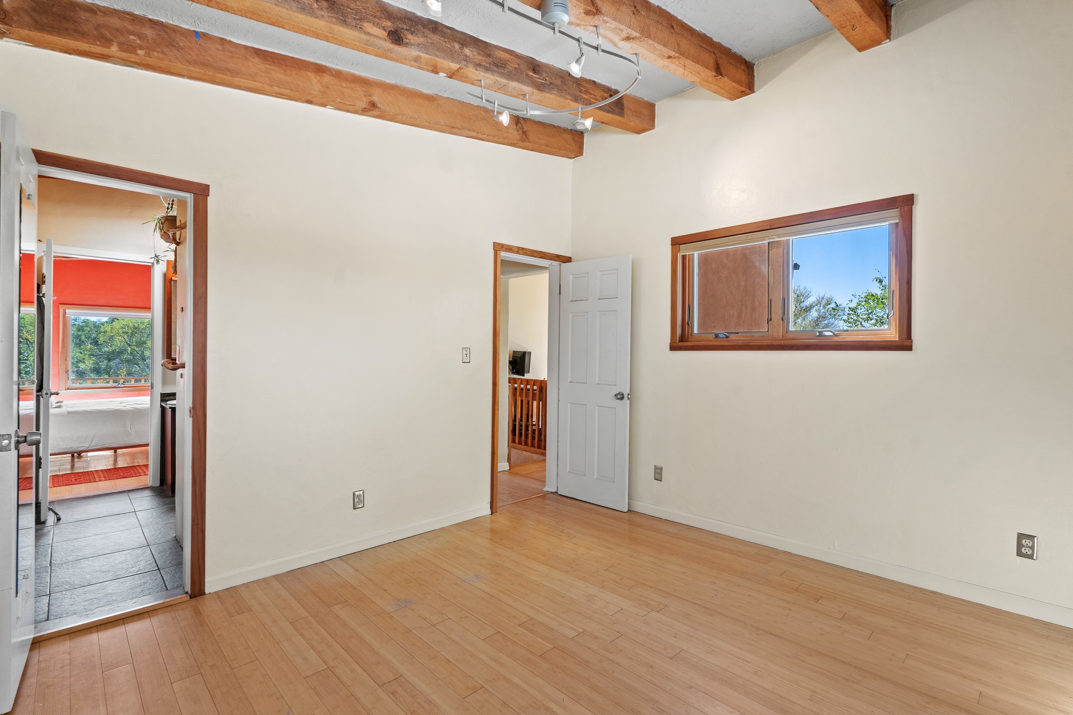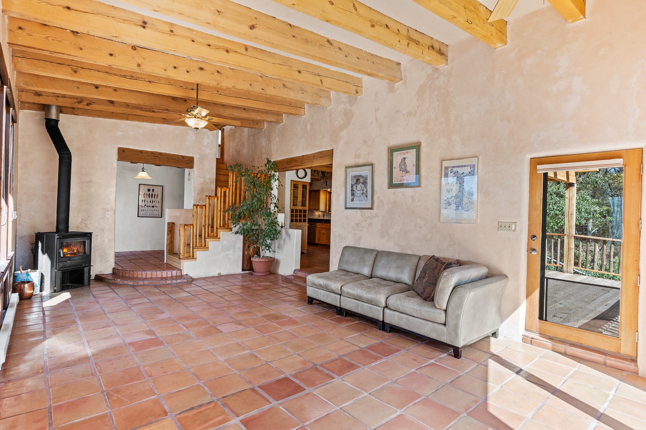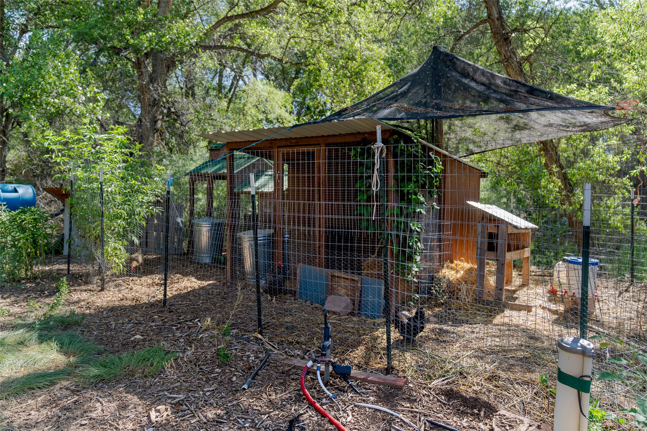 High desert permaculture oasis! 3-bedroom, 2-bath, 3066 square foot home, with large bonus room with it's own entry that could serve as studio, office, or another bedroom, nestled in towering cottonwoods on three lots totaling almost 18 acres along the lower Arroyo Hondo, with an intermittent spring and a year-round pond. This working permaculture farm produces nursery stock and landscaping plants, as well as generous amounts of food for family and friends, with a chicken coop, two 360 sq. ft. hoop houses and roughly 8/10ths of an acre in cultivation, including gardens and fruit trees. Set up for energy efficiency, with owned solar panels, a greenhouse attached to the house for ample solar gain, rainwater catchment, the house provides year round comfort. Inside, the main living area features high beamed ceilings and plaster walls, a cozy high-efficiency wood stove, and Saltillo tile. The kitchen features stainless steel appliances, the bathrooms have been recently updated, and the primary suite opens to a second story deck to take it all in. Sellers have done substantial recent work to decks, stucco, windows and roof. All of this less than three miles from city limits and a quarter mile from Ojo Santa Fe.