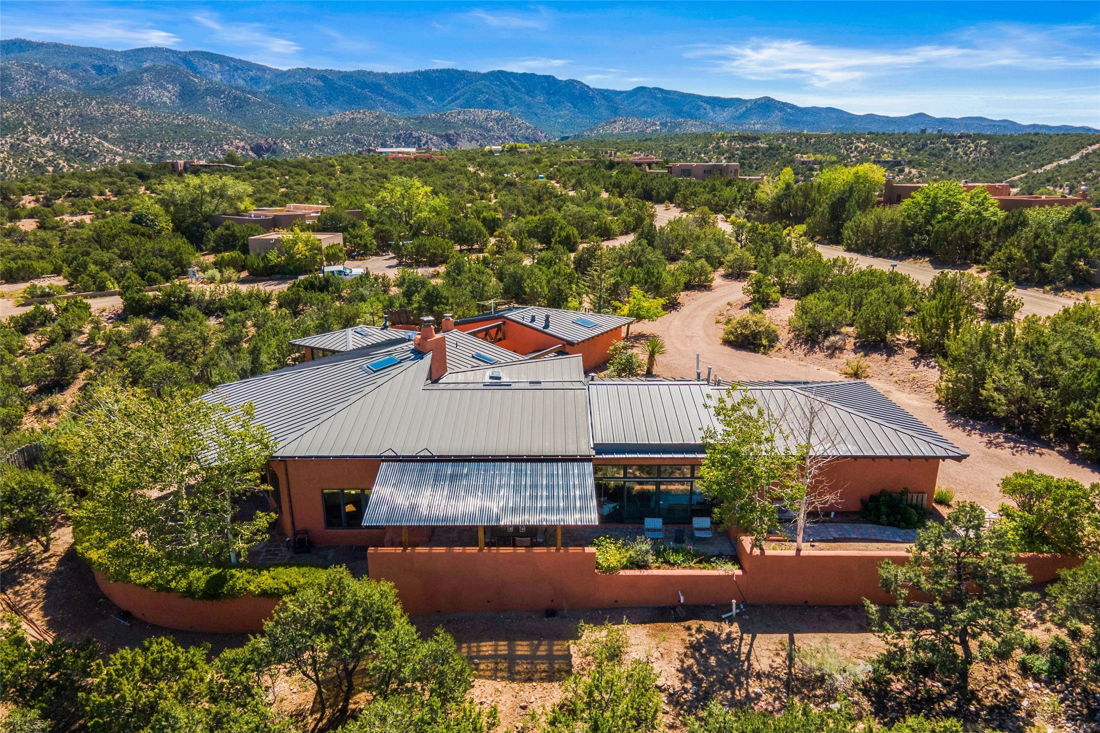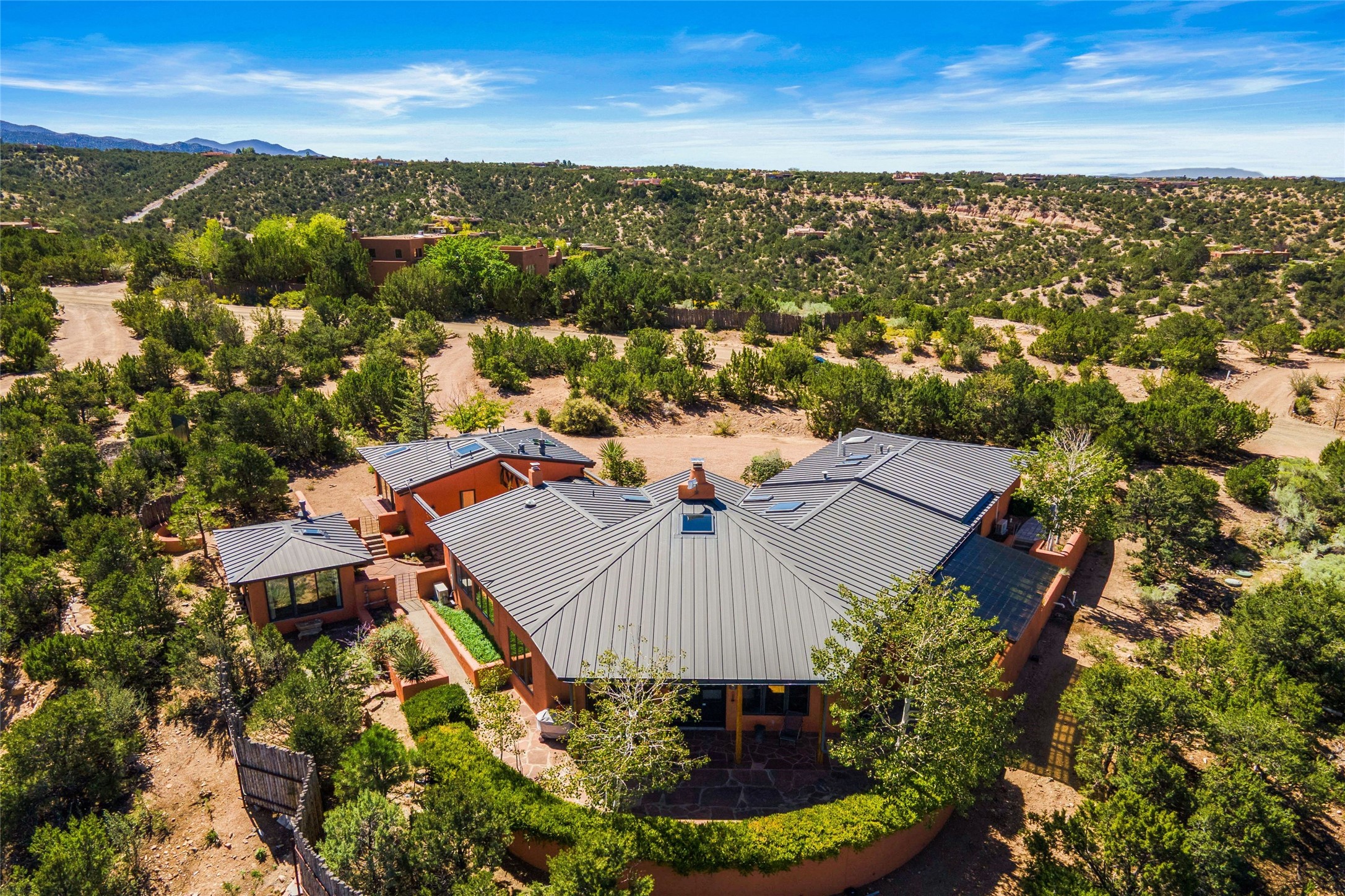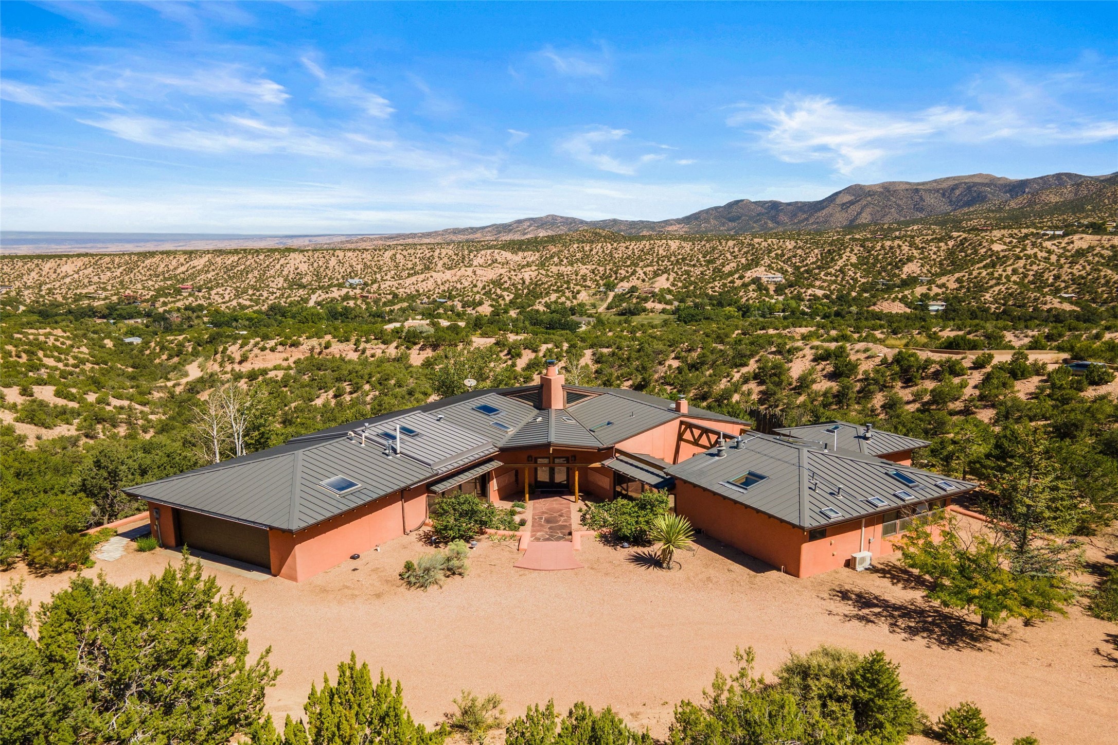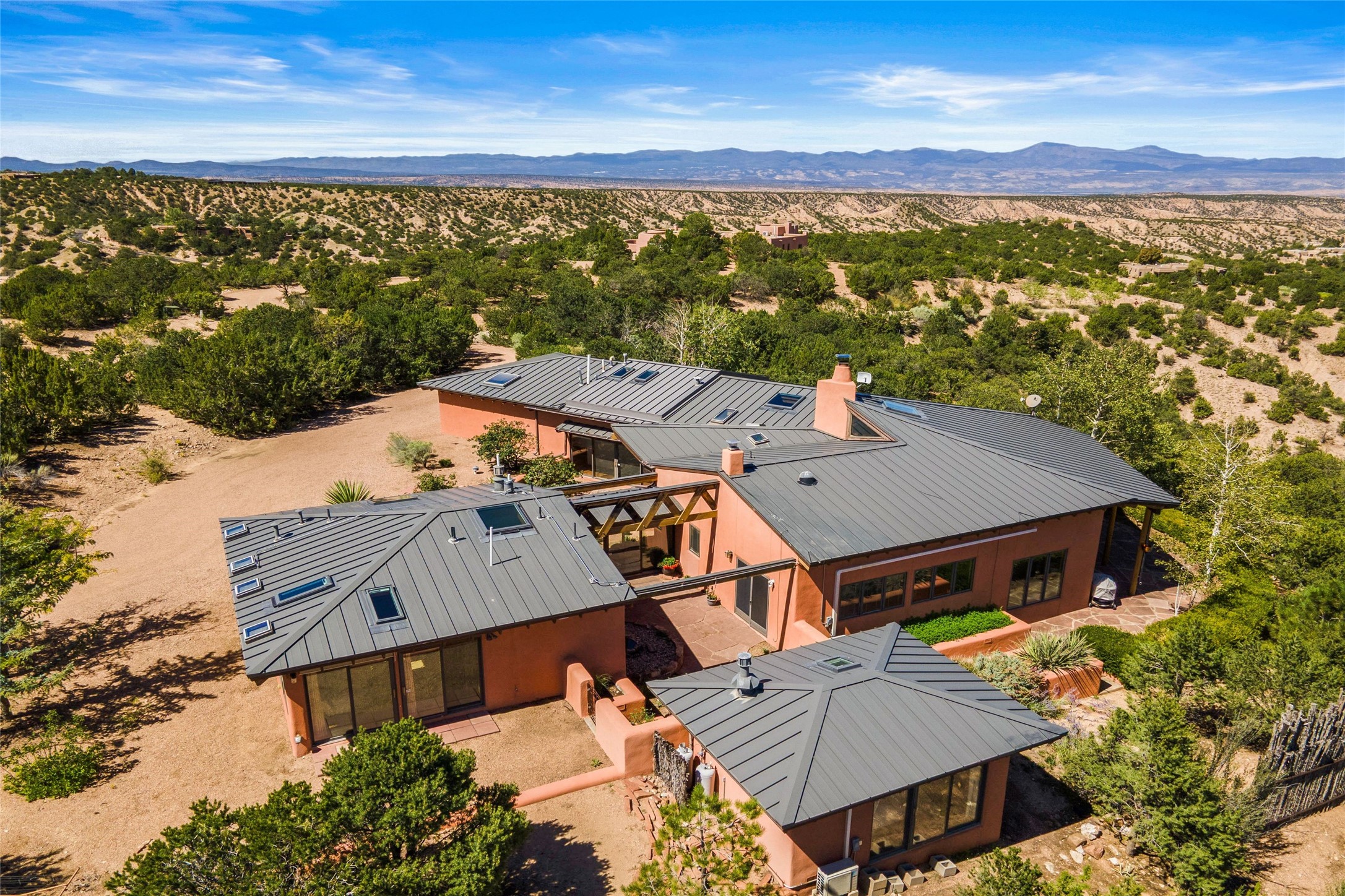 Stunning 3-bedroom, 3.5-bath home in Vista Redonda professionally sited on 5 ridge-top acres of pion trees and breathtaking views of the Sangre de Cristo and Jemez Mountains. Constructed by renowned builder Dennis Sayer, this residence showcases exceptional workmanship and reflective design. The pitched roof and soaring beamed ceilings create an airy, inviting atmosphere, while the hard plaster walls and polished Saltillo tiles add timeless elegance. Upon entering, you'll find a spacious great room that flows into a dining area and a well-appointed eat-in kitchen. The office, complete with built-in desk and bookcases, provides a quiet retreat, while the kiva fireplace adds warmth and character to the space. The home features two en-suite bedrooms in each wing, ensuring privacy and comfort for guests.. In addition, there is a detached 196 sq. ft. studio/casita. Multiple outdoor areas invite you to enjoy al fresco dining and entertaining, including a delightful sunrise breakfast patio where you can soak in the morning sun with a cup of coffee. Natural light floods the home through plentiful skylights, windows, and glass doors, begetting a bright and welcoming environment. Additional highlights include a heated 2-car garage and newer boiler and water heaters. Just south of Vista Redonda is the Village of Tesuque, its neighborhood gathering spot Tesuque Village Market and the contemporary restaurant and bar, El Nido. Easy access to The Santa Fe Opera and downtown Santa Fe.