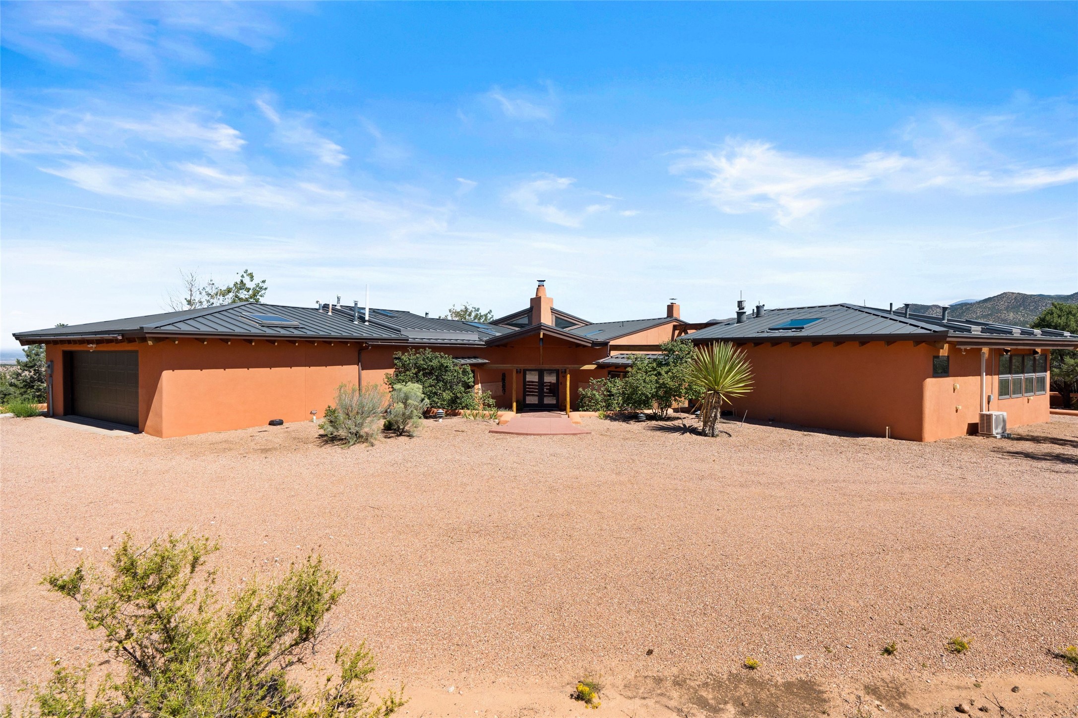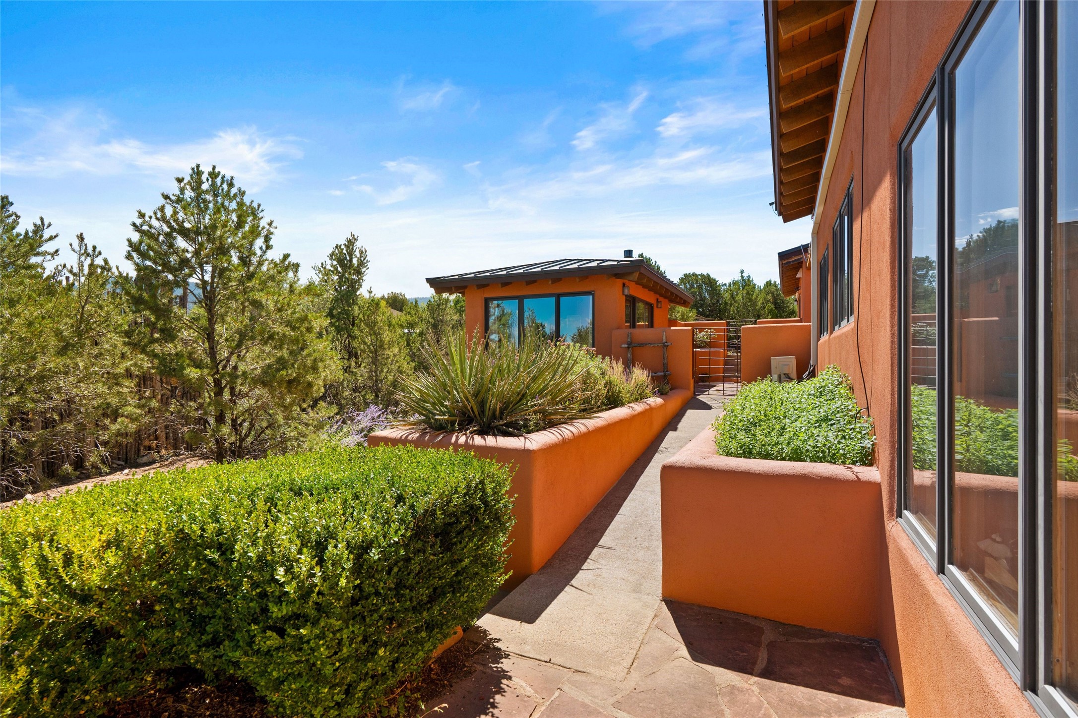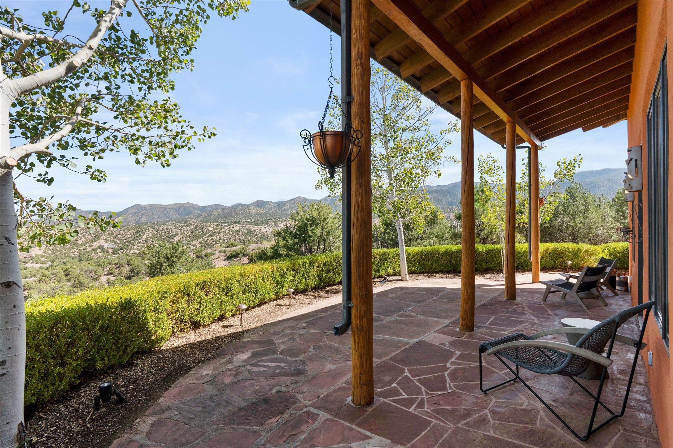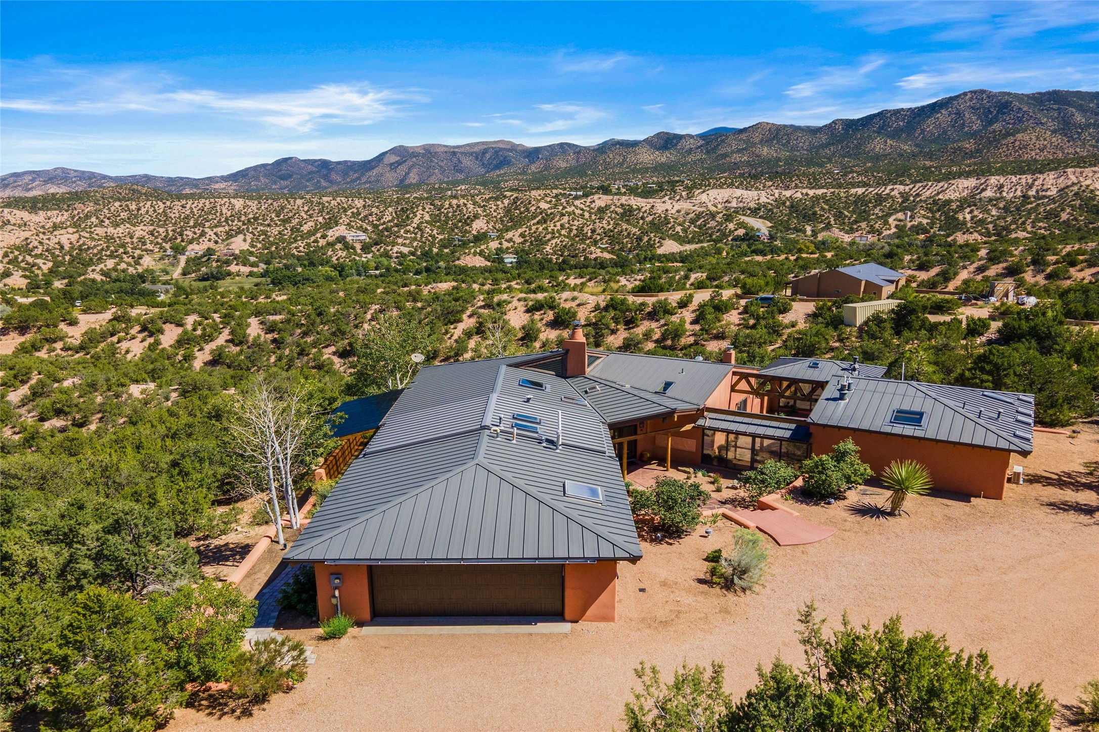Stunning 3-bedroom, 3.5-bath home in Vista Redonda professionally sited on 5 ridge-top acres of pion trees and breathtaking views of the Sangre de Cristo and Jemez Mountains. Constructed by renowned builder Dennis Sayer, this residence showcases exceptional workmanship and reflective design. The pitched roof and soaring beamed ceilings create an airy, inviting atmosphere, while the hard plaster walls and polished Saltillo tiles add timeless elegance. Upon entering, you'll find a spacious great room that flows into a dining area and a well-appointed eat-in kitchen. The office, complete with built-in desk and bookcases, provides a quiet retreat, while the kiva fireplace adds warmth and character to the space. The home features two en-suite bedrooms in each wing, ensuring privacy and comfort for guests.. In addition, there is a detached 196 sq. ft. studio/casita. Multiple outdoor areas invite you to enjoy al fresco dining and entertaining, including a delightful sunrise breakfast patio where you can soak in the morning sun with a cup of coffee. Natural light floods the home through plentiful skylights, windows, and glass doors, begetting a bright and welcoming environment. Additional highlights include a heated 2-car garage and newer boiler and water heaters. Just south of Vista Redonda is the Village of Tesuque, its neighborhood gathering spot Tesuque Village Market and the contemporary restaurant and bar, El Nido. Easy access to The Santa Fe Opera and downtown Santa Fe.