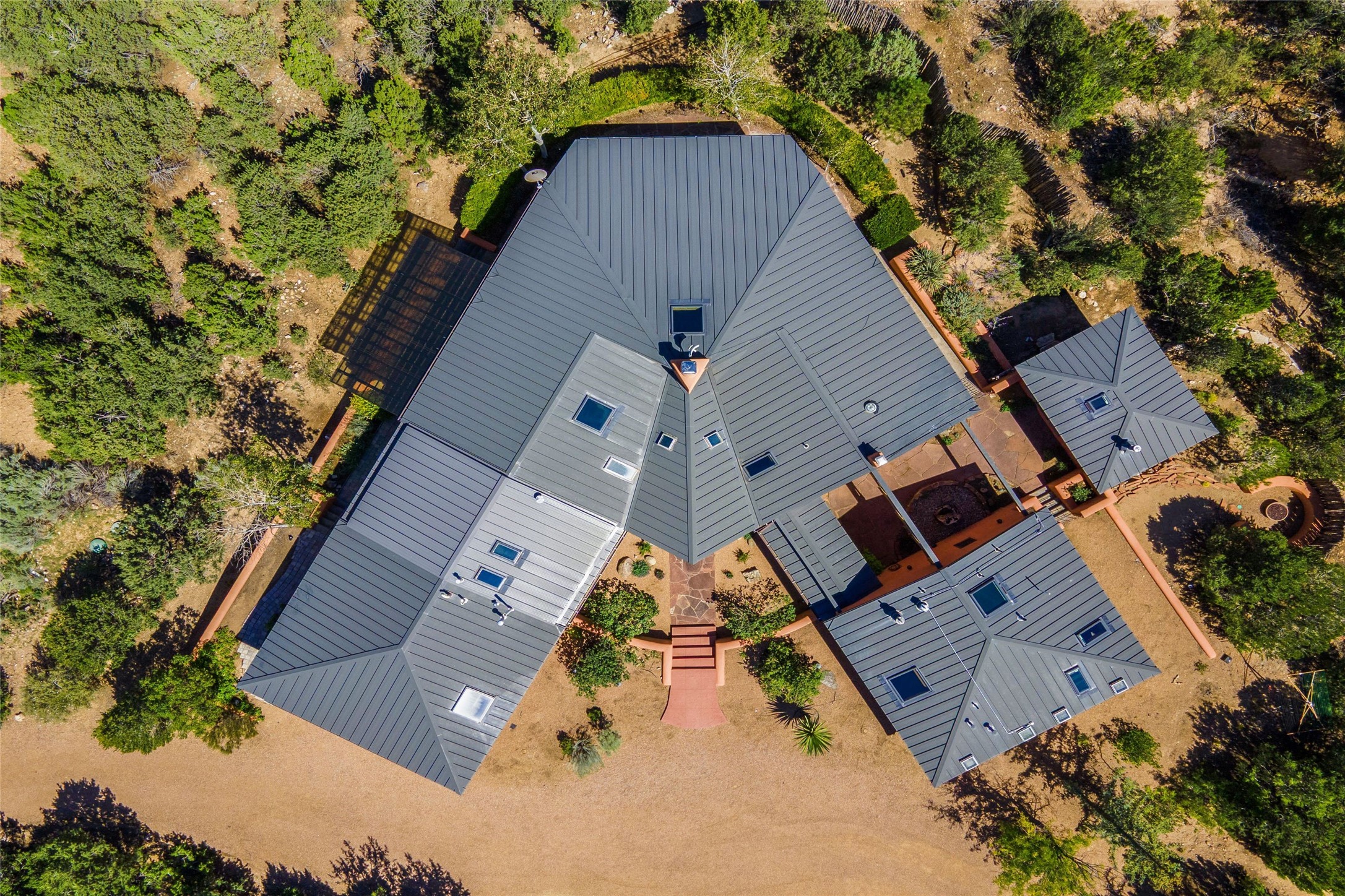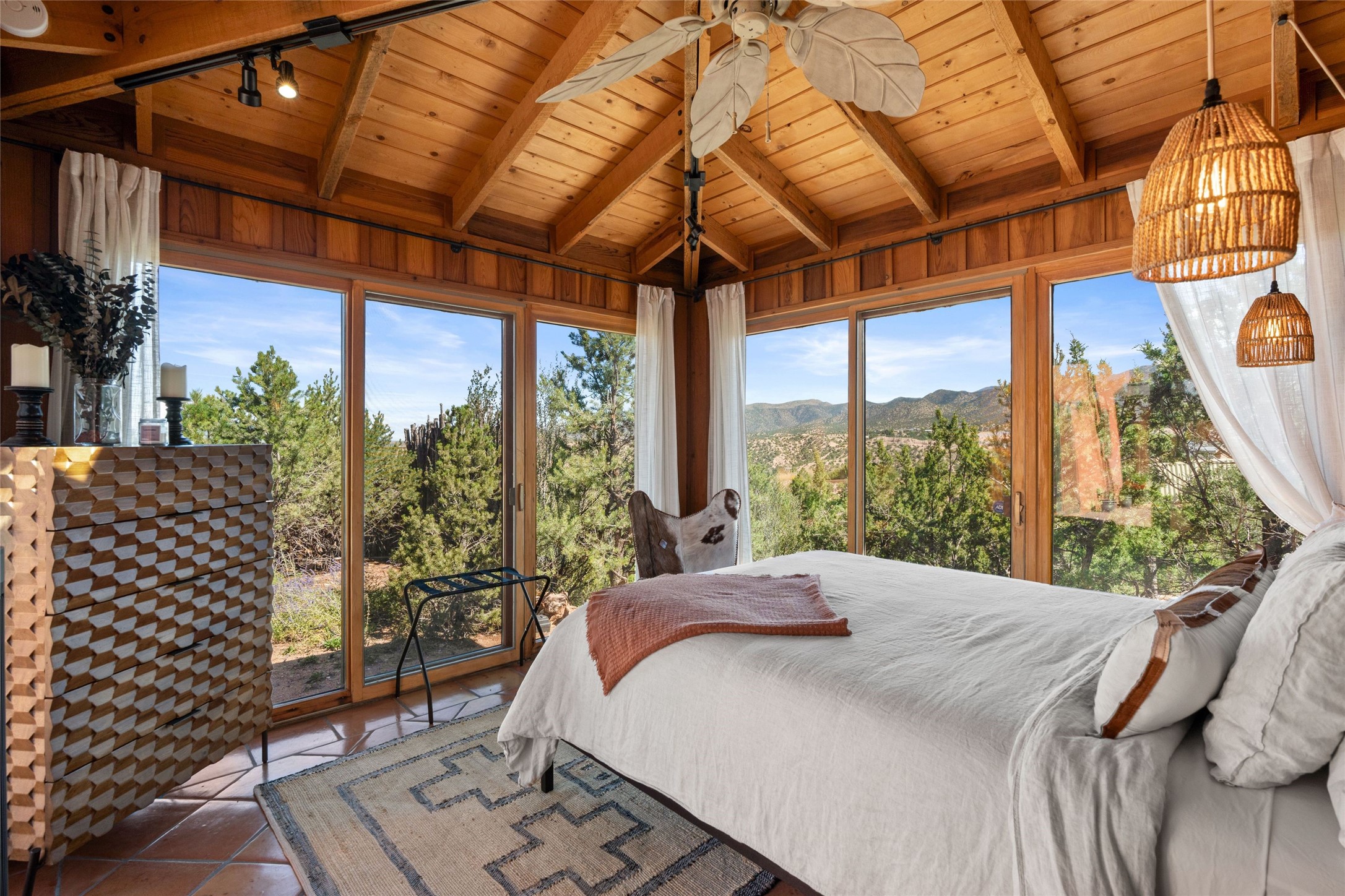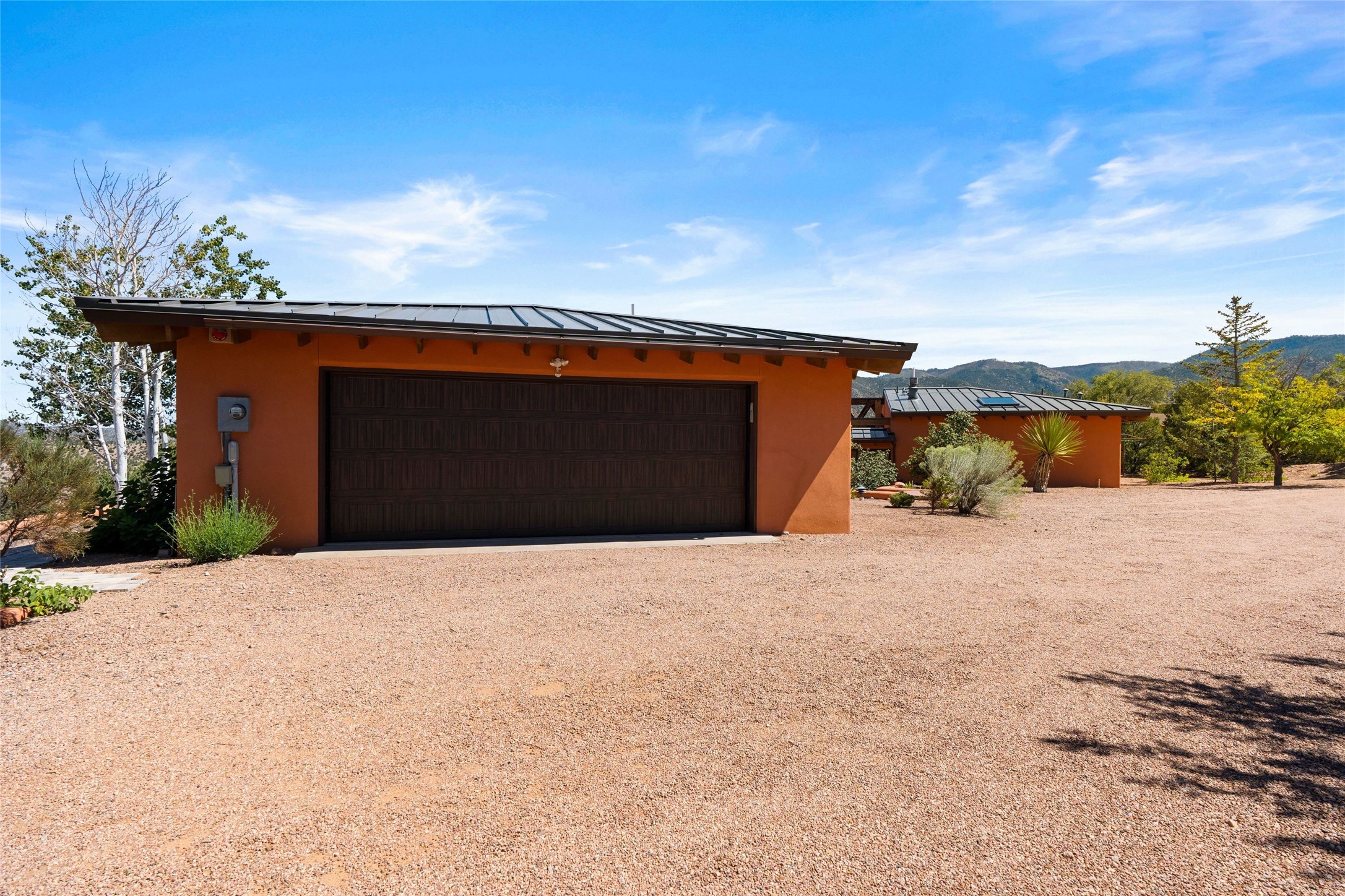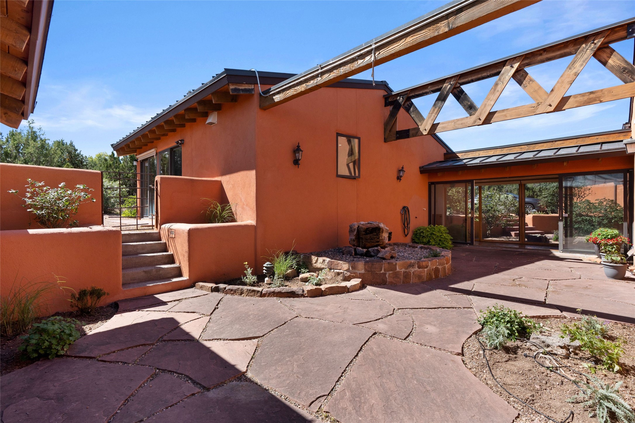 Stunning 3-bedroom, 3.5-bath home in Vista Redonda professionally sited on 5 ridge-top acres of pion trees and breathtaking views of the Sangre de Cristo and Jemez Mountains. Constructed by renowned builder Dennis Sayer, this residence showcases exceptional workmanship and reflective design. The pitched roof and soaring beamed ceilings create an airy, inviting atmosphere, while the hard plaster walls and polished Saltillo tiles add timeless elegance. Upon entering, you'll find a spacious great room that flows into a dining area and a well-appointed eat-in kitchen. The office, complete with built-in desk and bookcases, provides a quiet retreat, while the kiva fireplace adds warmth and character to the space. The home features two en-suite bedrooms in each wing, ensuring privacy and comfort for guests.. In addition, there is a detached 196 sq. ft. studio/casita. Multiple outdoor areas invite you to enjoy al fresco dining and entertaining, including a delightful sunrise breakfast patio where you can soak in the morning sun with a cup of coffee. Natural light floods the home through plentiful skylights, windows, and glass doors, begetting a bright and welcoming environment. Additional highlights include a heated 2-car garage and newer boiler and water heaters. Just south of Vista Redonda is the Village of Tesuque, its neighborhood gathering spot Tesuque Village Market and the contemporary restaurant and bar, El Nido. Easy access to The Santa Fe Opera and downtown Santa Fe.