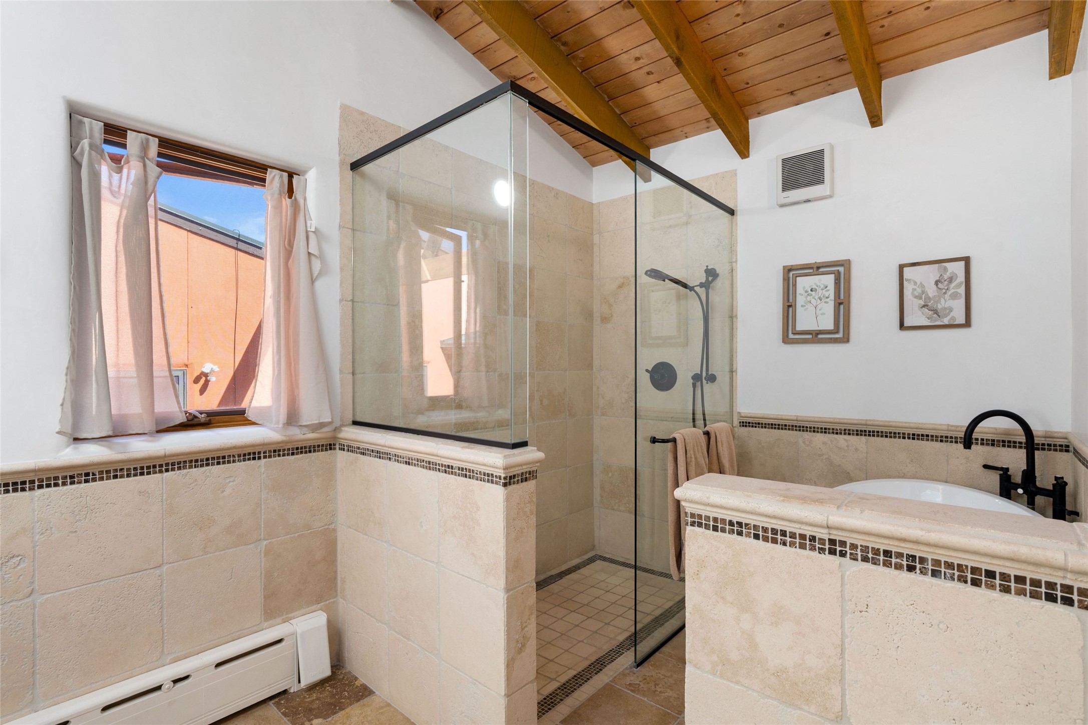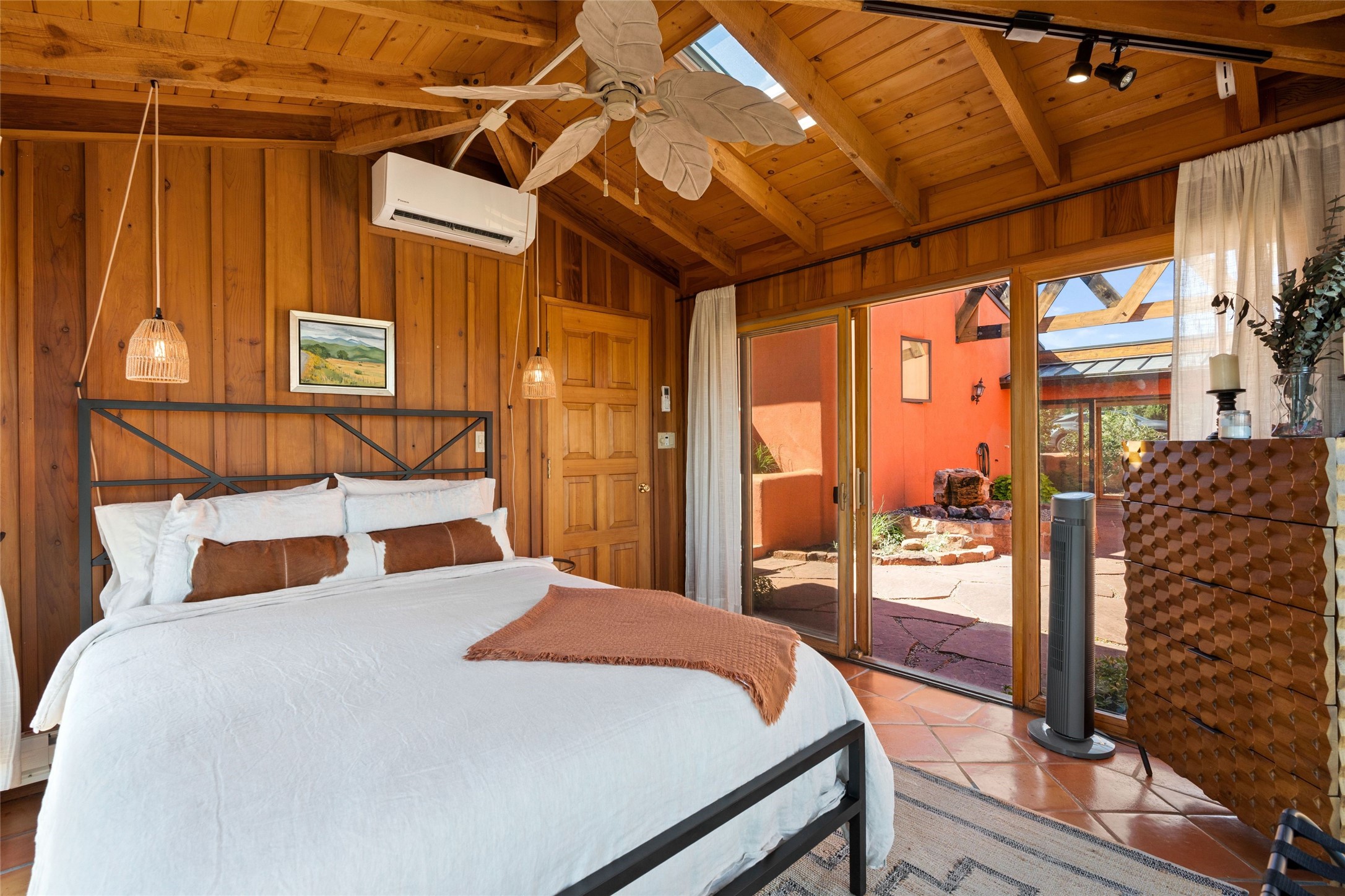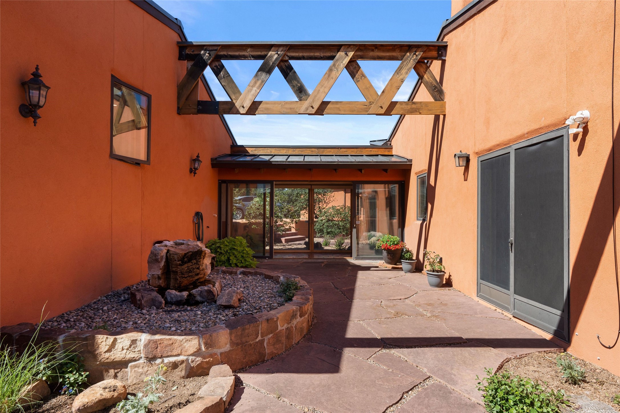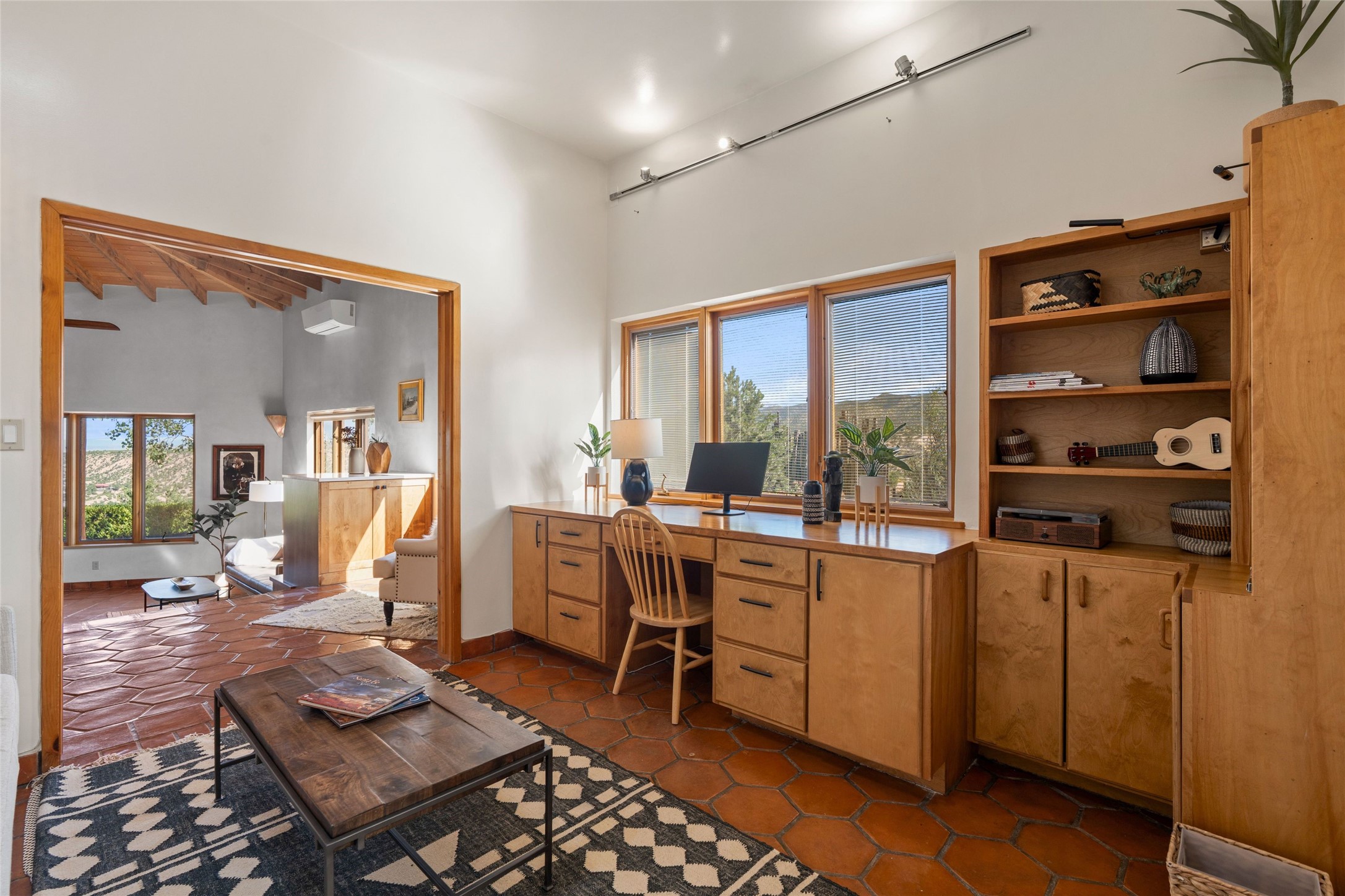 Stunning 3-bedroom, 3.5-bath home in Vista Redonda professionally sited on 5 ridge-top acres of pion trees and breathtaking views of the Sangre de Cristo and Jemez Mountains. Constructed by renowned builder Dennis Sayer, this residence showcases exceptional workmanship and reflective design. The pitched roof and soaring beamed ceilings create an airy, inviting atmosphere, while the hard plaster walls and polished Saltillo tiles add timeless elegance. Upon entering, you'll find a spacious great room that flows into a dining area and a well-appointed eat-in kitchen. The office, complete with built-in desk and bookcases, provides a quiet retreat, while the kiva fireplace adds warmth and character to the space. The home features two en-suite bedrooms in each wing, ensuring privacy and comfort for guests.. In addition, there is a detached 196 sq. ft. studio/casita. Multiple outdoor areas invite you to enjoy al fresco dining and entertaining, including a delightful sunrise breakfast patio where you can soak in the morning sun with a cup of coffee. Natural light floods the home through plentiful skylights, windows, and glass doors, begetting a bright and welcoming environment. Additional highlights include a heated 2-car garage and newer boiler and water heaters. Just south of Vista Redonda is the Village of Tesuque, its neighborhood gathering spot Tesuque Village Market and the contemporary restaurant and bar, El Nido. Easy access to The Santa Fe Opera and downtown Santa Fe.