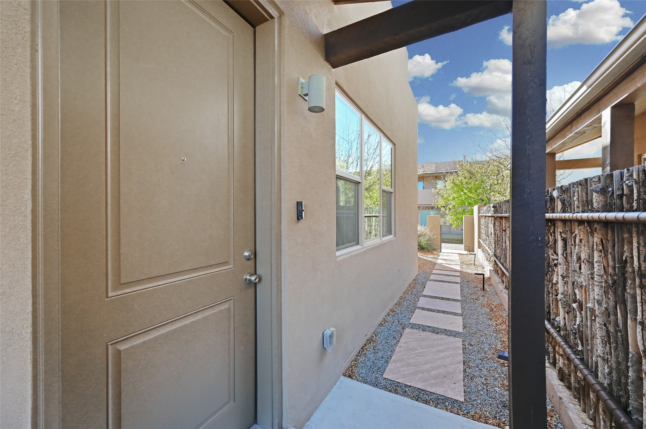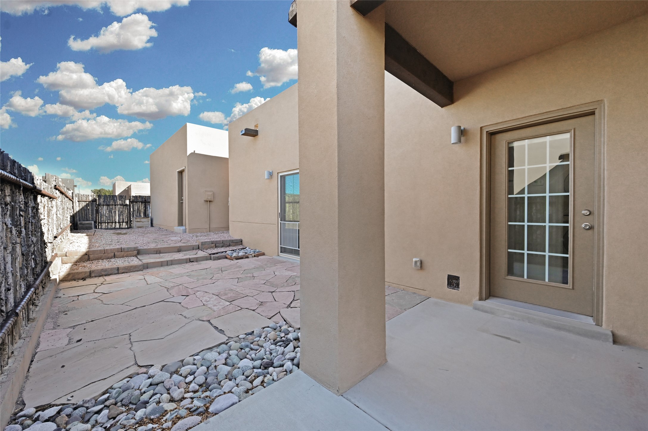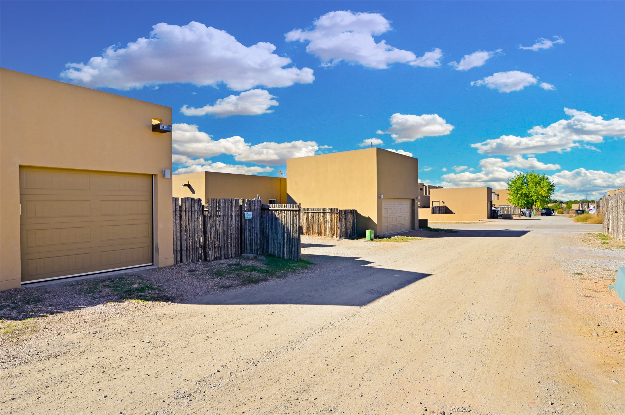This beautifully maintained pristine home has it all: high ceilings, single-level, solar panels, energy & water effecient design, fenced yard, and high end touches all in the sought-after neighborhood of Oshara Village. This thoughtfully designed attached property has a split floor plan that offers privacy and versatility. Each wing features a bedroom and bath separated by the light-filled living room with soaring ceilings and gorgeous kitchen next to the large dining area. The primary bedroom opens directly to the charming patio through sliding glass doors, creating an inviting indoor-outdoor connection. Ideal for guests, a home office, or housemates the flexible second bedroom adds to the home's versatility. Enjoy close proximity to scenic trails, Pantry Dos, and the Santa Fe Community College. Energy-efficient and low-maintenance, the home includes two owned solar panels with a transferable warranty, Whirlpool Energy Star appliances, and a detached one-car garage. Recent updates include matching tile flooring in both bedrooms, newer shower & kitchen sink fixtures, and expanded flagstone patio perfect for outdoor living. Community parking available.
