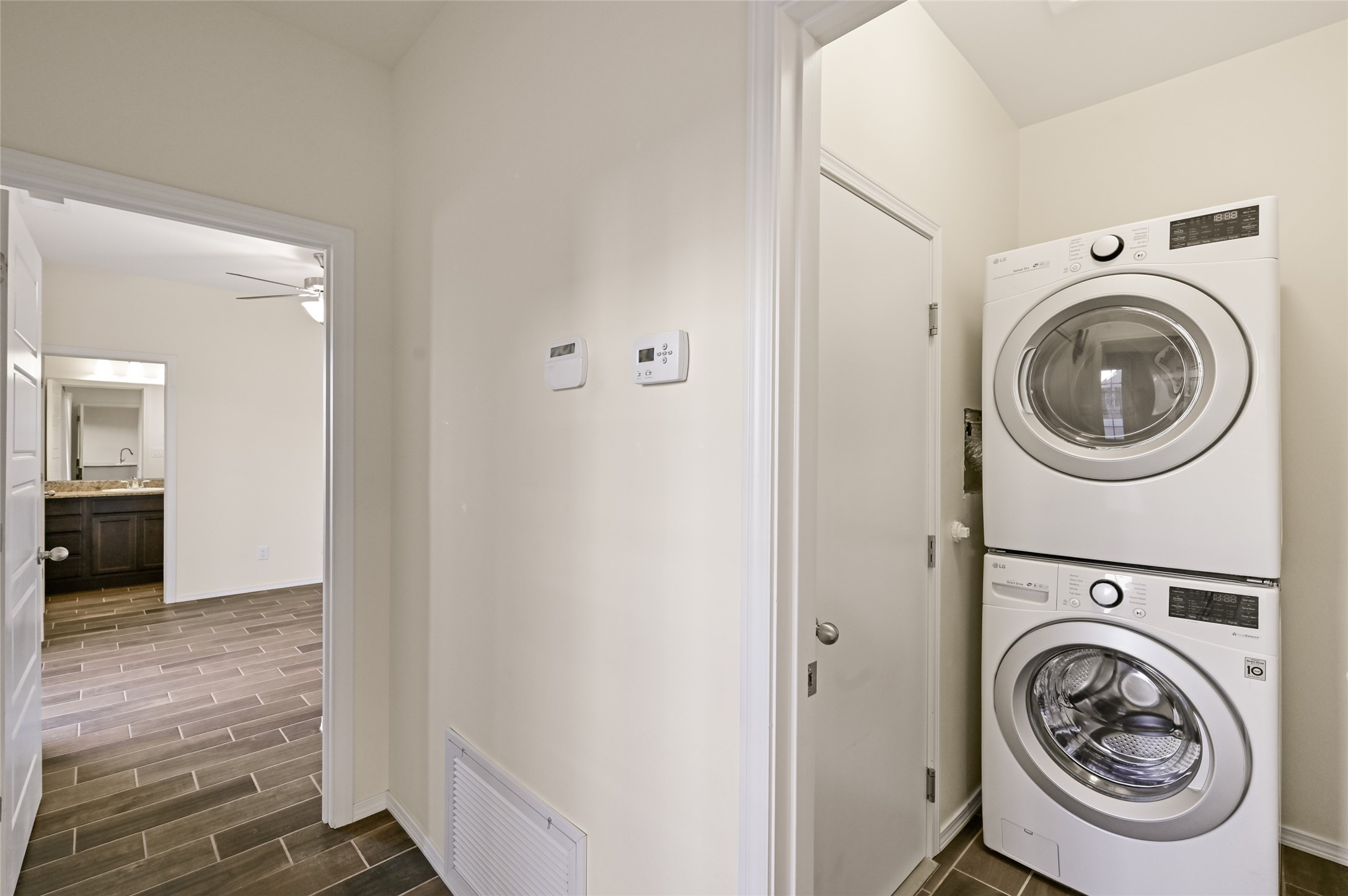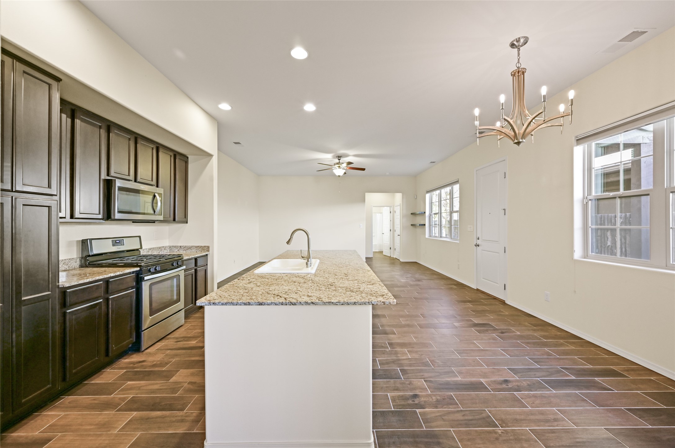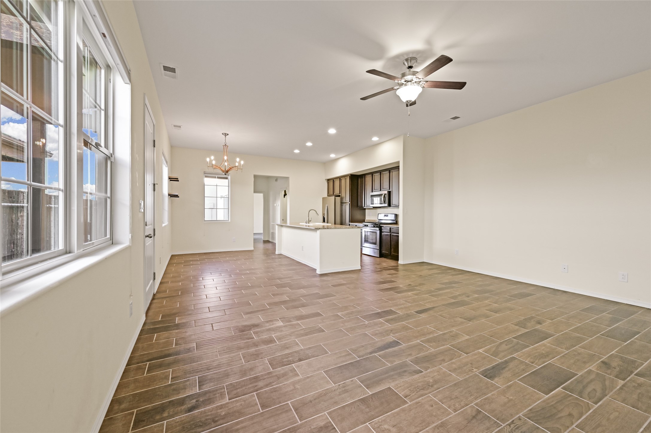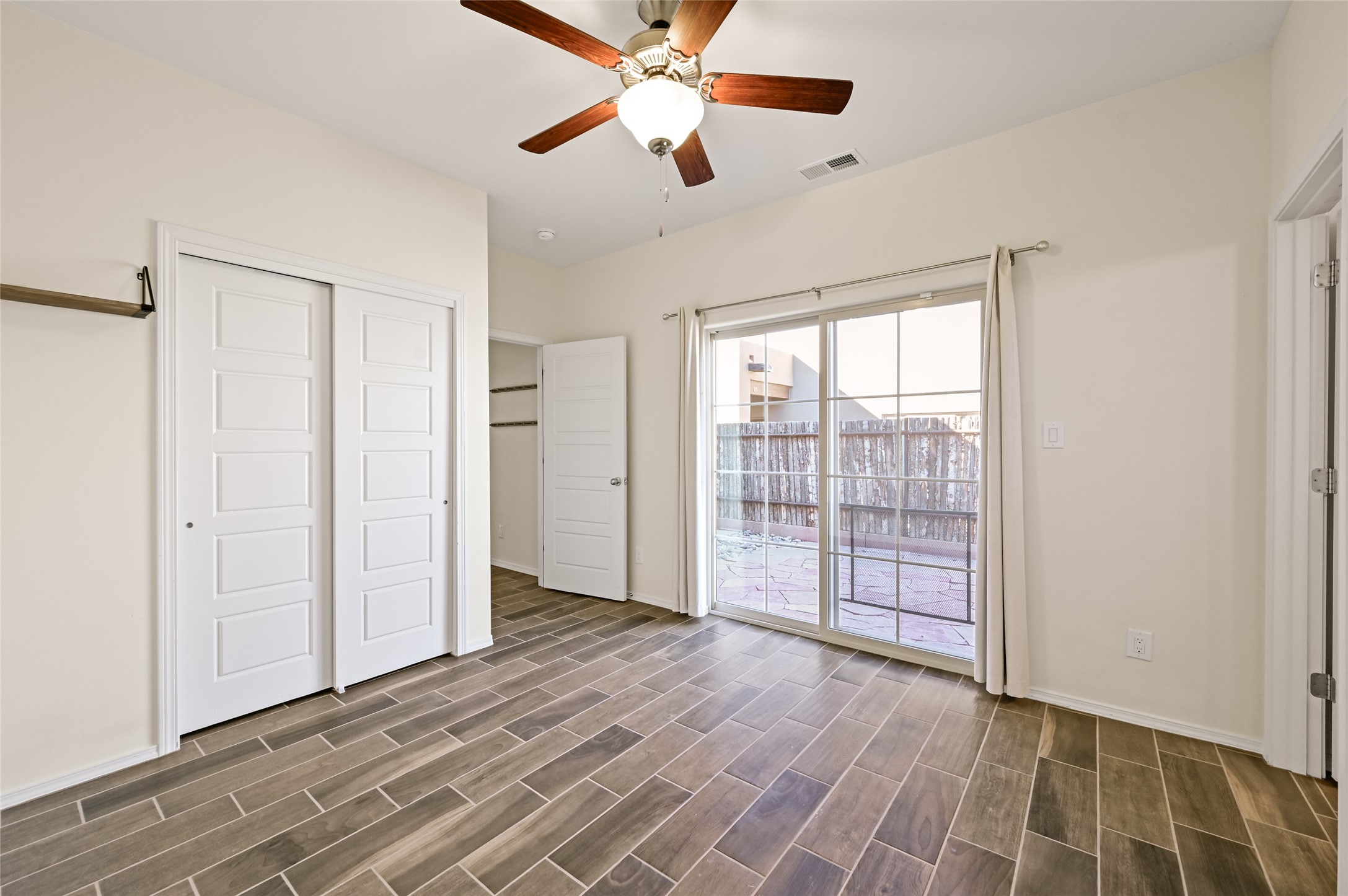 This beautifully maintained pristine home has it all: high ceilings, single-level, solar panels, energy & water effecient design, fenced yard, and high end touches all in the sought-after neighborhood of Oshara Village. This thoughtfully designed attached property has a split floor plan that offers privacy and versatility. Each wing features a bedroom and bath separated by the light-filled living room with soaring ceilings and gorgeous kitchen next to the large dining area. The primary bedroom opens directly to the charming patio through sliding glass doors, creating an inviting indoor-outdoor connection. Ideal for guests, a home office, or housemates the flexible second bedroom adds to the home's versatility. Enjoy close proximity to scenic trails, Pantry Dos, and the Santa Fe Community College. Energy-efficient and low-maintenance, the home includes two owned solar panels with a transferable warranty, Whirlpool Energy Star appliances, and a detached one-car garage. Recent updates include matching tile flooring in both bedrooms, newer shower & kitchen sink fixtures, and expanded flagstone patio perfect for outdoor living. Community parking available.