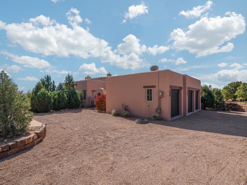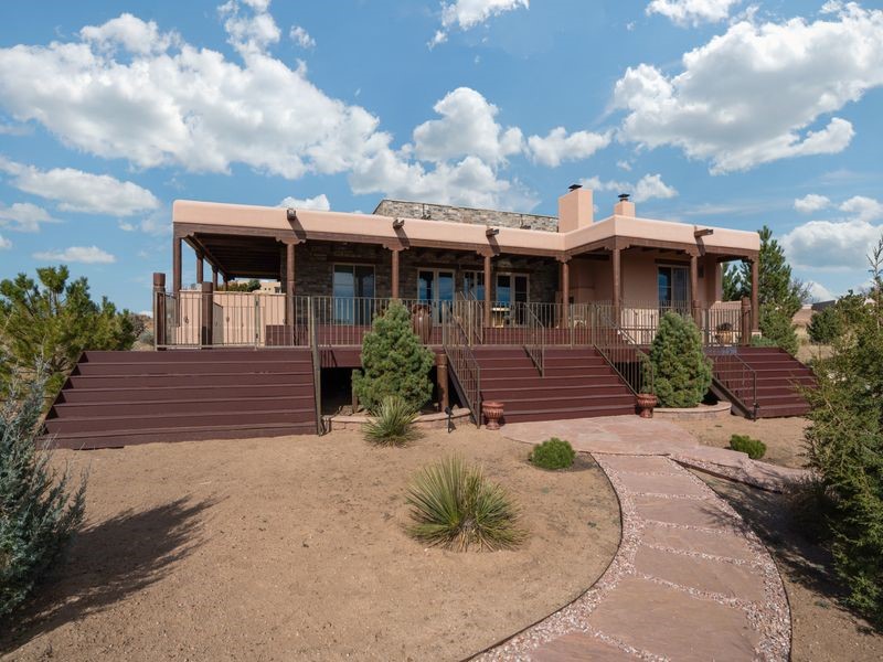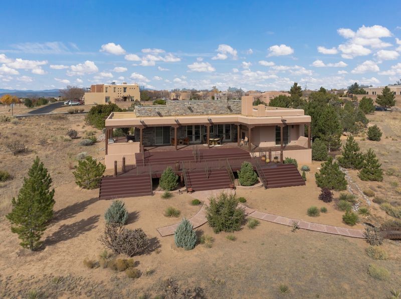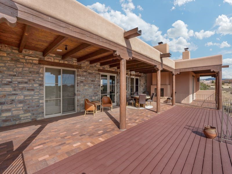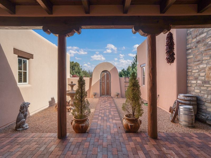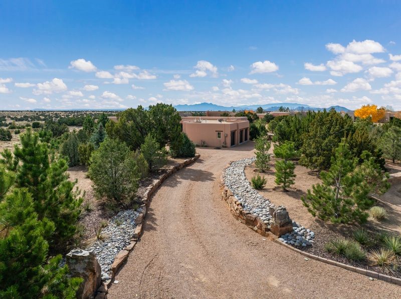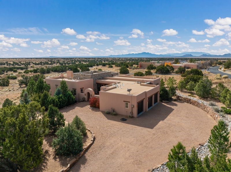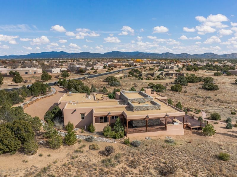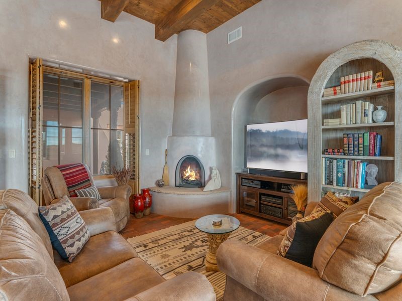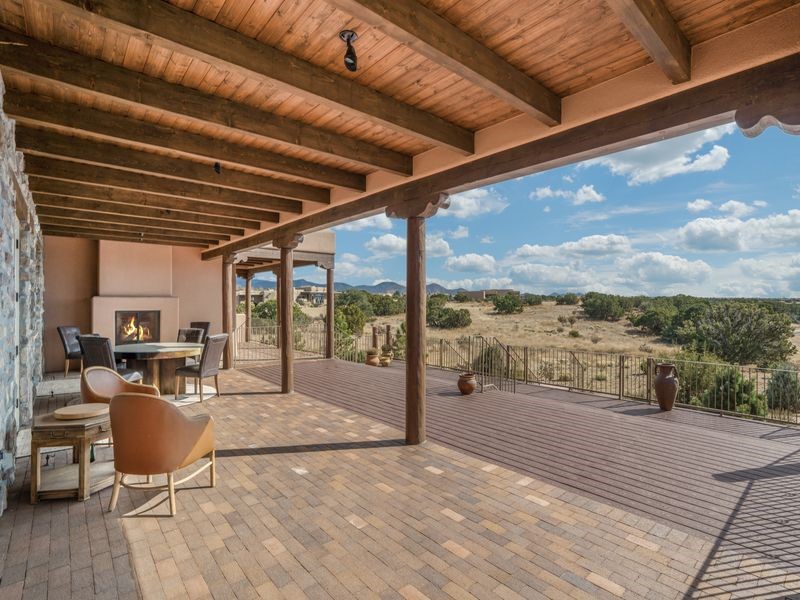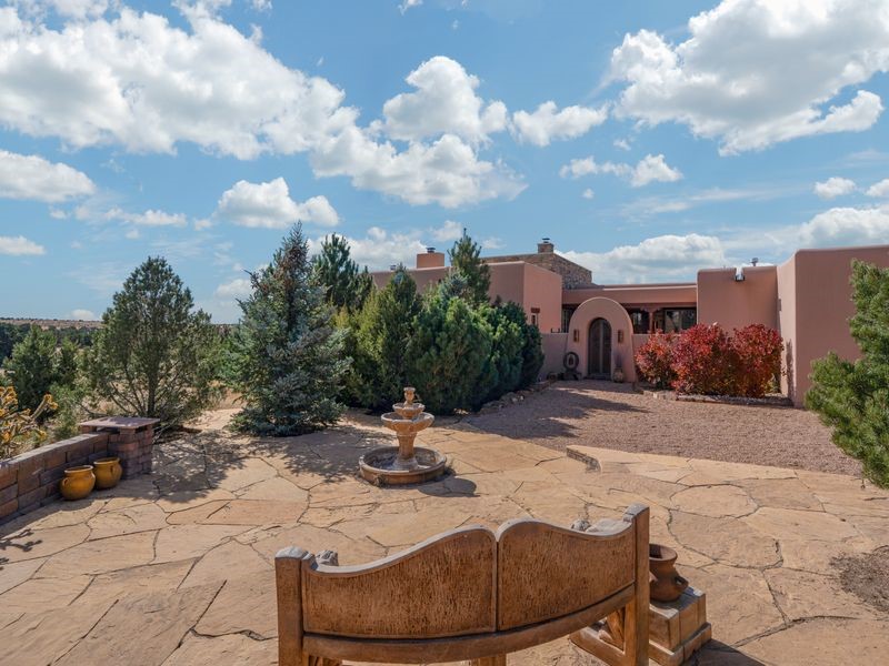 Experience refined Santa Fe living in this beautifully crafted, custom built 3 bedroom, 3 bath home offering stunning Ortiz, Jemez, and Sangre de Cristo mountain views. Thoughtfully designed for comfort and elegance, the residence features diamond-finish plaster walls, sumptuous archways, tongue-and-groove ceilings with beams, and classic brick floors that bring warmth and character throughout. The gourmet kitchen impresses with granite countertops, stainless-steel appliances, double ovens, a gas cooktop, and a spacious island with bar seating--all opening to a generous dining area and inviting living room with a kiva fireplace. The outdoor living space expands the home's livability, including a large, wrap-around covered portal with an outdoor fireplace, built-in grill, and an expansive deck oriented to the southeast for breathtaking sunrise and mountain vistas. The luxurious primary suite includes a kiva fireplace, private access to the portal, a spa-style bath with a walk-in shower and clawfoot tub, dual vanities, and large walk-in closet. The guest suite with full bathroom is large enough to serve as a second primary suite. The third bedroom is set up as an office with bathroom across the hall and access to the portal. All bedrooms are nicely separated from each other for enhanced comfort and privacy. Beautifully landscaped with 90+ mature trees on an estate lot of 1.98 acres backing up to open space with direct access to walking trails, the property offers a serene connection to nature. Modern comforts include in-floor radiant heat, forced-air heating, central refrigerated A/C, community water and sewer, and high-speed internet. A three-car heated garage provides abundant storage and convenience. Located just 19 minutes to the Plaza, 11 minutes to Cerrillos Road shopping, and 5 minutes to SF Community College, this home perfect for entertaining blends privacy, craftsmanship, and exceptional indoor-outdoor living in one of Santa Fe's most desirable settings.