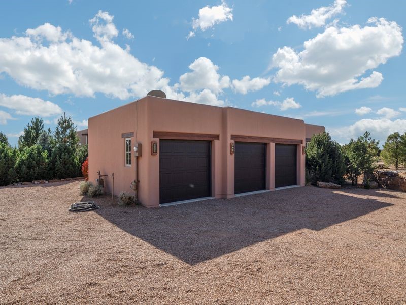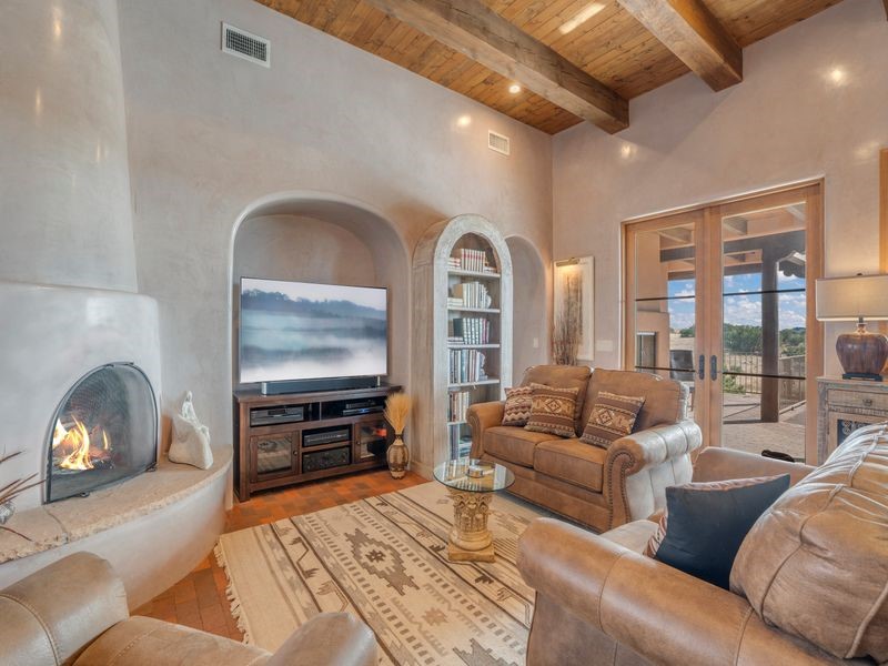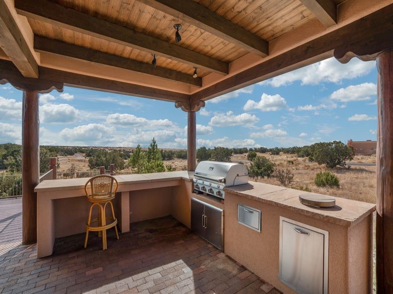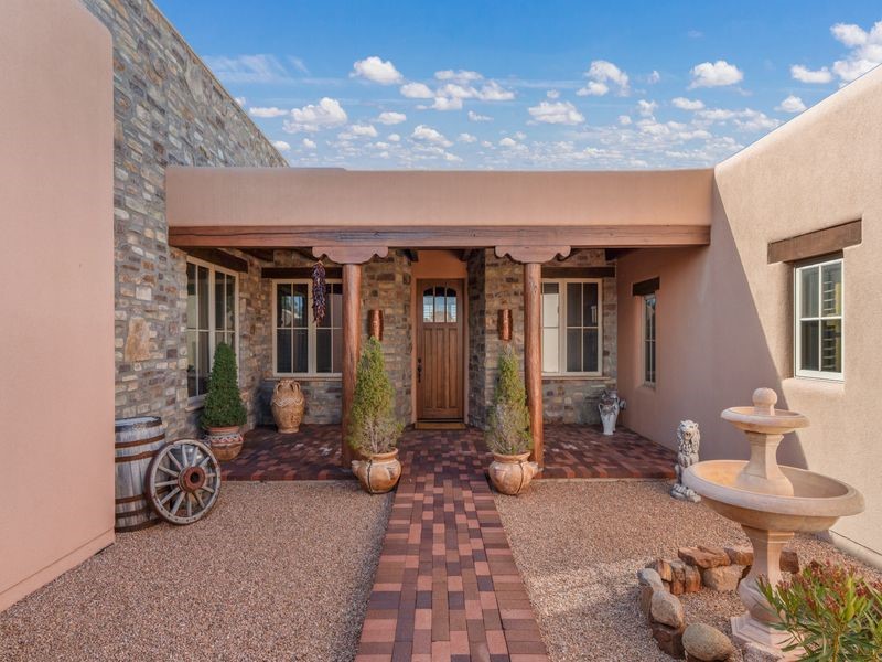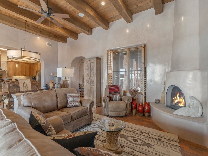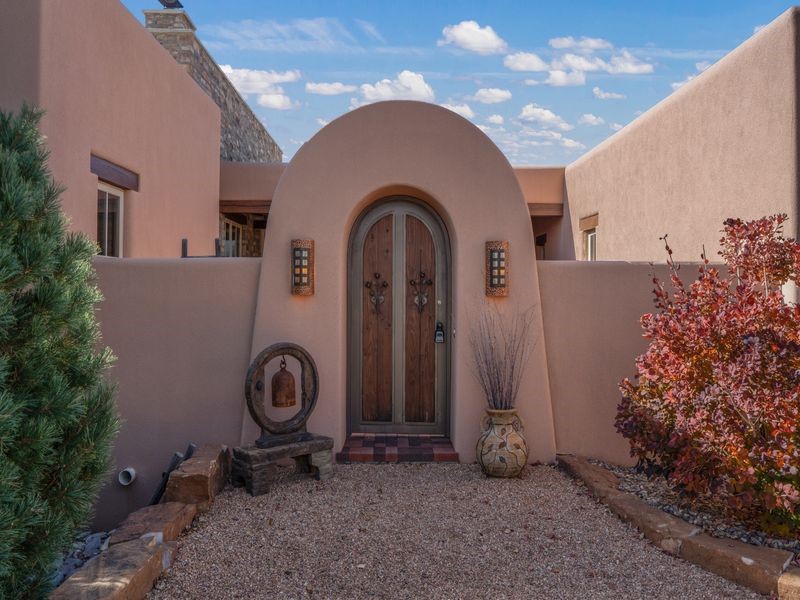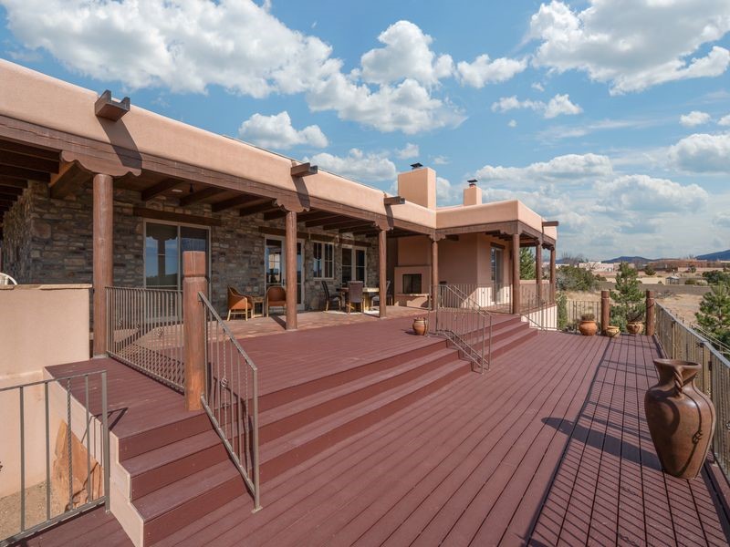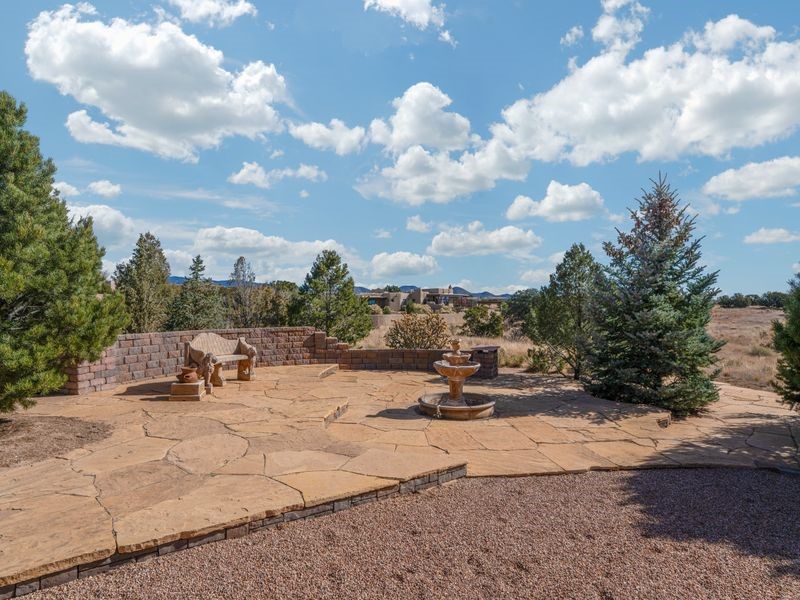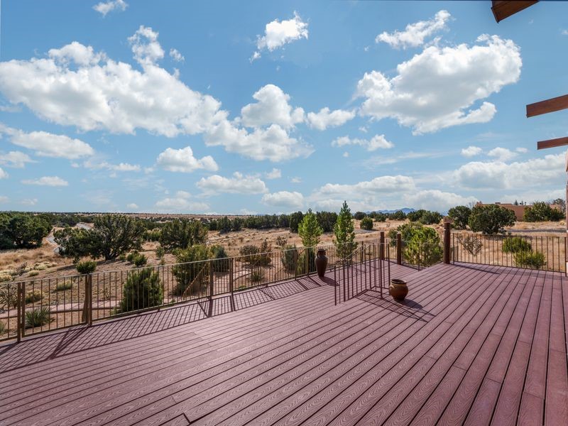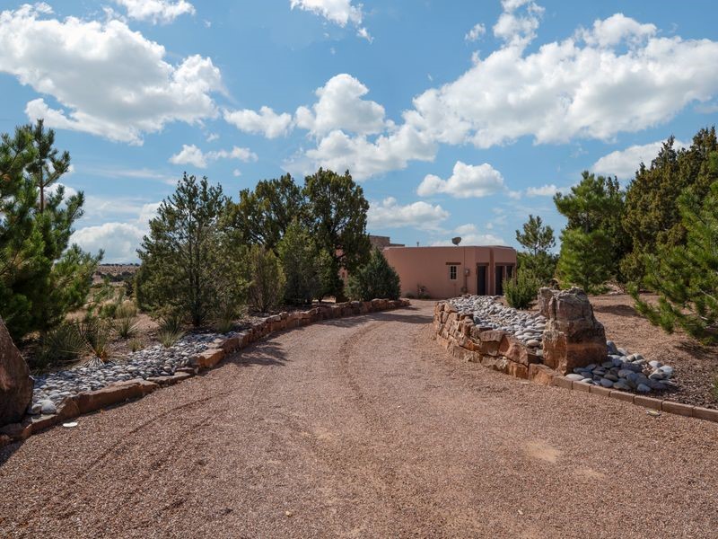 Experience refined Santa Fe living in this beautifully crafted, custom built 3 bedroom, 3 bath home offering stunning Ortiz, Jemez, and Sangre de Cristo mountain views. Thoughtfully designed for comfort and elegance, the residence features diamond-finish plaster walls, sumptuous archways, tongue-and-groove ceilings with beams, and classic brick floors that bring warmth and character throughout. The gourmet kitchen impresses with granite countertops, stainless-steel appliances, double ovens, a gas cooktop, and a spacious island with bar seating--all opening to a generous dining area and inviting living room with a kiva fireplace. The outdoor living space expands the home's livability, including a large, wrap-around covered portal with an outdoor fireplace, built-in grill, and an expansive deck oriented to the southeast for breathtaking sunrise and mountain vistas. The luxurious primary suite includes a kiva fireplace, private access to the portal, a spa-style bath with a walk-in shower and clawfoot tub, dual vanities, and large walk-in closet. The guest suite with full bathroom is large enough to serve as a second primary suite. The third bedroom is set up as an office with bathroom across the hall and access to the portal. All bedrooms are nicely separated from each other for enhanced comfort and privacy. Beautifully landscaped with 90+ mature trees on an estate lot of 1.98 acres backing up to open space with direct access to walking trails, the property offers a serene connection to nature. Modern comforts include in-floor radiant heat, forced-air heating, central refrigerated A/C, community water and sewer, and high-speed internet. A three-car heated garage provides abundant storage and convenience. Located just 19 minutes to the Plaza, 11 minutes to Cerrillos Road shopping, and 5 minutes to SF Community College, this home perfect for entertaining blends privacy, craftsmanship, and exceptional indoor-outdoor living in one of Santa Fe's most desirable settings.