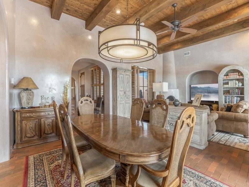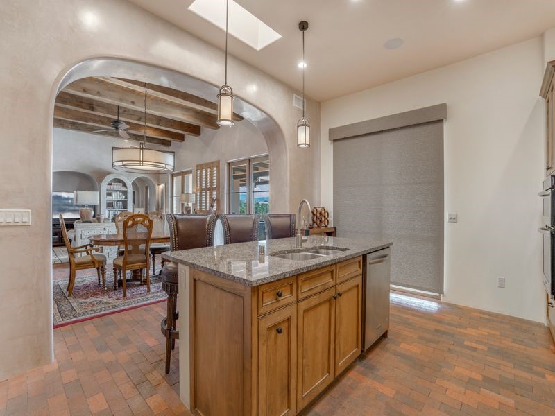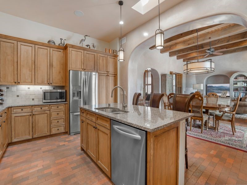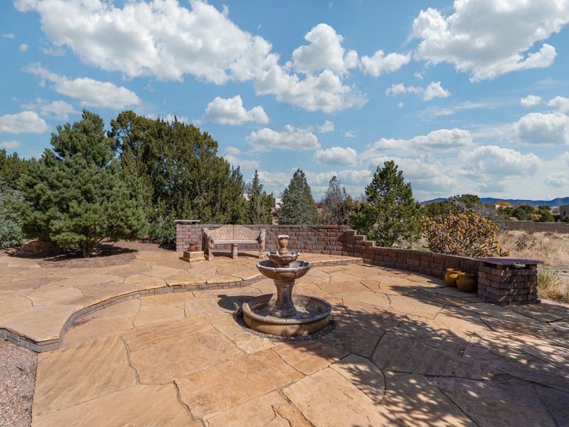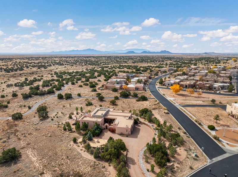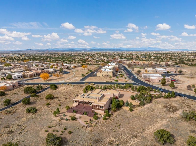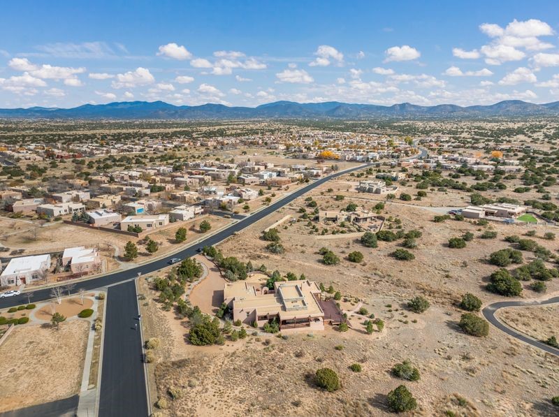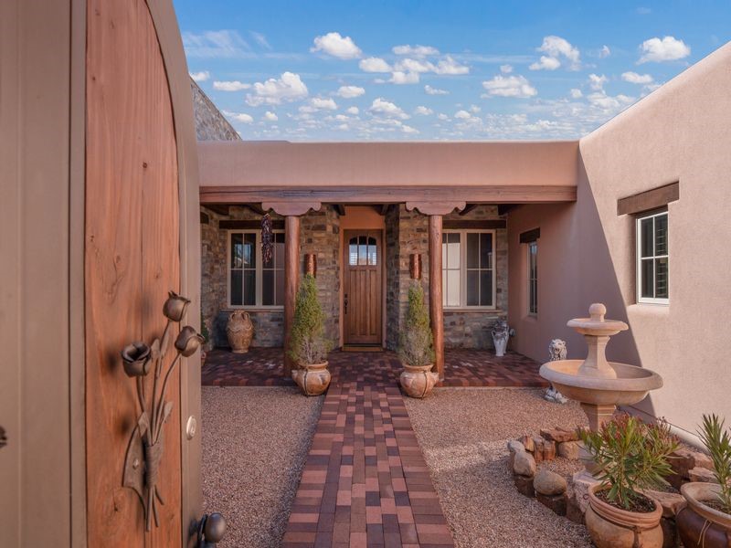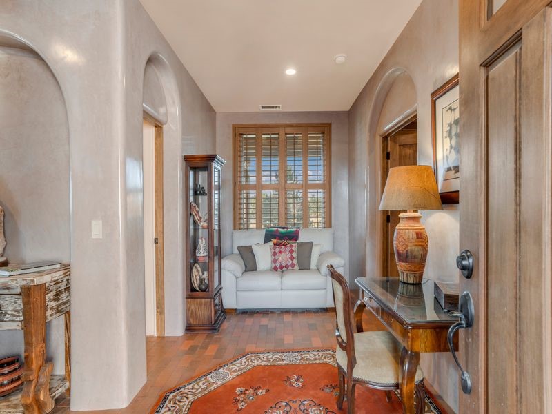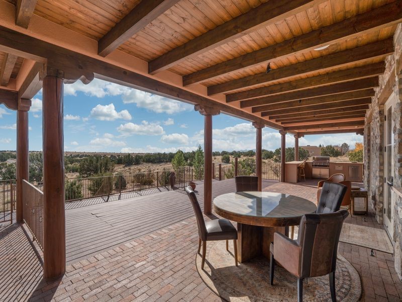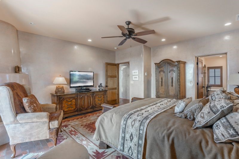 Experience refined Santa Fe living in this beautifully crafted, custom built 3 bedroom, 3 bath home offering stunning Ortiz, Jemez, and Sangre de Cristo mountain views. Thoughtfully designed for comfort and elegance, the residence features diamond-finish plaster walls, sumptuous archways, tongue-and-groove ceilings with beams, and classic brick floors that bring warmth and character throughout. The gourmet kitchen impresses with granite countertops, stainless-steel appliances, double ovens, a gas cooktop, and a spacious island with bar seating--all opening to a generous dining area and inviting living room with a kiva fireplace. The outdoor living space expands the home's livability, including a large, wrap-around covered portal with an outdoor fireplace, built-in grill, and an expansive deck oriented to the southeast for breathtaking sunrise and mountain vistas. The luxurious primary suite includes a kiva fireplace, private access to the portal, a spa-style bath with a walk-in shower and clawfoot tub, dual vanities, and large walk-in closet. The guest suite with full bathroom is large enough to serve as a second primary suite. The third bedroom is set up as an office with bathroom across the hall and access to the portal. All bedrooms are nicely separated from each other for enhanced comfort and privacy. Beautifully landscaped with 90+ mature trees on an estate lot of 1.98 acres backing up to open space with direct access to walking trails, the property offers a serene connection to nature. Modern comforts include in-floor radiant heat, forced-air heating, central refrigerated A/C, community water and sewer, and high-speed internet. A three-car heated garage provides abundant storage and convenience. Located just 19 minutes to the Plaza, 11 minutes to Cerrillos Road shopping, and 5 minutes to SF Community College, this home perfect for entertaining blends privacy, craftsmanship, and exceptional indoor-outdoor living in one of Santa Fe's most desirable settings.