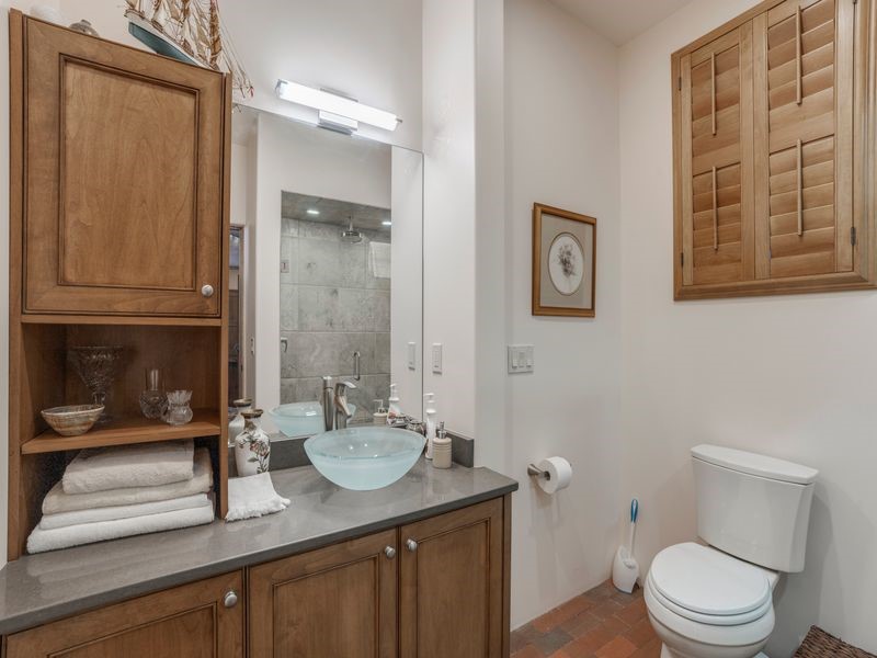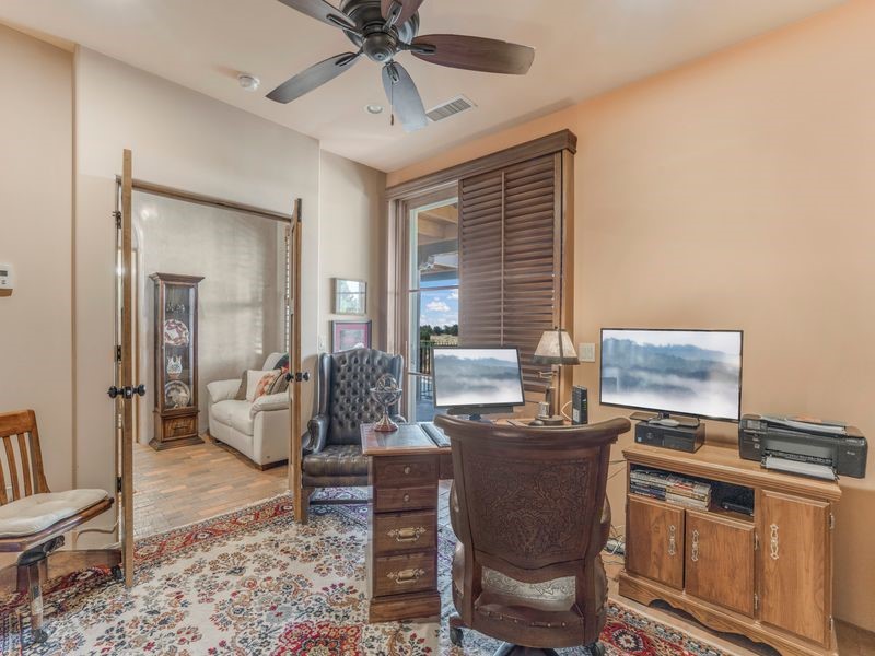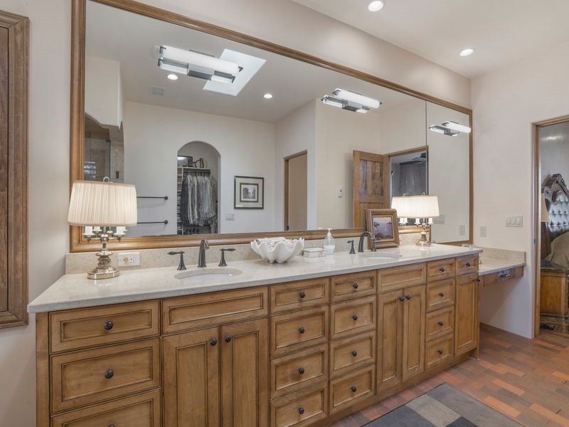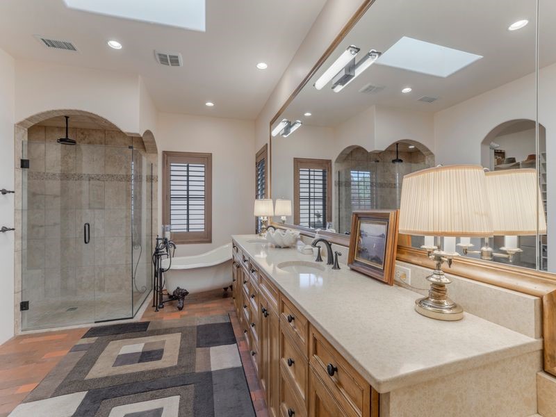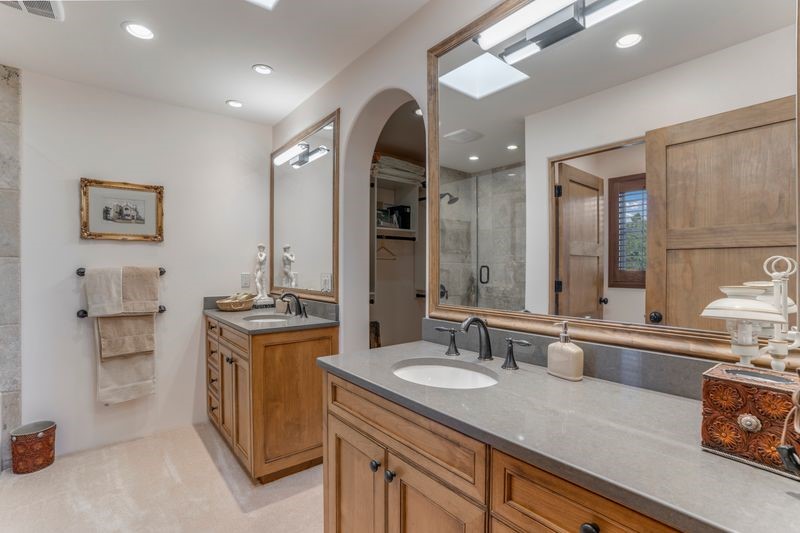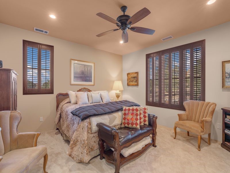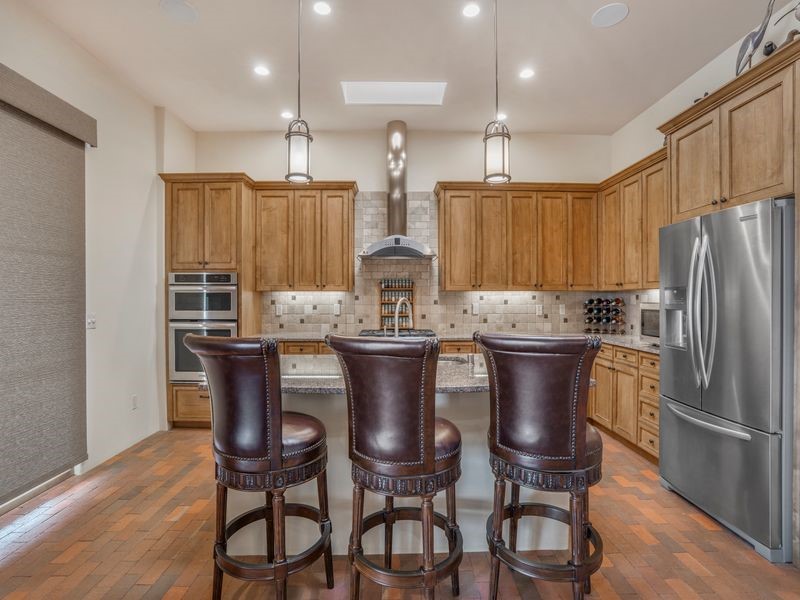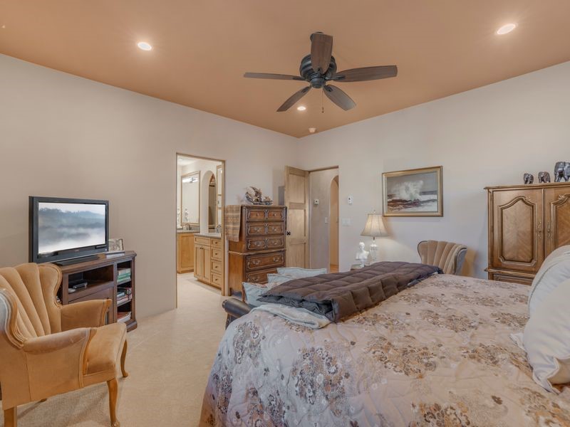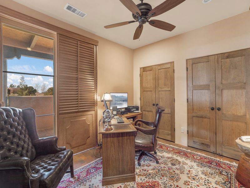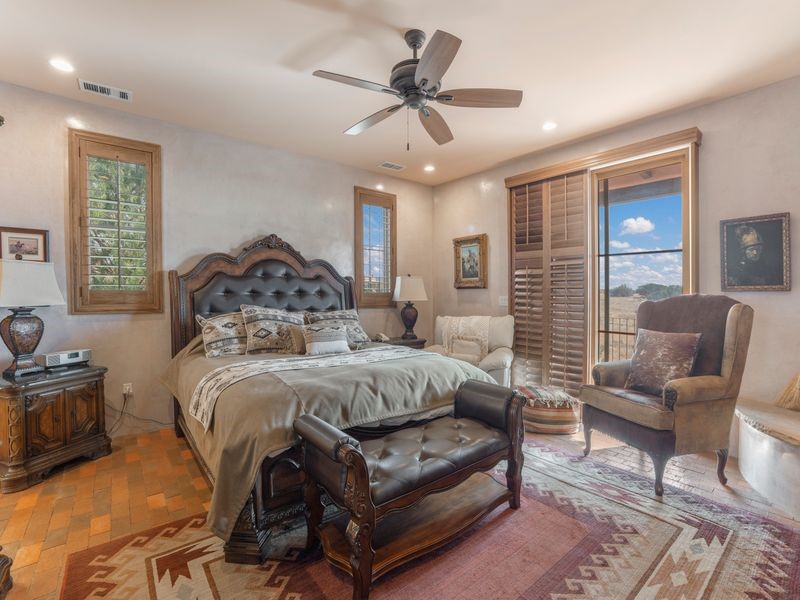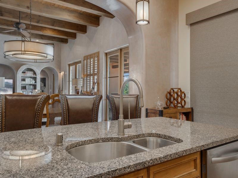 Experience refined Santa Fe living in this beautifully crafted, custom built 3 bedroom, 3 bath home offering stunning Ortiz, Jemez, and Sangre de Cristo mountain views. Thoughtfully designed for comfort and elegance, the residence features diamond-finish plaster walls, sumptuous archways, tongue-and-groove ceilings with beams, and classic brick floors that bring warmth and character throughout. The gourmet kitchen impresses with granite countertops, stainless-steel appliances, double ovens, a gas cooktop, and a spacious island with bar seating--all opening to a generous dining area and inviting living room with a kiva fireplace. The outdoor living space expands the home's livability, including a large, wrap-around covered portal with an outdoor fireplace, built-in grill, and an expansive deck oriented to the southeast for breathtaking sunrise and mountain vistas. The luxurious primary suite includes a kiva fireplace, private access to the portal, a spa-style bath with a walk-in shower and clawfoot tub, dual vanities, and large walk-in closet. The guest suite with full bathroom is large enough to serve as a second primary suite. The third bedroom is set up as an office with bathroom across the hall and access to the portal. All bedrooms are nicely separated from each other for enhanced comfort and privacy. Beautifully landscaped with 90+ mature trees on an estate lot of 1.98 acres backing up to open space with direct access to walking trails, the property offers a serene connection to nature. Modern comforts include in-floor radiant heat, forced-air heating, central refrigerated A/C, community water and sewer, and high-speed internet. A three-car heated garage provides abundant storage and convenience. Located just 19 minutes to the Plaza, 11 minutes to Cerrillos Road shopping, and 5 minutes to SF Community College, this home perfect for entertaining blends privacy, craftsmanship, and exceptional indoor-outdoor living in one of Santa Fe's most desirable settings.