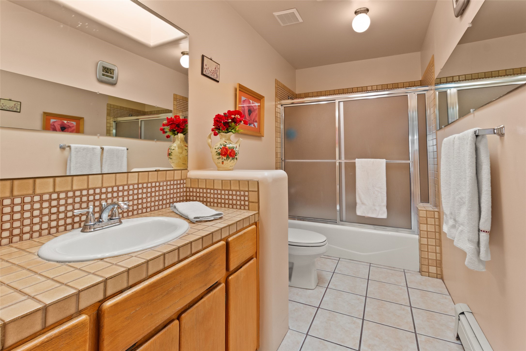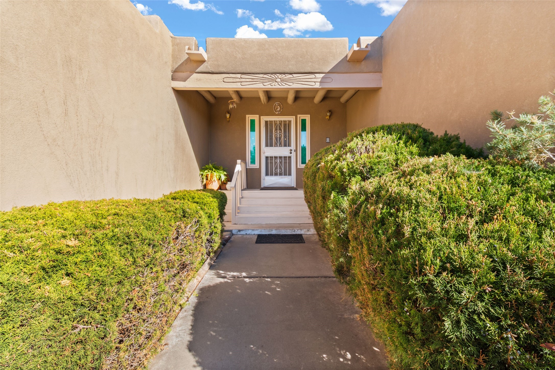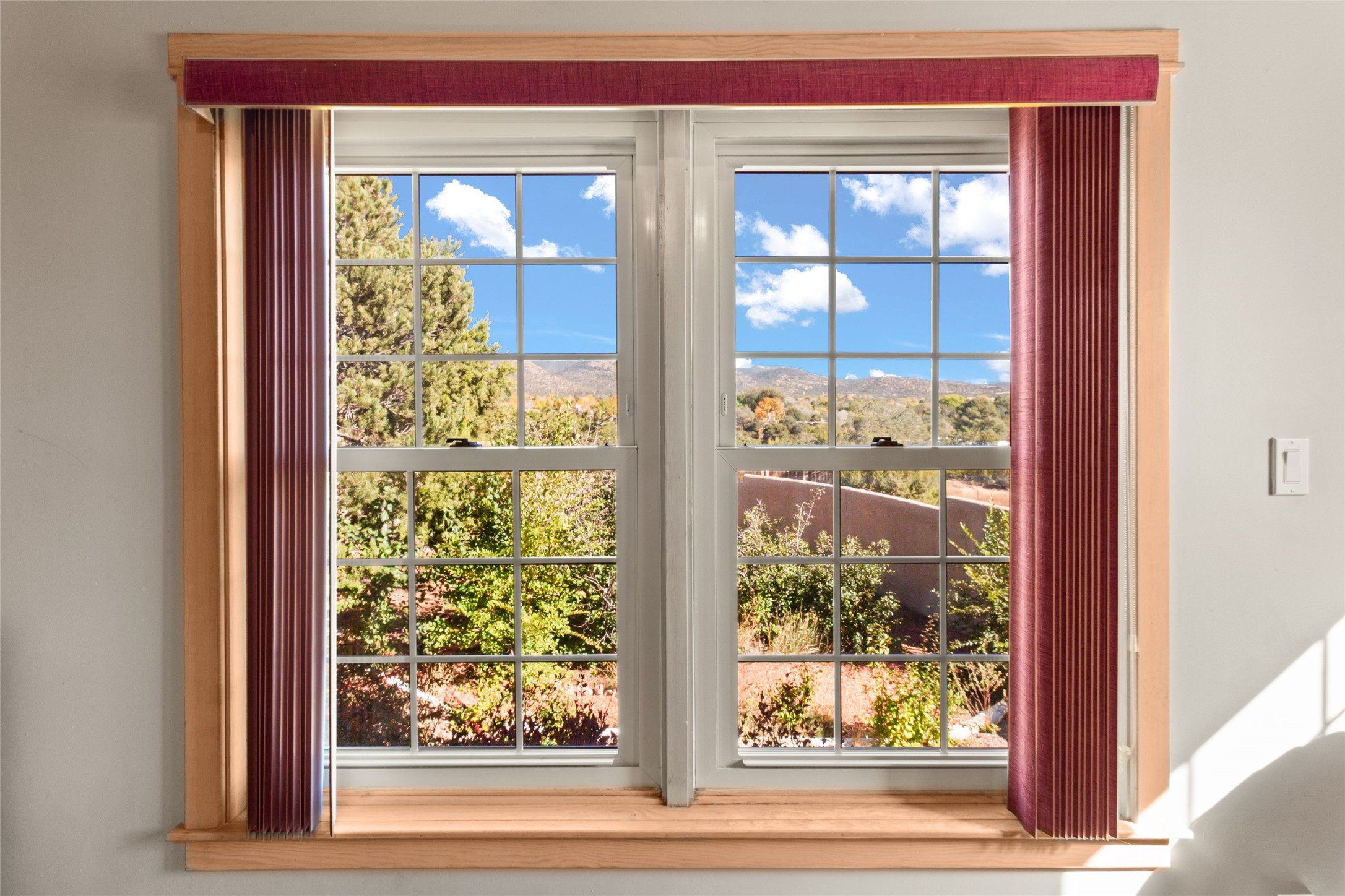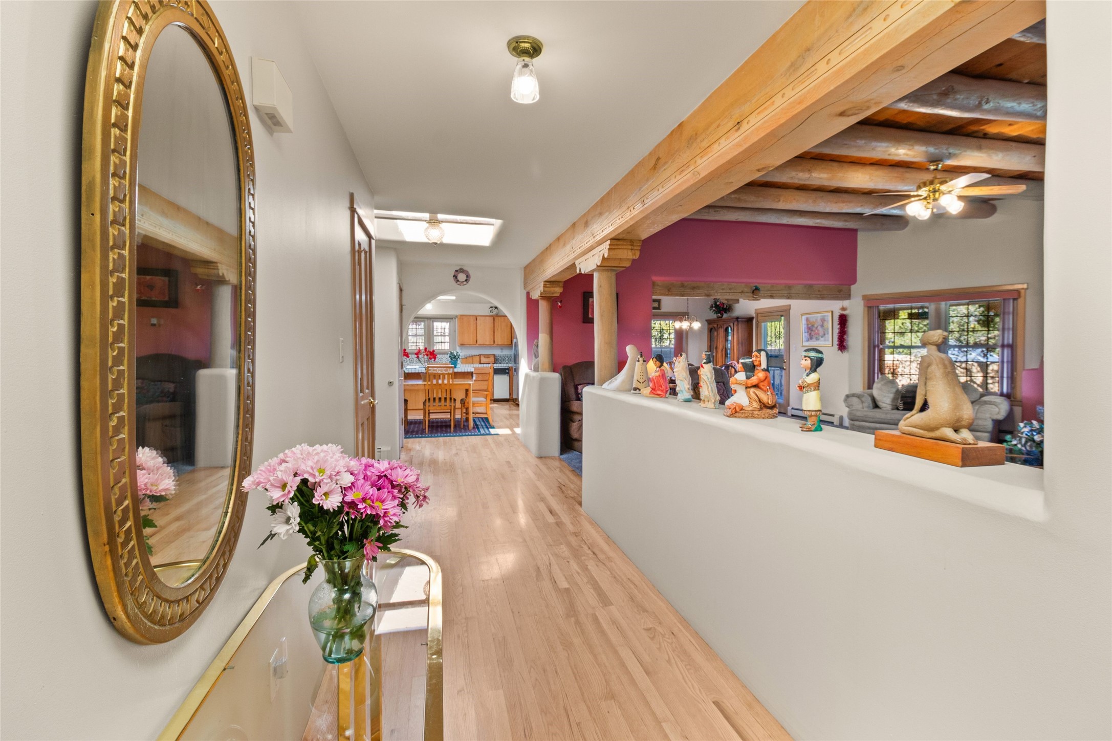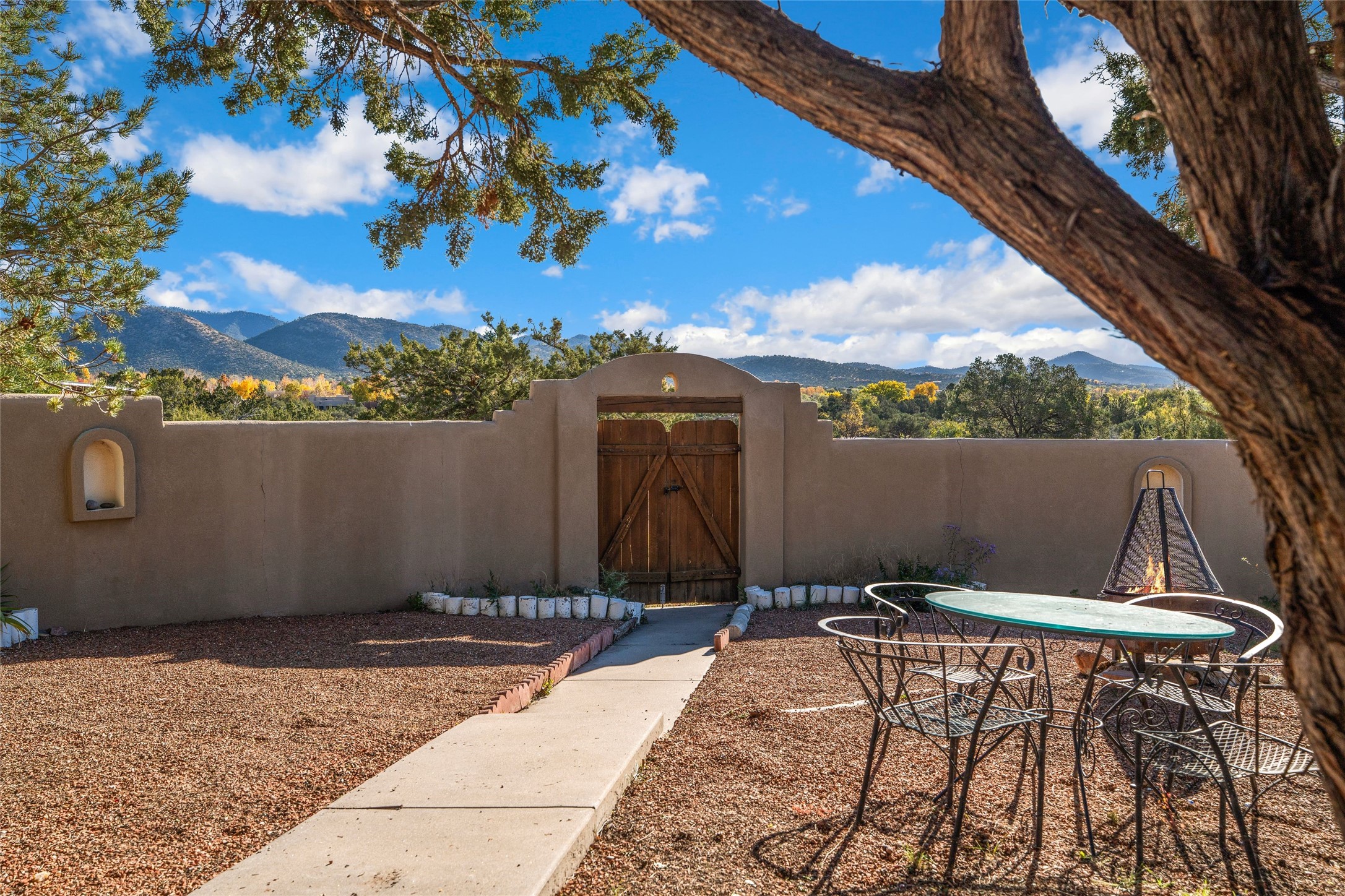 Discover the unmatched beauty of this in-town Calle Tecolote residence, a 4-bedroom, 2-bath home conveniently located and showcasing breathtaking mountain and sunset views from the living room and master suite. Every angle of this property was designed to highlight the stunning natural surrounding scenery that defines luxury living in Santa Fe. The spacious living room features soaring vigas, carved corbels, and hand-hewn beams, creating an impressive yet inviting atmosphere. Large picture windows and abundant skylights flood the space with natural light and capture the ever-changing clouds and colors of the sky. The kiva fireplace adds timeless warmth and charm. The kitchen offers a central island with seating, formal dining area, and open layout ideal for entertaining. The master suite is a private retreat with commanding views and serene ambiance -- a perfect place to start and end your day. Step outside to a gracious and protected walled courtyard with covered entertaining portal, perfect for al fresco dining and quiet evenings surrounded by panoramic mountain views. Additional highlights include an attached two-car garage with storage, functional intercom/radio system, baseboard gas heating, wood and carpet flooring, and ideal central location. Located just minutes from St. Vincent's and Presbyterian Hospitals, I-25, and top dining and shopping, this property captures and provides privacy, convenience, and authentic Santa Fe style.