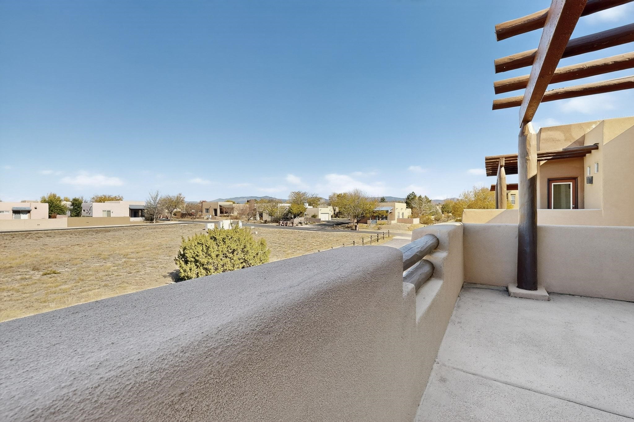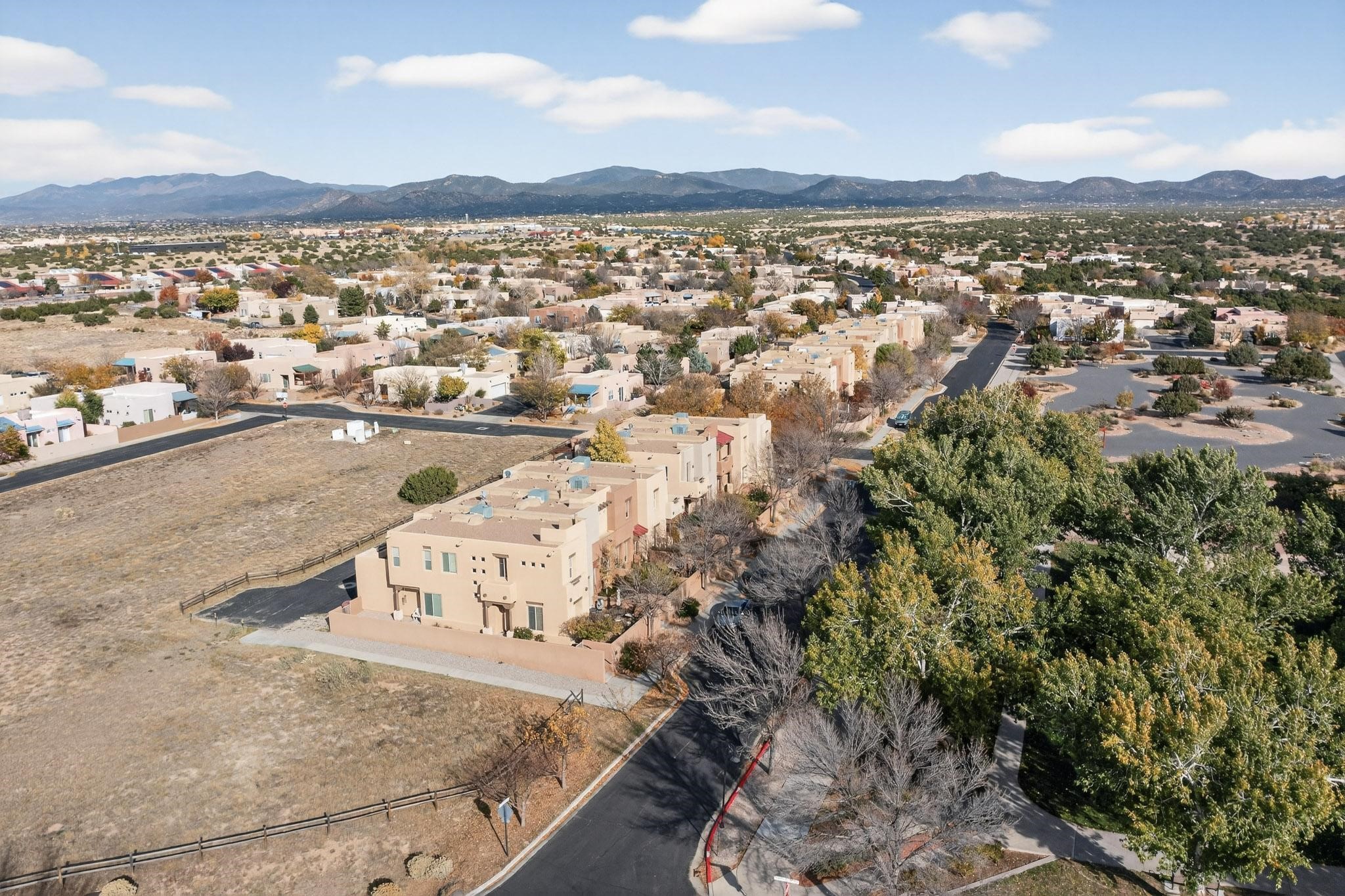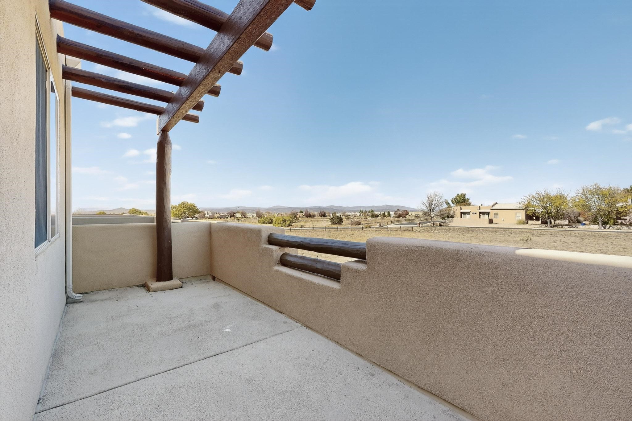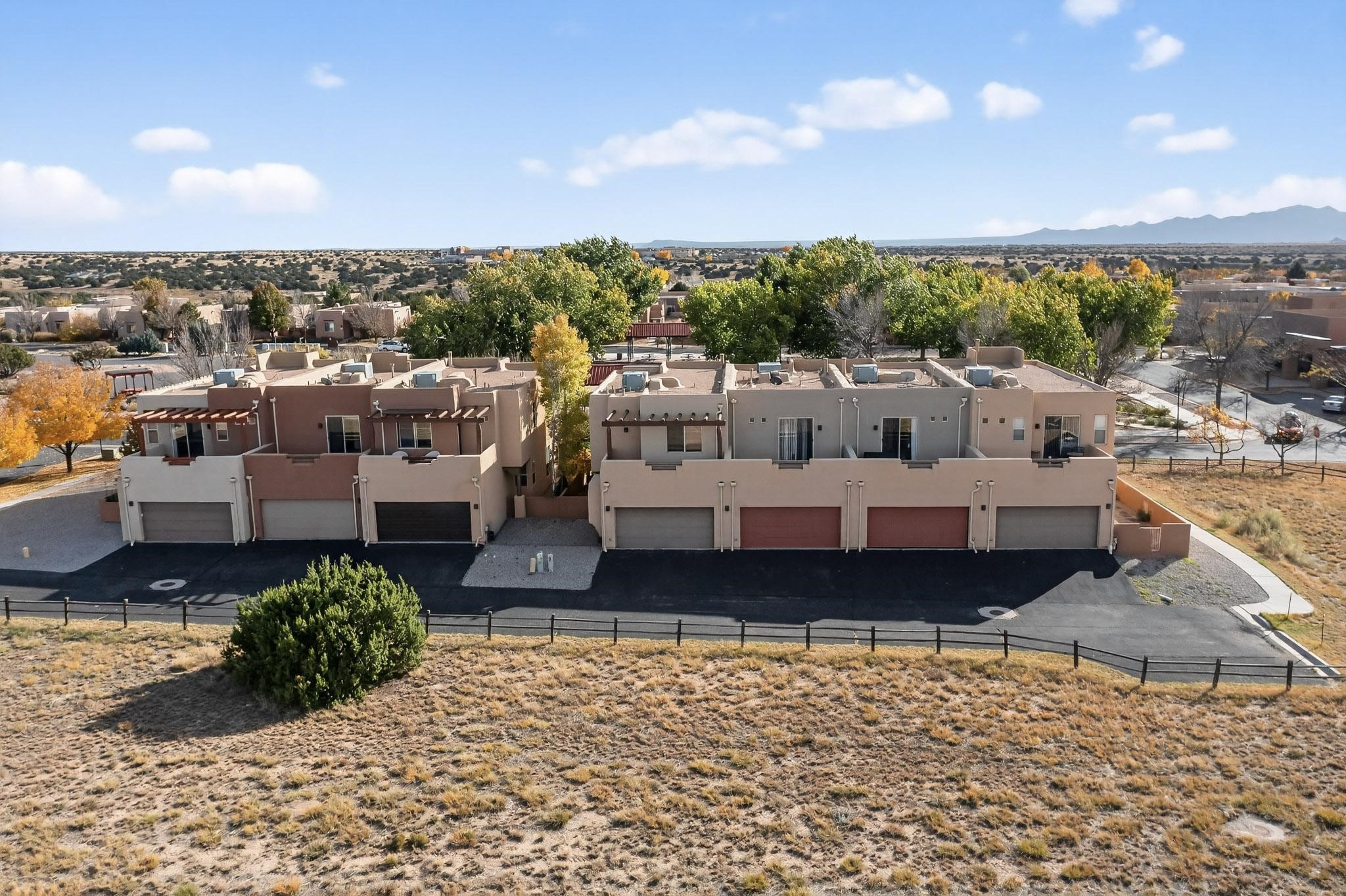 Have you been searching for your dream home in Rancho Viejo? You've come to the right place! This is an end unit home that has been meticulously cared for. The front and side yard have been nicely landscaped and there is a custom-made front entry screen door to welcome you inside. This the Nambe floorplan which boasts a soaring 19 ft. ceiling in the living room with viga accents, along with a diamond plaster kiva gas fireplace to complete the coziness of the home. Downstairs has tiled floors while the upstairs has a neutral color of carpet. There is a half bath downstairs, along with alaundry room with additional storage. The garage has more storage with built in shelving securely attached to the wall. Upstairs are the two bedrooms, two baths and loft area that can have a multitude of uses. The loft also has a door, with a magnetic screen, leading outside to a nice deck for you to enjoy the southern views and the park across the street. The primary bedroom also has a door, with a magnetic screen, leading to a larger deck and pergola for you to enjoy the northern views. The primary closet also has additional shelving. The HOA has recently had the roof replaced and ownerreplaced the water heater and PRV in 2025. With easy access into the subdivision, this home is close to restaurants, schools and a community park with connecting biking/walking trails.