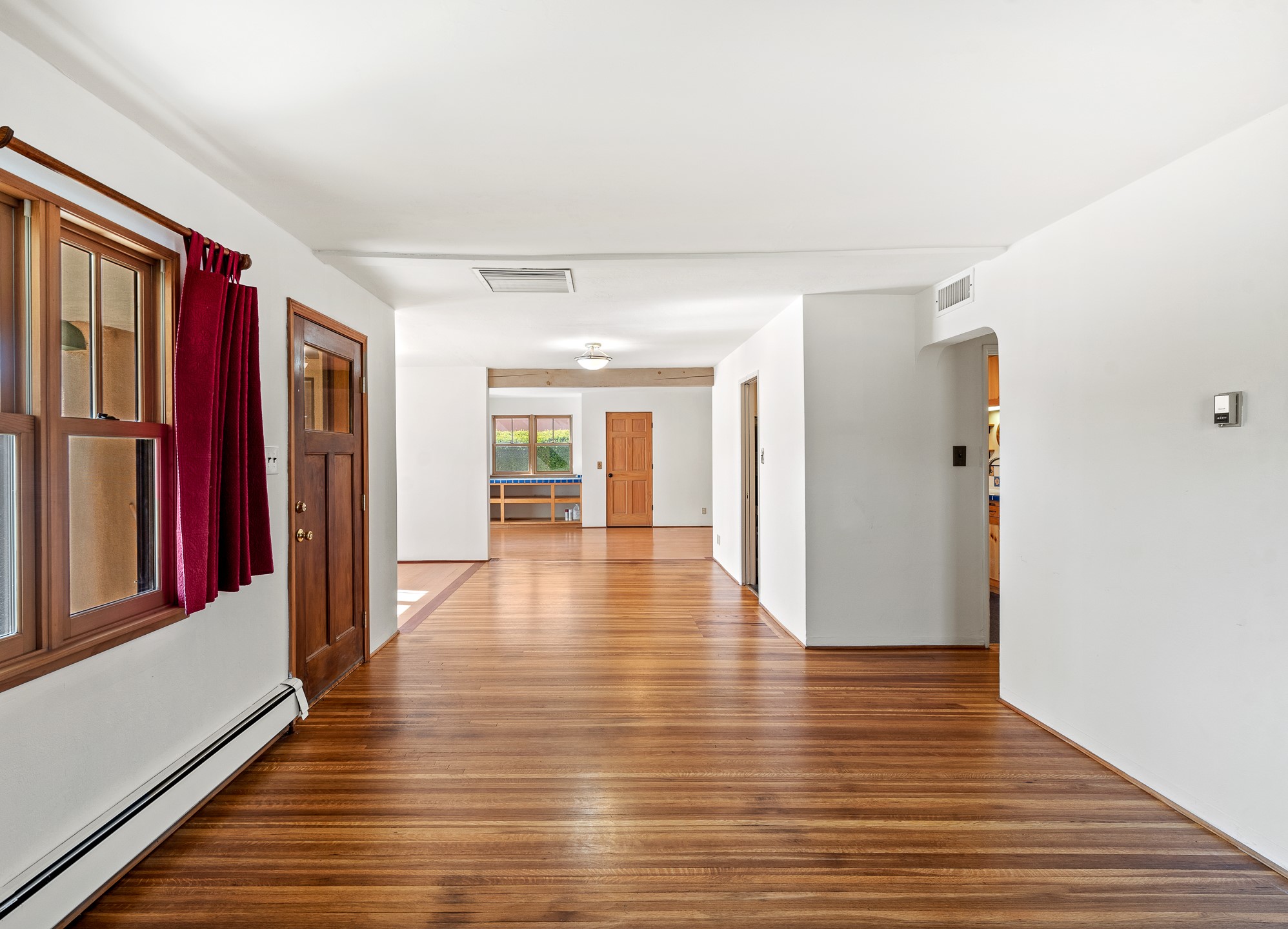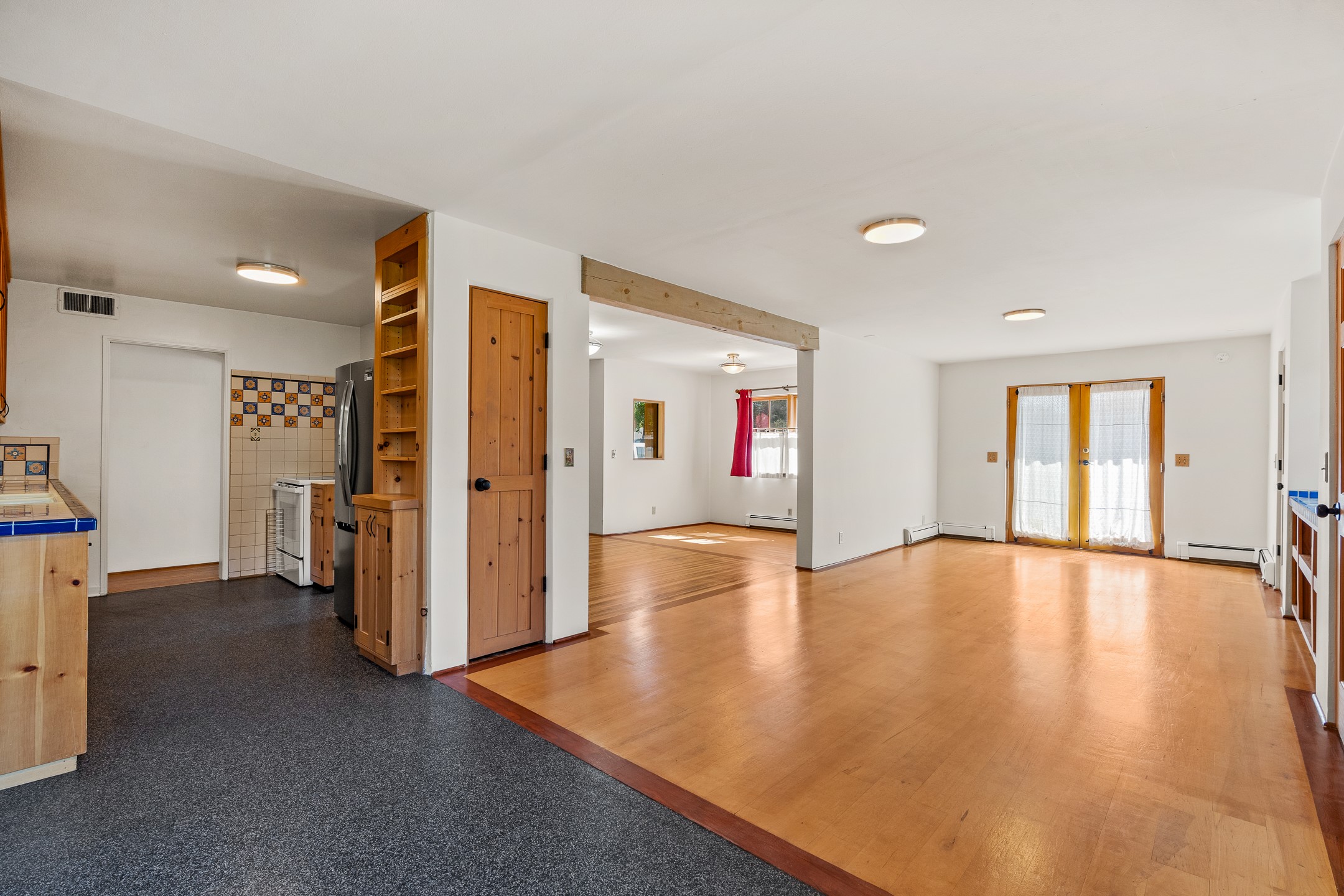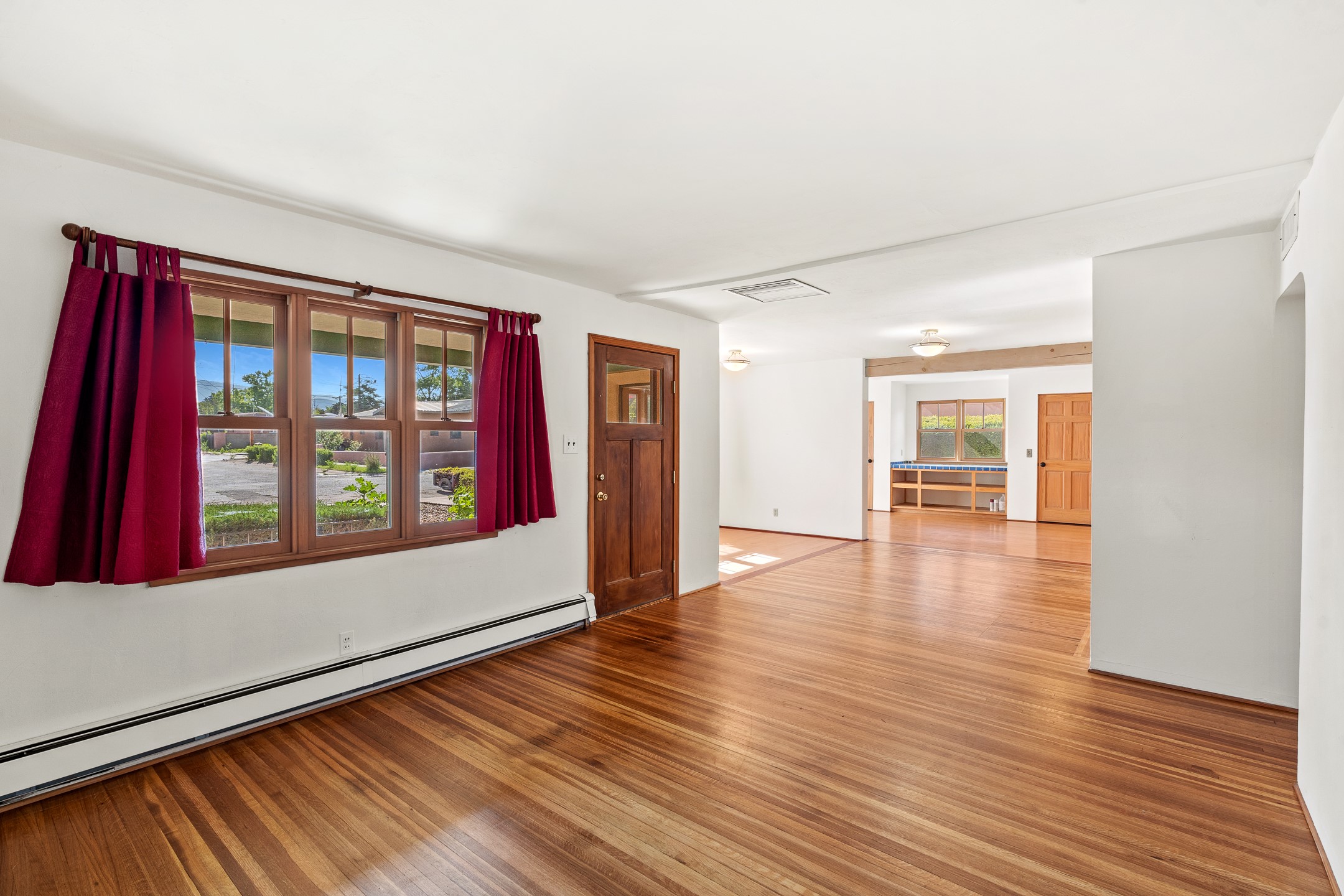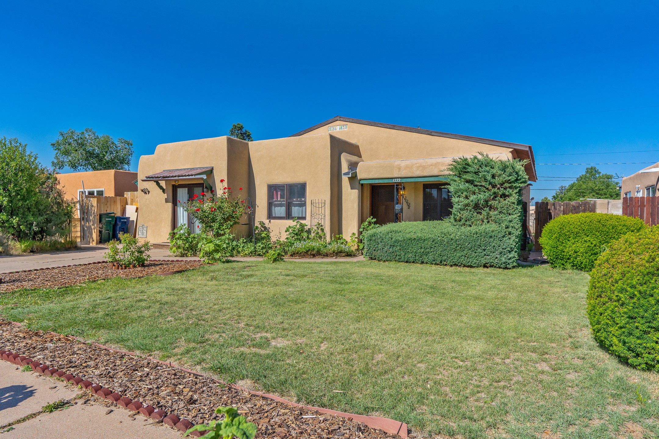 Charming and versatile single-level home nestled in the highly sought-after Casa Alegre neighborhood. Back on the market with significantly improved price. This property stands out as a unique opportunity, featuring multiple living areas and exceptional flexibility for the modern homeowner. This generous residence offers three bedrooms and two bathrooms, complemented by a massive 10.5 x 27 foot bonus room. The interior includes dedicated family, living, and dining rooms, all boasting beautiful hardwood flooring throughout the main living areas. he oversized bonus space features direct access, presenting enormous possibilities. It's perfectly suited for a private art studio, home occupancy business, large gym, or a dedicated multi-generational living suite. Santa Fe Lifestyle at Your Doorstep. Enjoy true convenience with easy access to local shopping and dining. Best of all, the home is ideally situated near the Santa Fe River Trail and the Acequia Trail, providing direct, car-free routes straight to the vibrant Railyard District and historic downtown. The property features a spacious, fenced backyard and a covered portal, creating an ideal setting for outdoor entertaining and relaxation. Enjoy year-round comfort with reliable hot water baseboard heating and evaporative cooling.This motivated seller opportunity won't last long--schedule your showing today!