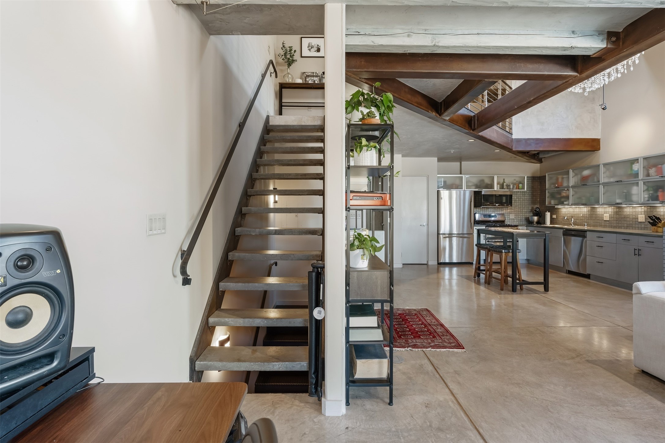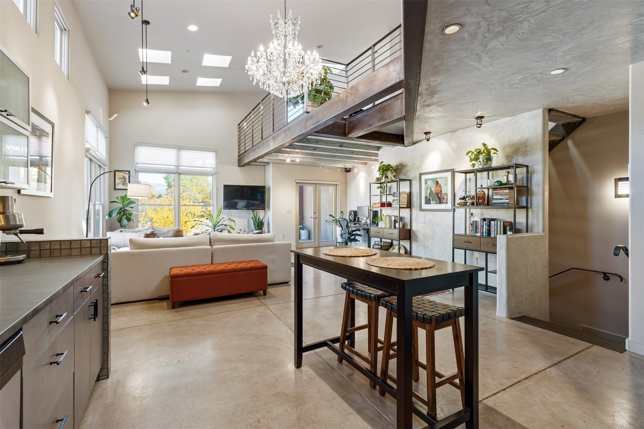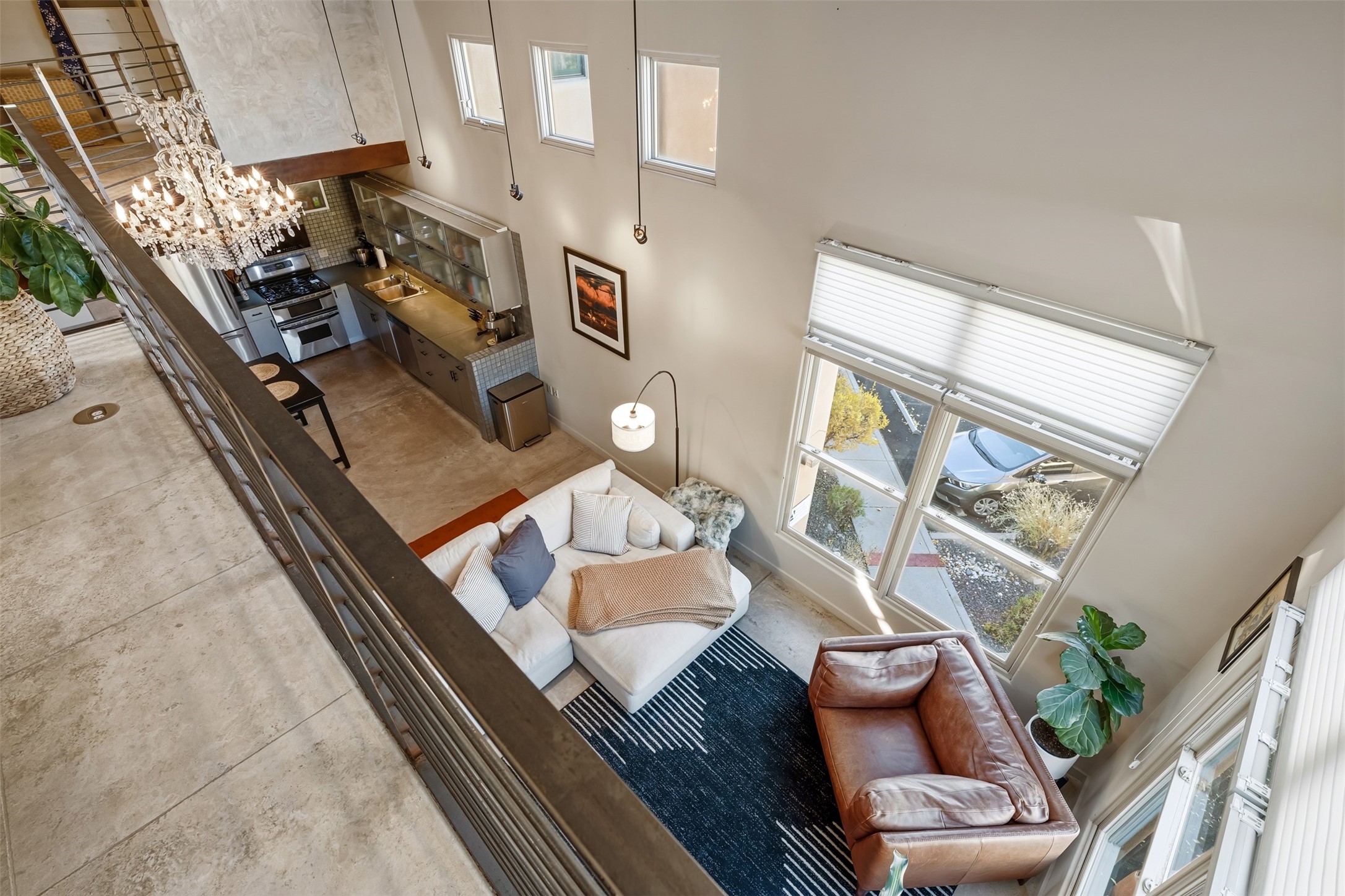 Contemporary live/work condo located in the highly sought-after South Capitol neighborhood--just a short walk to the Santa Fe Plaza and less than a mile from the Railyard District. Enjoy easy access to Whole Foods, Trader Joe's, Natural Grocers, popular restaurants, and a variety of local amenities. This two-level, second-floor residence offers 1 bedroom and 2 baths (1 full, 1 half) and is quietly tucked away at the back of the complex for added privacy. Expansive windows frame views of the Sangre de Cristo Mountains, while clerestory windows and soaring 17' ceilings fill the space with natural light. The open floor plan features a modern kitchen, sleek concrete floors with in-floor radiant heat, and a brand new evaporative cooler. Step out from the living area onto a spacious deck to enjoy outdoor living and mountain views. Upstairs, the lofted bedroom offers generous closet space, a bath with a steam shower, and stackable laundry. Don't miss this unique opportunity to own a stylish and light-filled home in one of Santa Fe's most desirable neighborhoods.