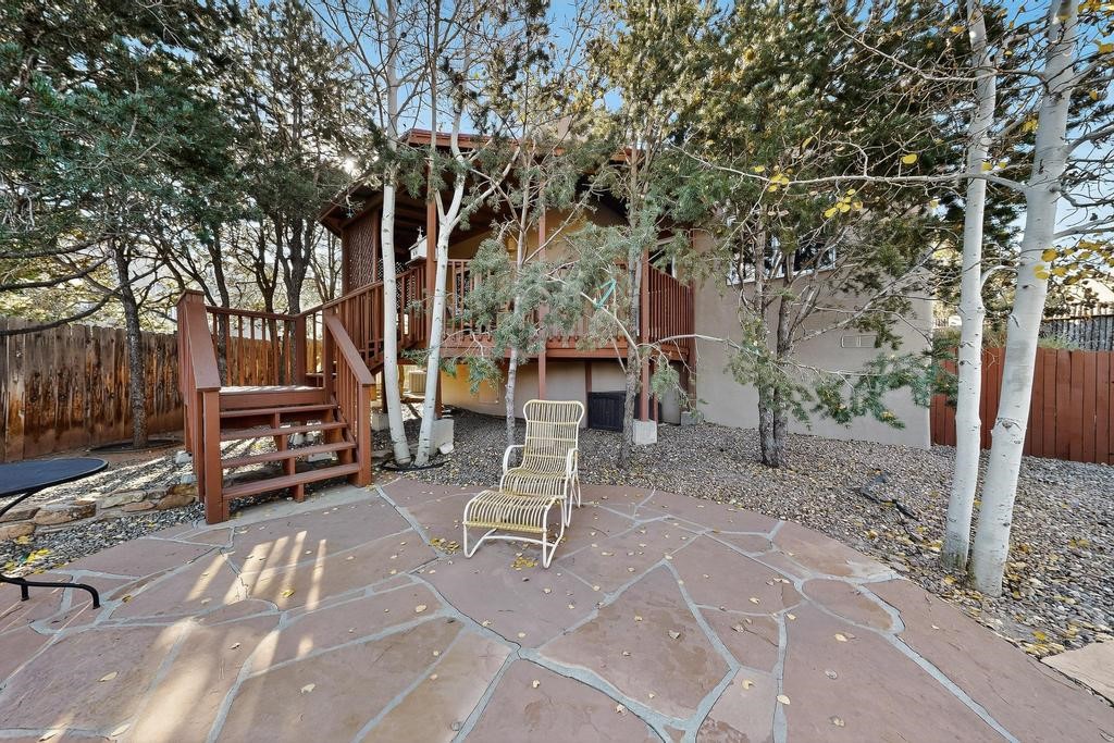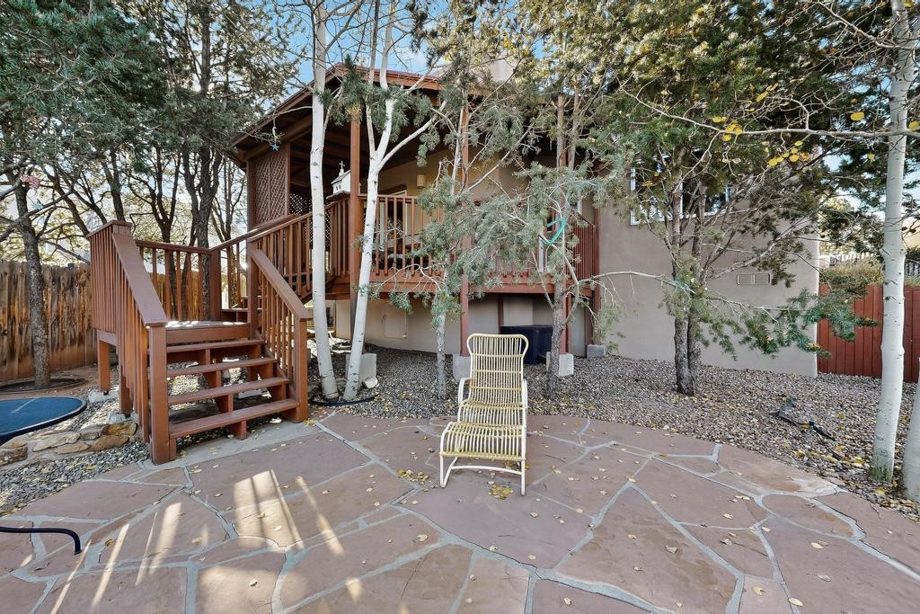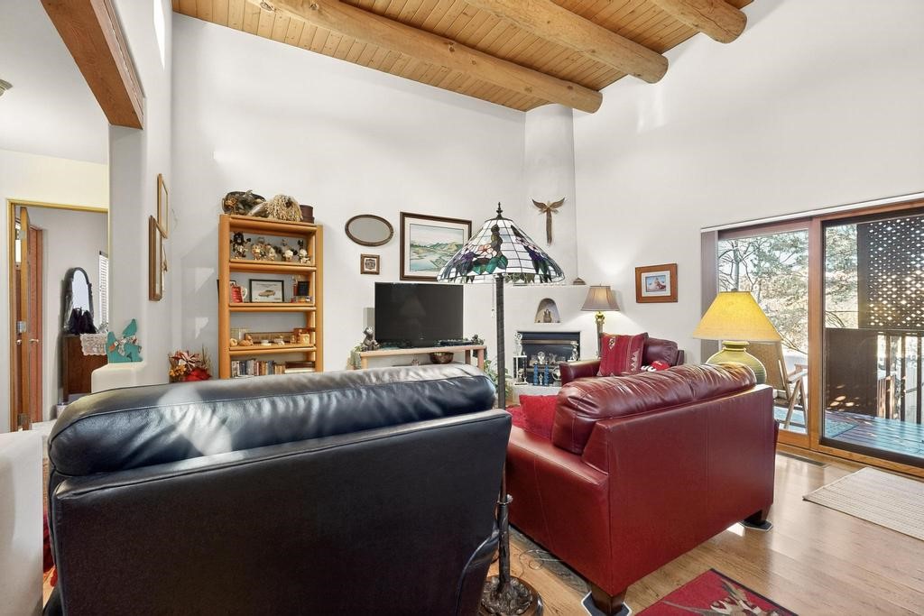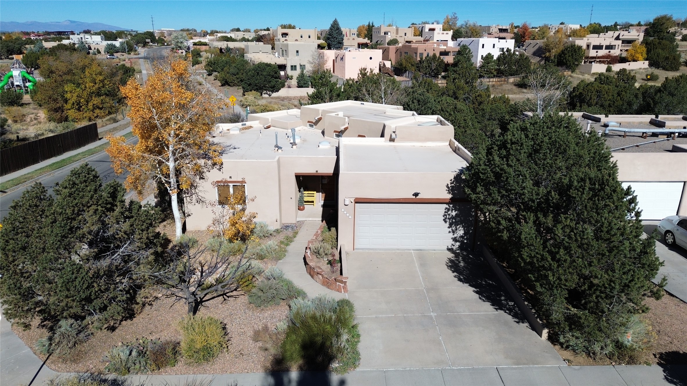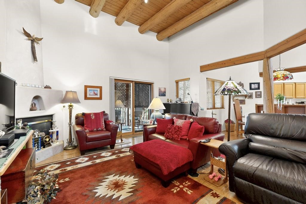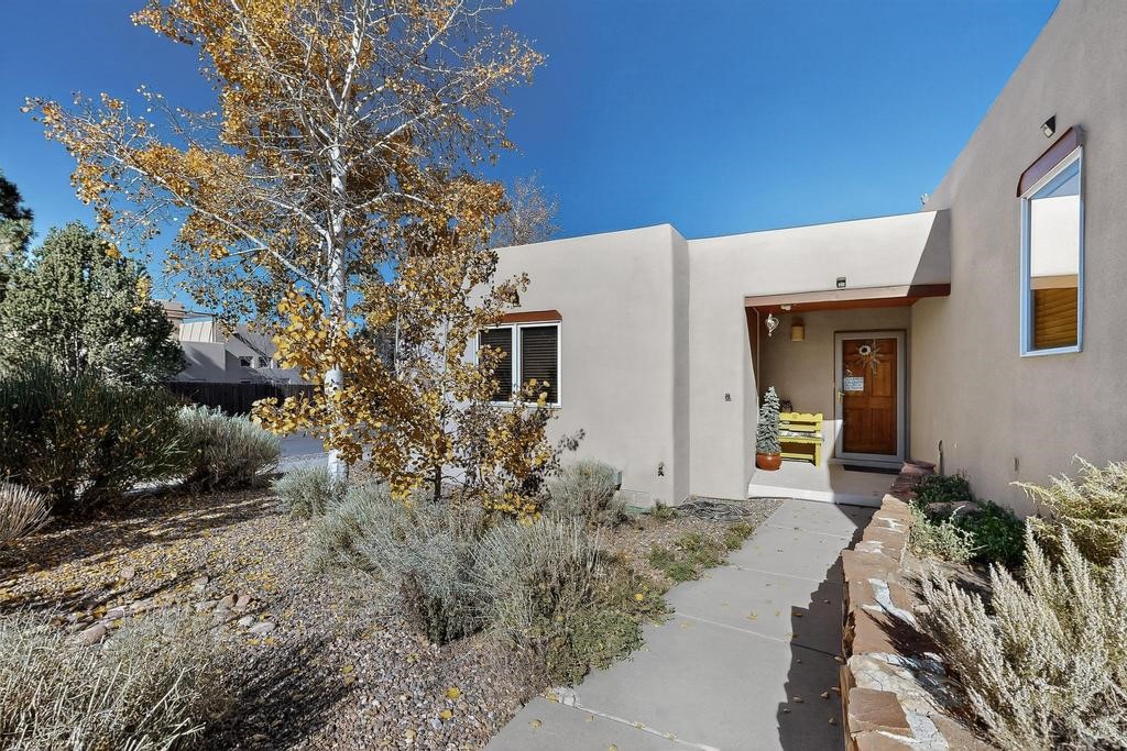 Don't miss this charming single-level home in Pueblos del Sol featuring three bedrooms and two bathrooms. This residence showcases classic Santa Fe details such as Vigas and a cozy Kiva fireplace. Lots of natural light streaming in from five skylights throughout the home. The open floor plan provides great flow and comfortable bedroom separation, while the spacious deck with a solid portal--accessible from both the living room and primary bedroom--offers the perfect place to relax and enjoy the beautiful mountain views. York Central air conditioning and a two-car garage complete this wonderful Santa Fe home. Additionally, the raised subfloor design allows for easy access to plumbing for repairs or modifications. Situated on a large, beautifully landscaped corner lot with native plants and an apricot tree, the property backs onto a greenbelt for added privacy. Recent updates include a finished garage with a new door (2016), a new TPO roof (2021), new coyote and dog-eared fencing (2021), stucco patched and stained (2025), a new hot water heater (2025), and a new sump pump (2023). We invite you to come take a look at this wonderful property.